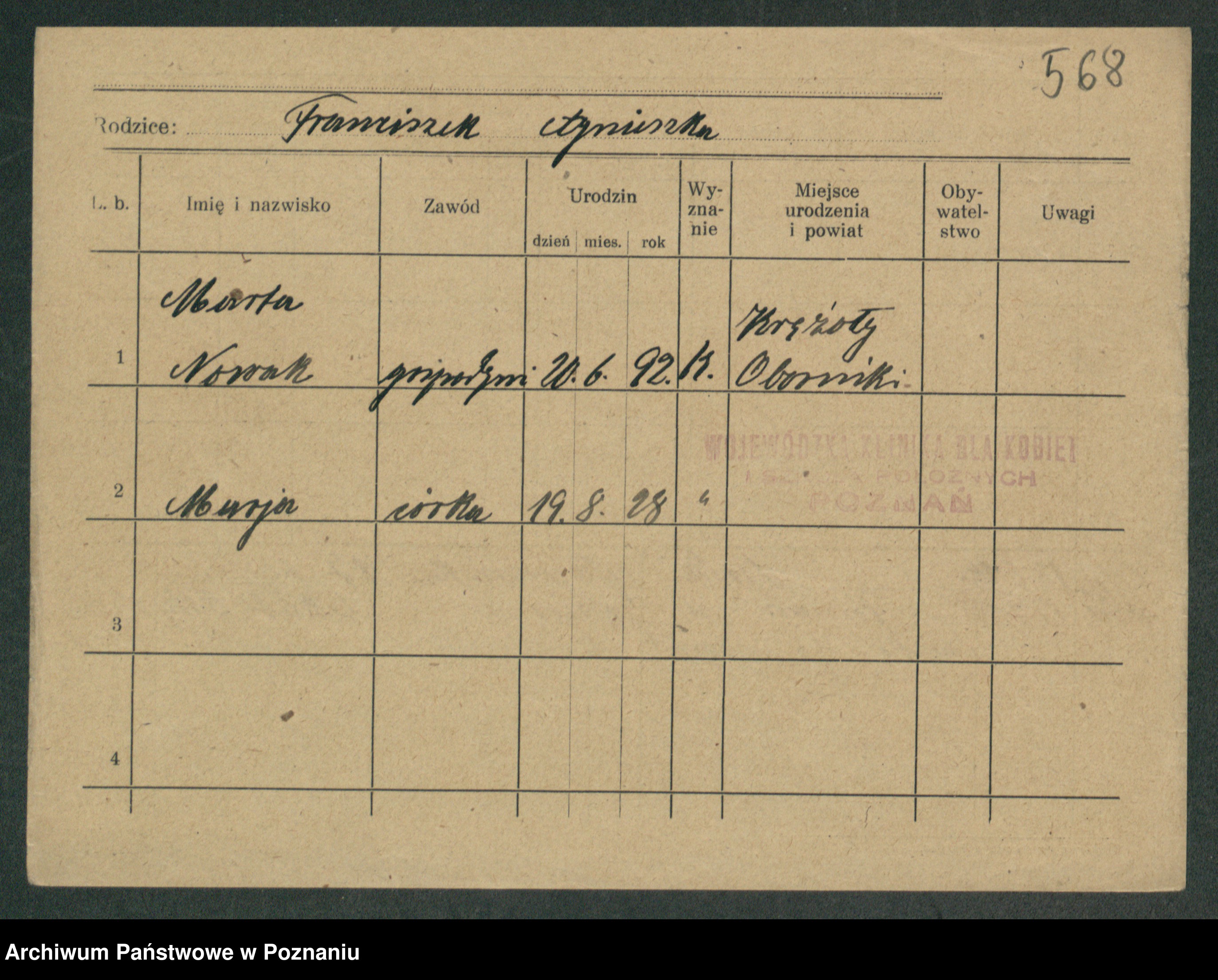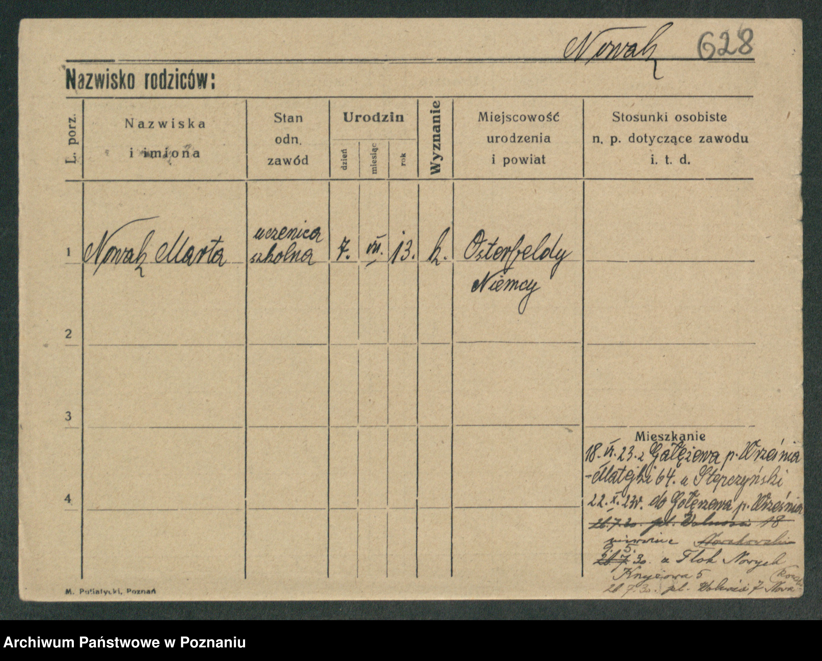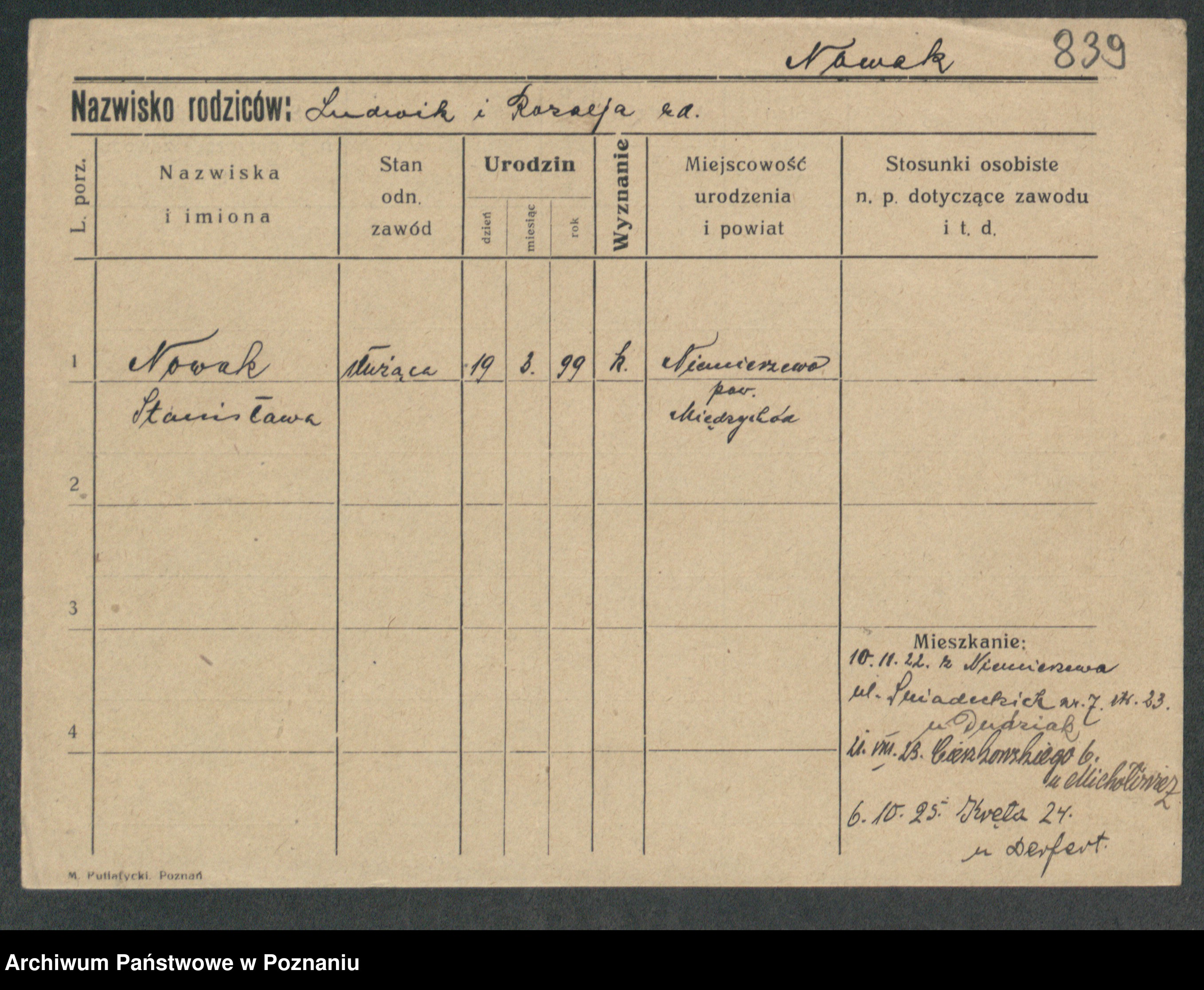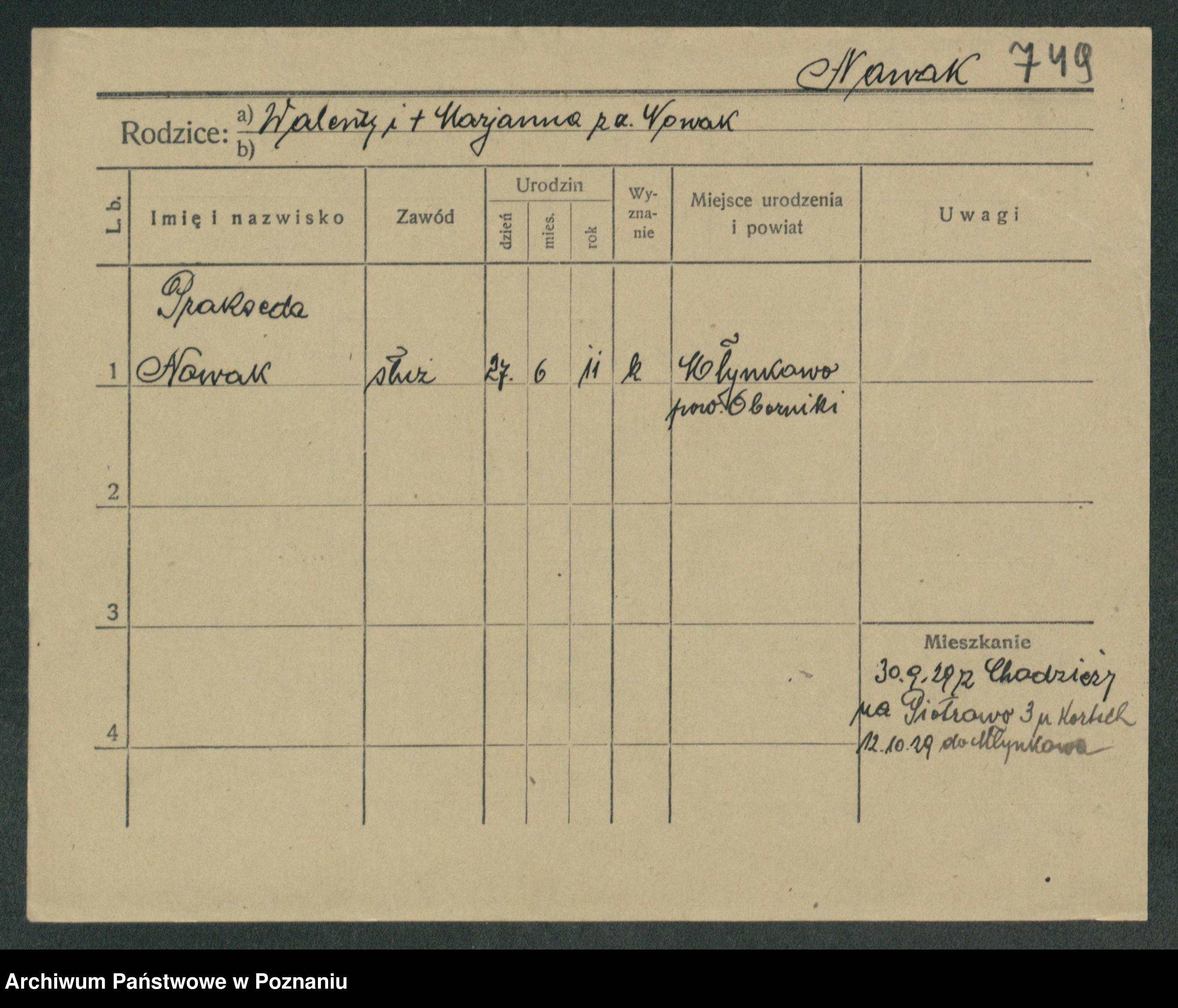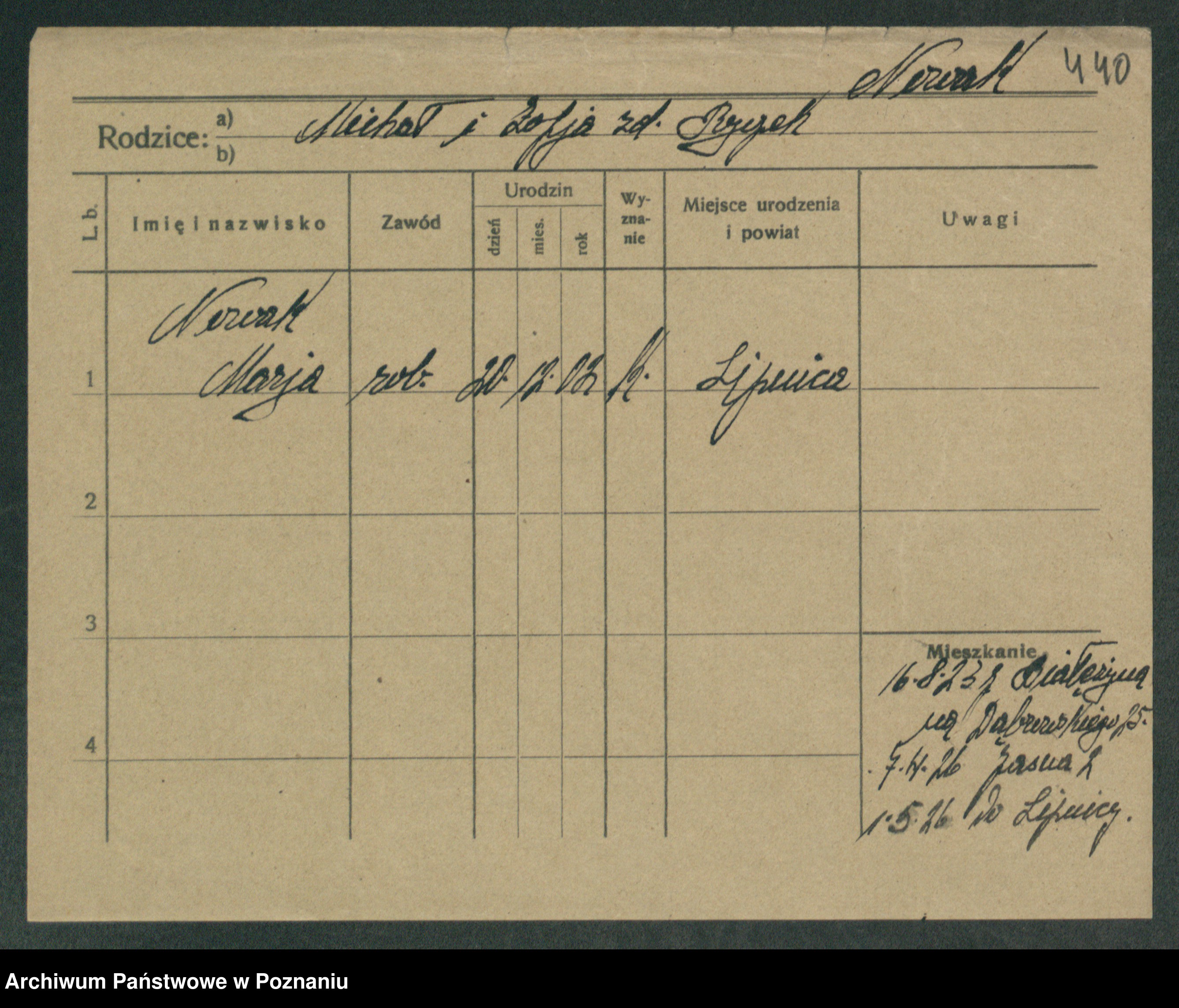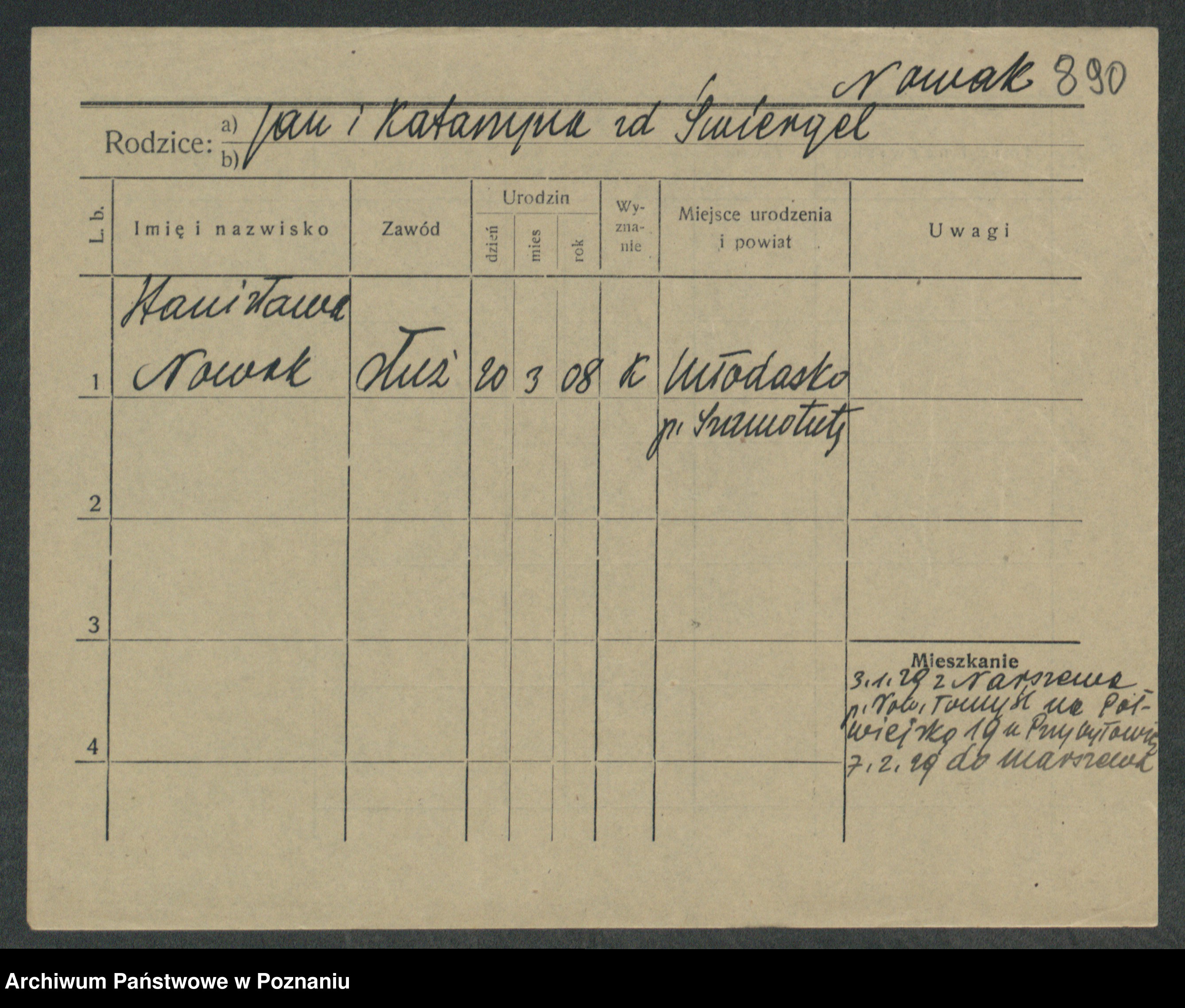 Podgląd karty osobowej dostępny jest po kliknięciu na nazwisko lub ikonkę karty. Można dokonywać powiększenia (ikony na górze) lub przechodzić między kolejnymi skanami (strzałki po bokach).