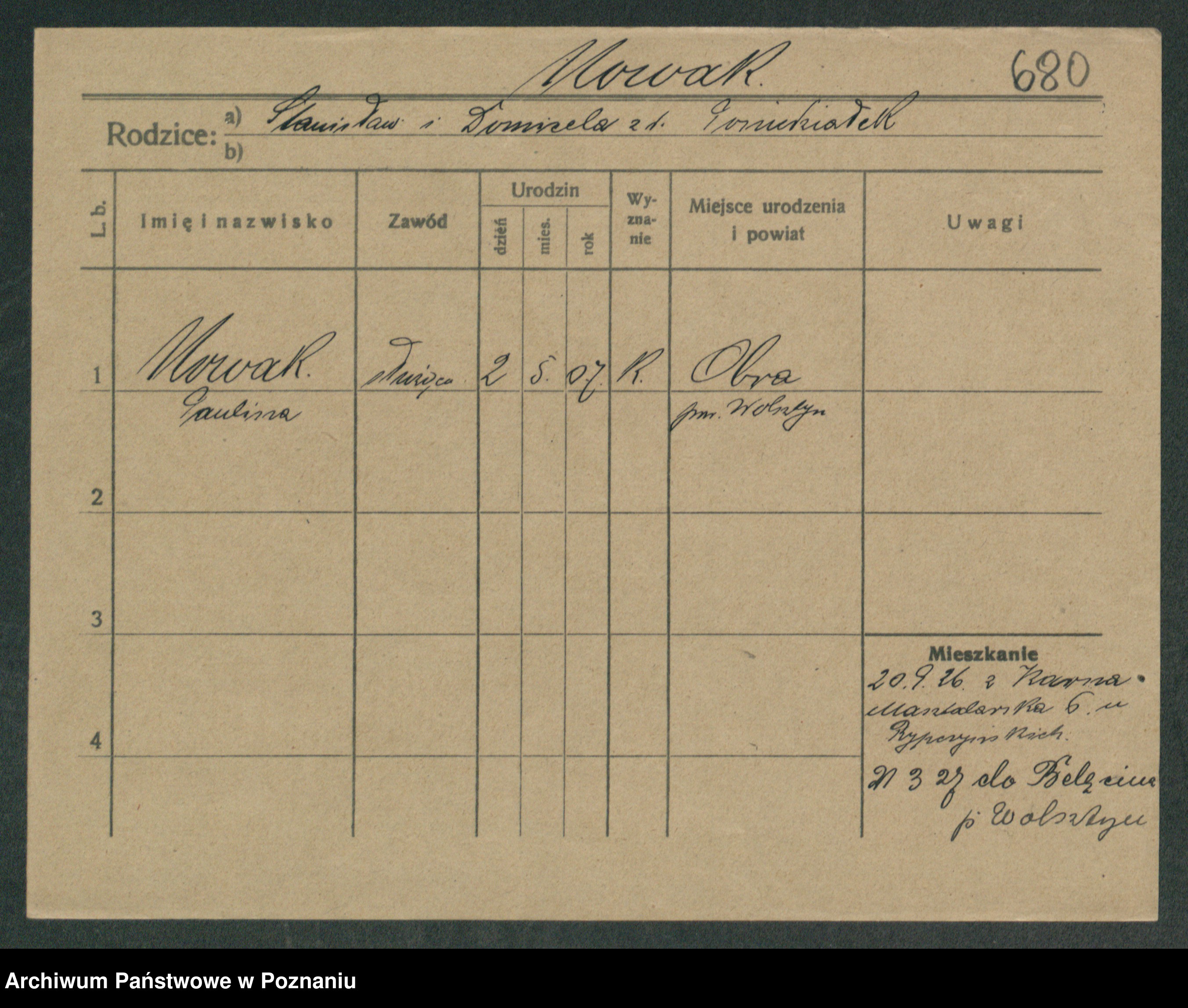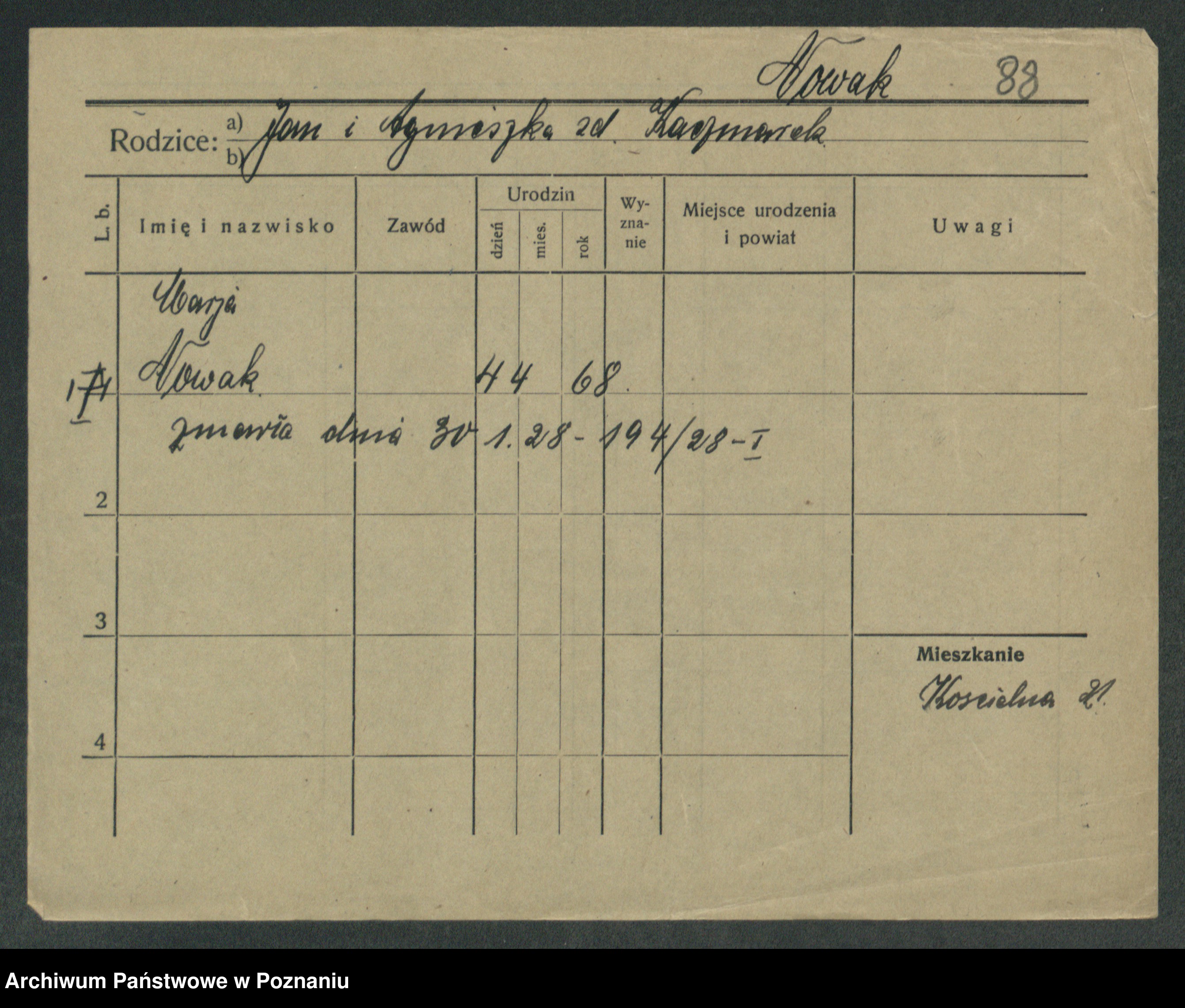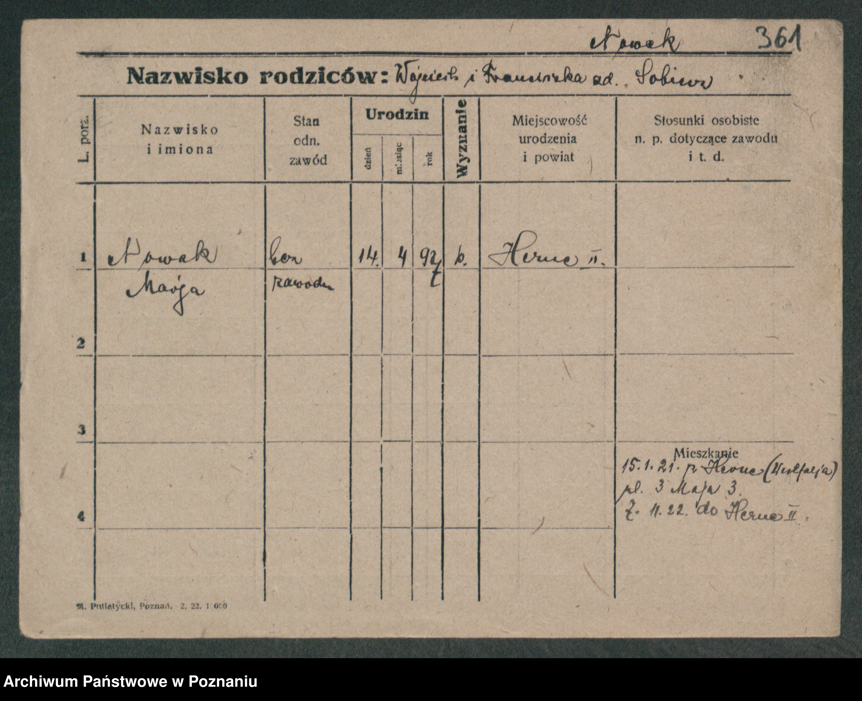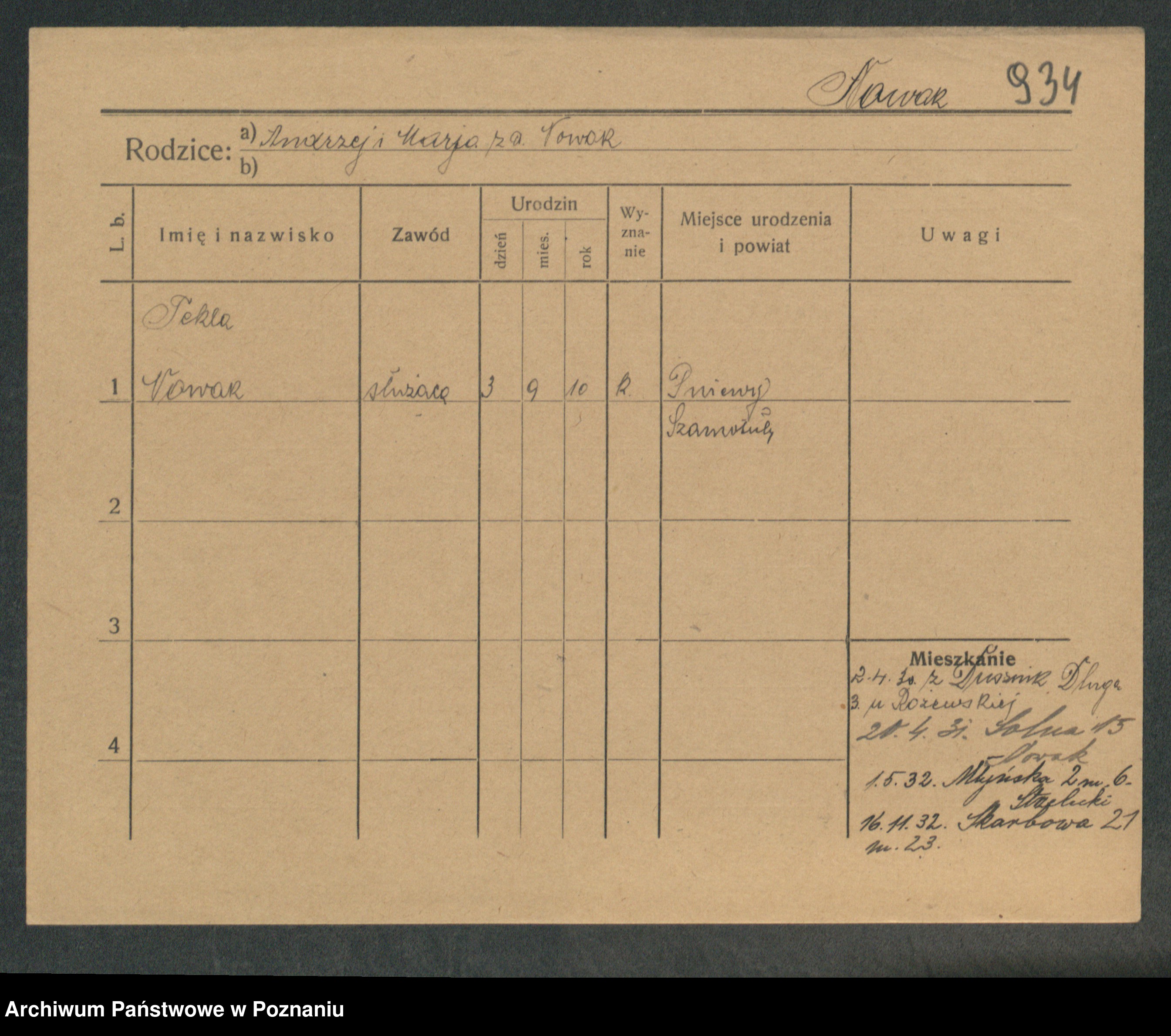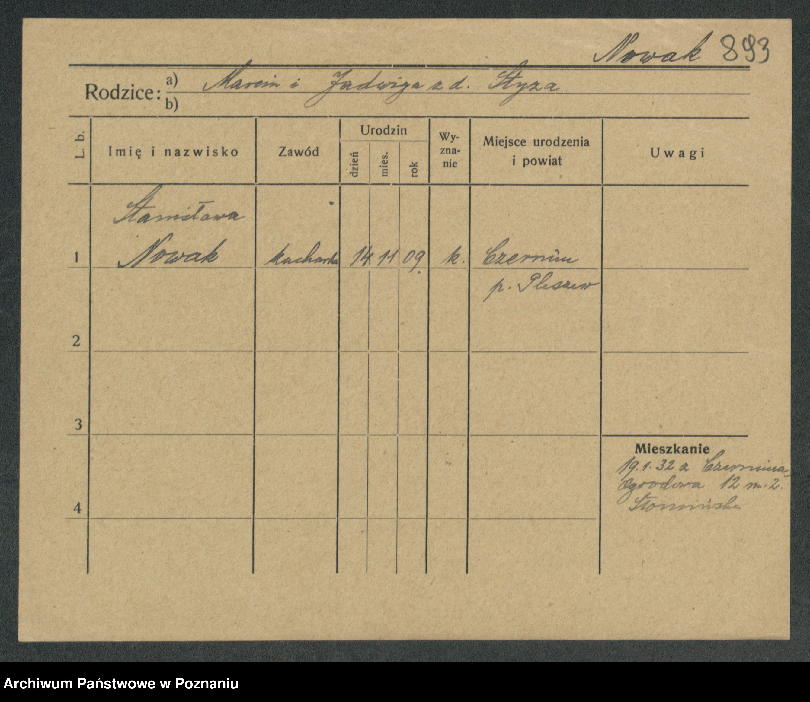 Podgląd karty osobowej dostępny jest po kliknięciu na nazwisko lub ikonkę karty. Można dokonywać powiększenia (ikony na górze) lub przechodzić między kolejnymi skanami (strzałki po bokach).