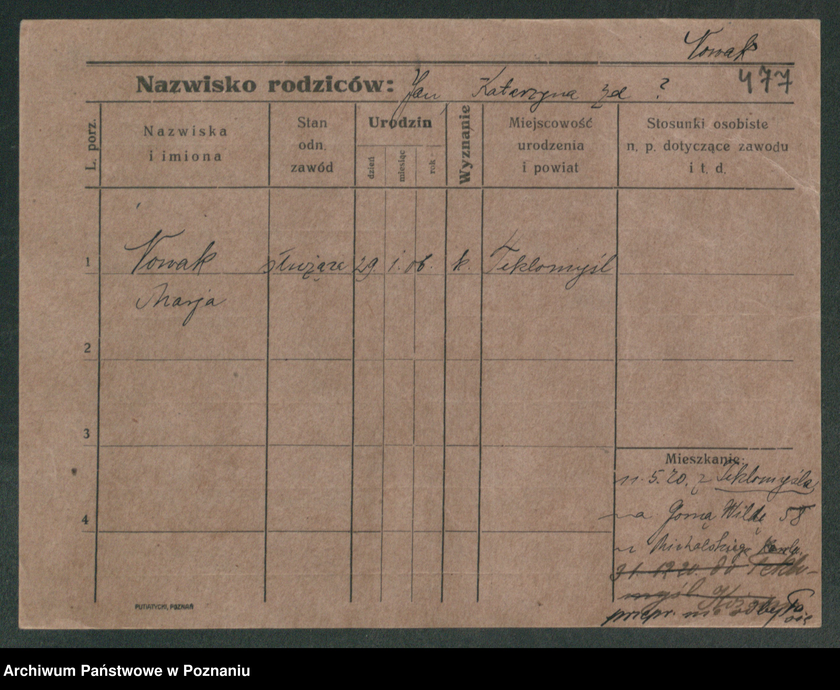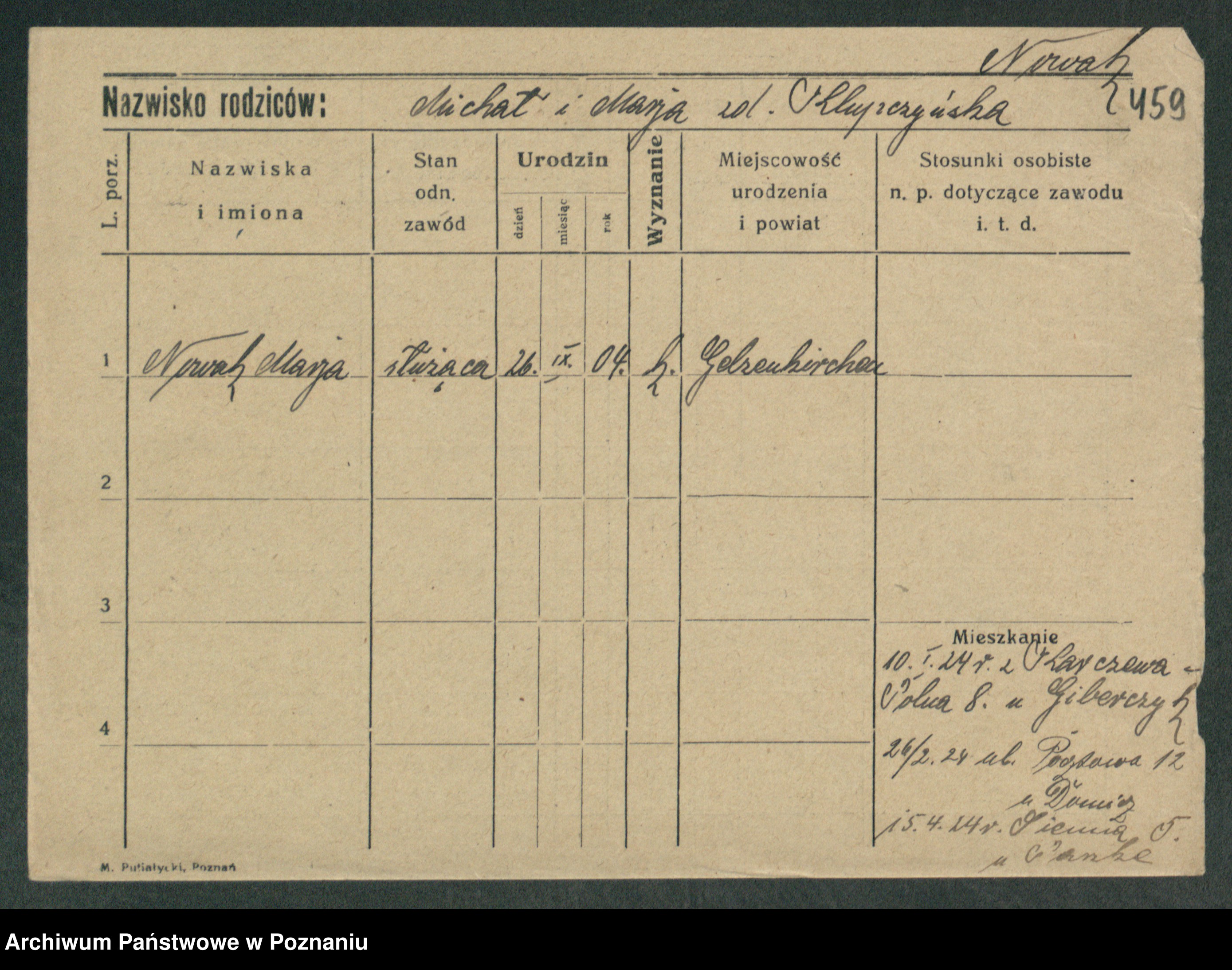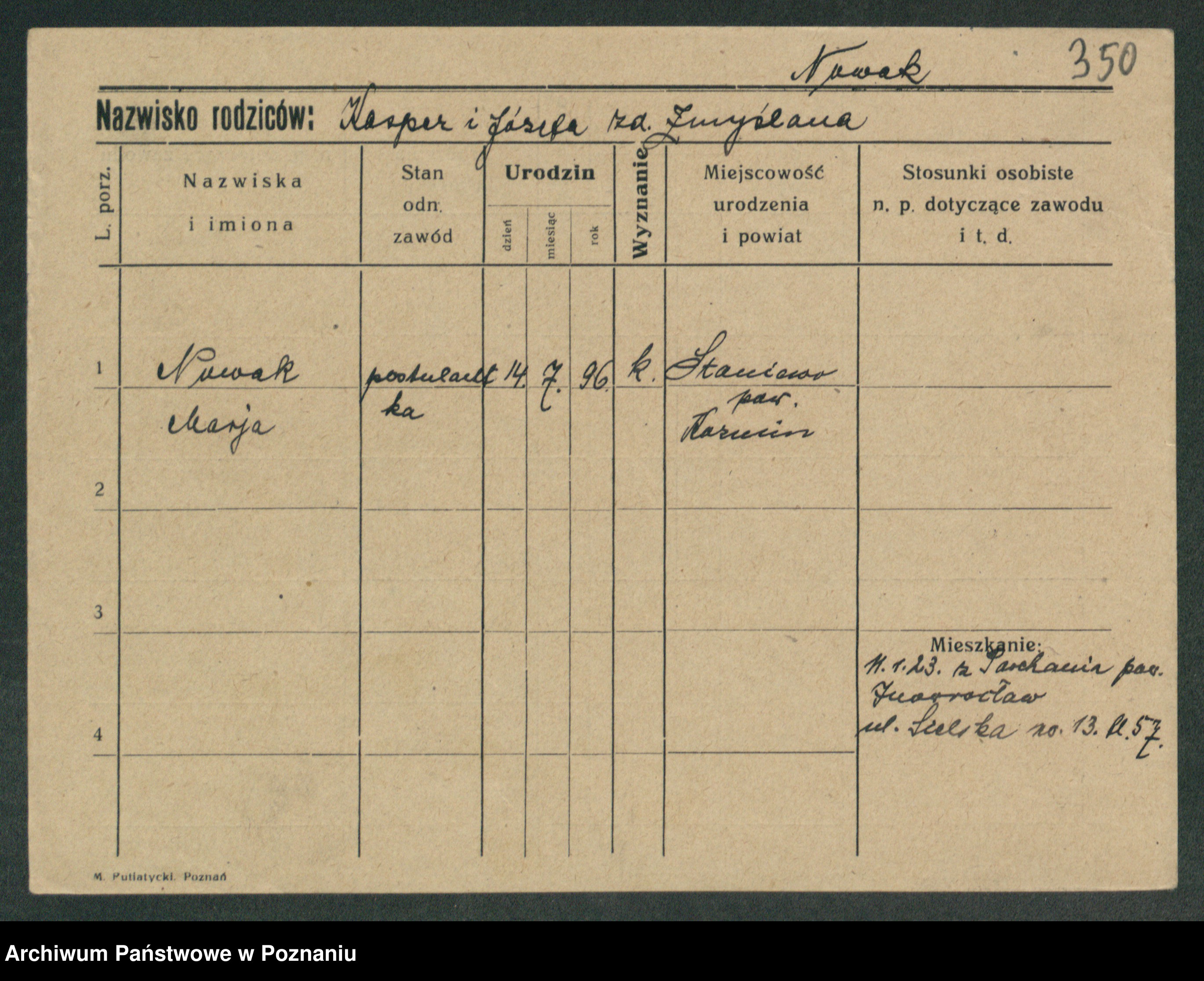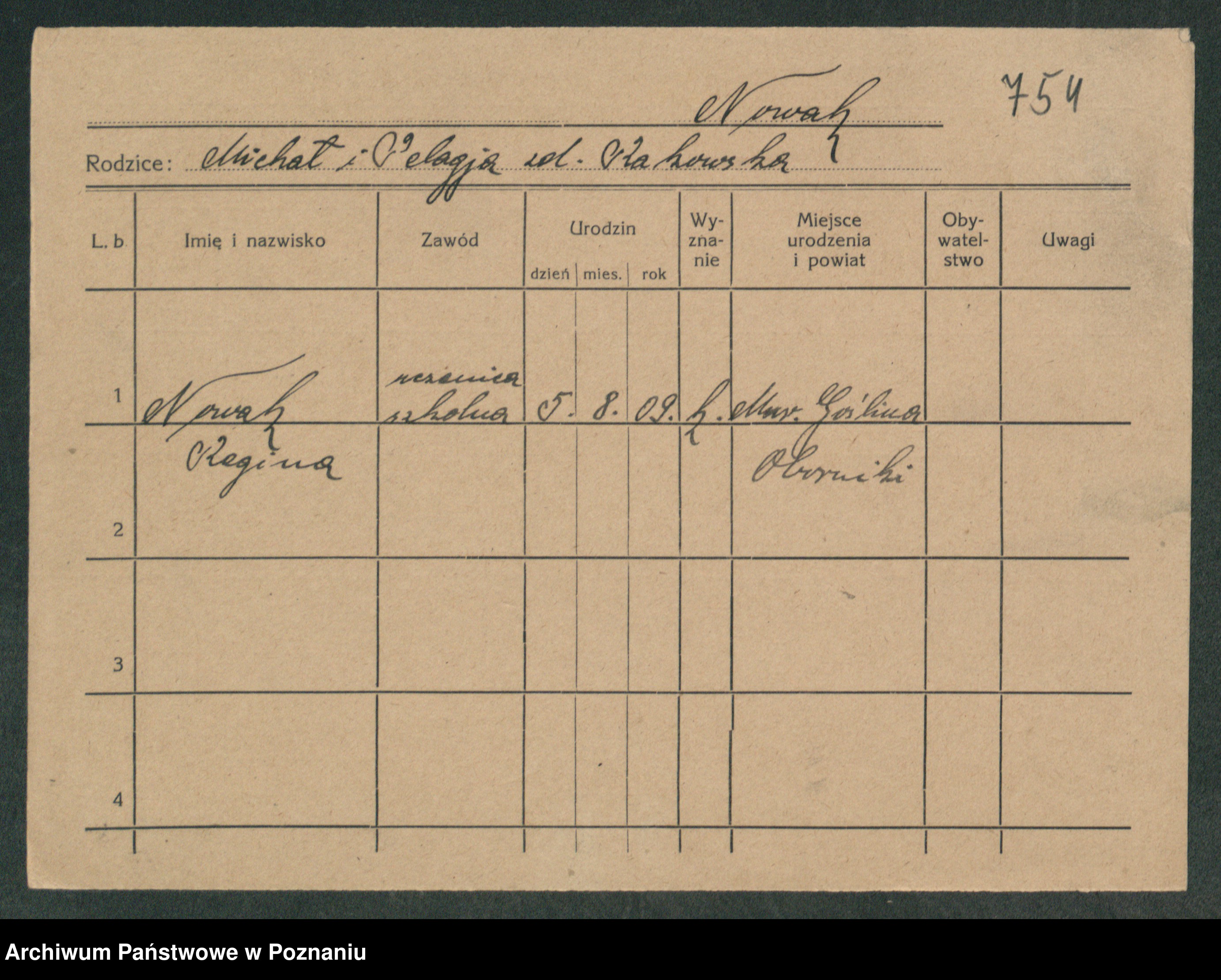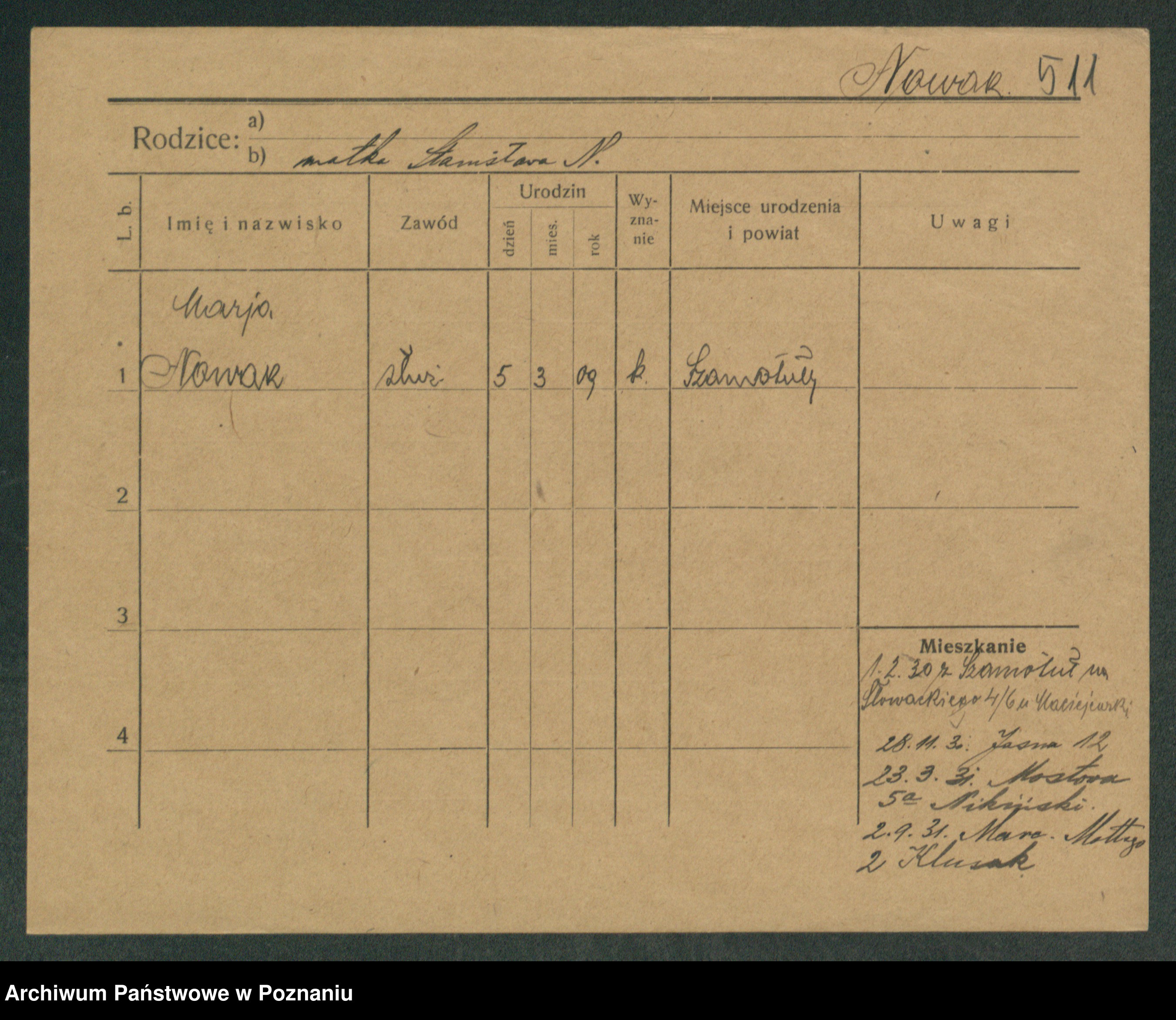 Podgląd karty osobowej dostępny jest po kliknięciu na nazwisko lub ikonkę karty. Można dokonywać powiększenia (ikony na górze) lub przechodzić między kolejnymi skanami (strzałki po bokach).
