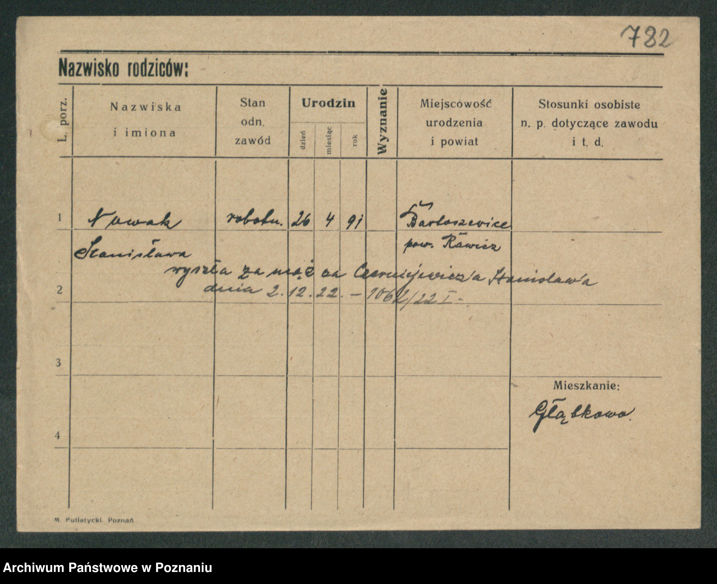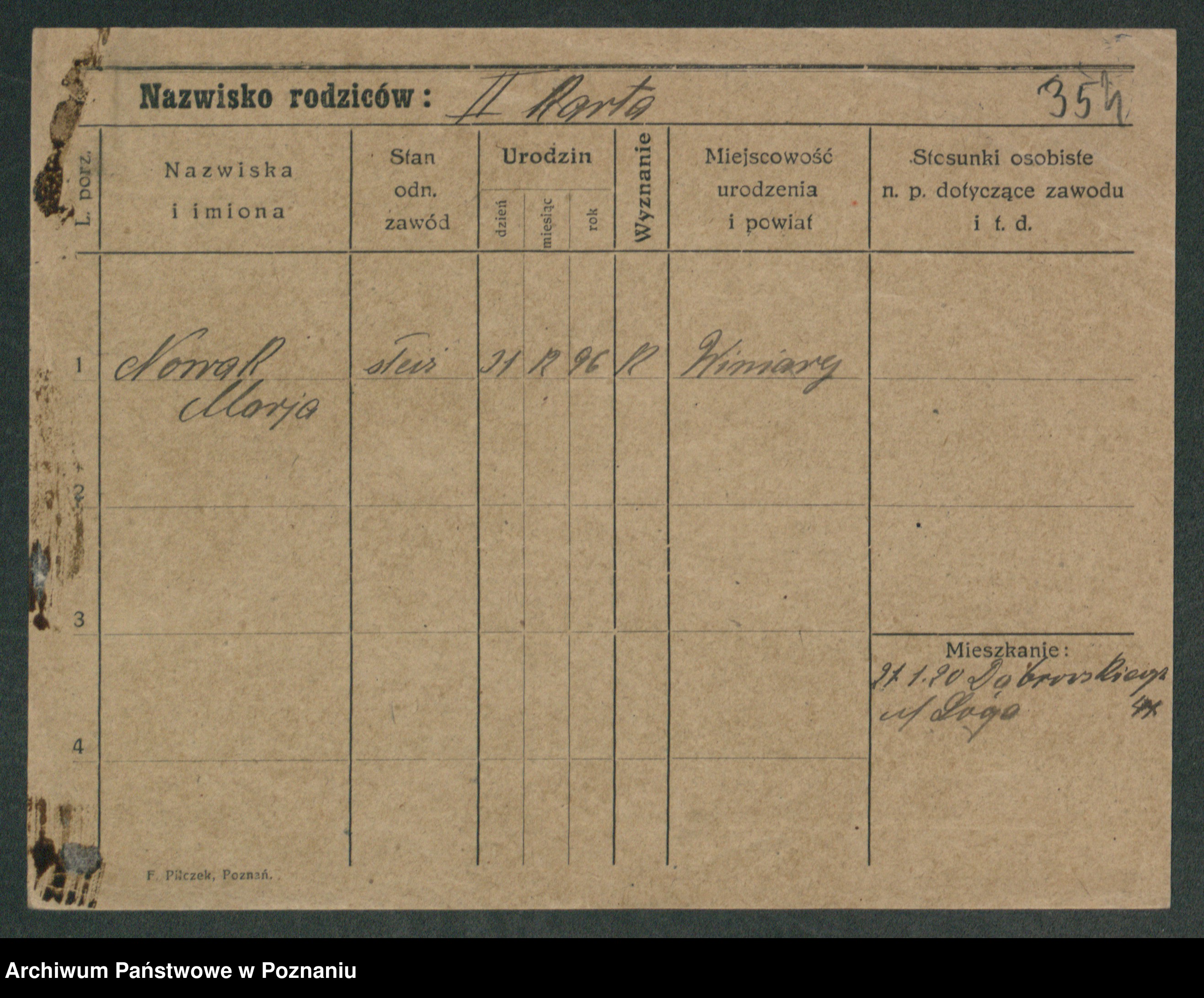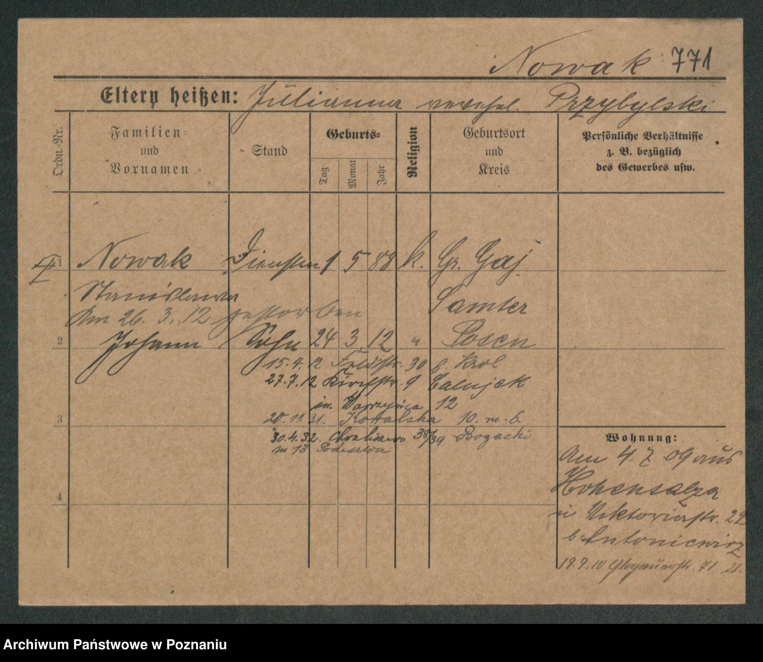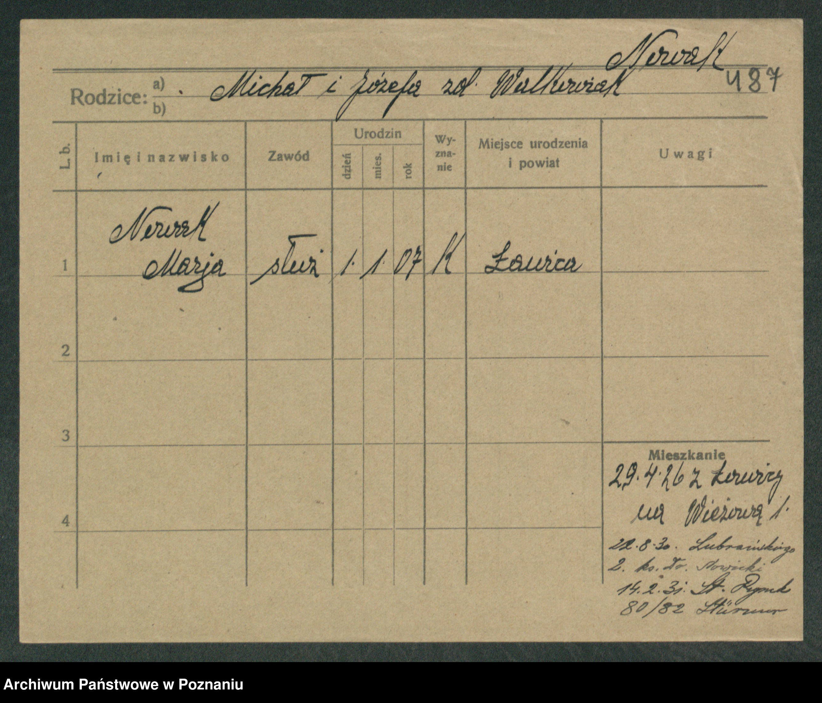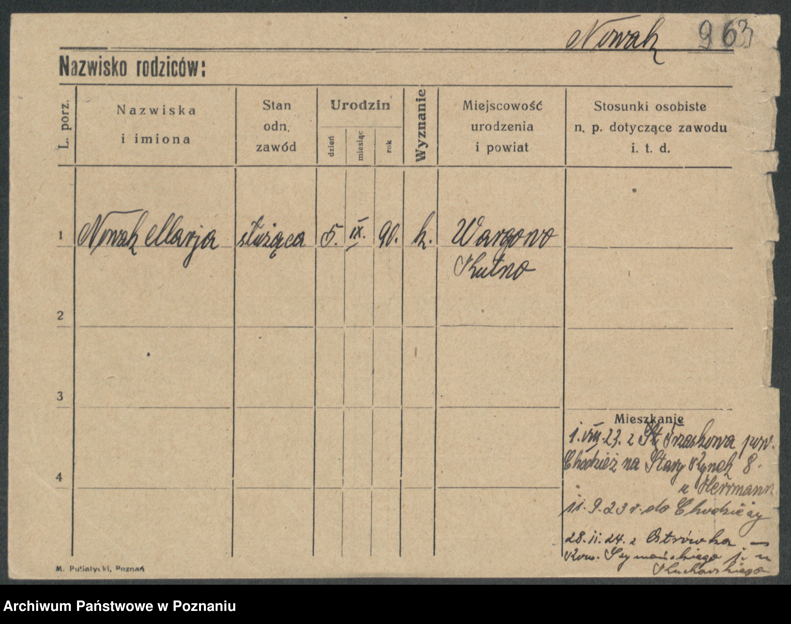 Podgląd karty osobowej dostępny jest po kliknięciu na nazwisko lub ikonkę karty. Można dokonywać powiększenia (ikony na górze) lub przechodzić między kolejnymi skanami (strzałki po bokach).