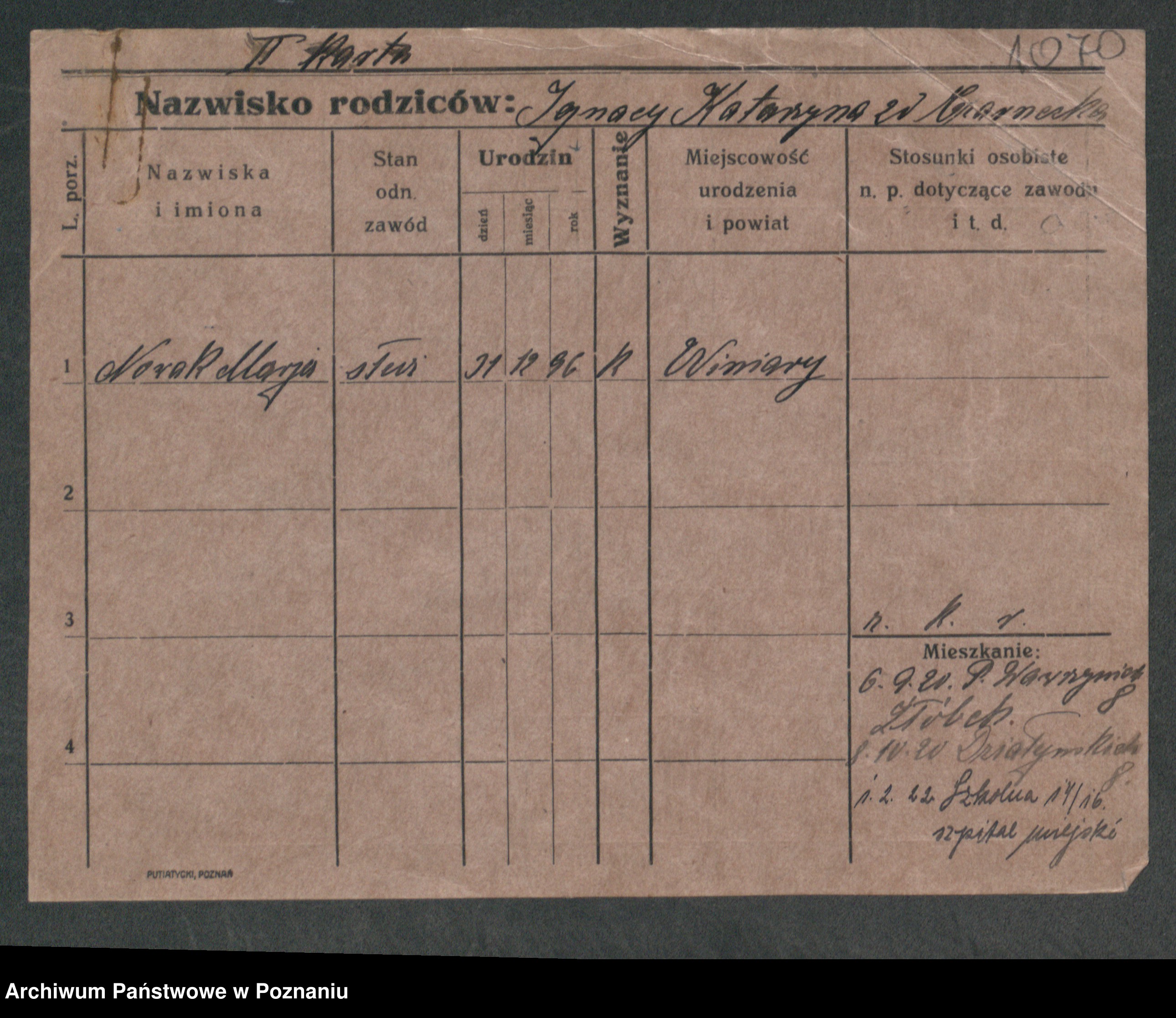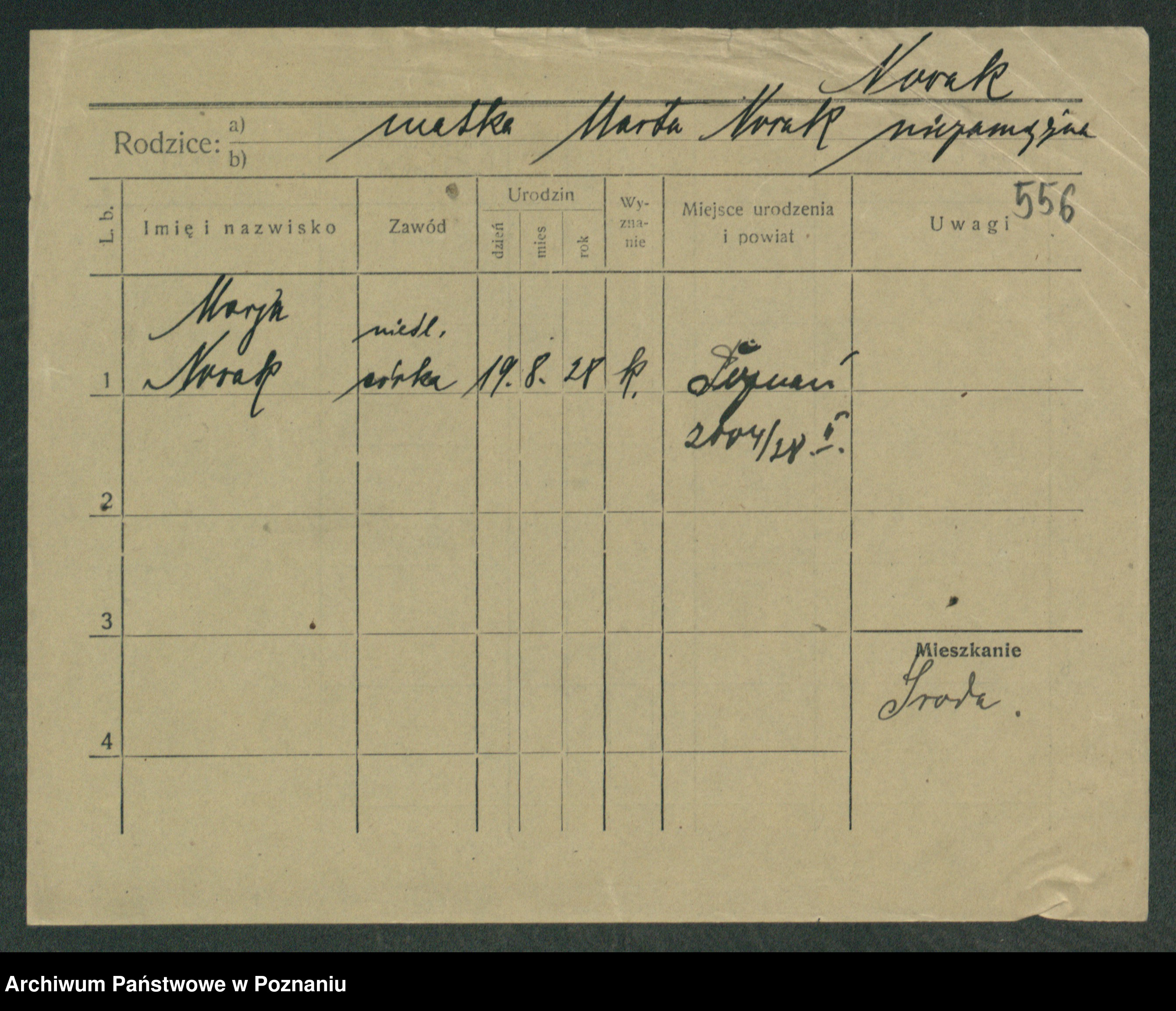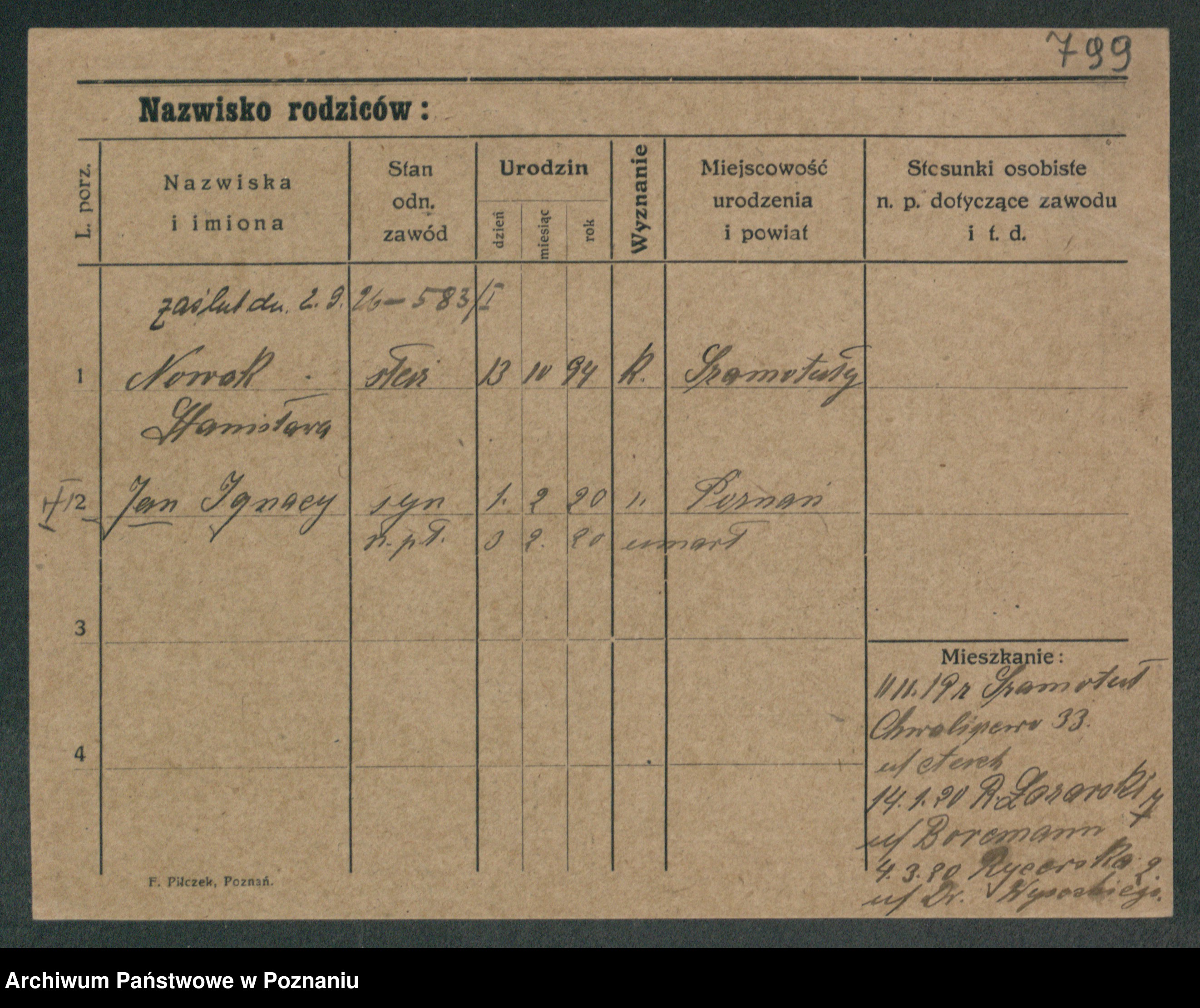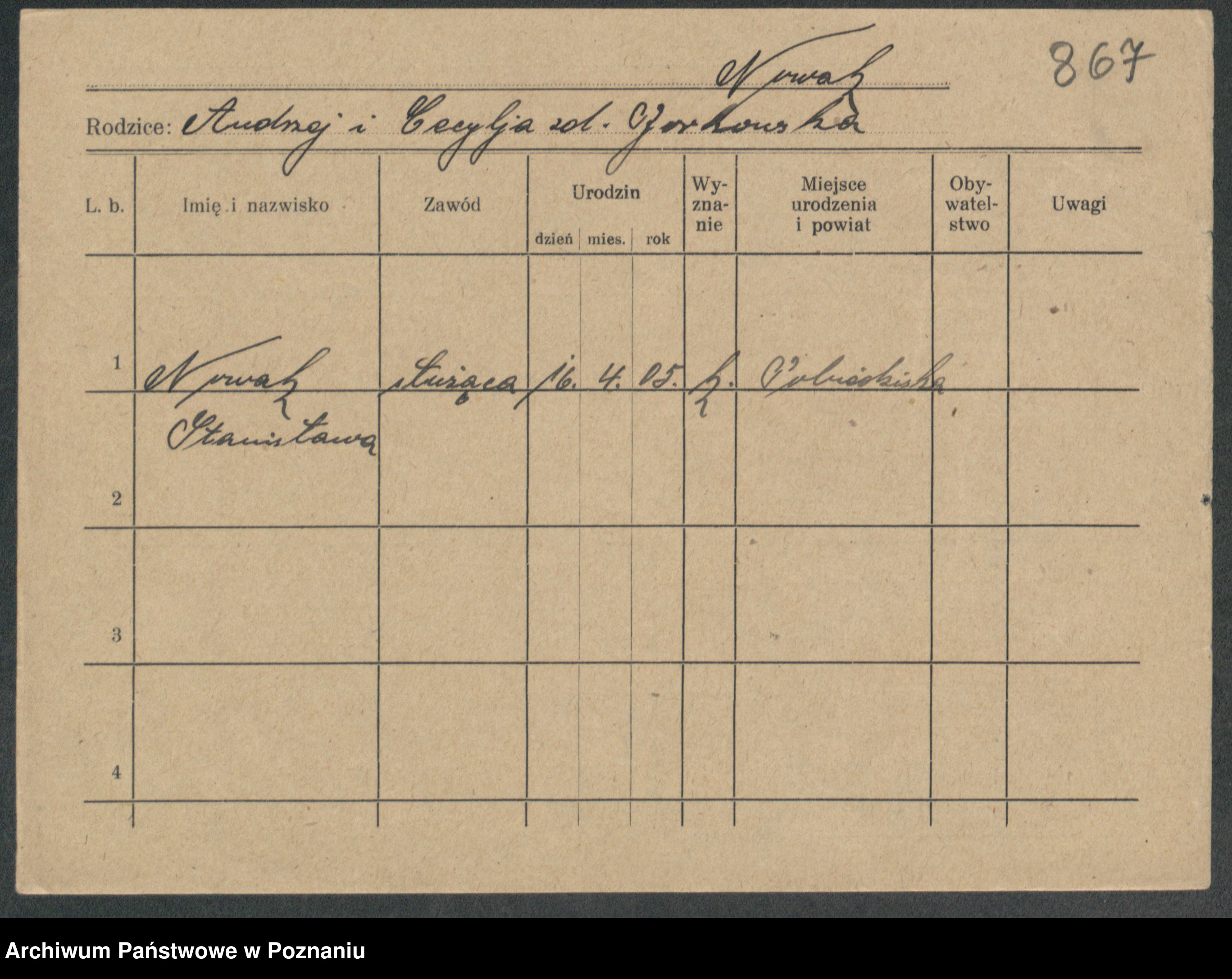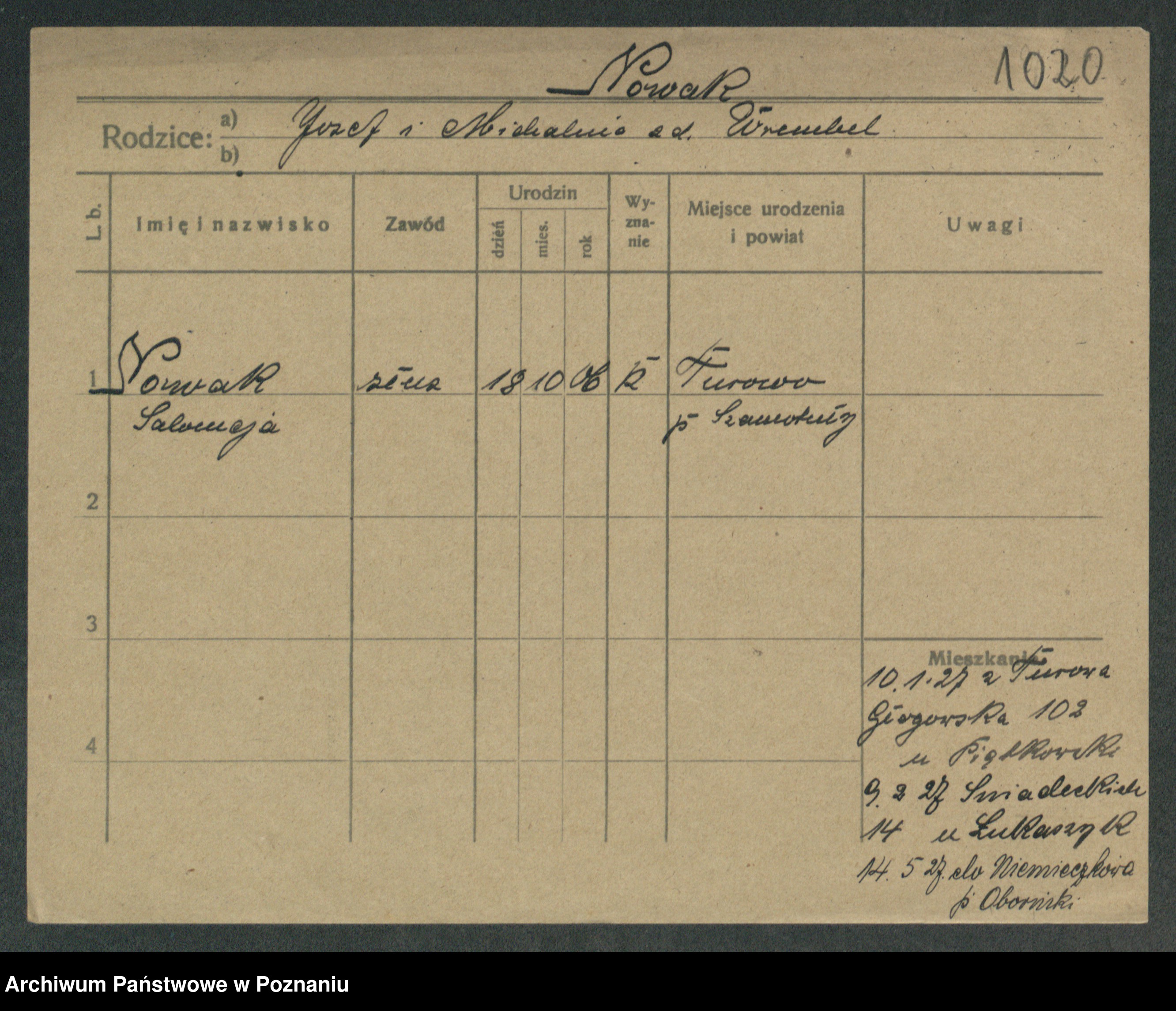 Podgląd karty osobowej dostępny jest po kliknięciu na nazwisko lub ikonkę karty. Można dokonywać powiększenia (ikony na górze) lub przechodzić między kolejnymi skanami (strzałki po bokach).