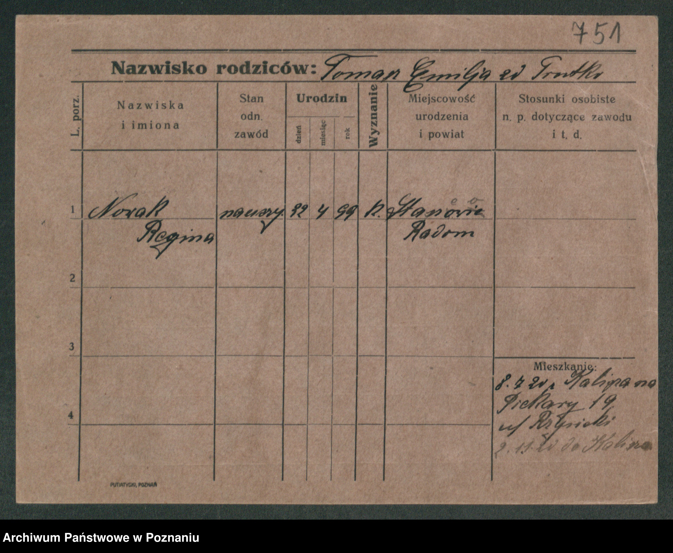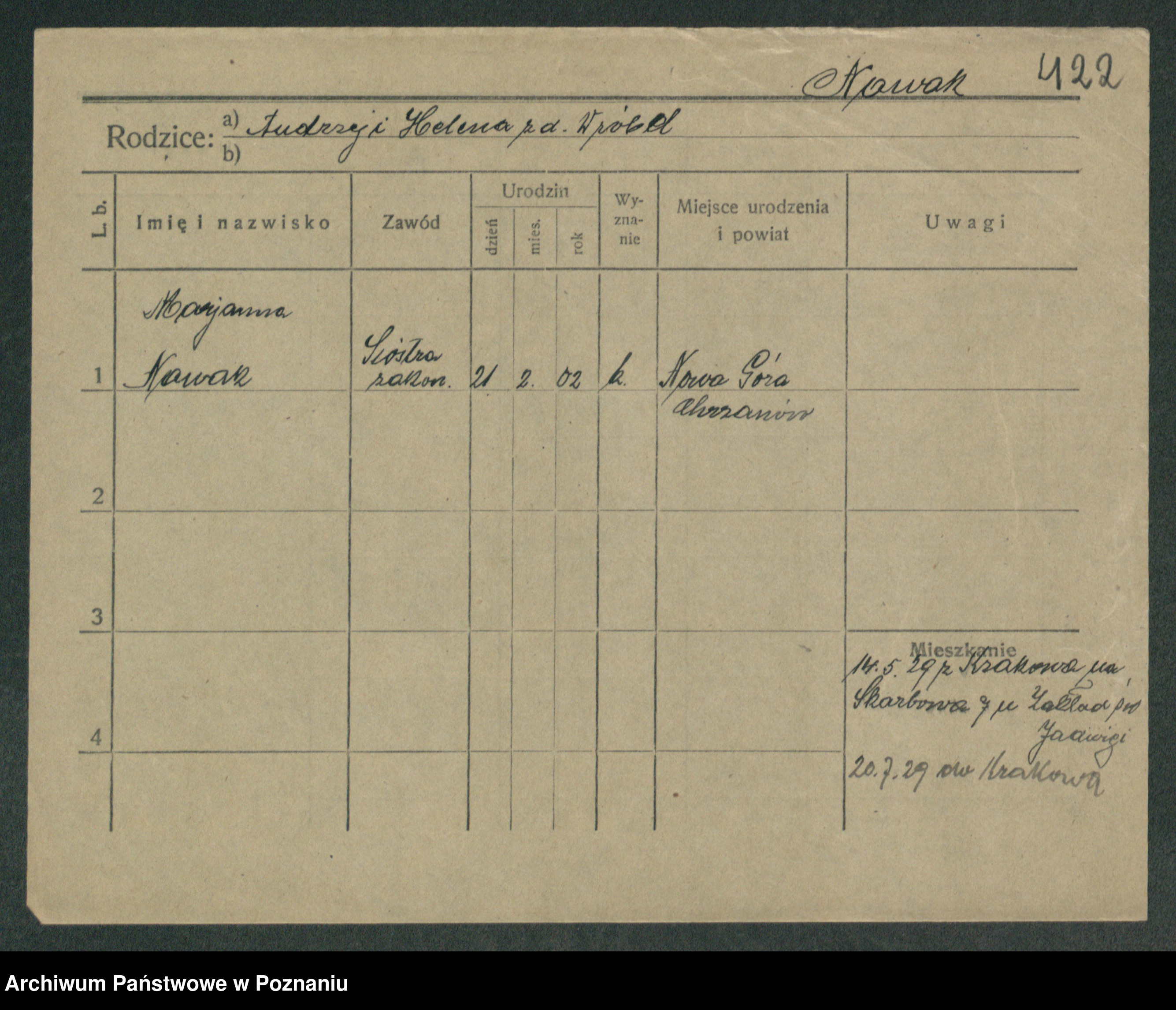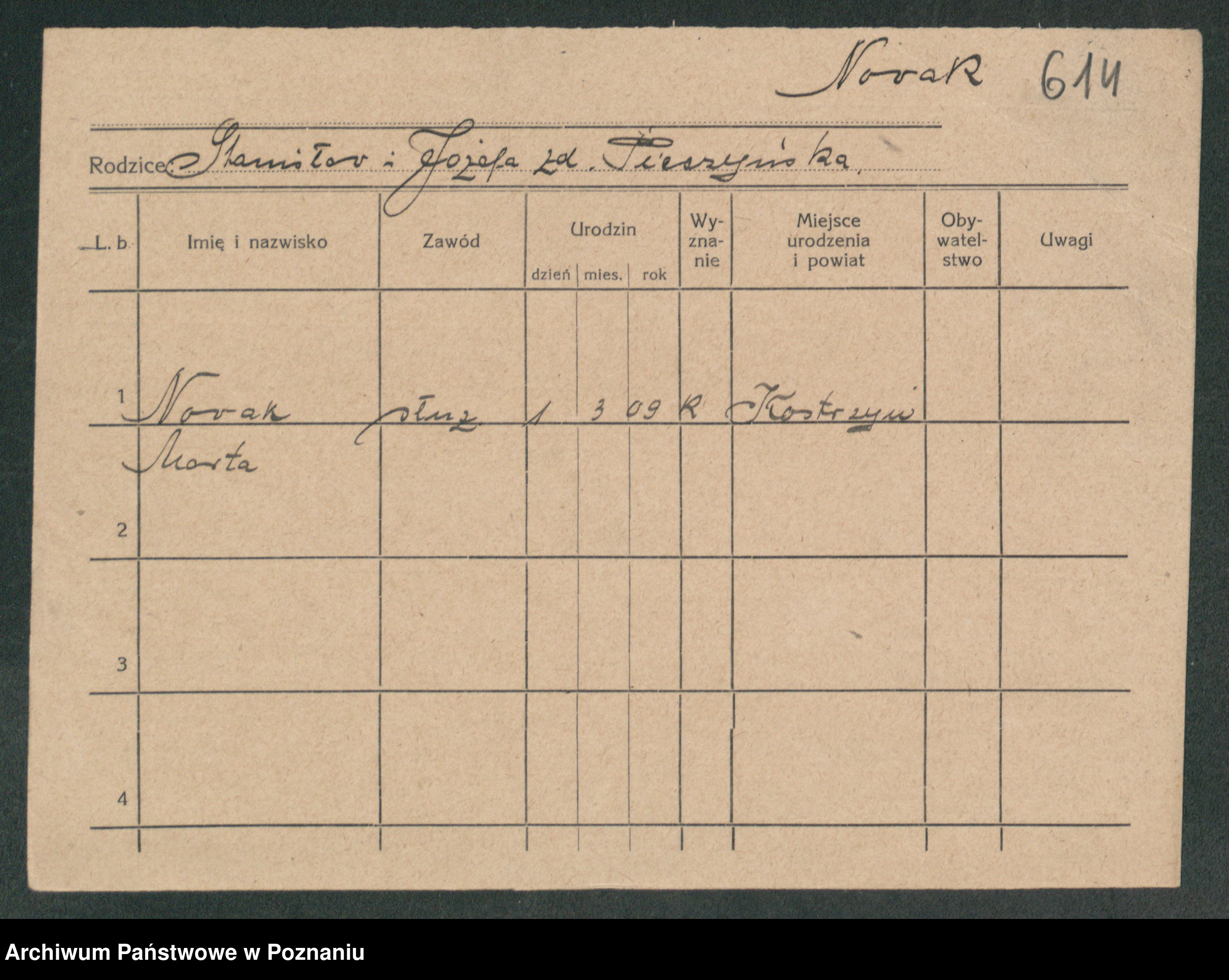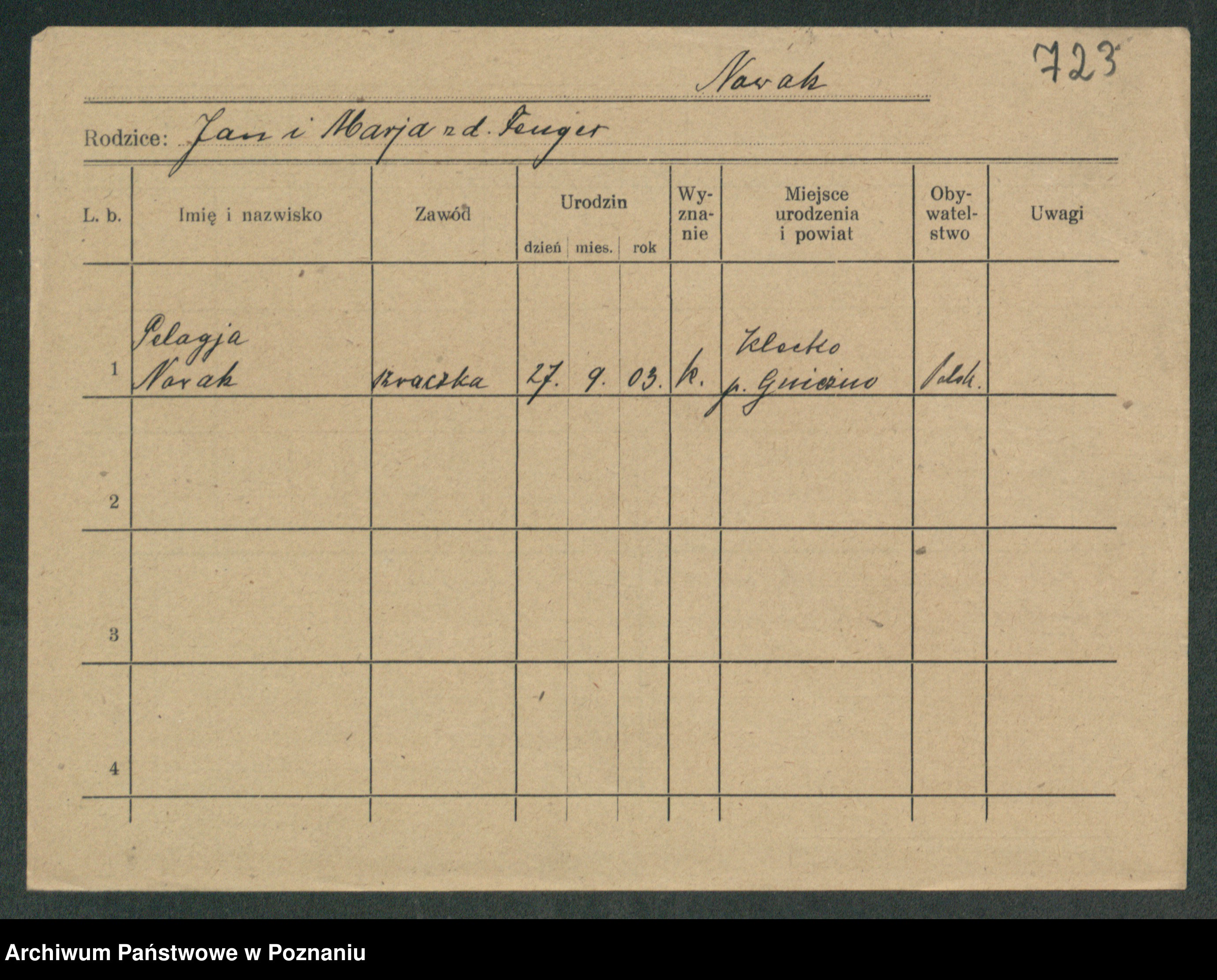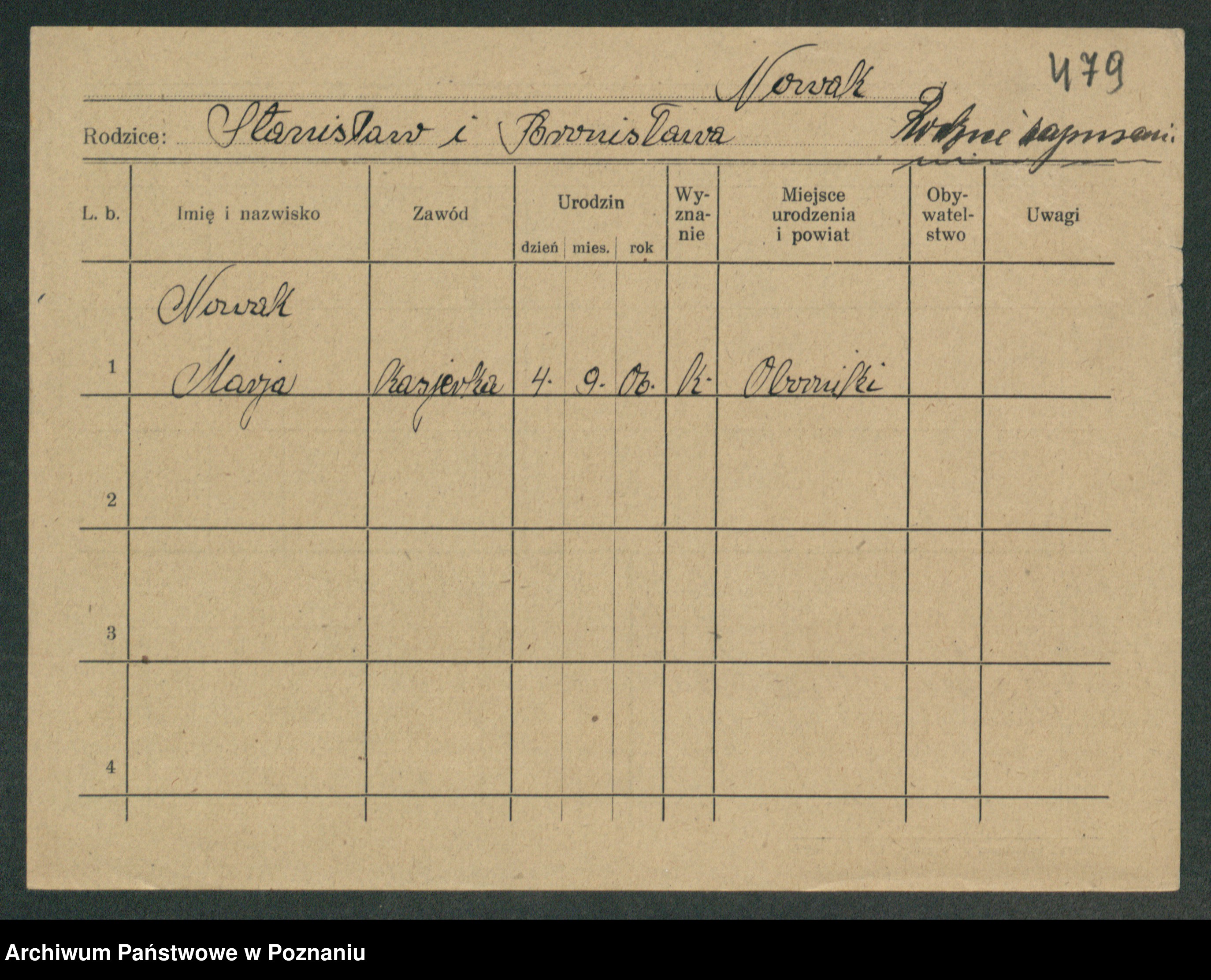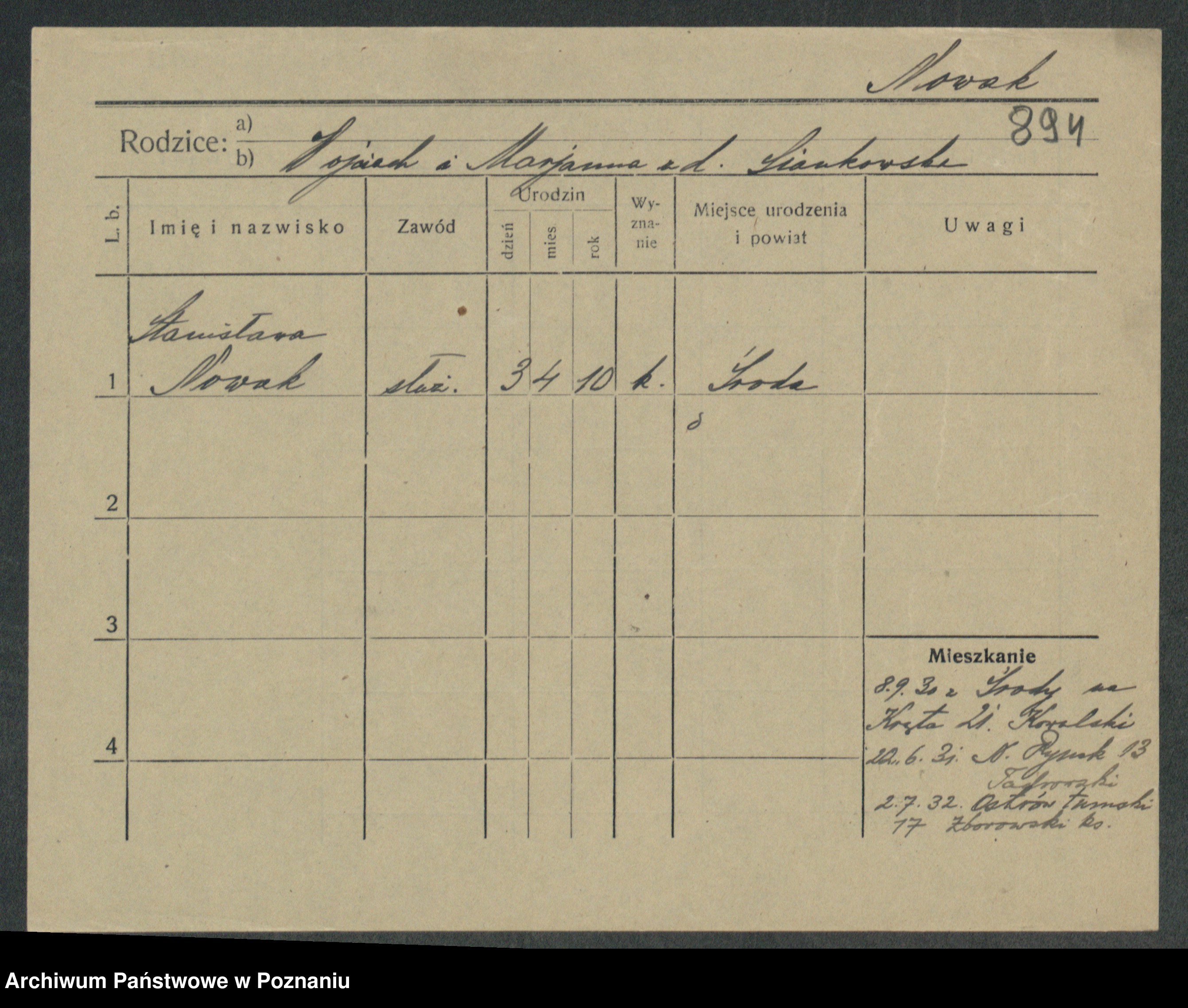 Podgląd karty osobowej dostępny jest po kliknięciu na nazwisko lub ikonkę karty. Można dokonywać powiększenia (ikony na górze) lub przechodzić między kolejnymi skanami (strzałki po bokach).