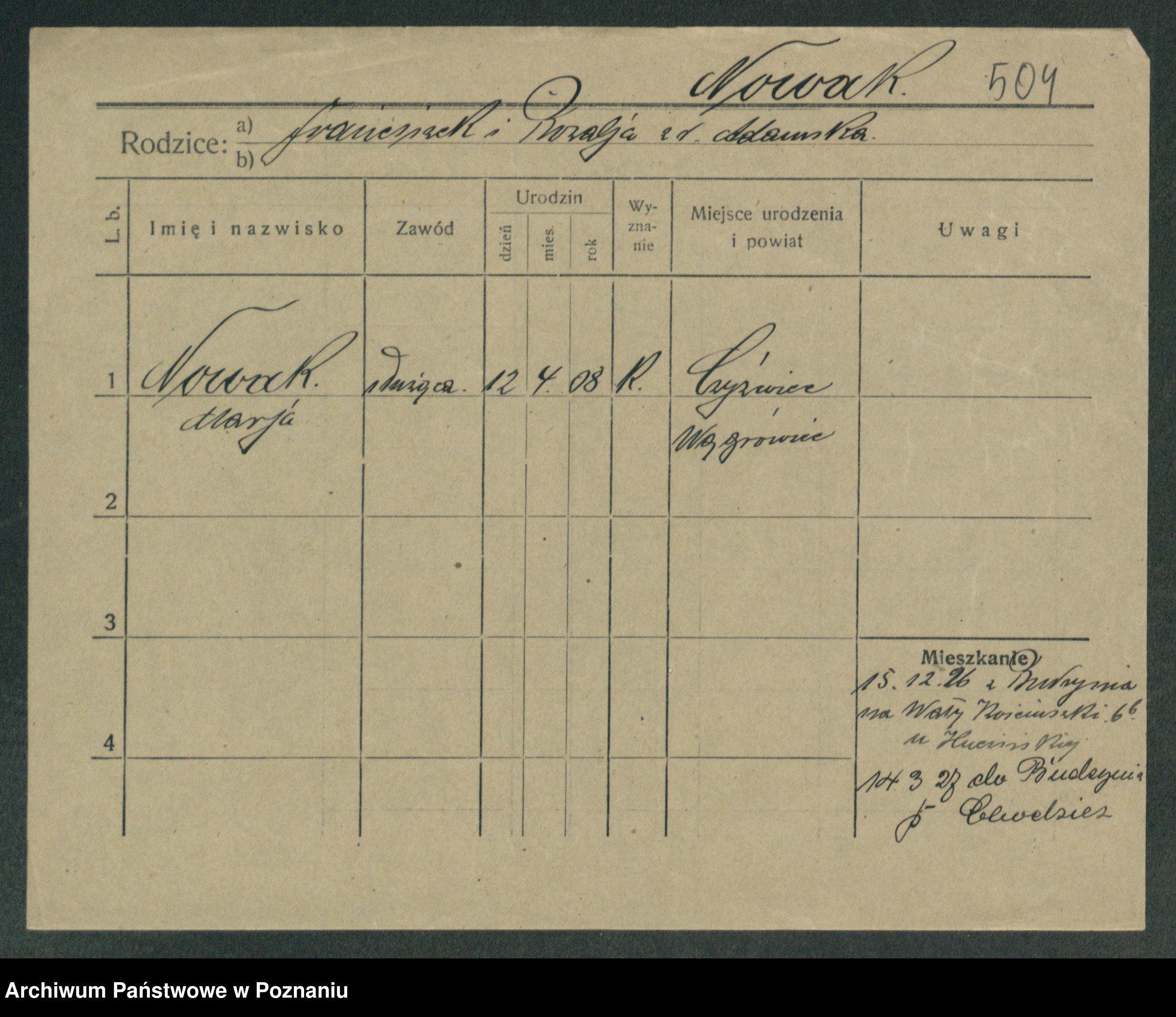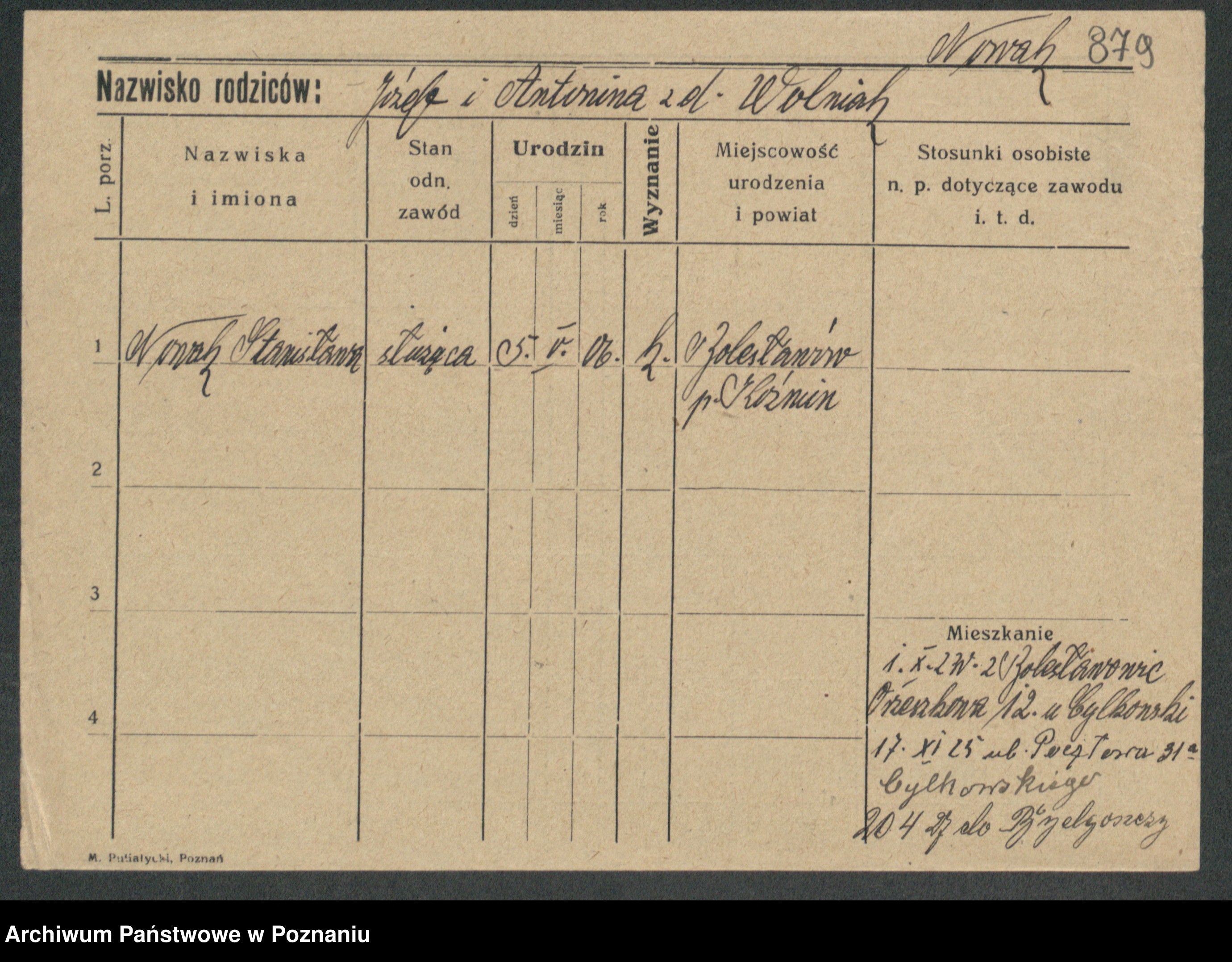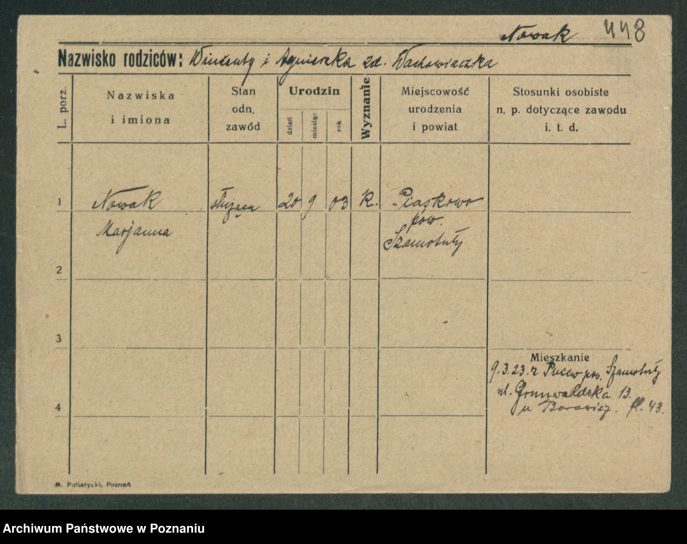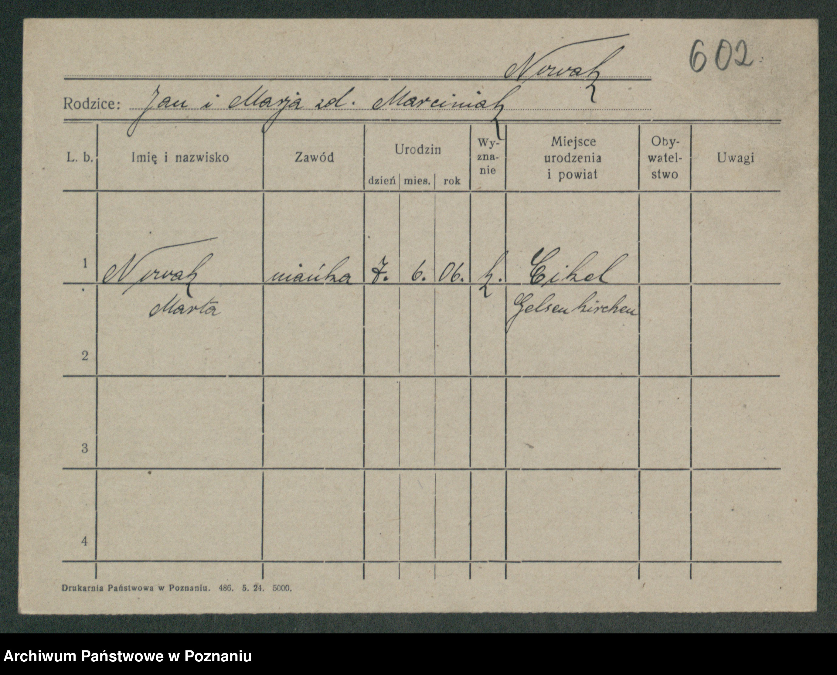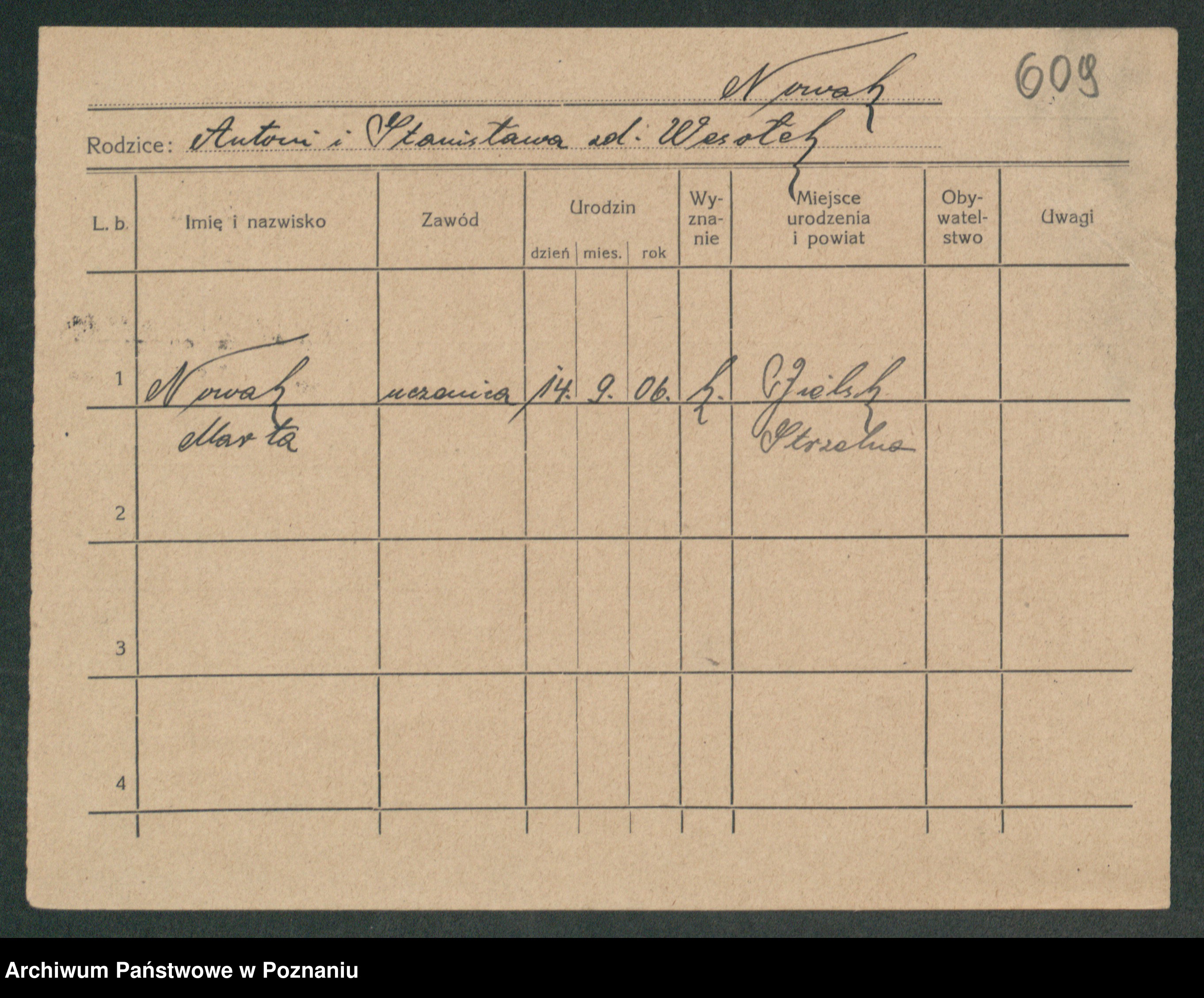 Podgląd karty osobowej dostępny jest po kliknięciu na nazwisko lub ikonkę karty. Można dokonywać powiększenia (ikony na górze) lub przechodzić między kolejnymi skanami (strzałki po bokach).