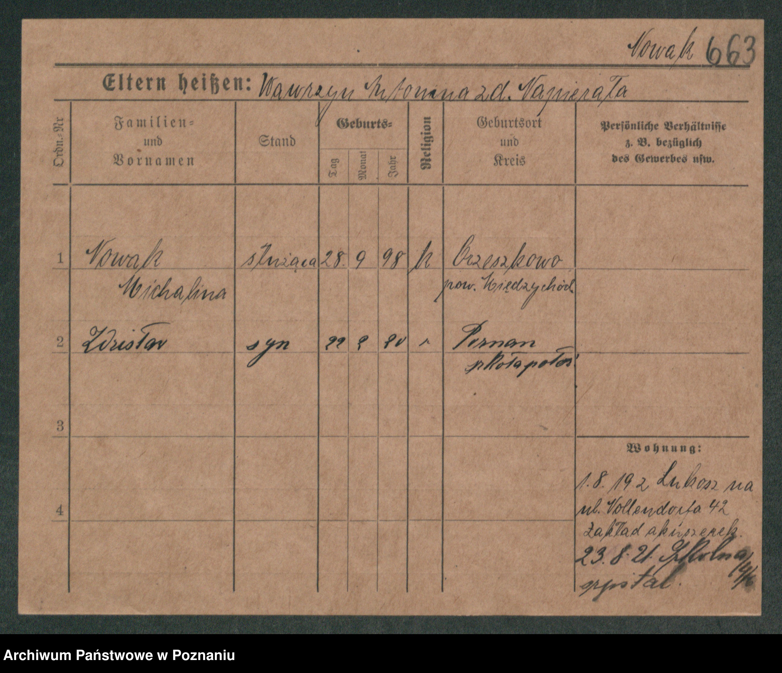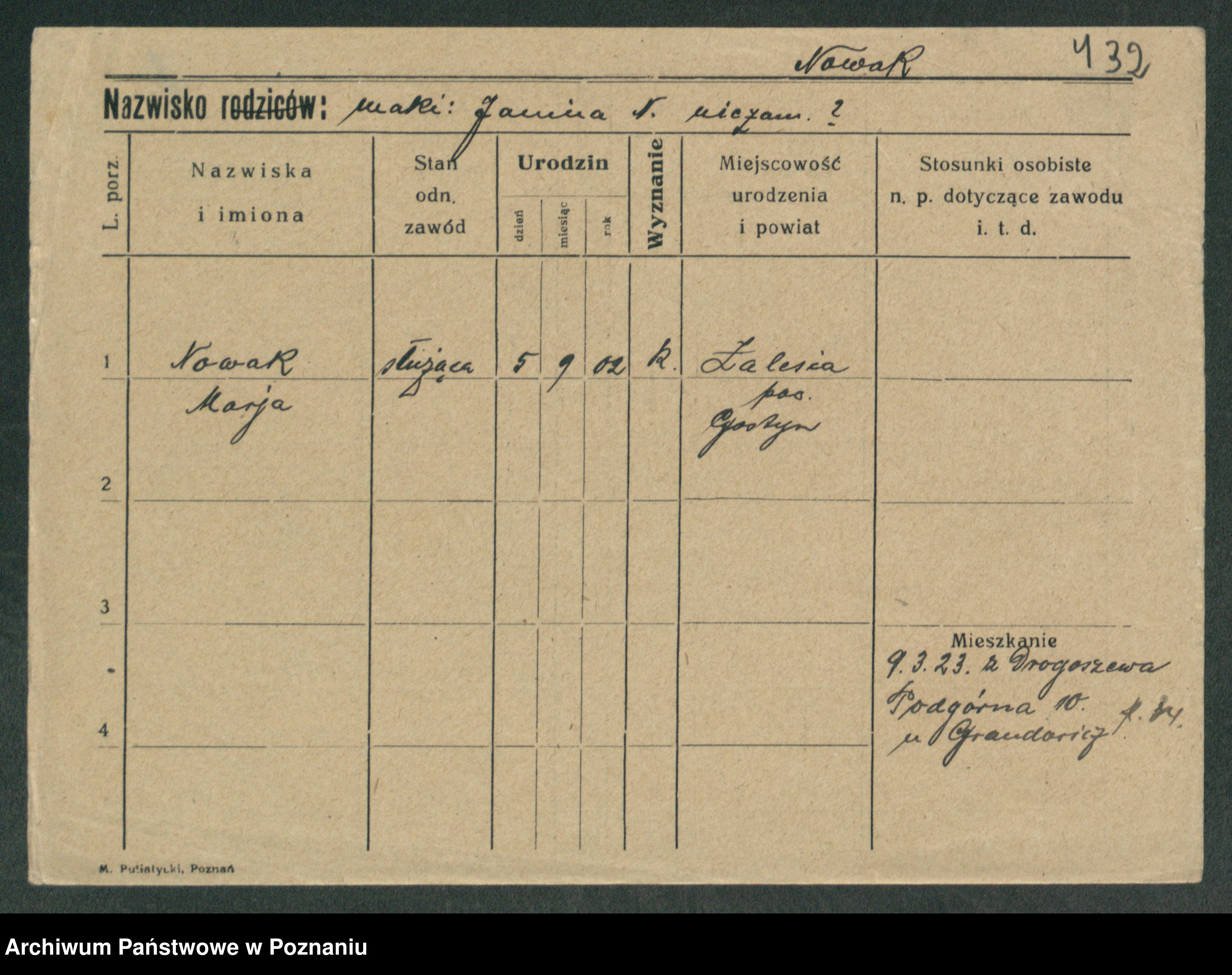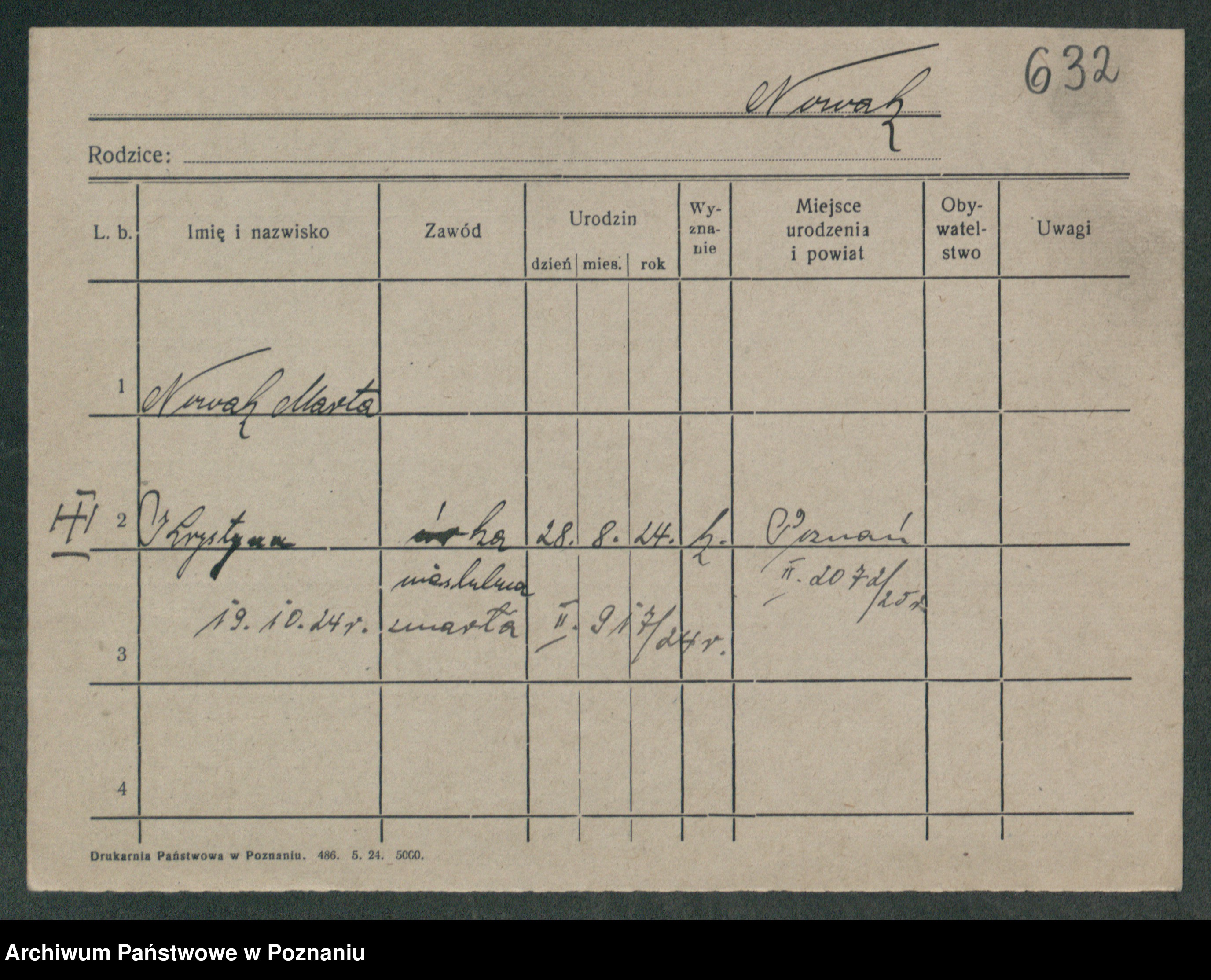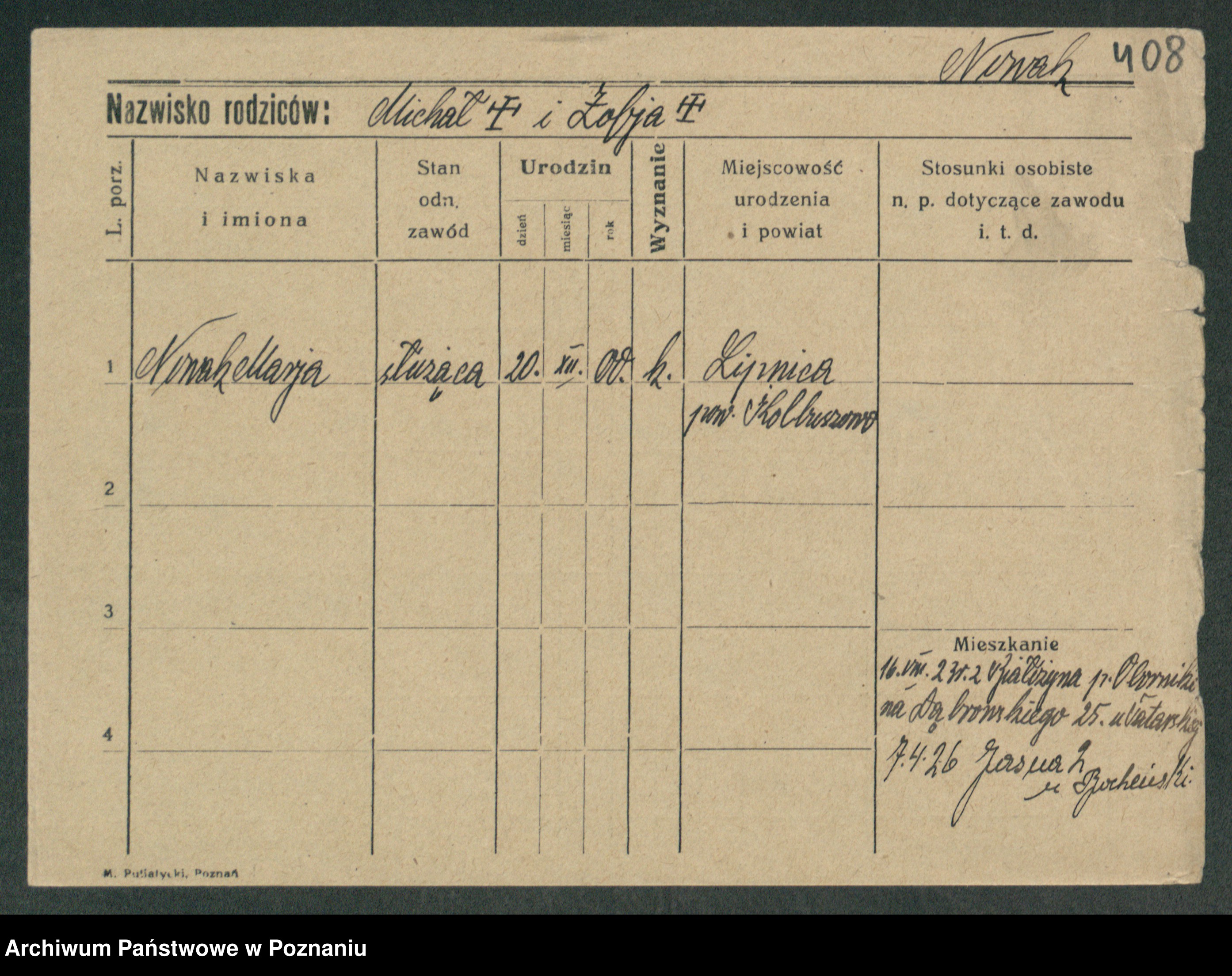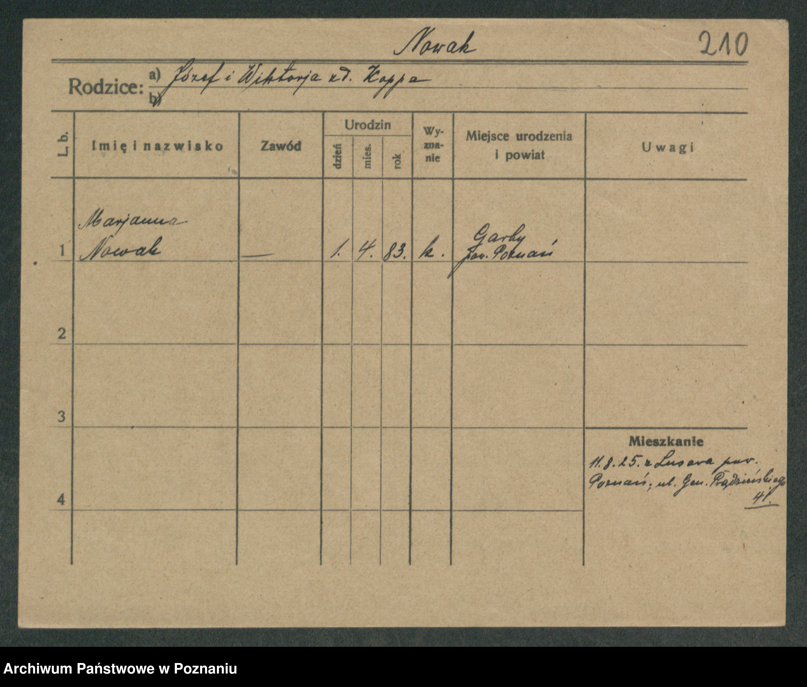 Podgląd karty osobowej dostępny jest po kliknięciu na nazwisko lub ikonkę karty. Można dokonywać powiększenia (ikony na górze) lub przechodzić między kolejnymi skanami (strzałki po bokach).