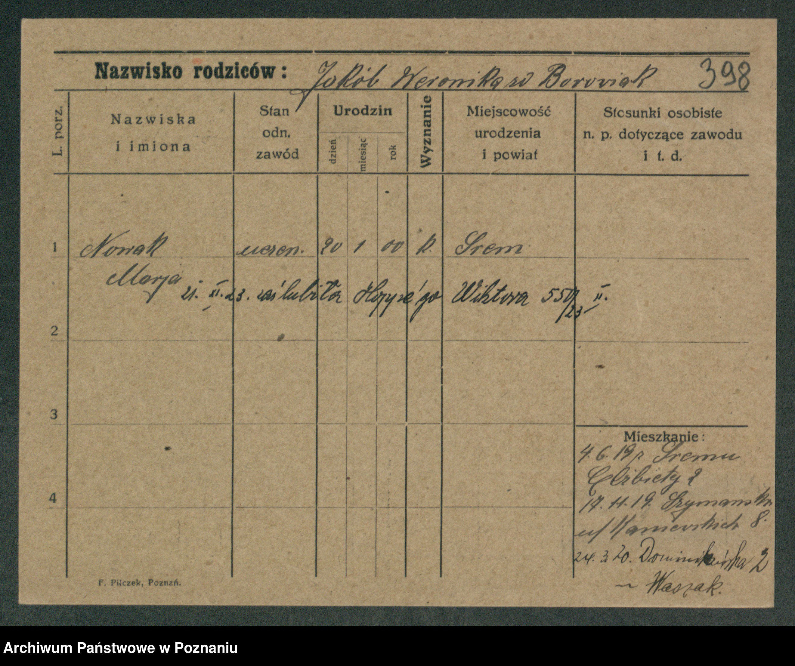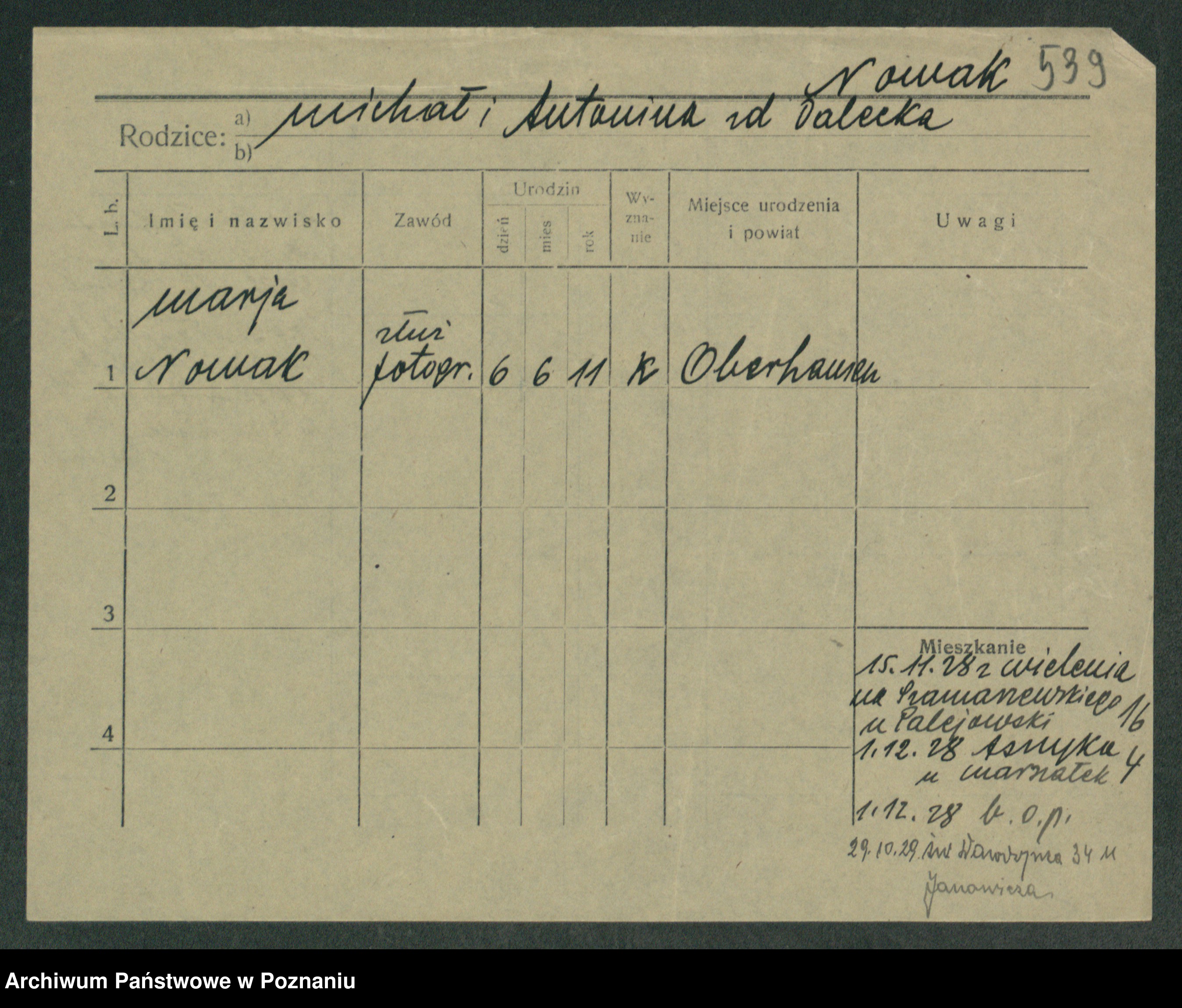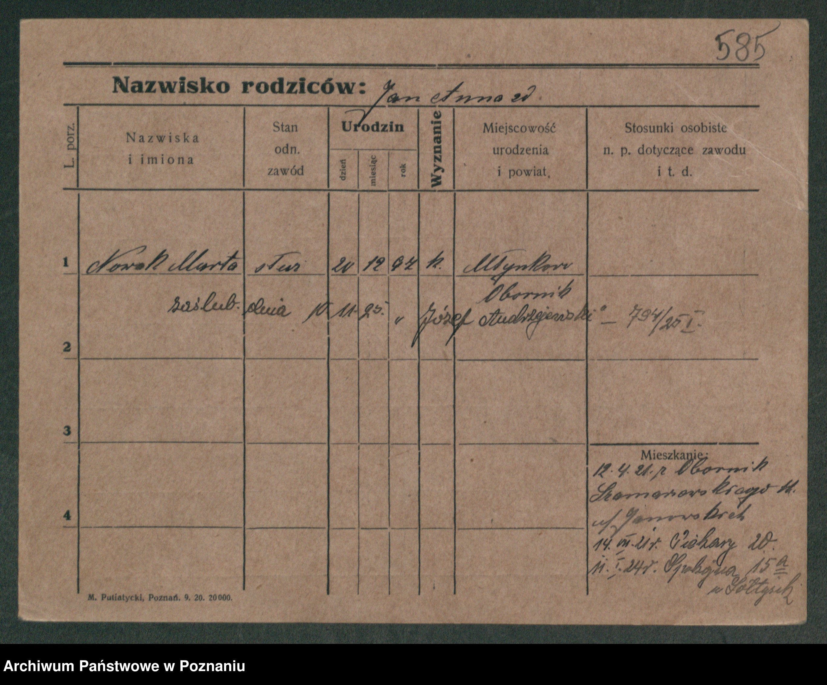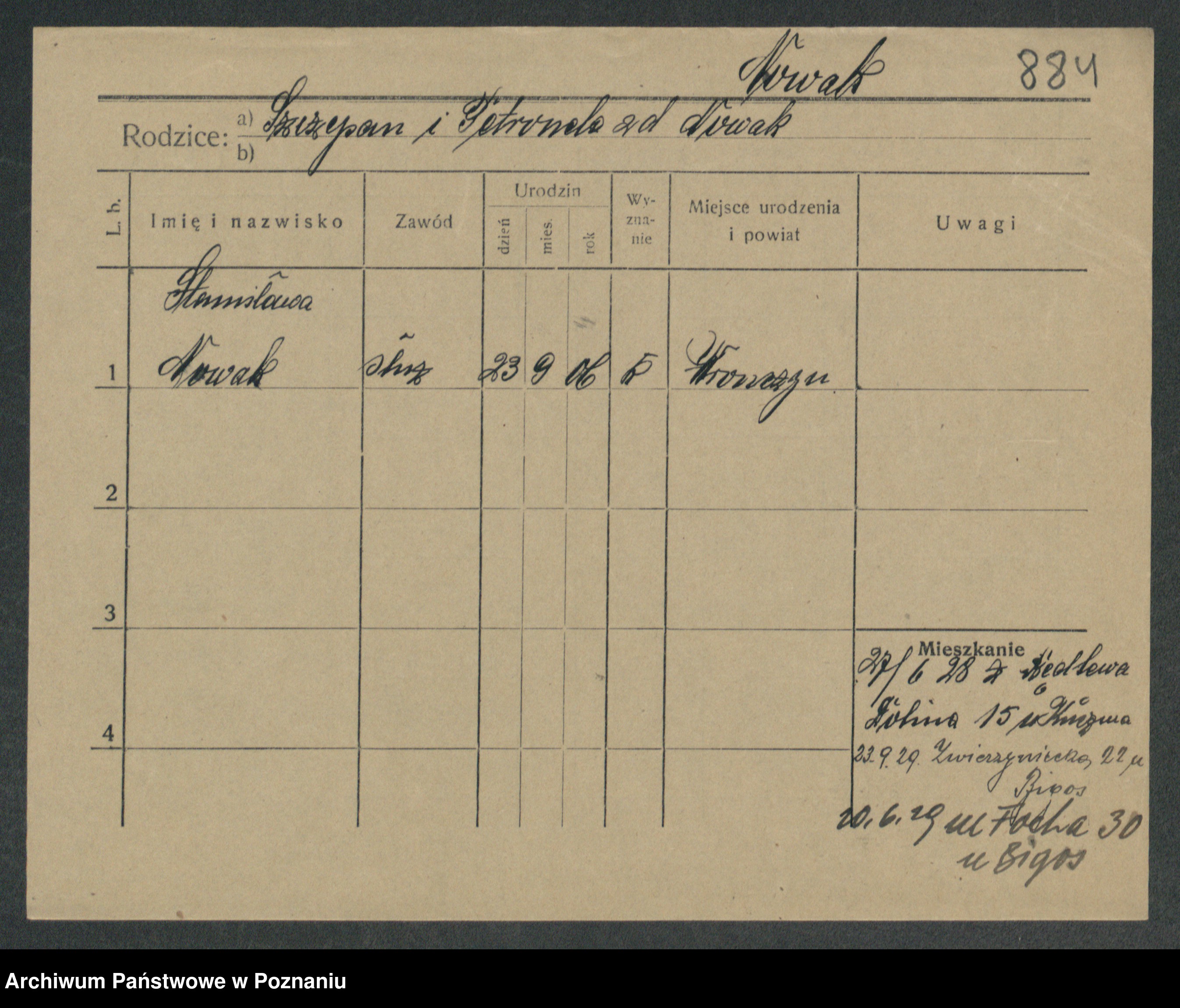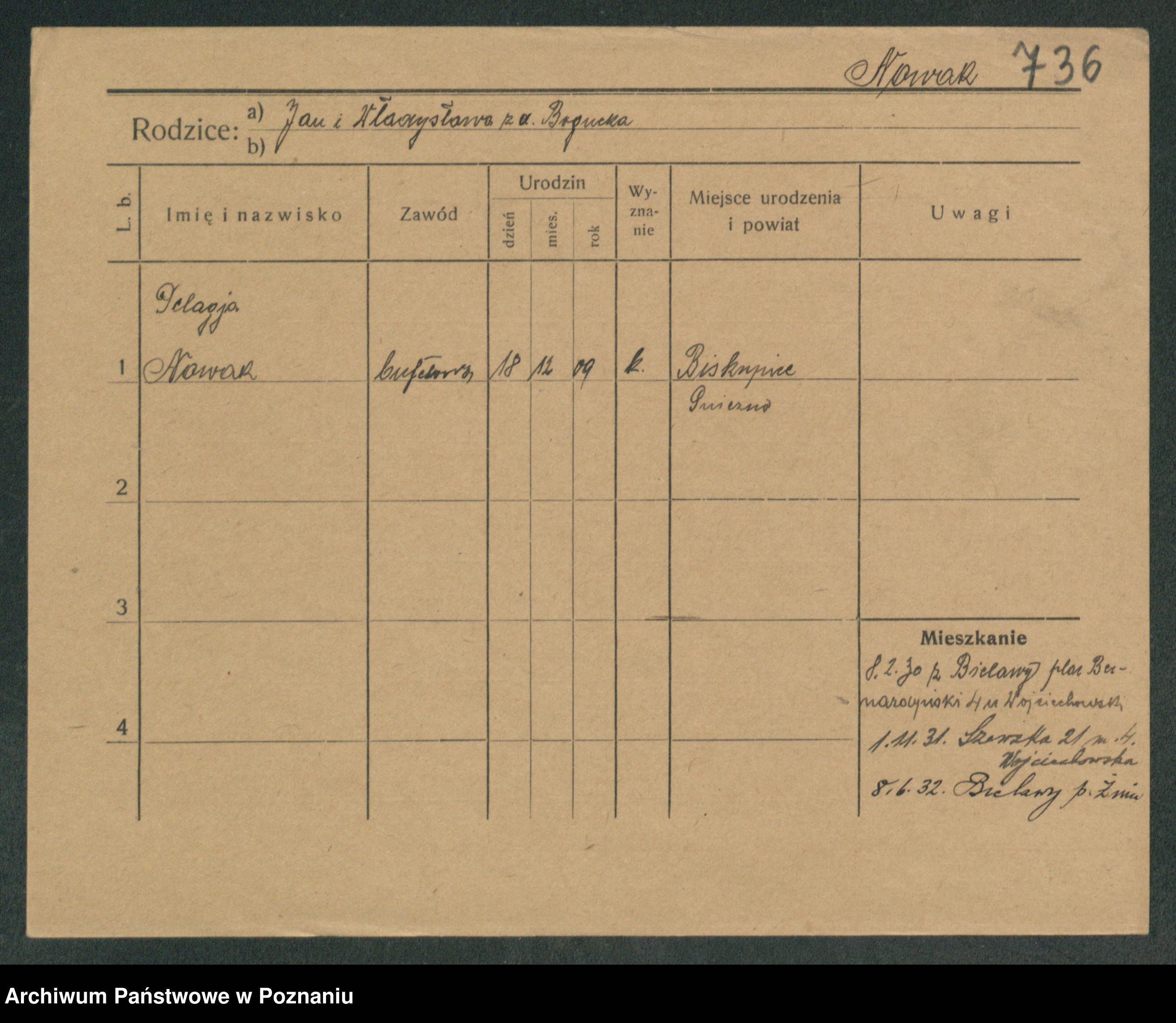 Podgląd karty osobowej dostępny jest po kliknięciu na nazwisko lub ikonkę karty. Można dokonywać powiększenia (ikony na górze) lub przechodzić między kolejnymi skanami (strzałki po bokach).