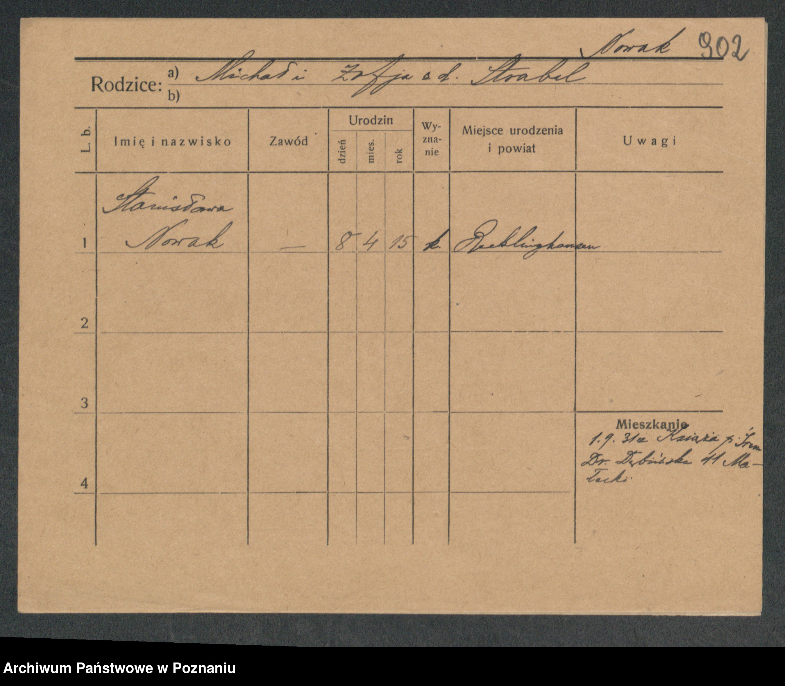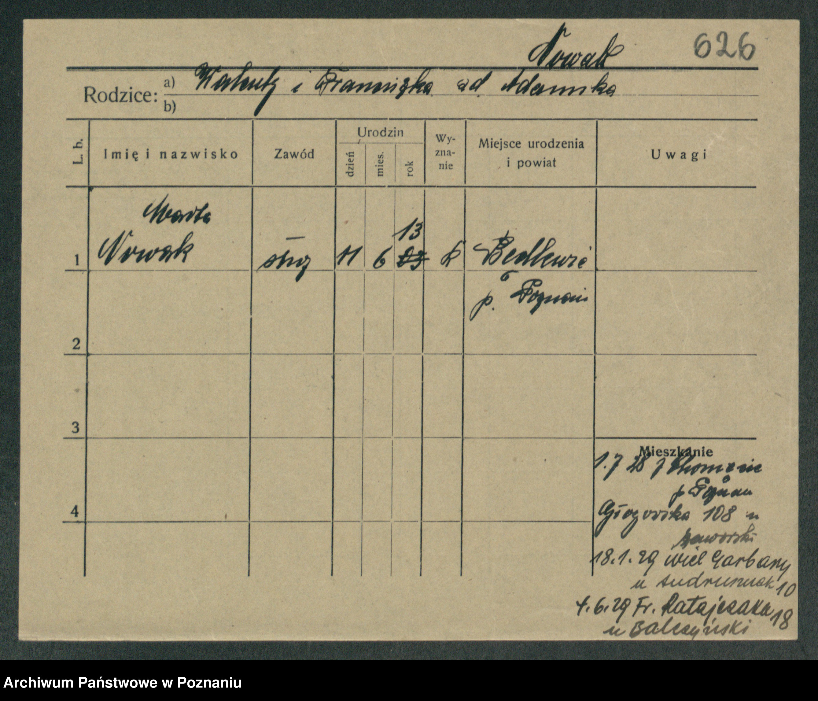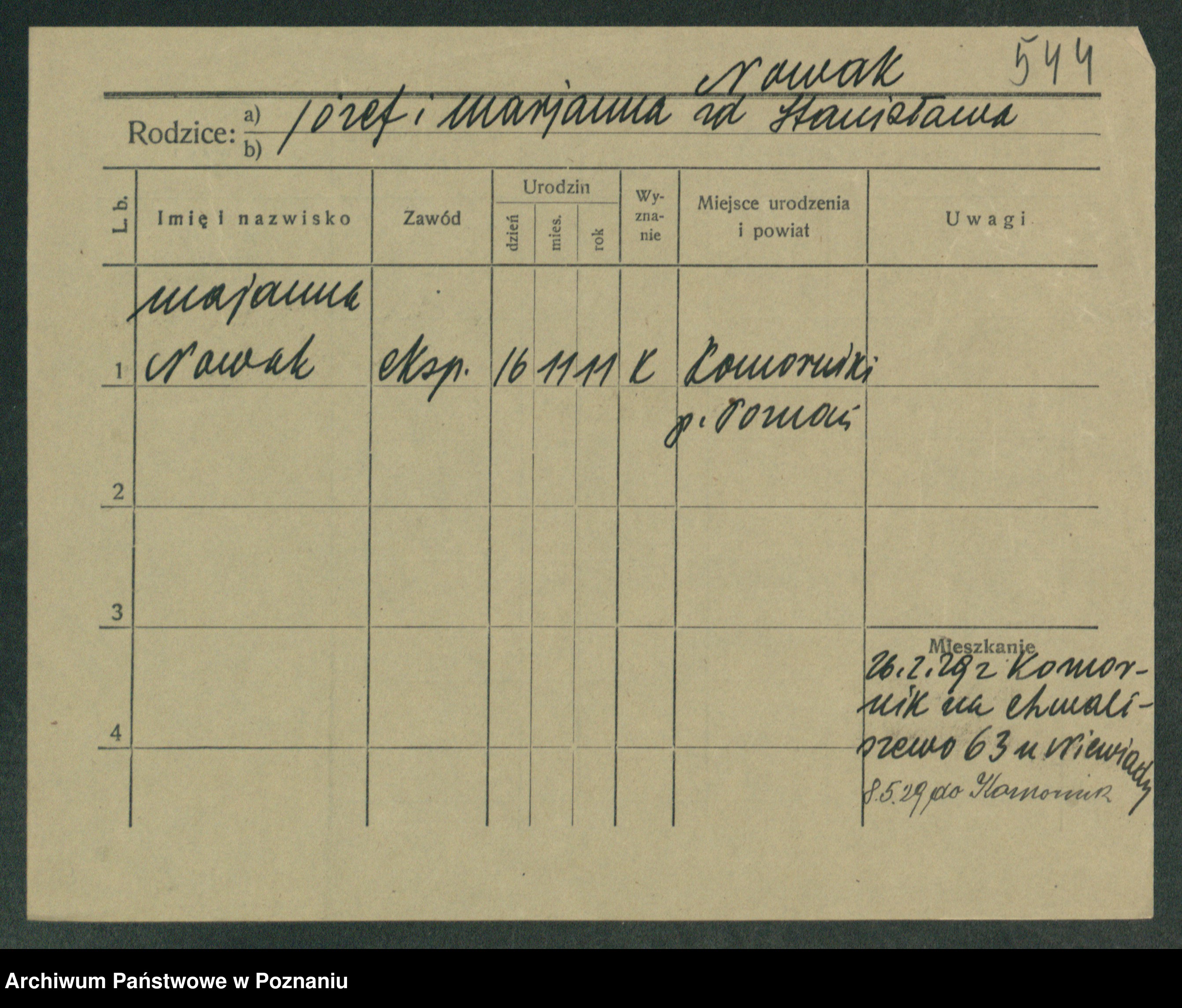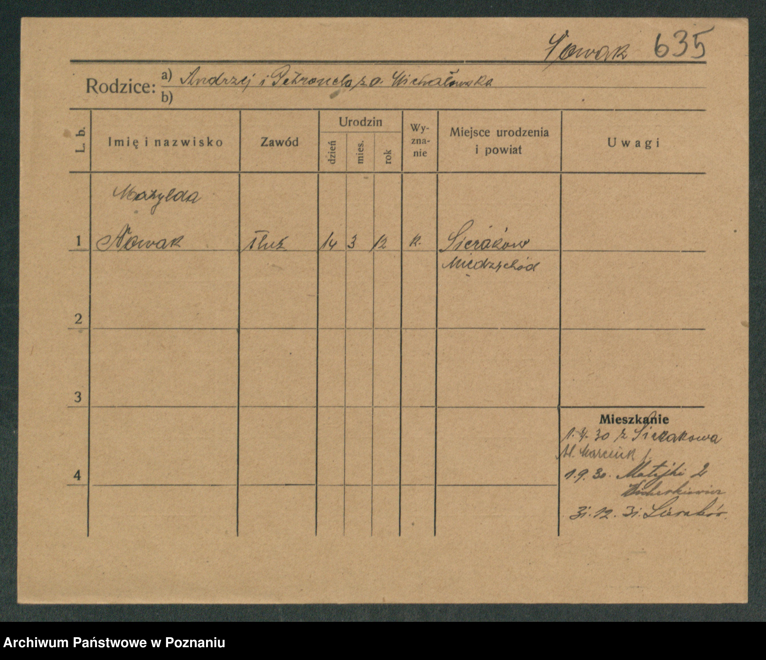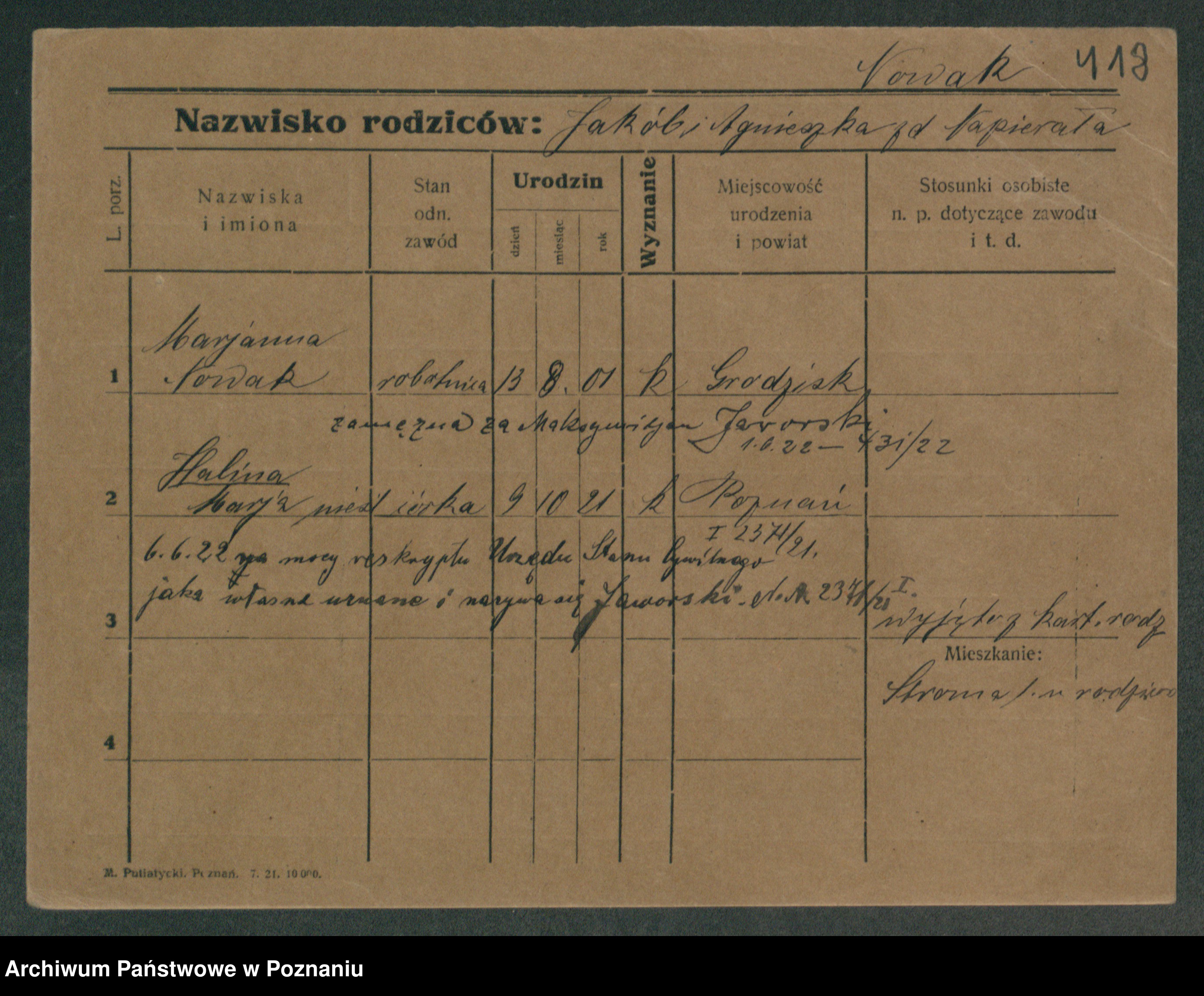 Podgląd karty osobowej dostępny jest po kliknięciu na nazwisko lub ikonkę karty. Można dokonywać powiększenia (ikony na górze) lub przechodzić między kolejnymi skanami (strzałki po bokach).