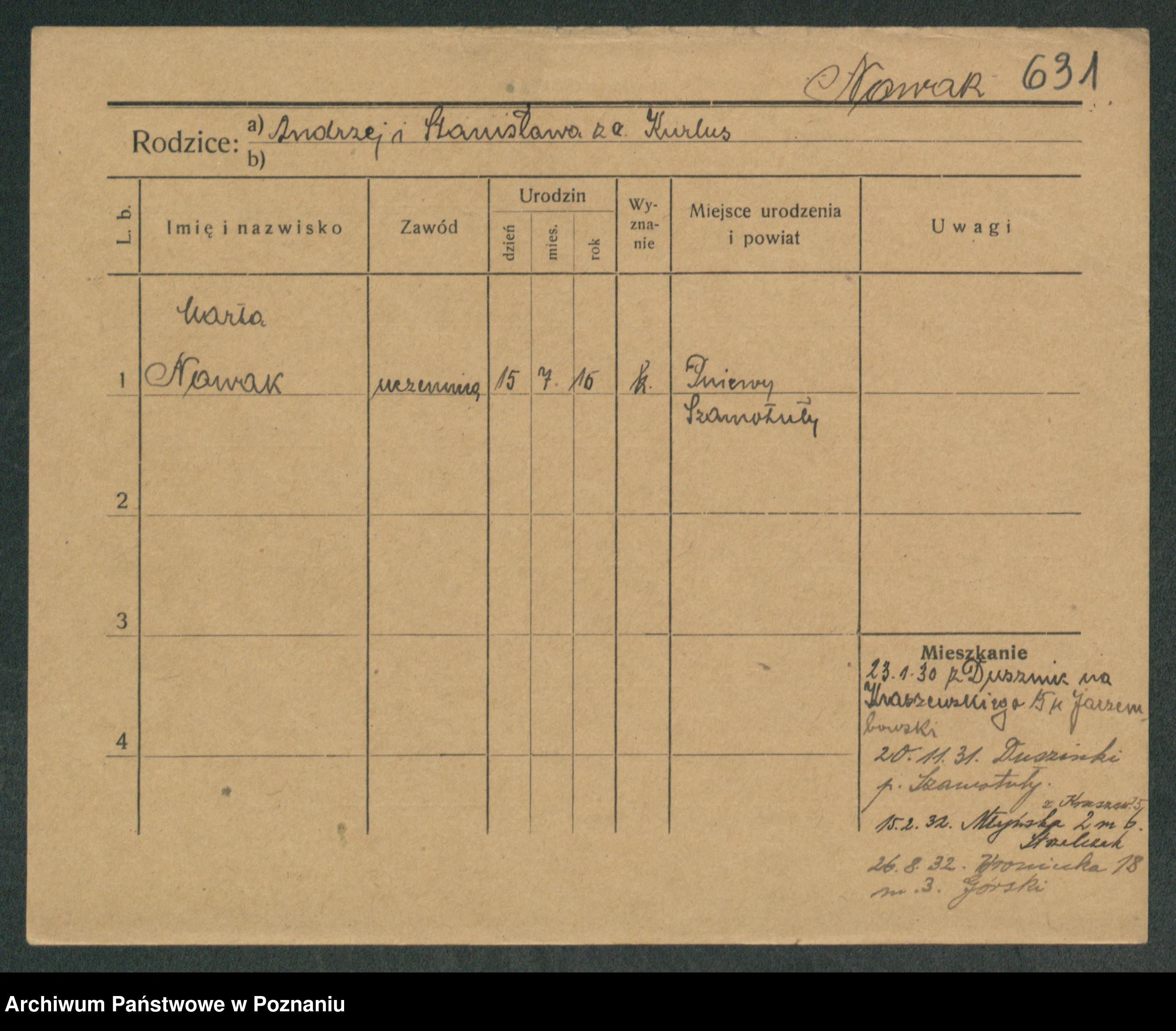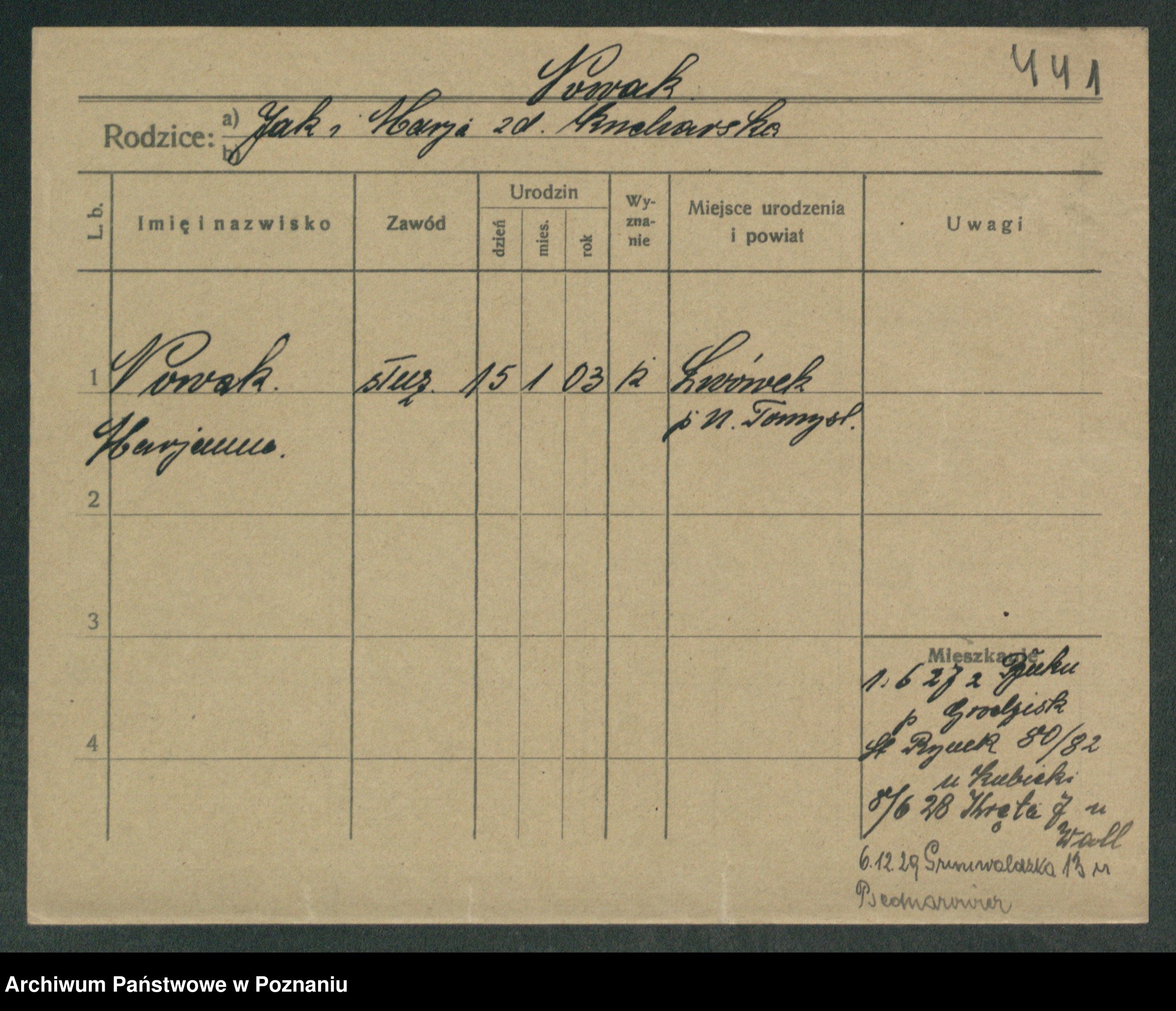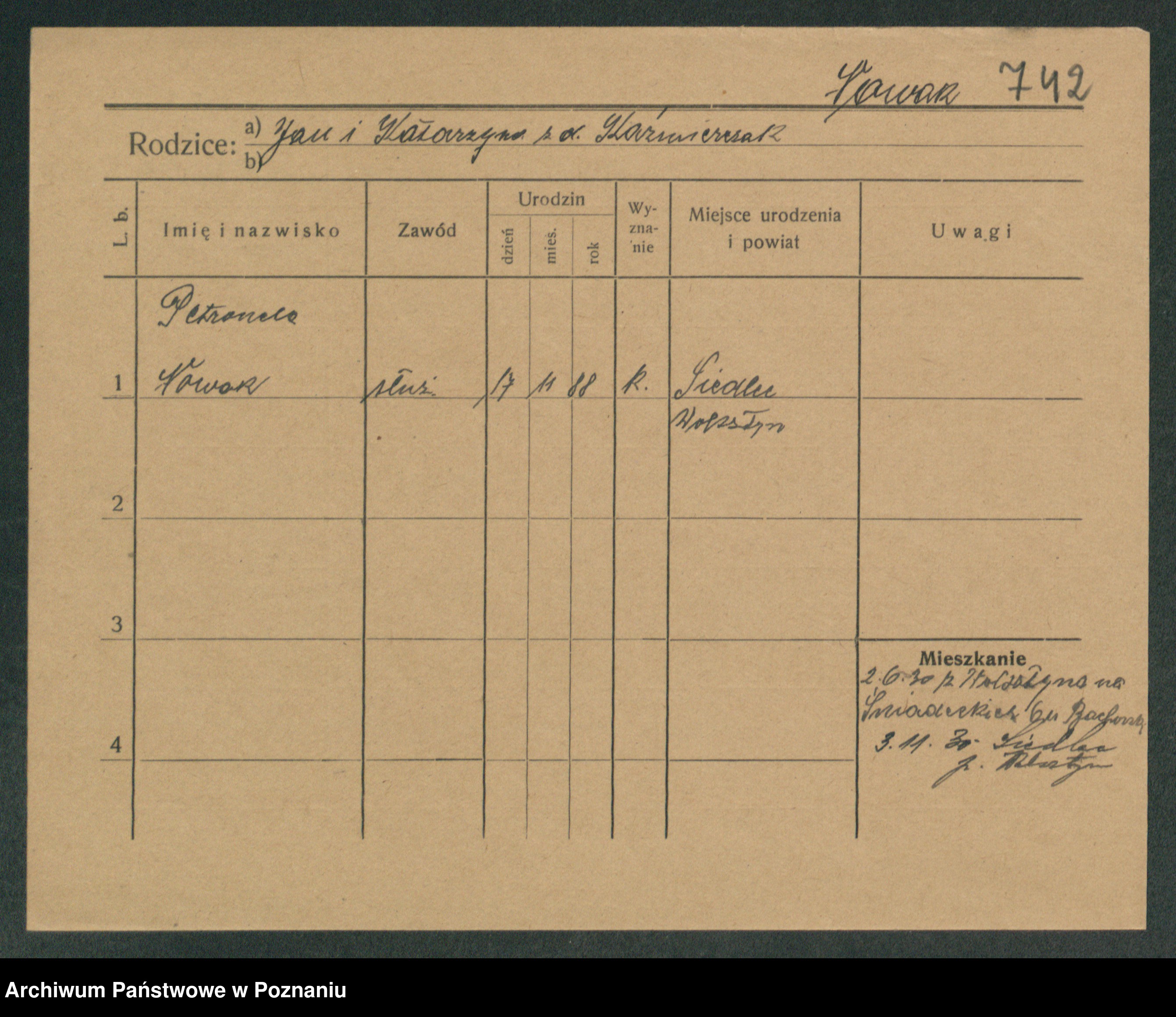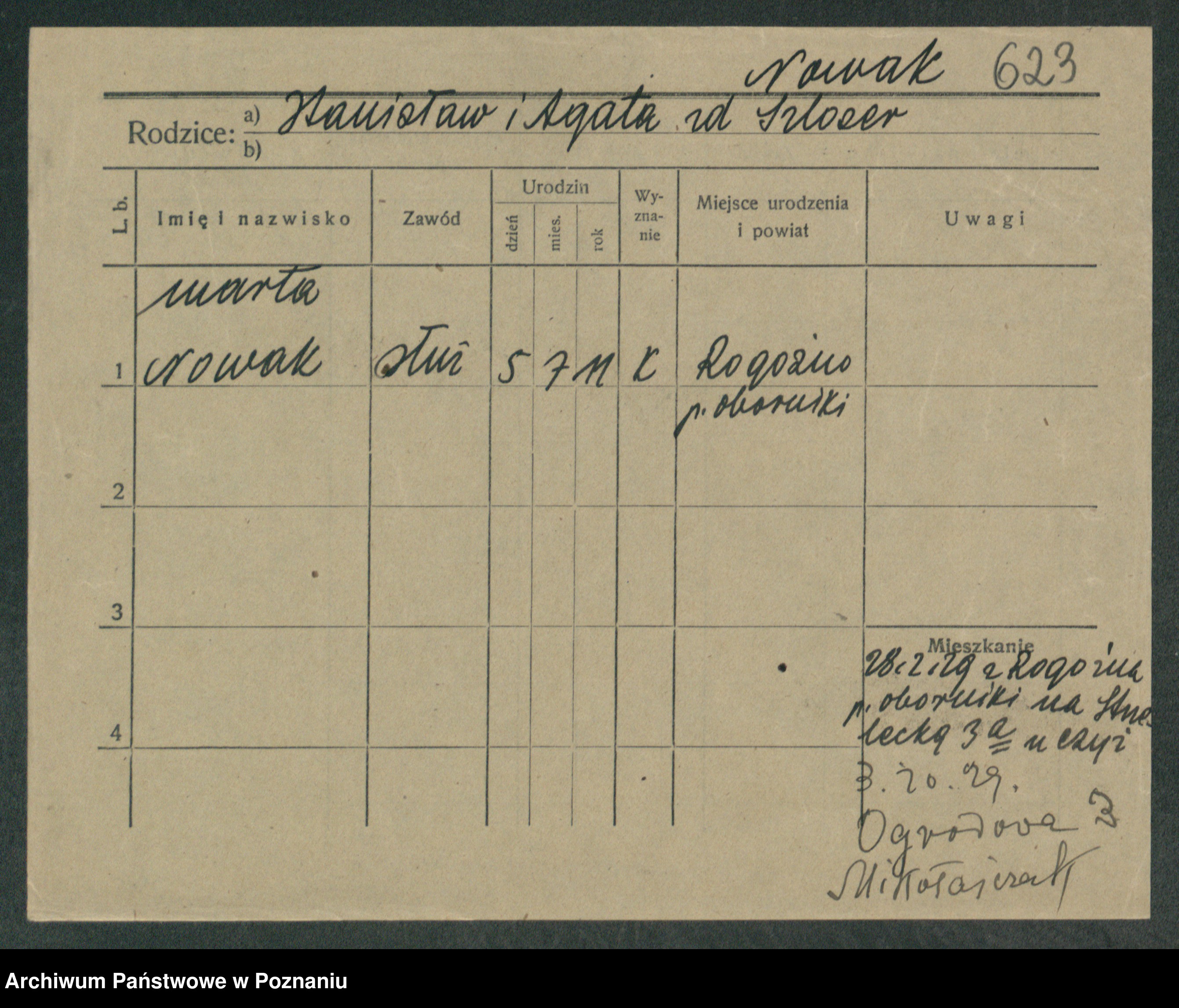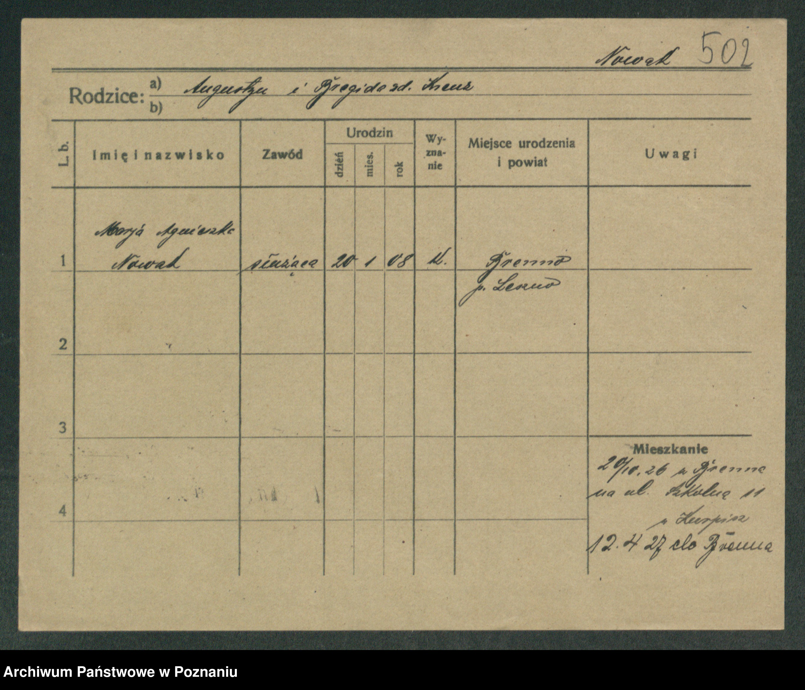 Podgląd karty osobowej dostępny jest po kliknięciu na nazwisko lub ikonkę karty. Można dokonywać powiększenia (ikony na górze) lub przechodzić między kolejnymi skanami (strzałki po bokach).