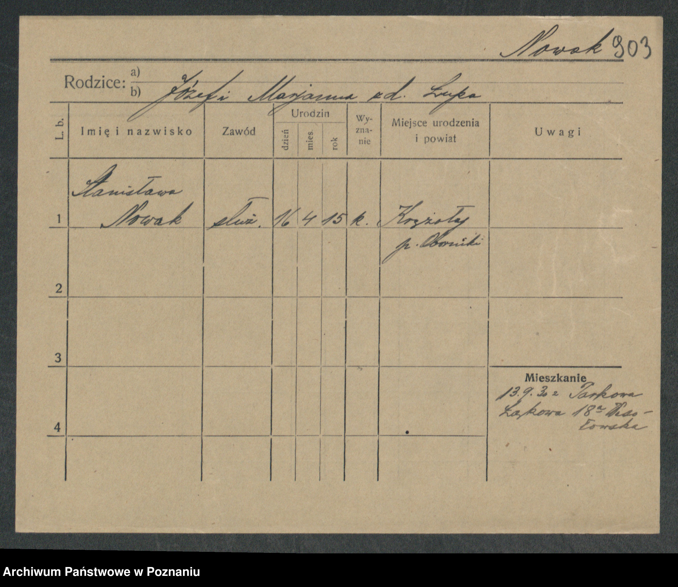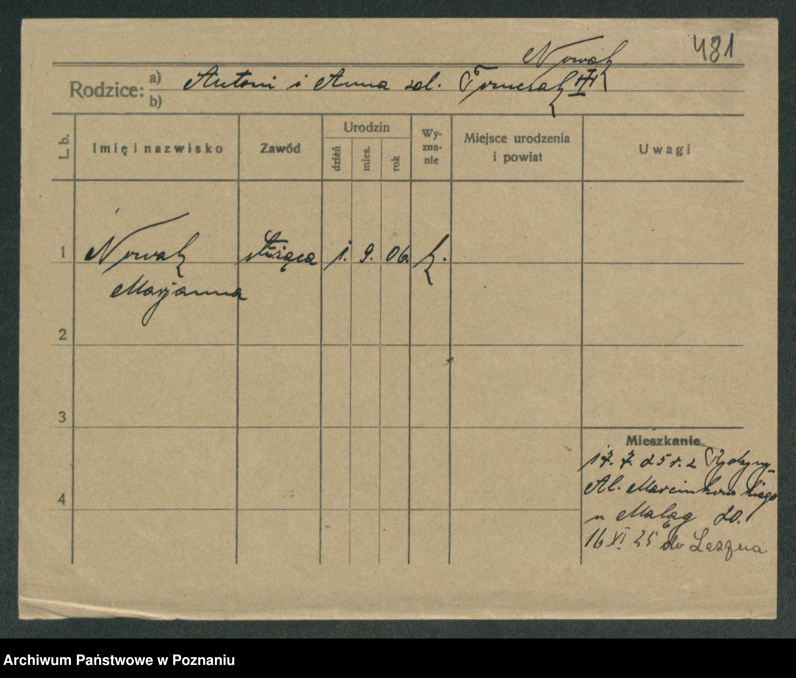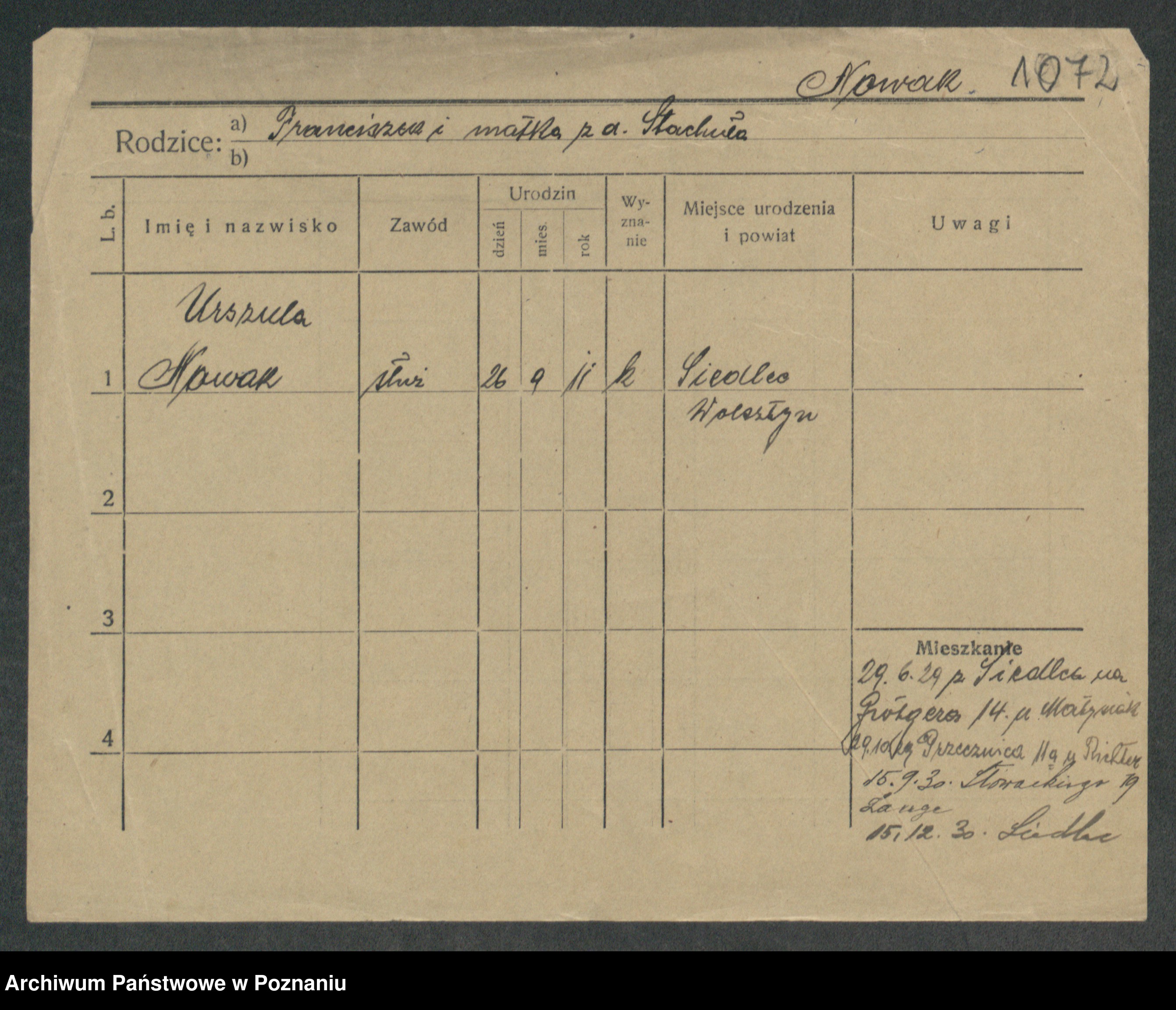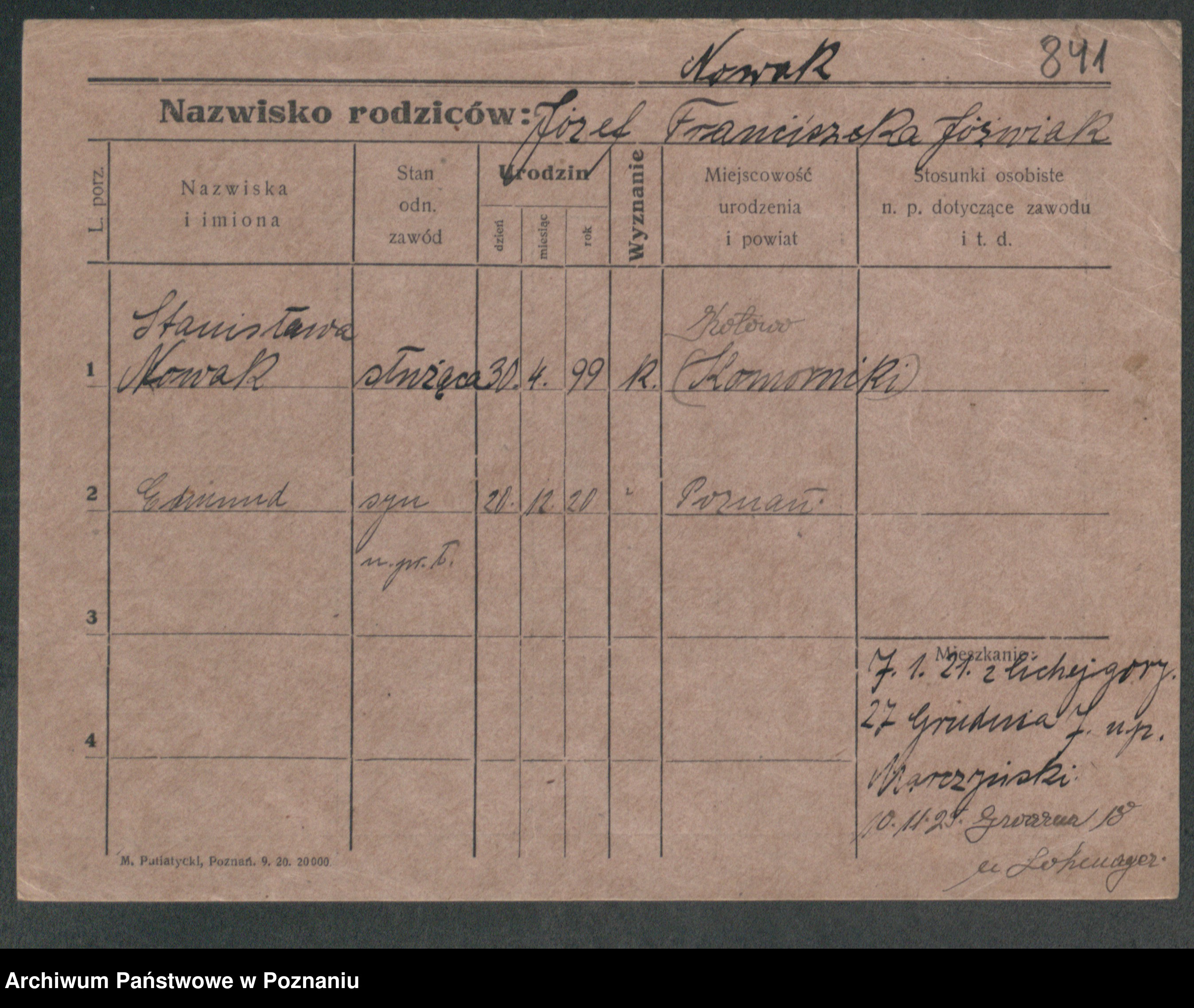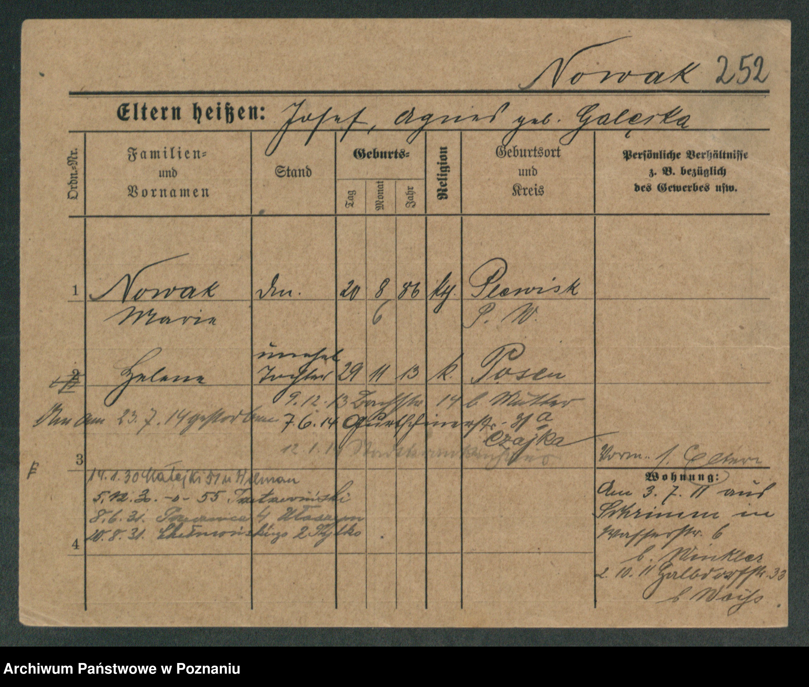 Podgląd karty osobowej dostępny jest po kliknięciu na nazwisko lub ikonkę karty. Można dokonywać powiększenia (ikony na górze) lub przechodzić między kolejnymi skanami (strzałki po bokach).