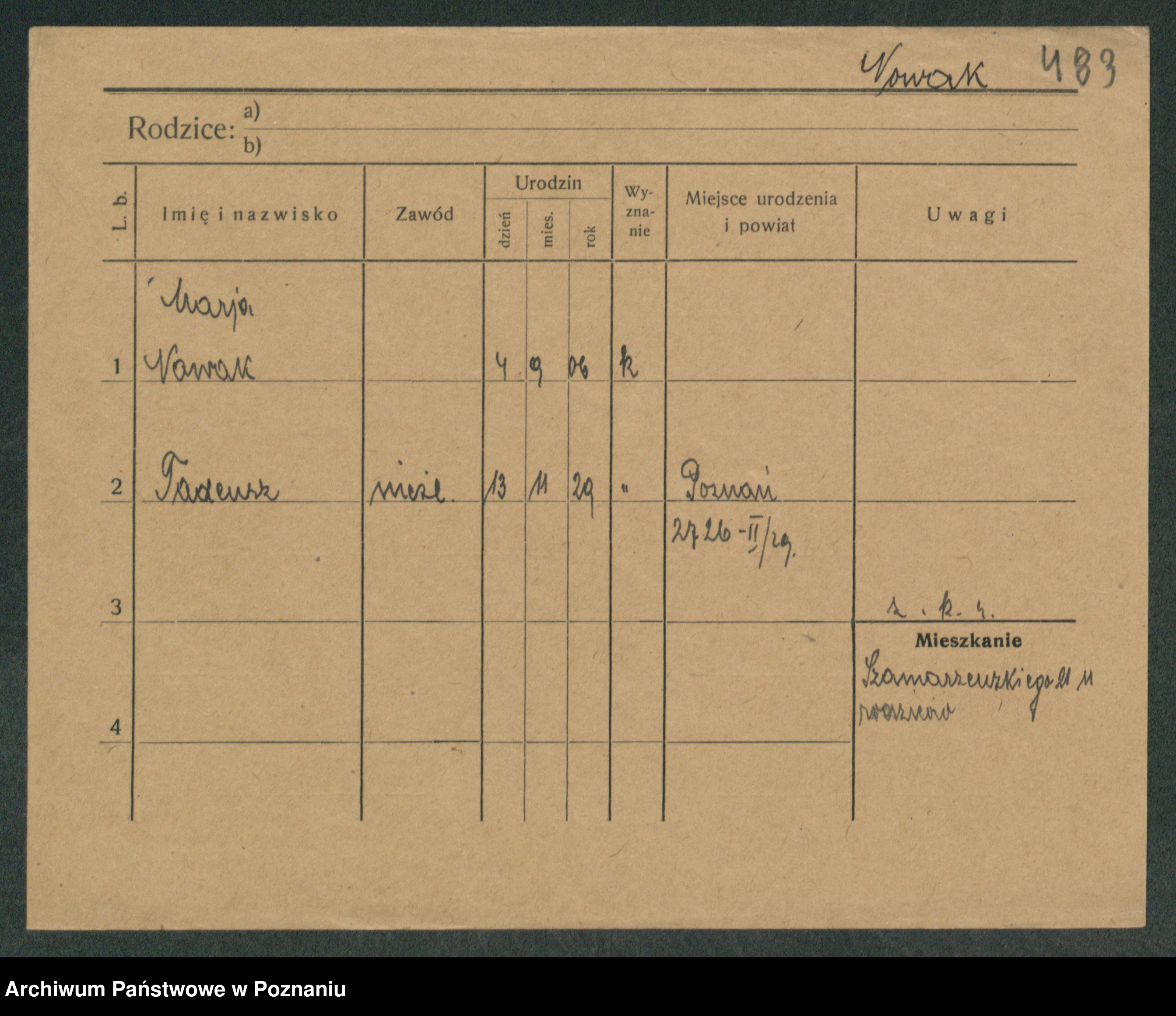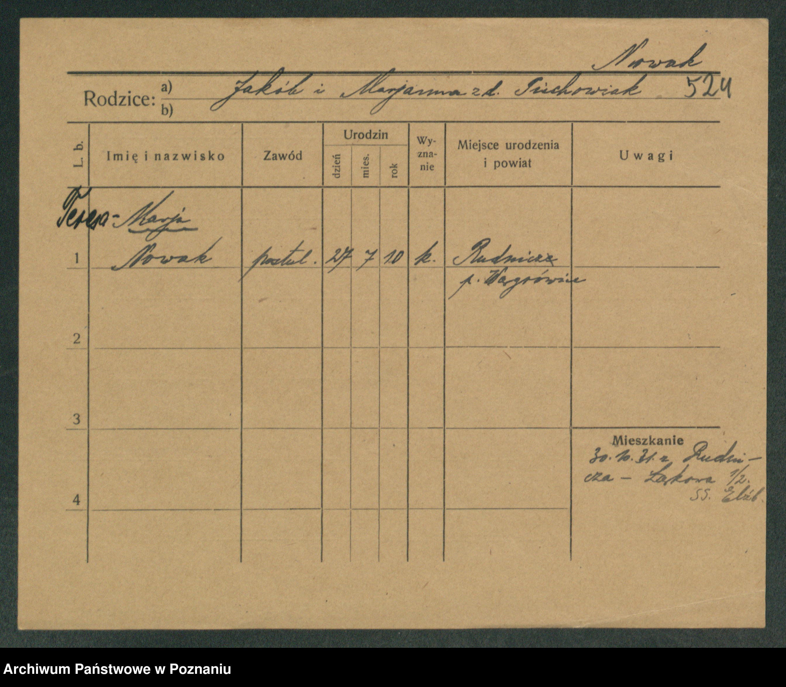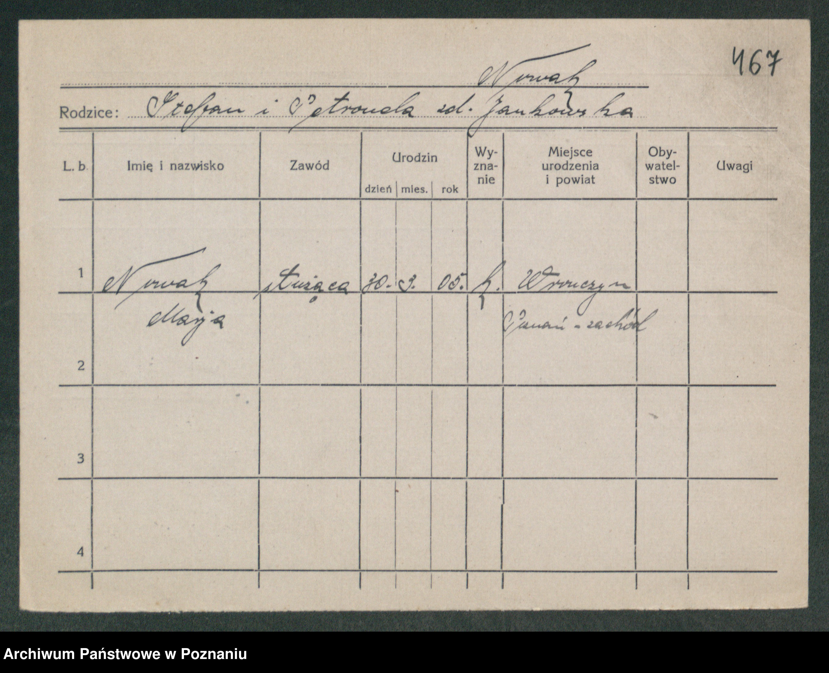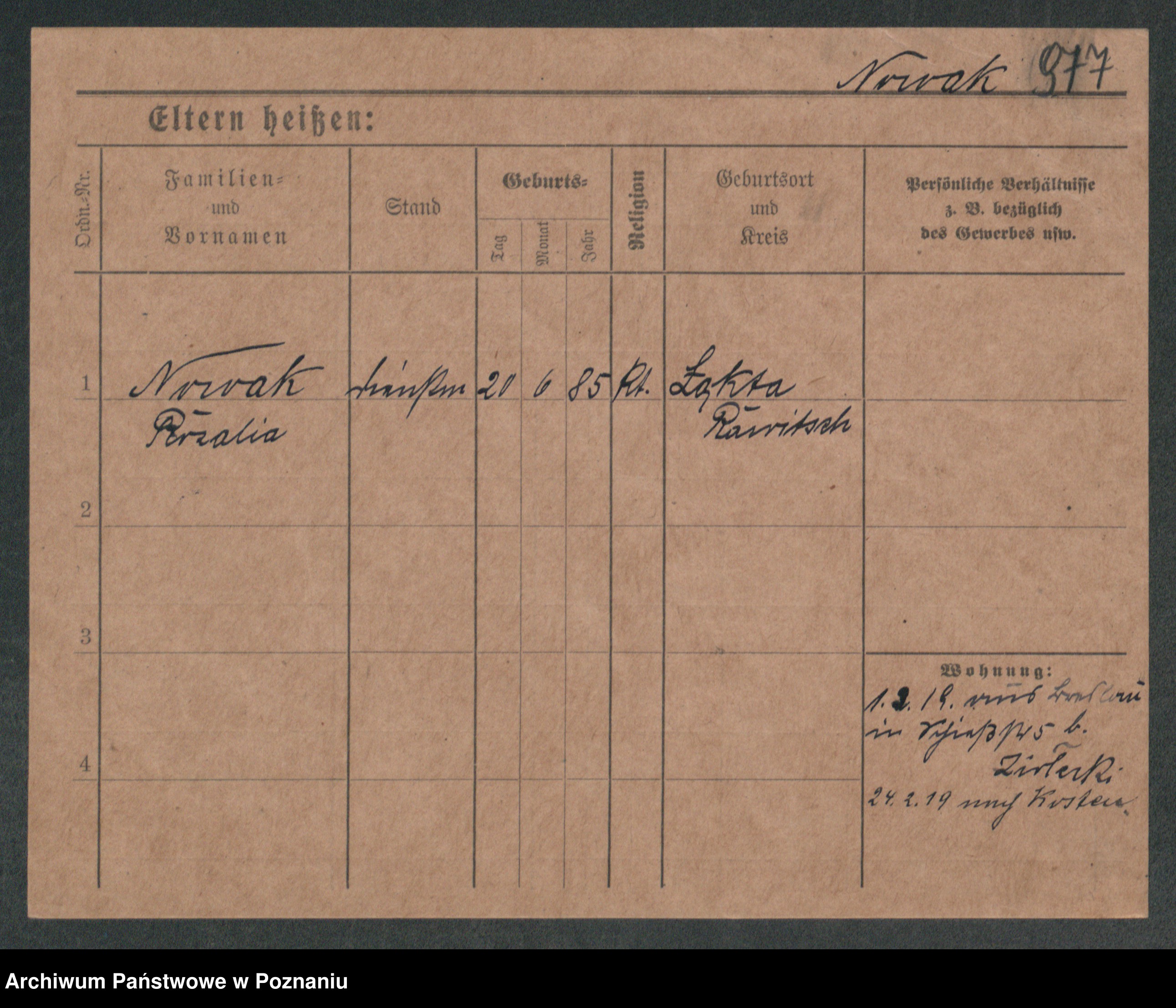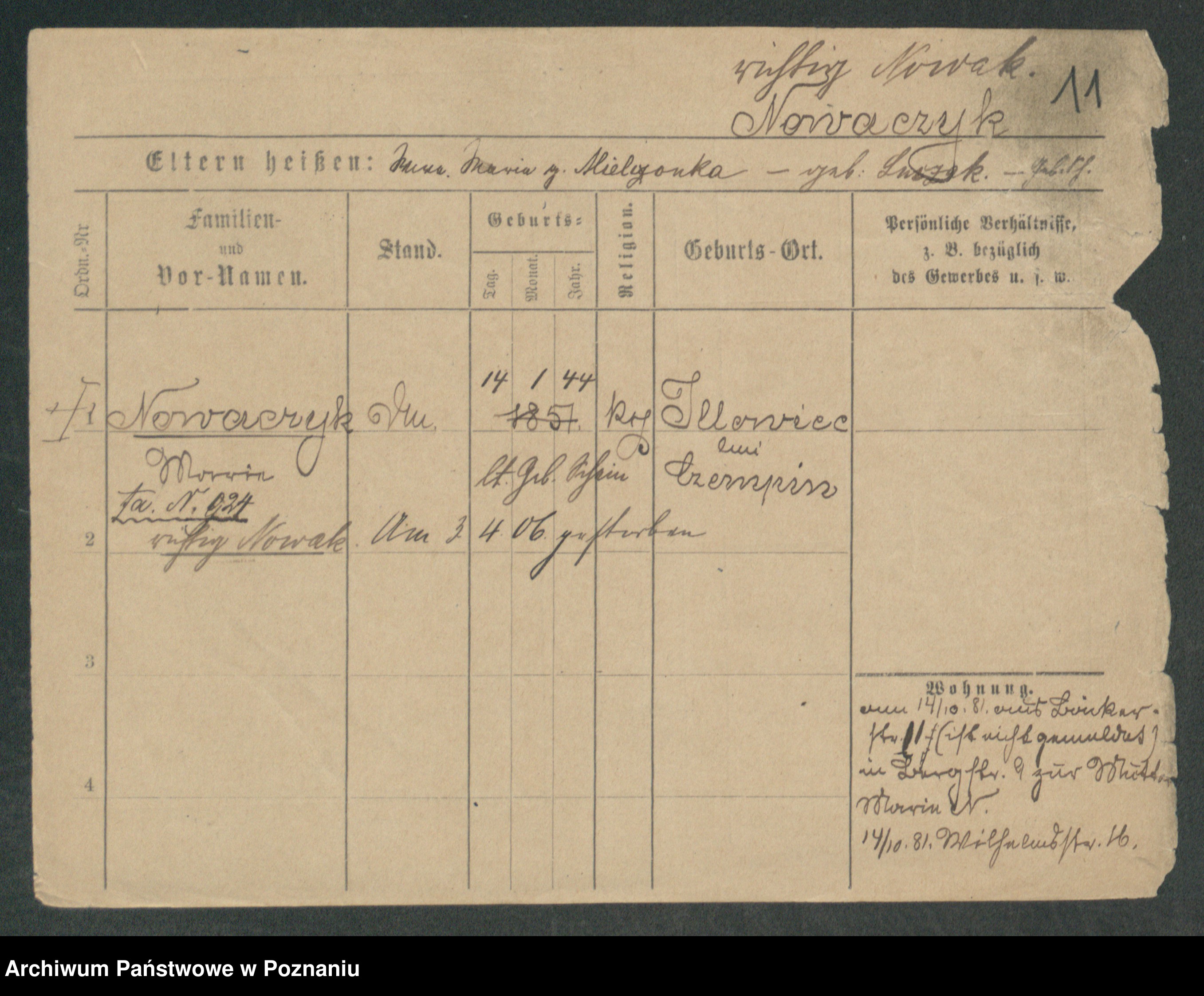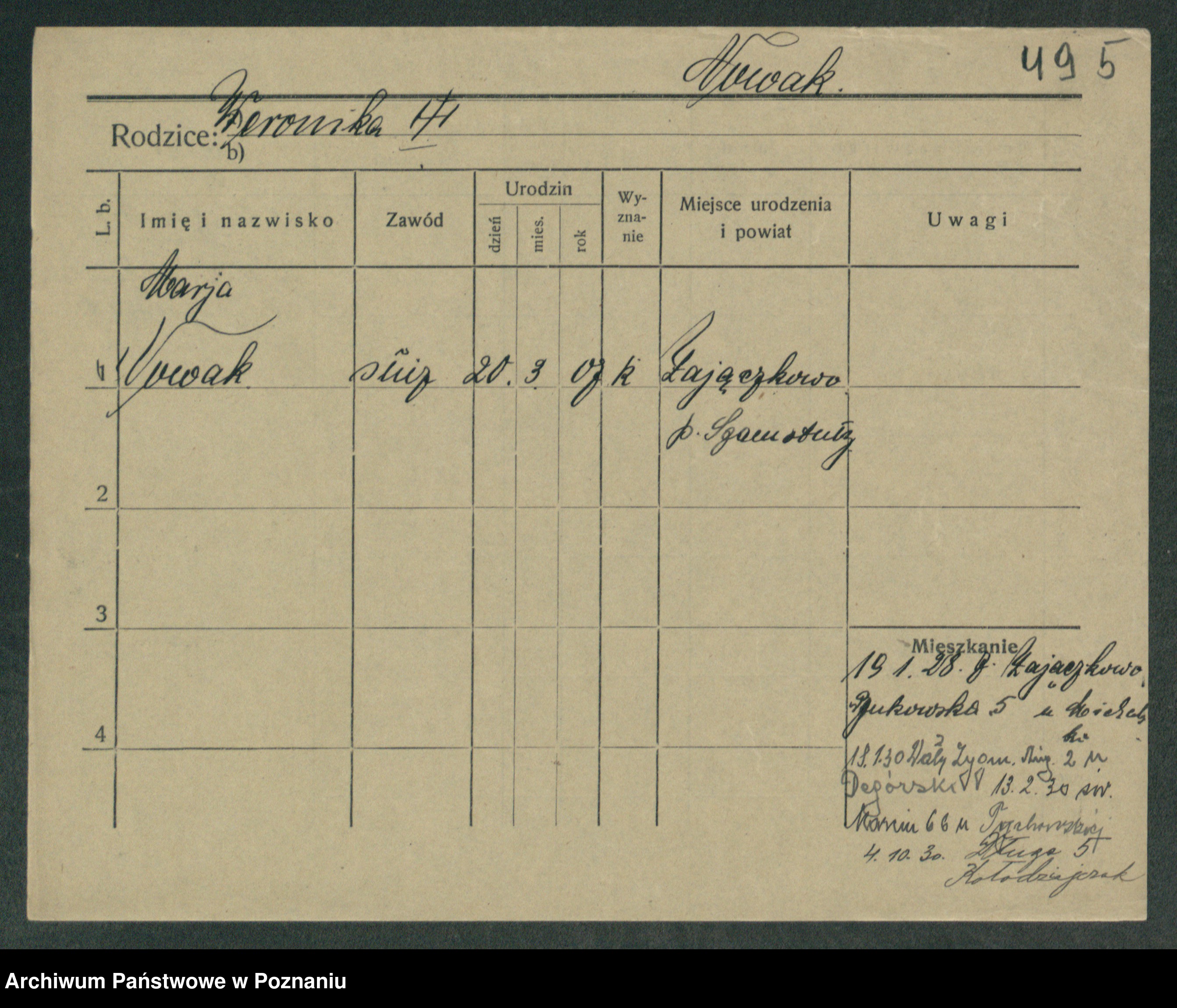 Podgląd karty osobowej dostępny jest po kliknięciu na nazwisko lub ikonkę karty. Można dokonywać powiększenia (ikony na górze) lub przechodzić między kolejnymi skanami (strzałki po bokach).