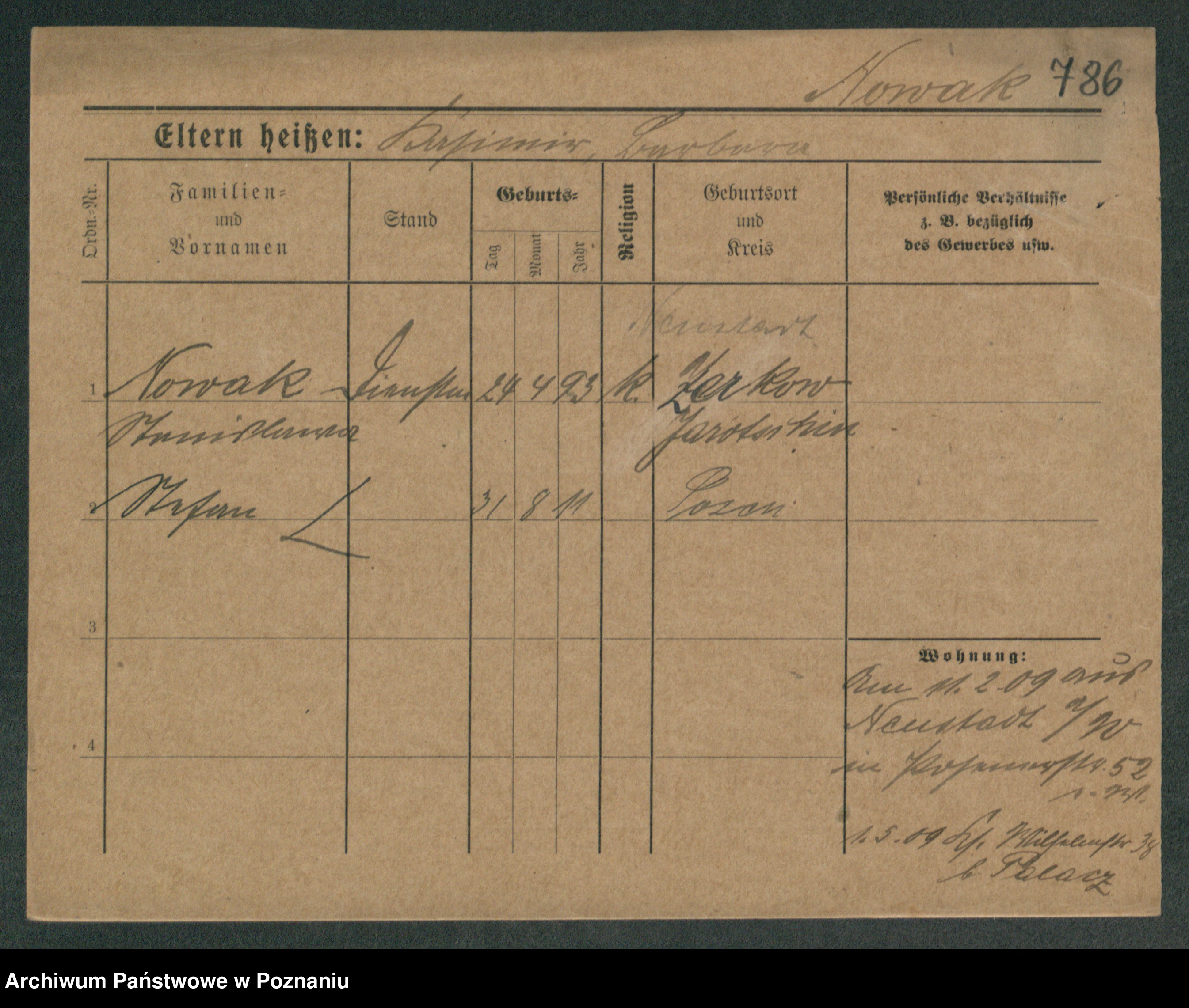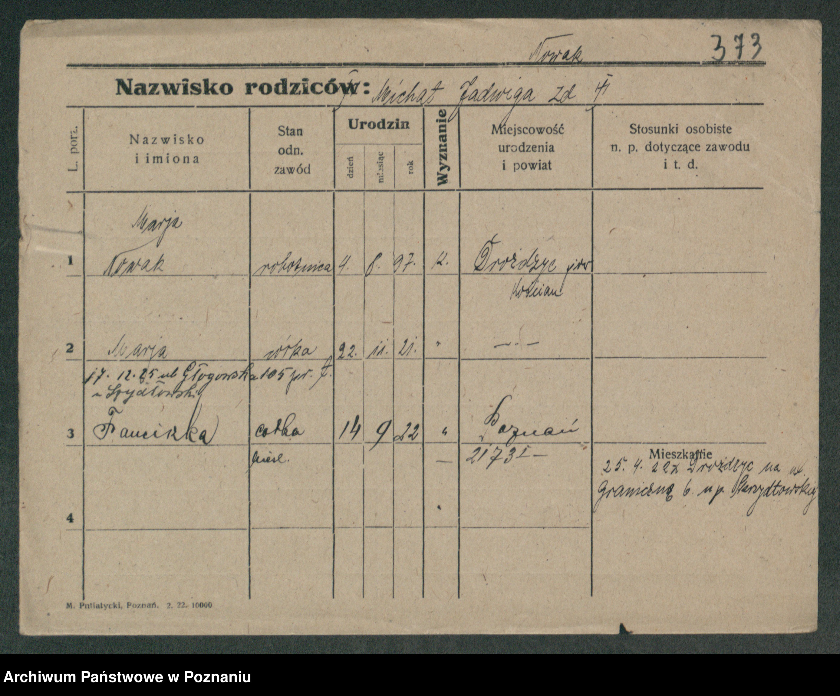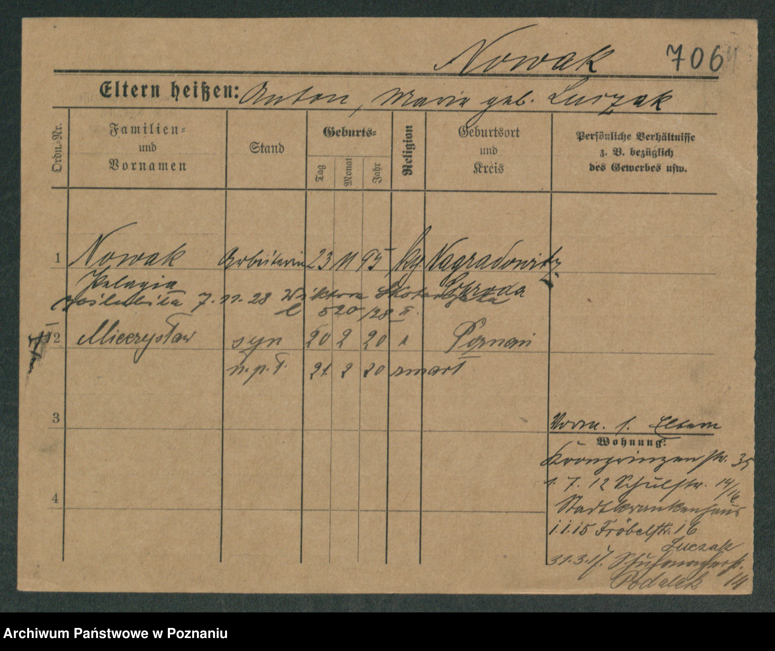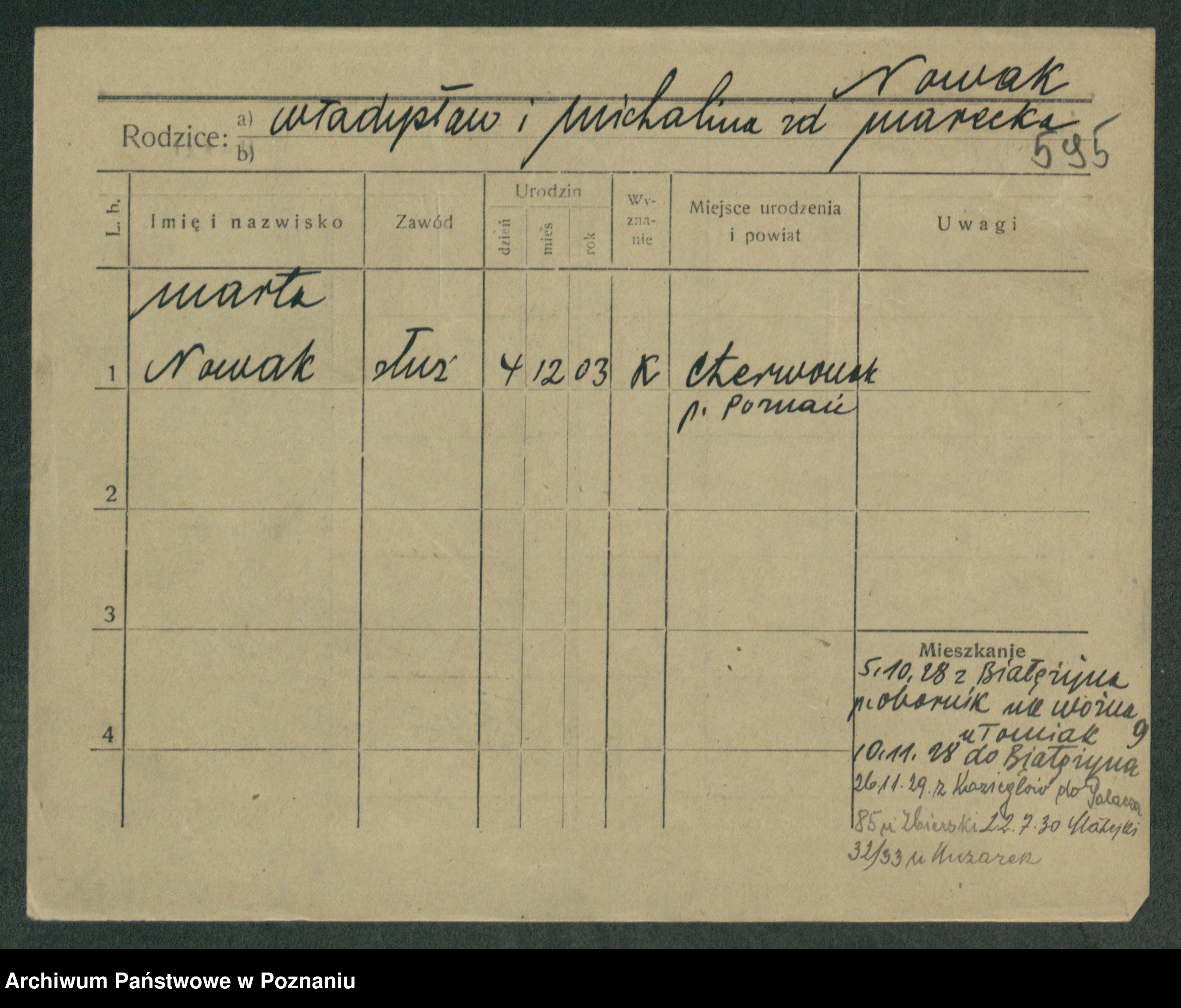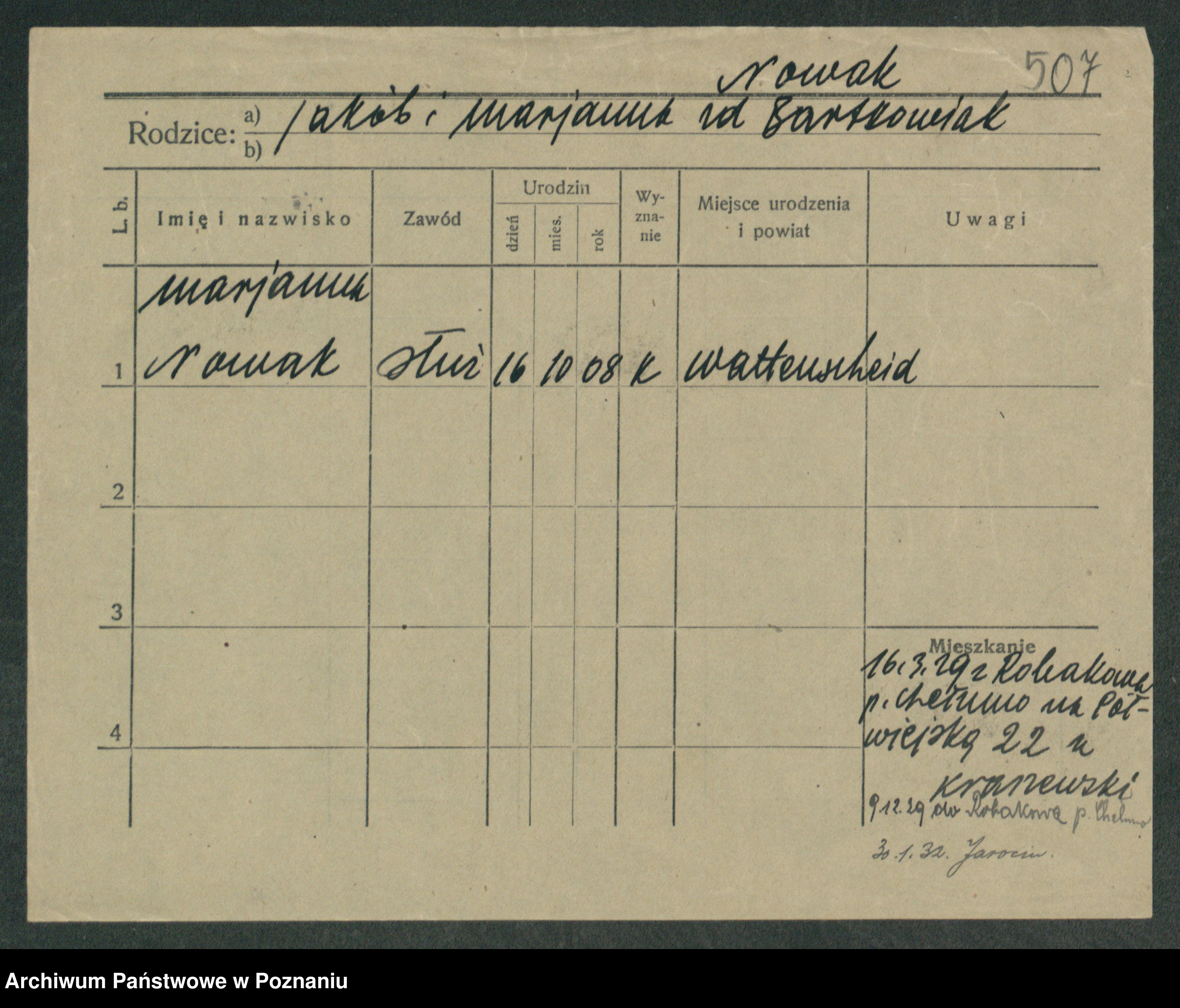 Podgląd karty osobowej dostępny jest po kliknięciu na nazwisko lub ikonkę karty. Można dokonywać powiększenia (ikony na górze) lub przechodzić między kolejnymi skanami (strzałki po bokach).