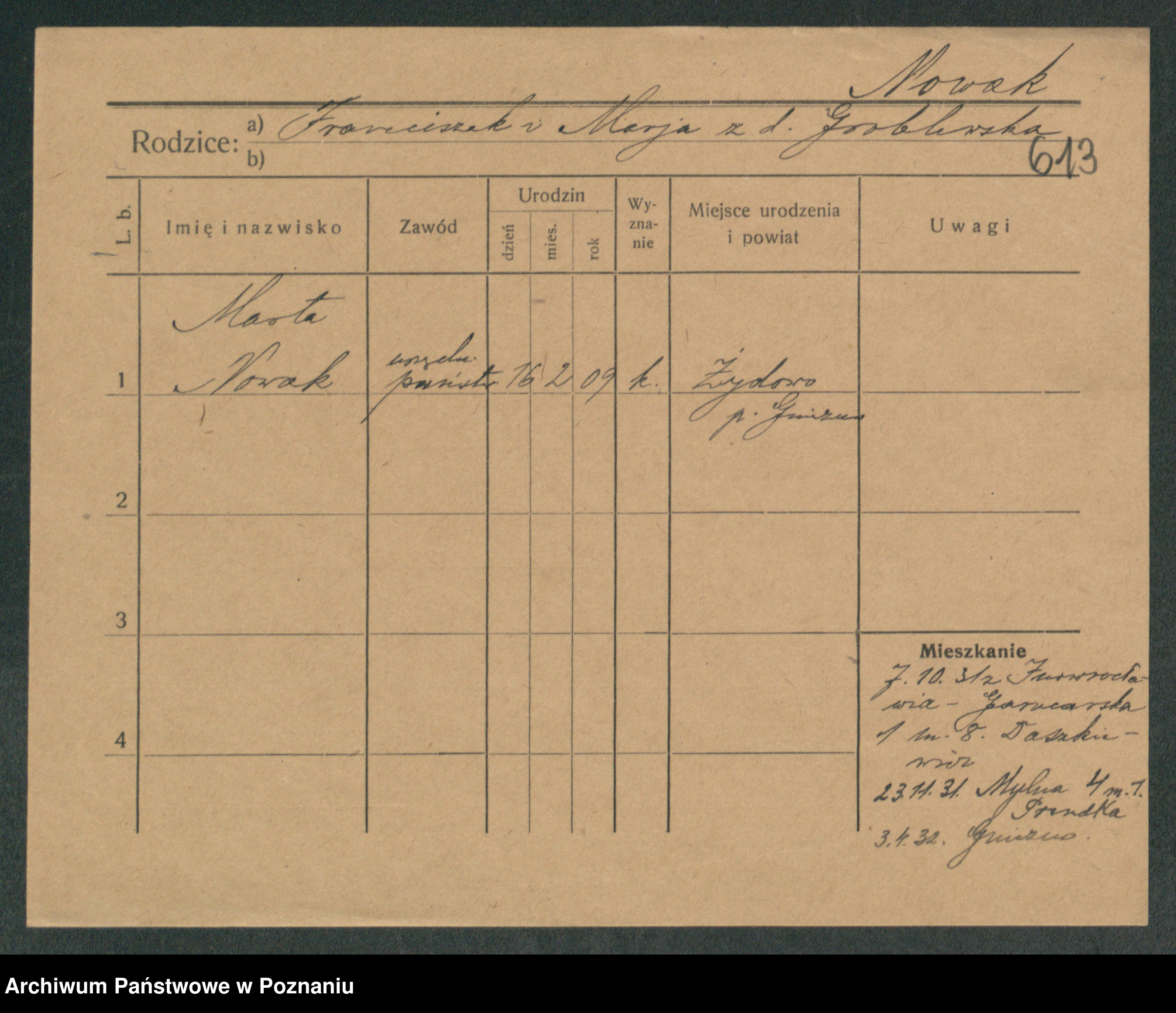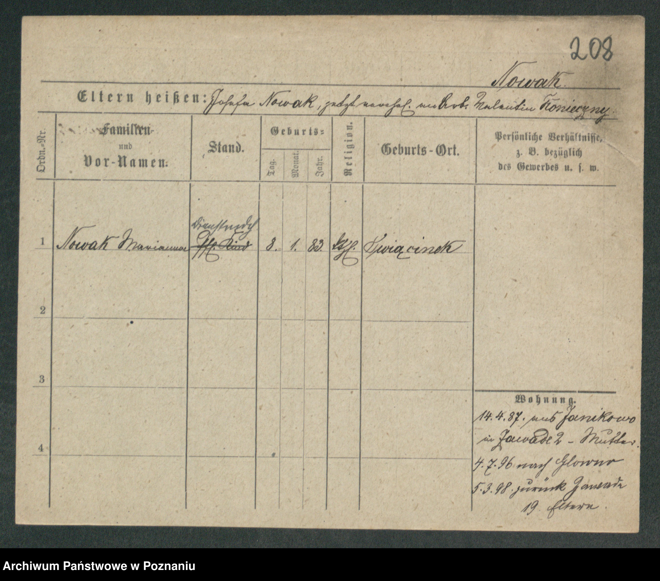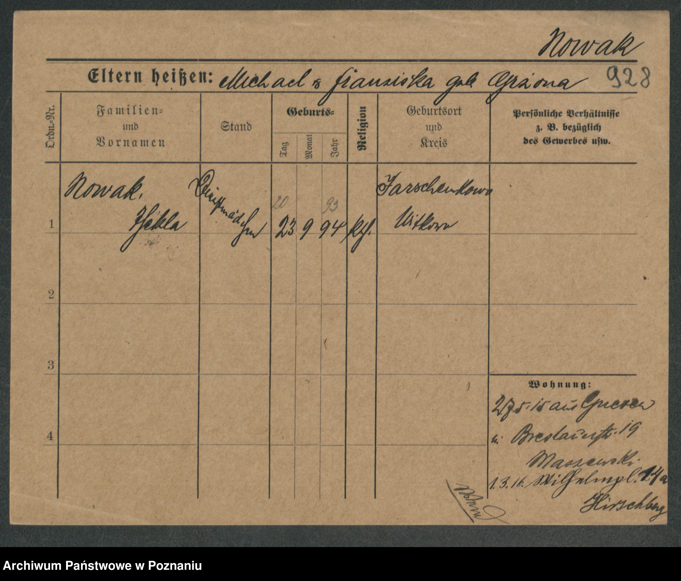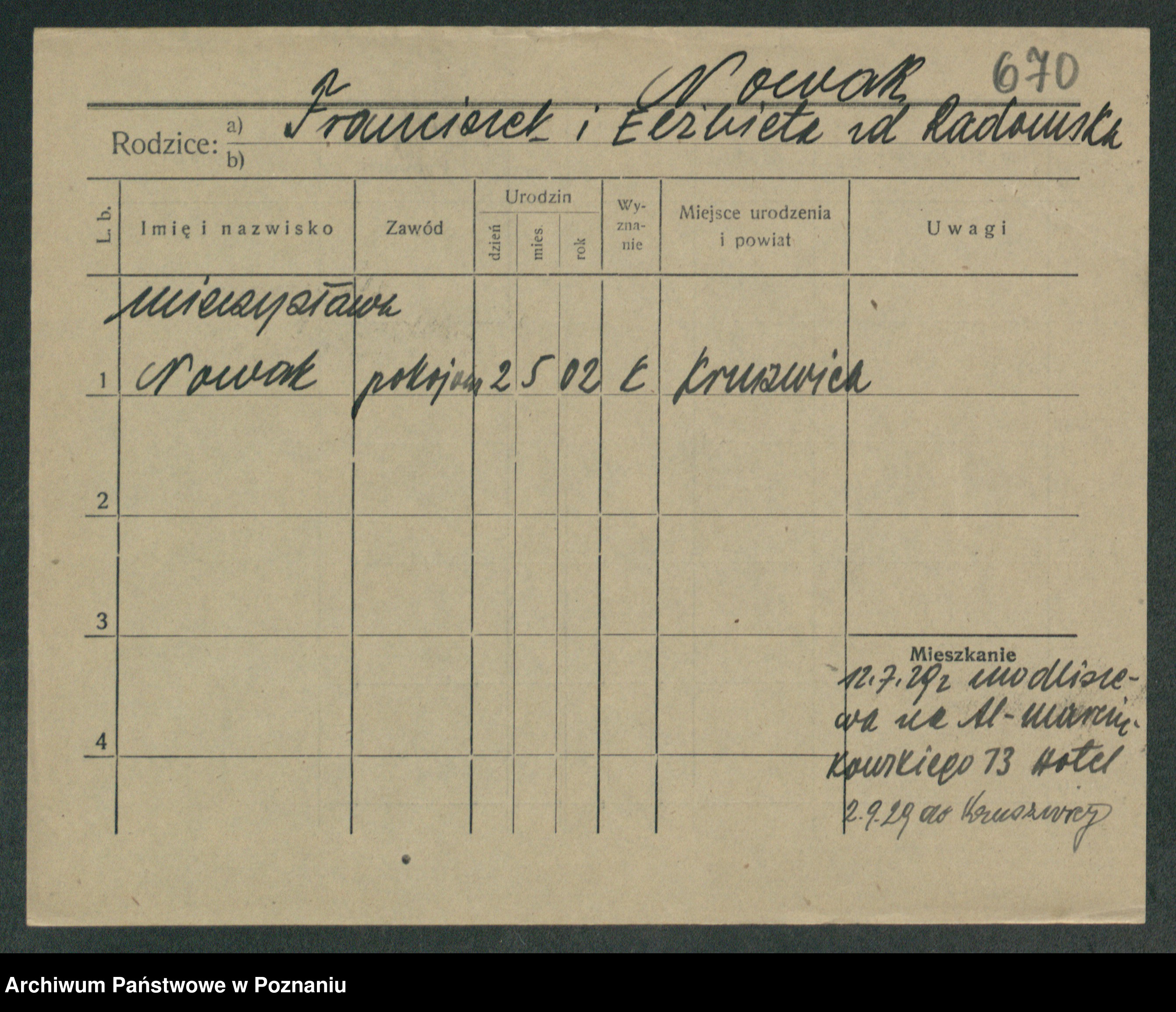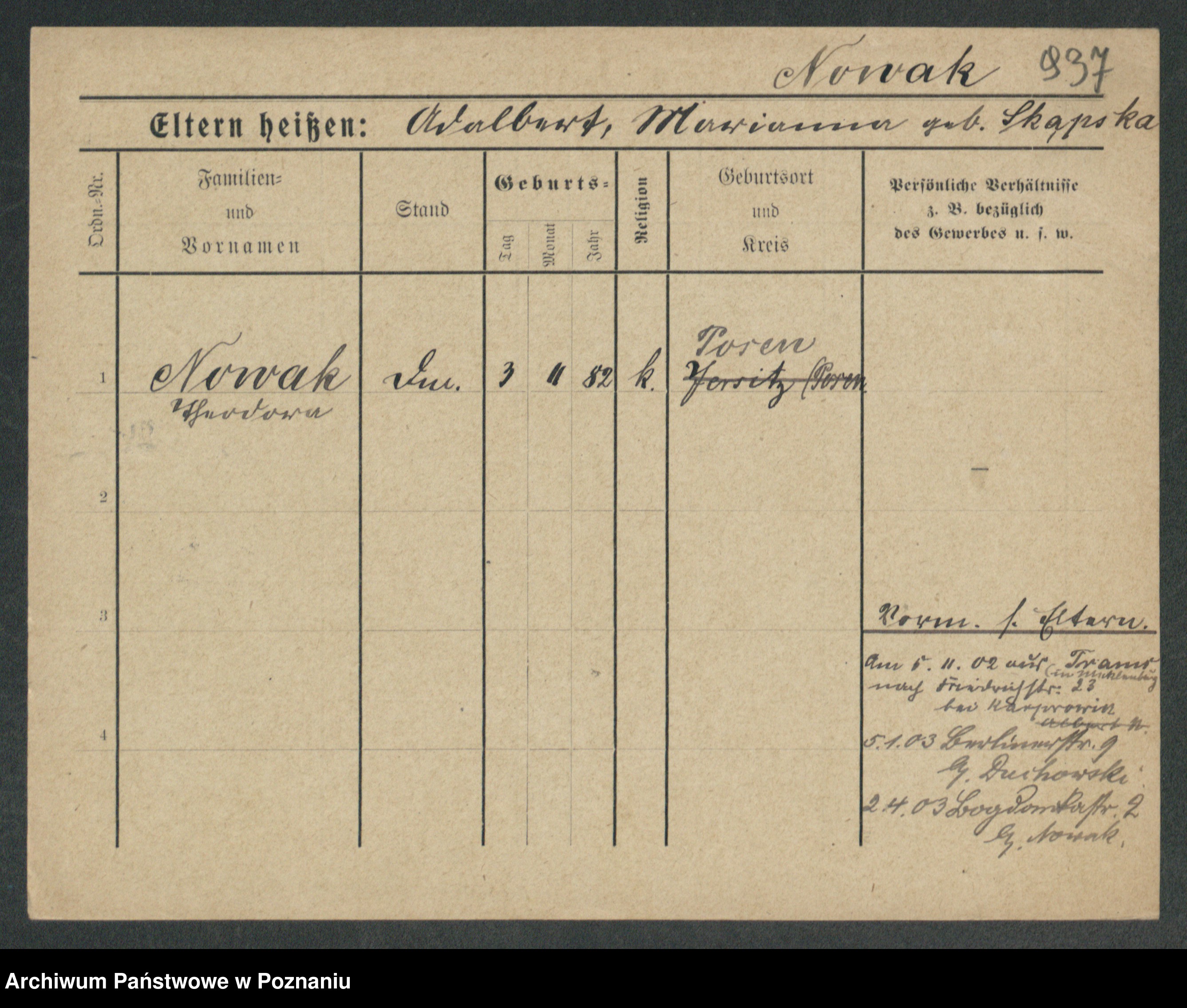 Podgląd karty osobowej dostępny jest po kliknięciu na nazwisko lub ikonkę karty. Można dokonywać powiększenia (ikony na górze) lub przechodzić między kolejnymi skanami (strzałki po bokach).