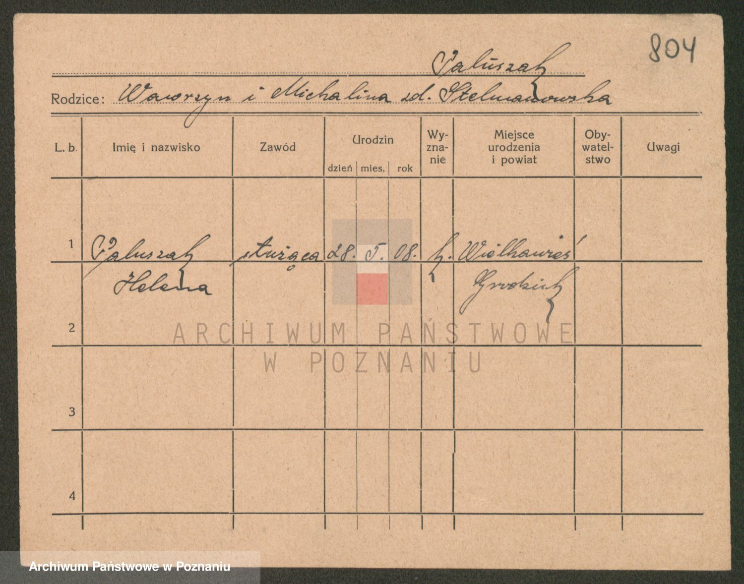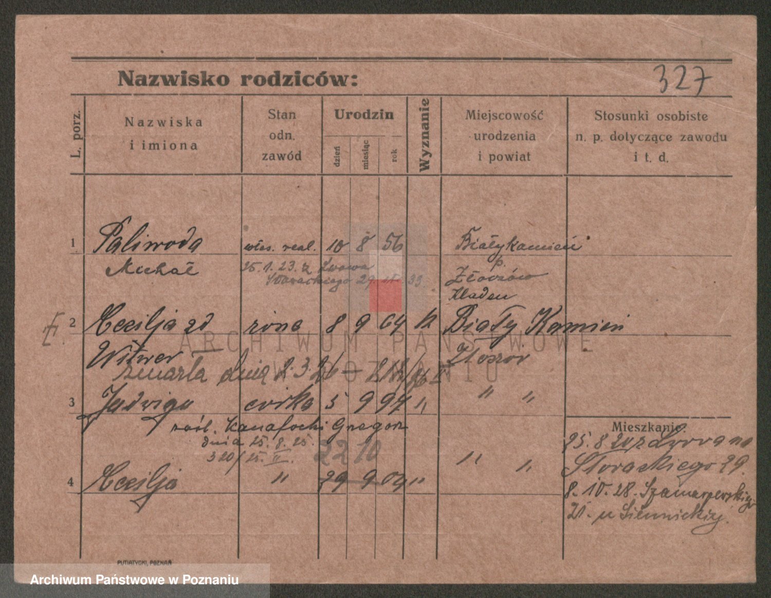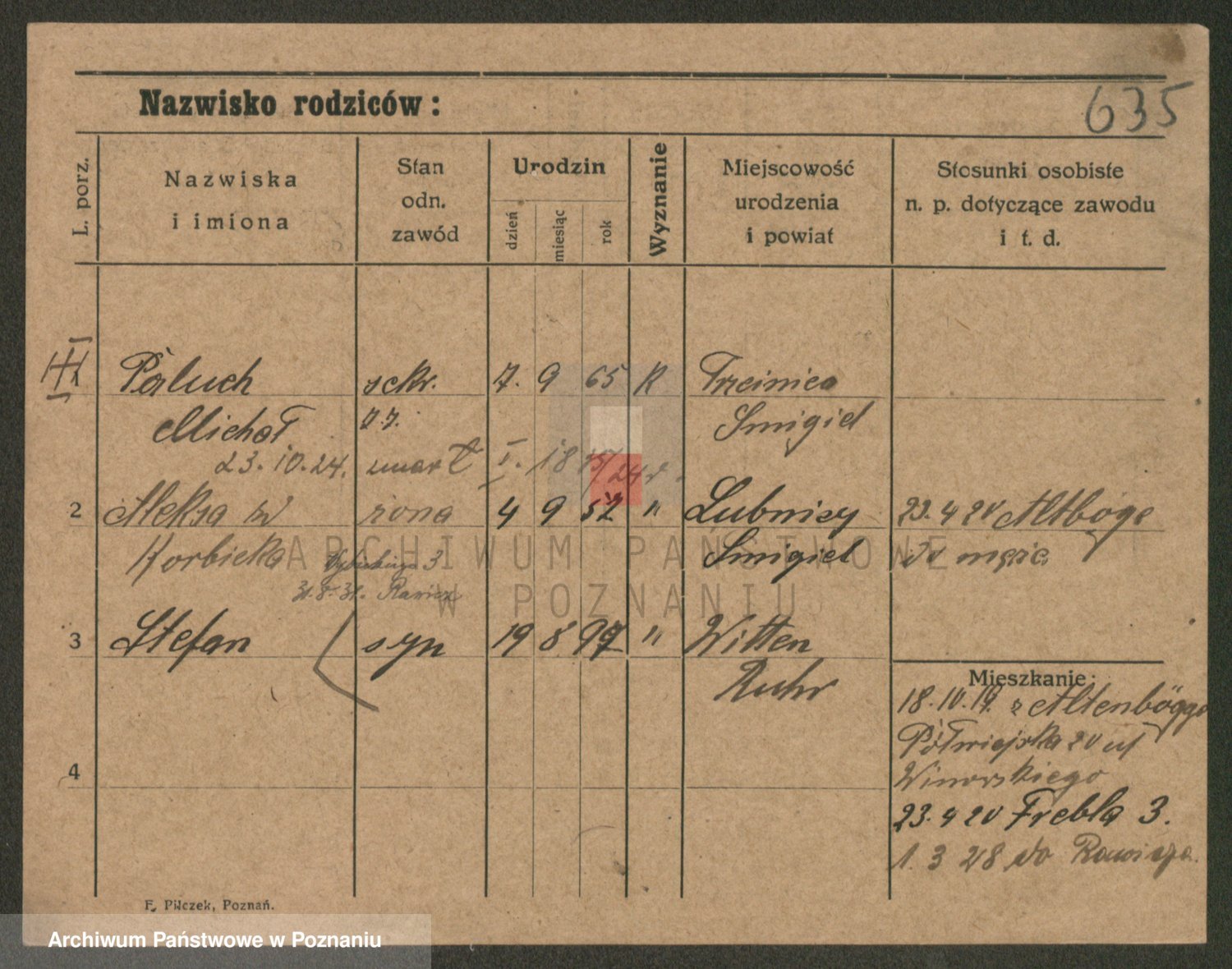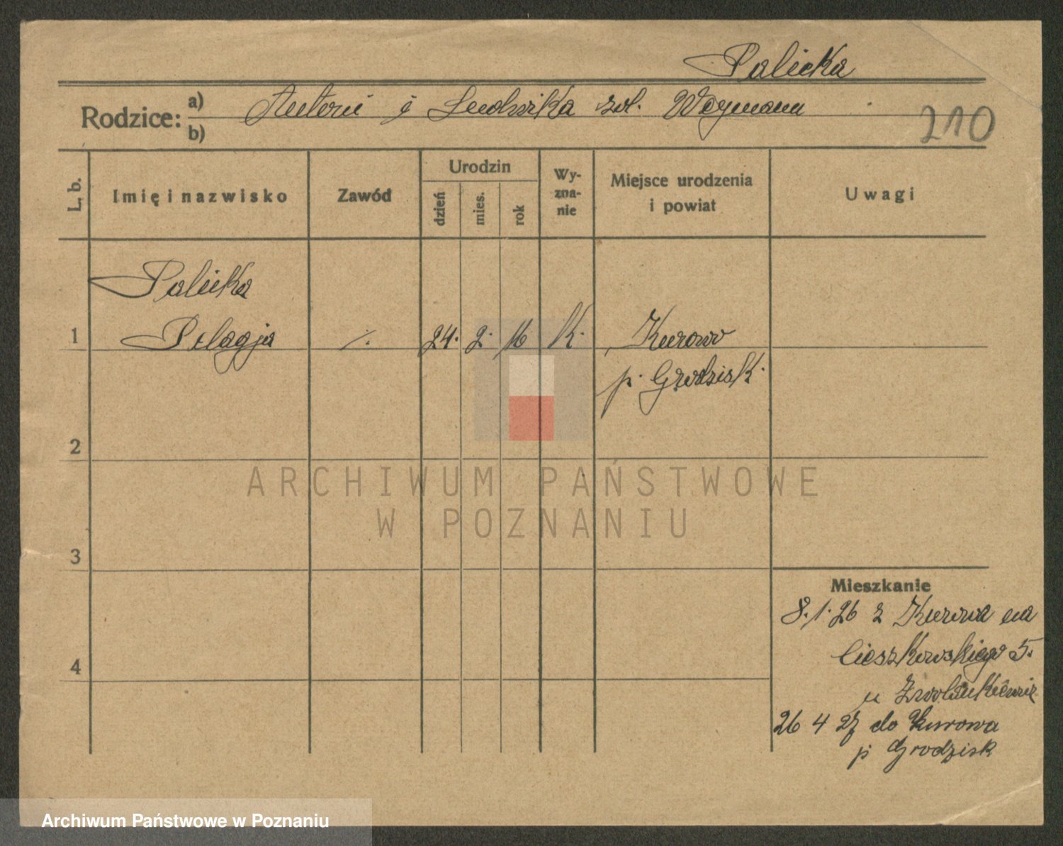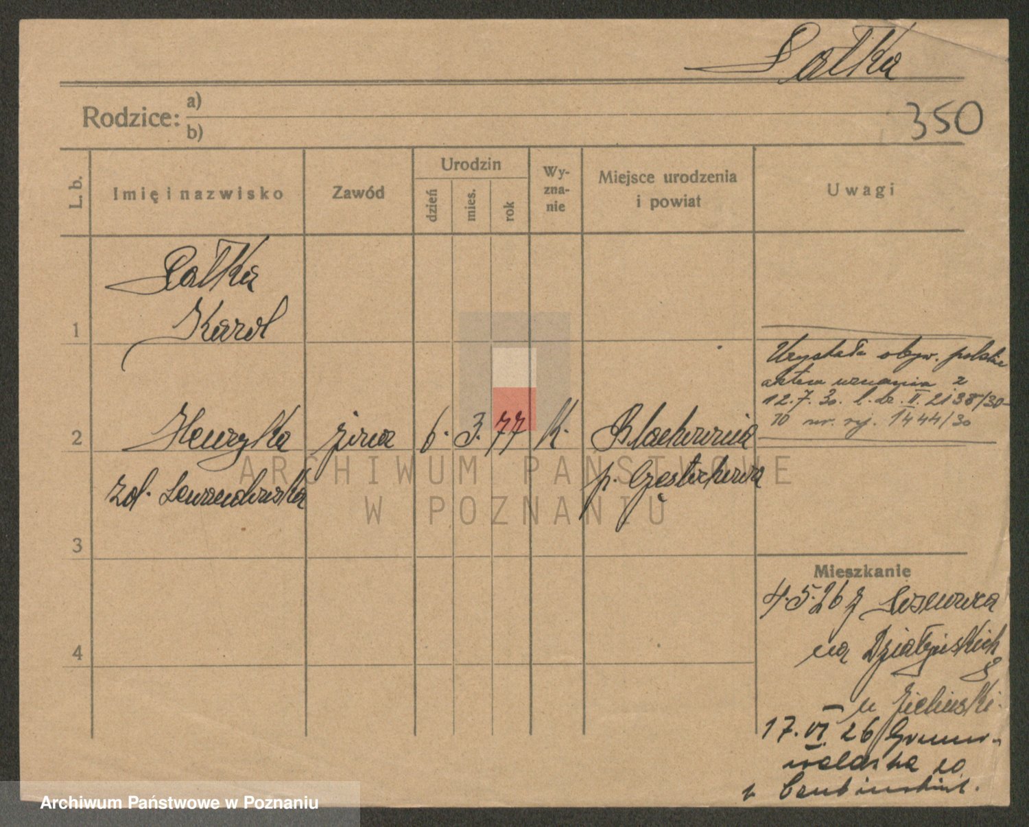 Podgląd karty osobowej dostępny jest po kliknięciu na nazwisko lub ikonkę karty. Można dokonywać powiększenia (ikony na górze) lub przechodzić między kolejnymi skanami (strzałki po bokach).
