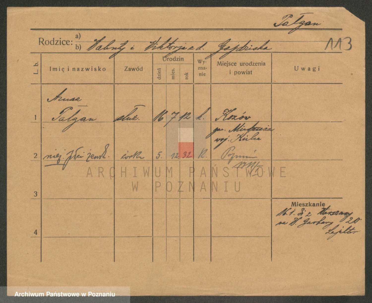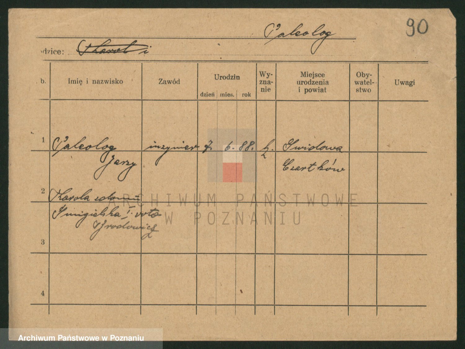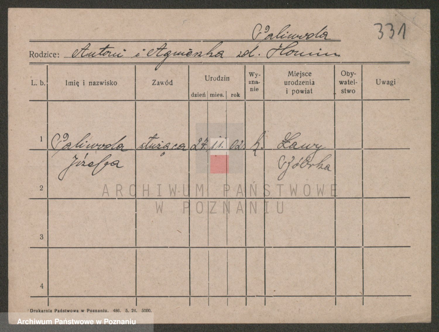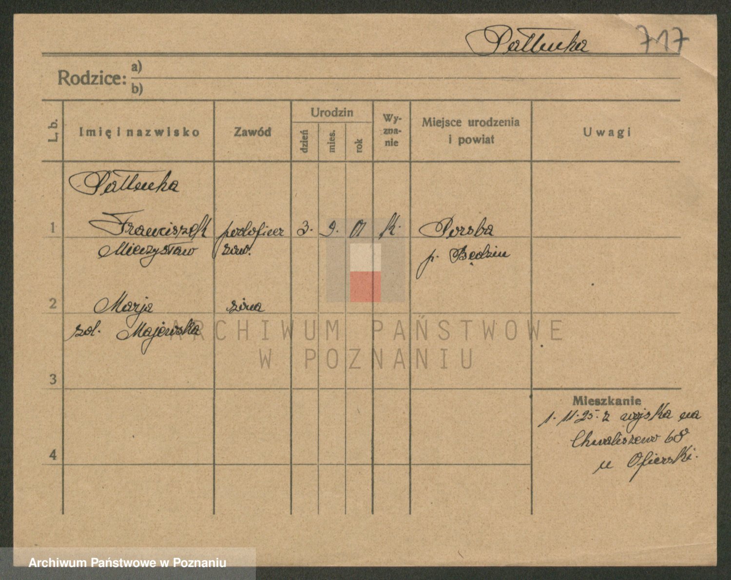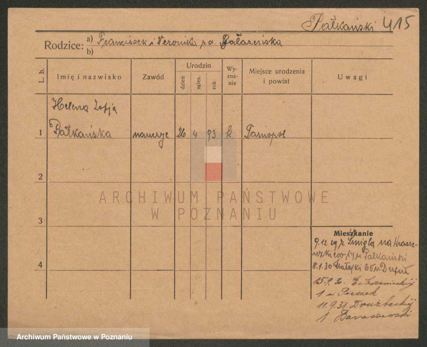Podgląd karty osobowej dostępny jest po kliknięciu na nazwisko lub ikonkę karty. Można dokonywać powiększenia (ikony na górze) lub przechodzić między kolejnymi skanami (strzałki po bokach).