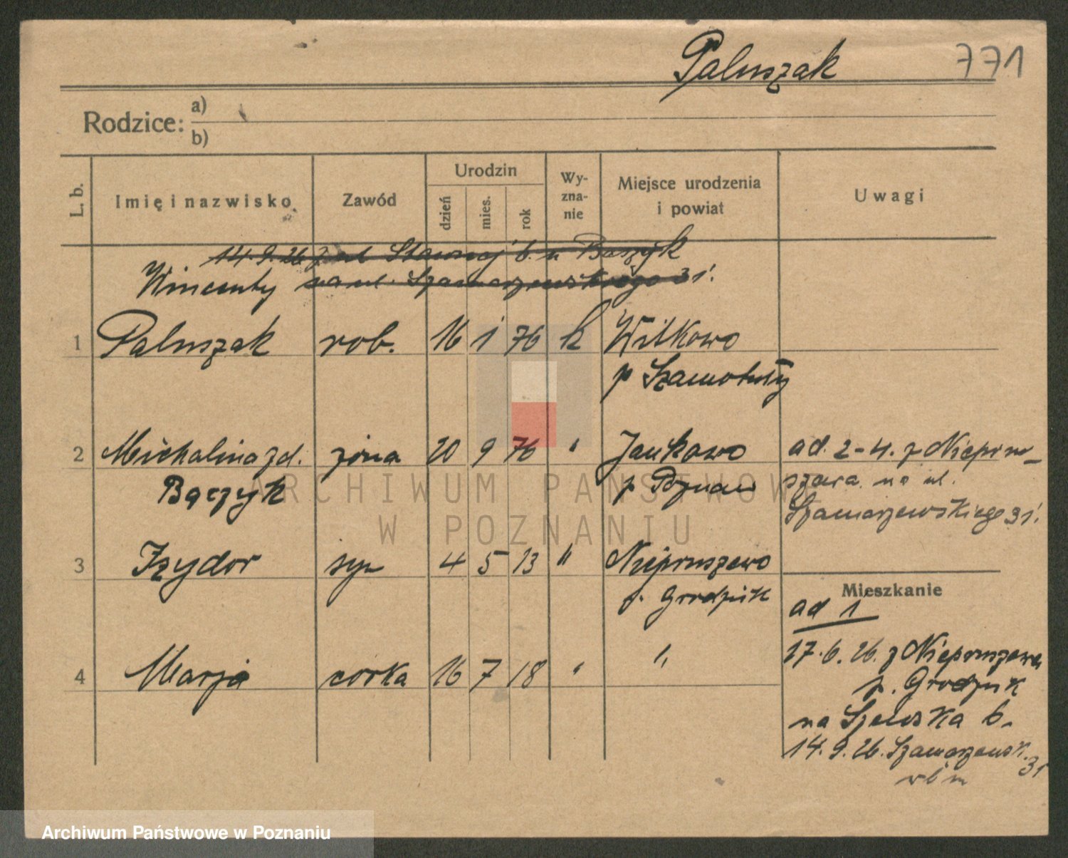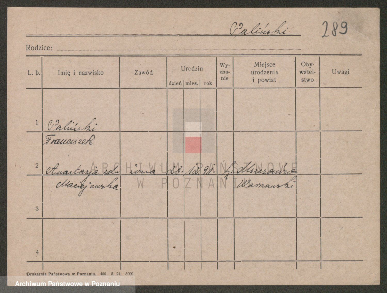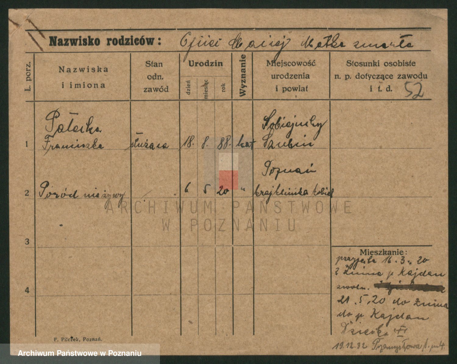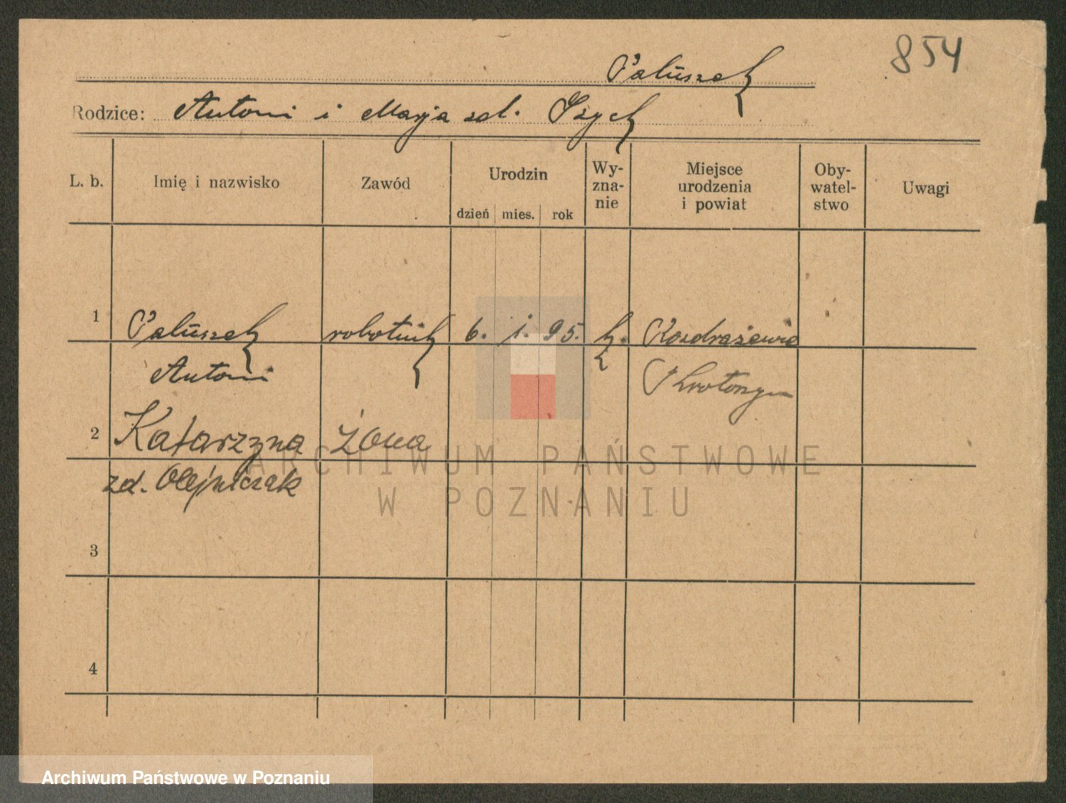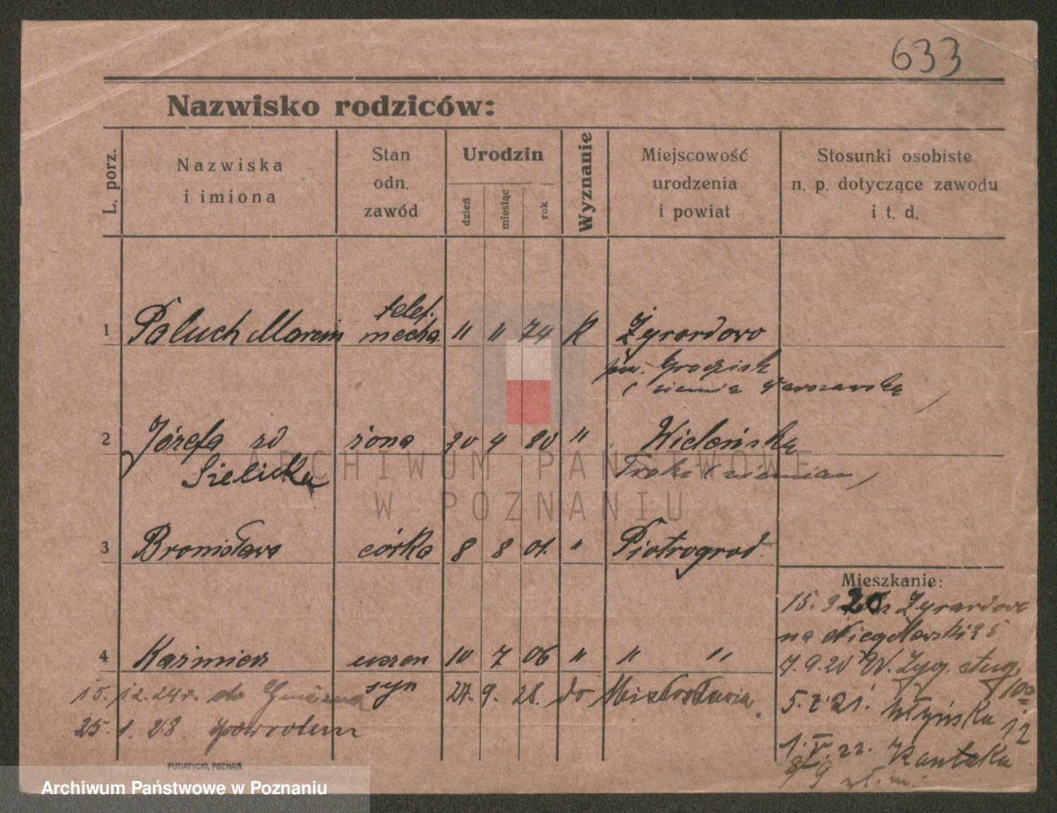 Podgląd karty osobowej dostępny jest po kliknięciu na nazwisko lub ikonkę karty. Można dokonywać powiększenia (ikony na górze) lub przechodzić między kolejnymi skanami (strzałki po bokach).