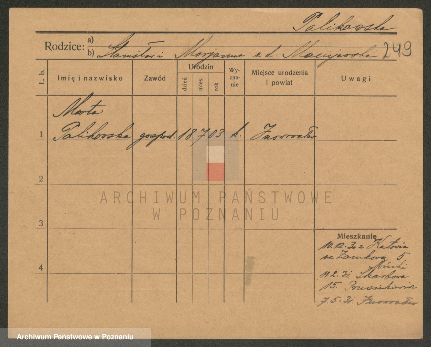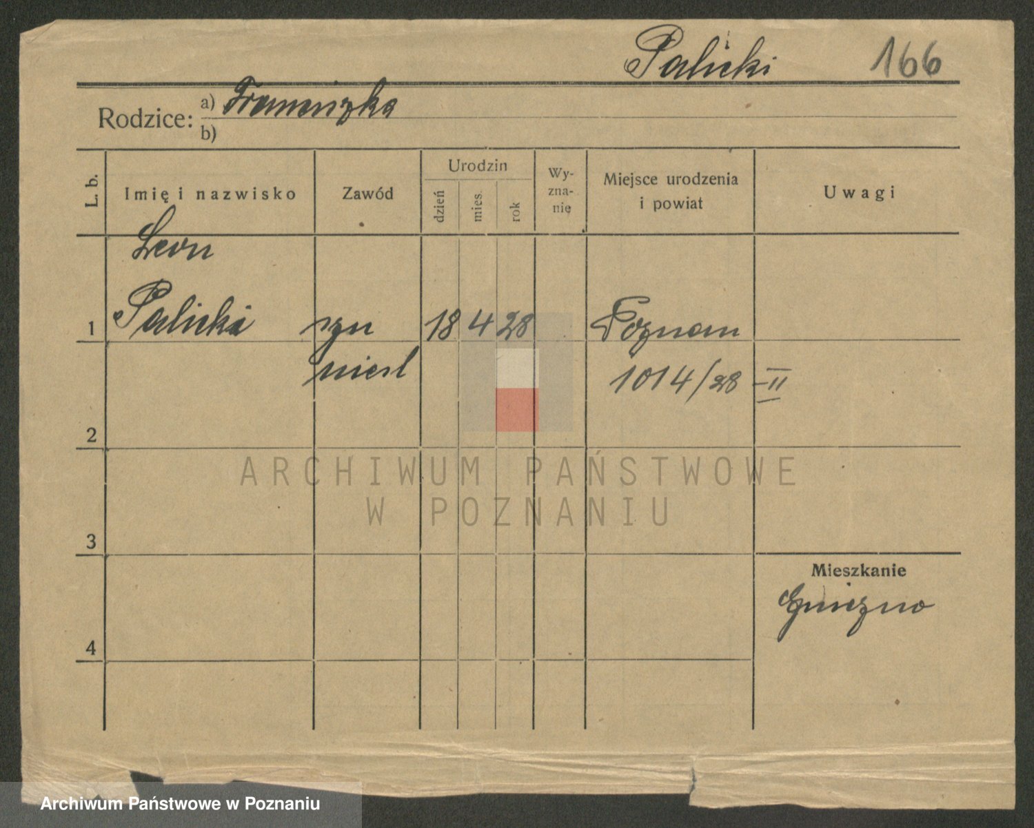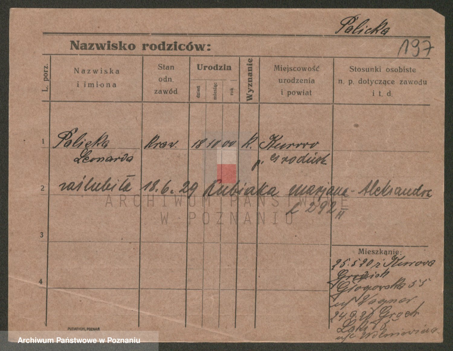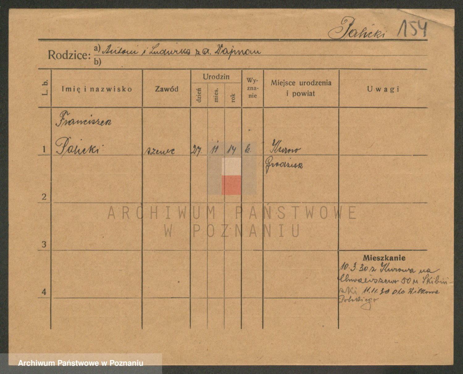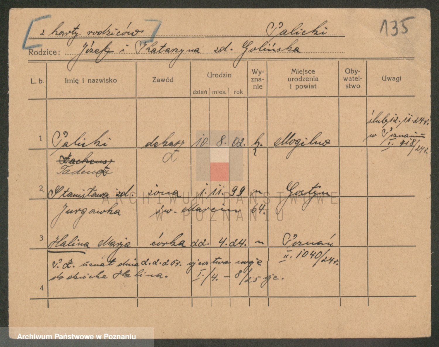 Podgląd karty osobowej dostępny jest po kliknięciu na nazwisko lub ikonkę karty. Można dokonywać powiększenia (ikony na górze) lub przechodzić między kolejnymi skanami (strzałki po bokach).