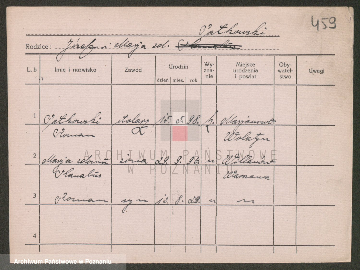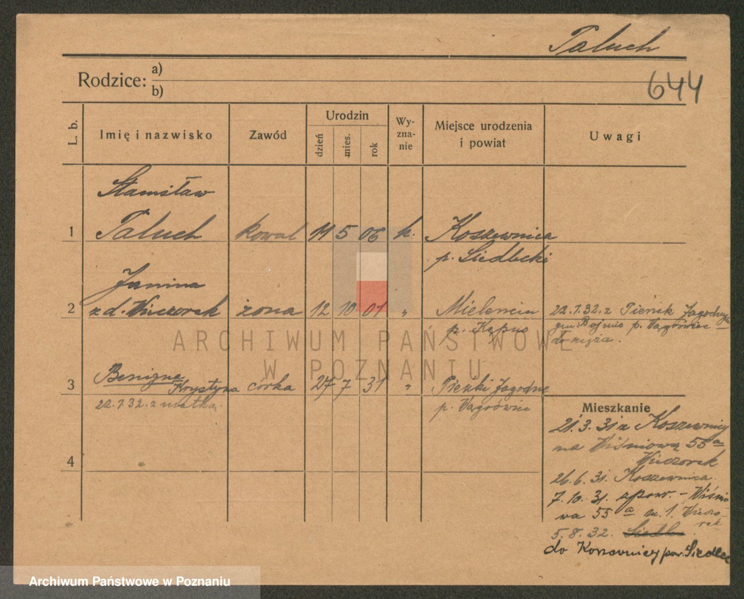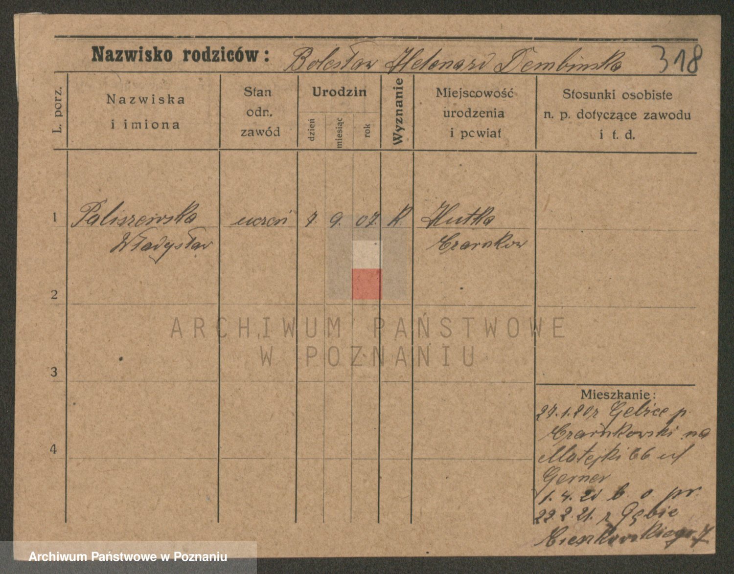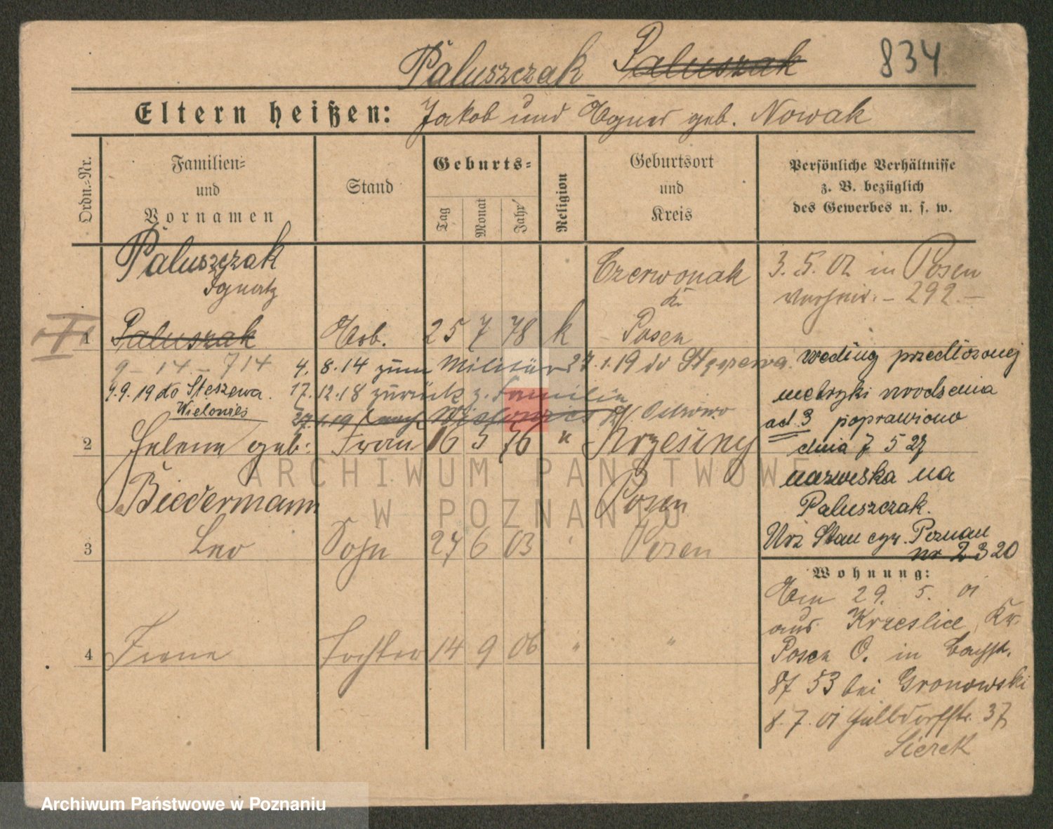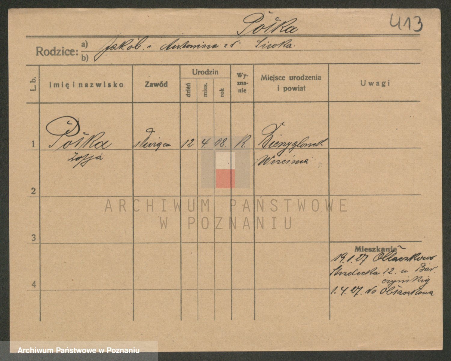 Podgląd karty osobowej dostępny jest po kliknięciu na nazwisko lub ikonkę karty. Można dokonywać powiększenia (ikony na górze) lub przechodzić między kolejnymi skanami (strzałki po bokach).