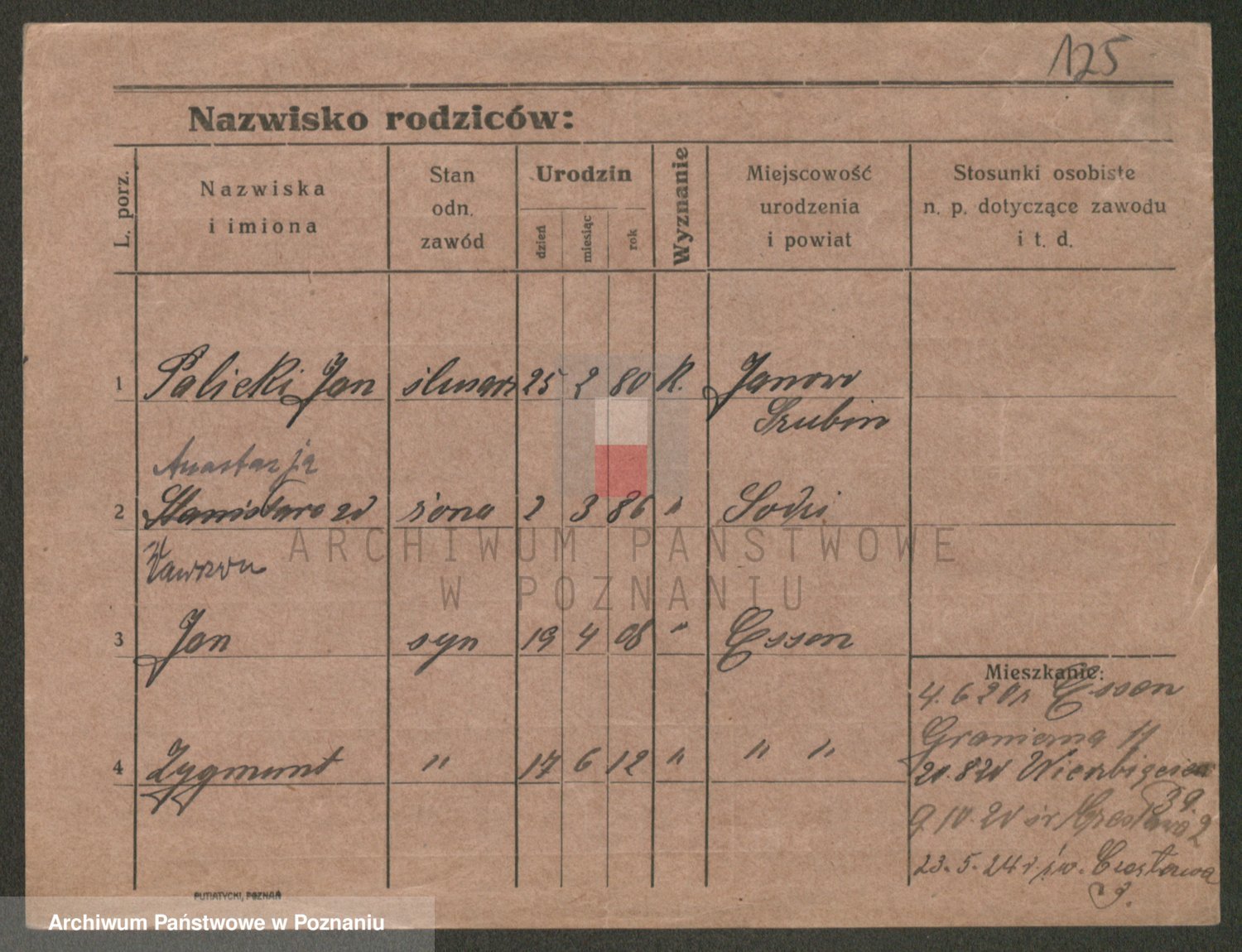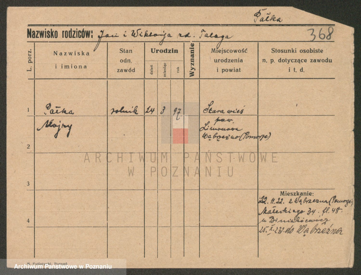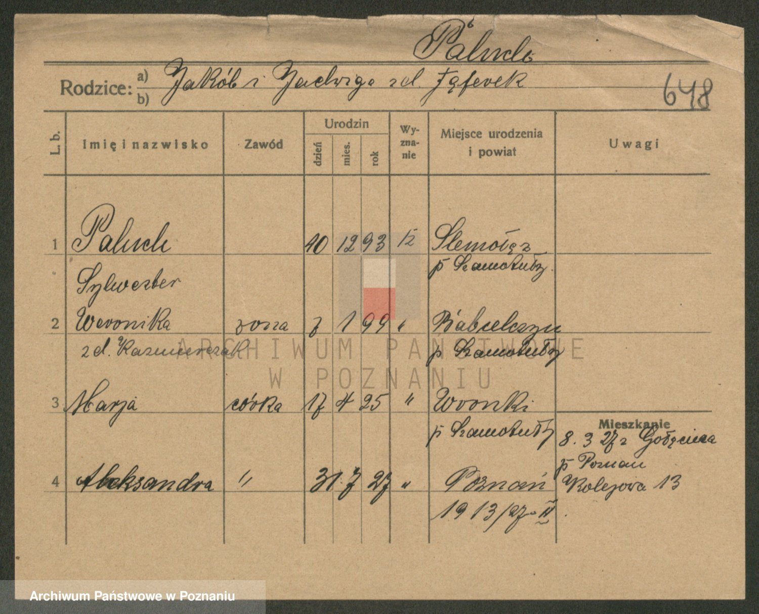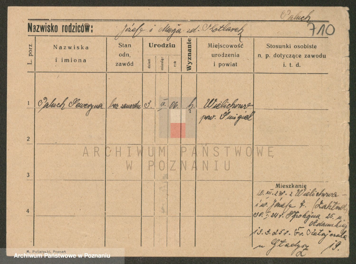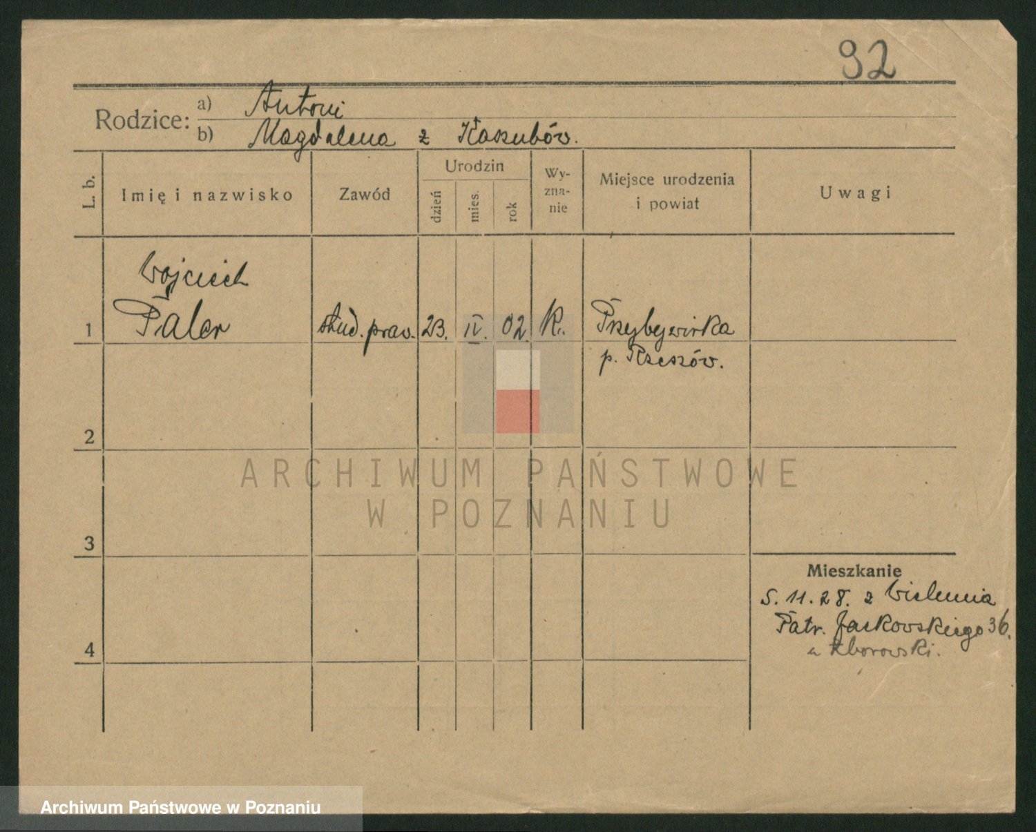 Podgląd karty osobowej dostępny jest po kliknięciu na nazwisko lub ikonkę karty. Można dokonywać powiększenia (ikony na górze) lub przechodzić między kolejnymi skanami (strzałki po bokach).
