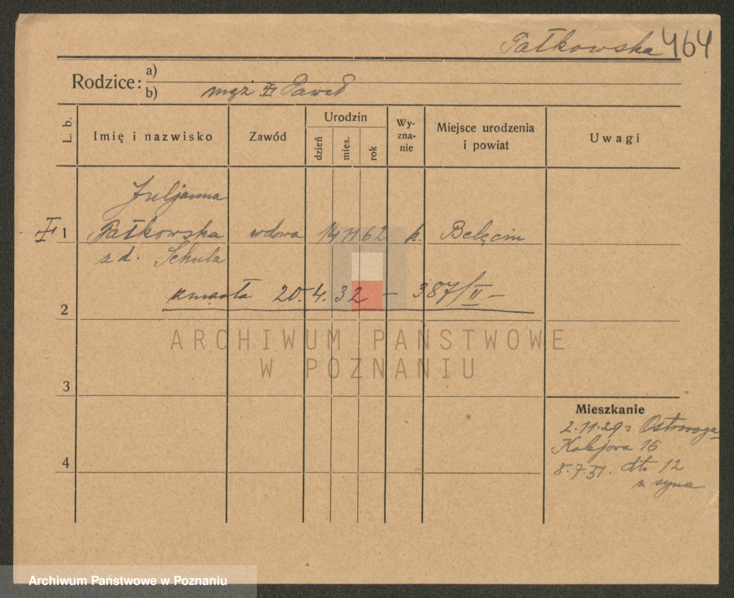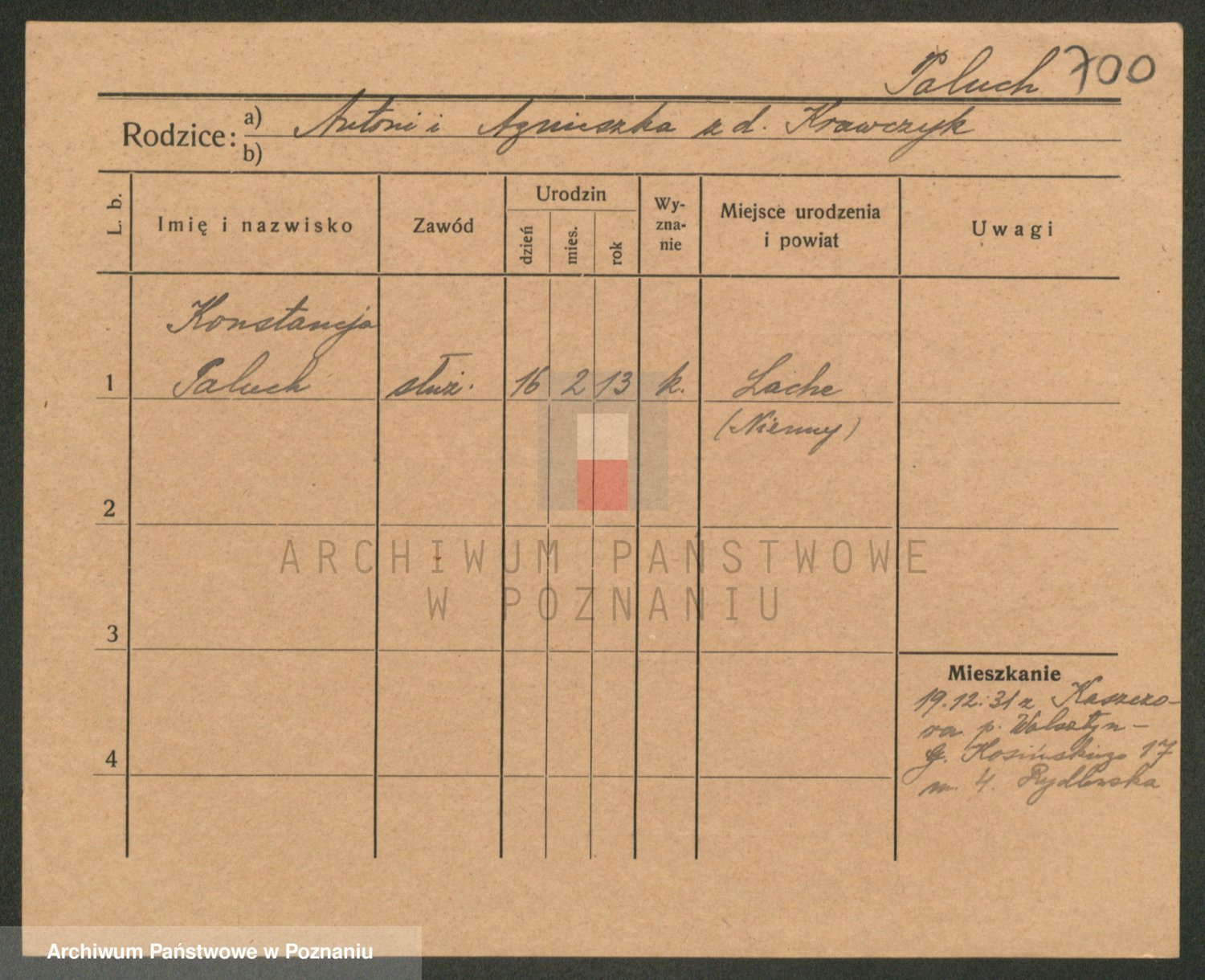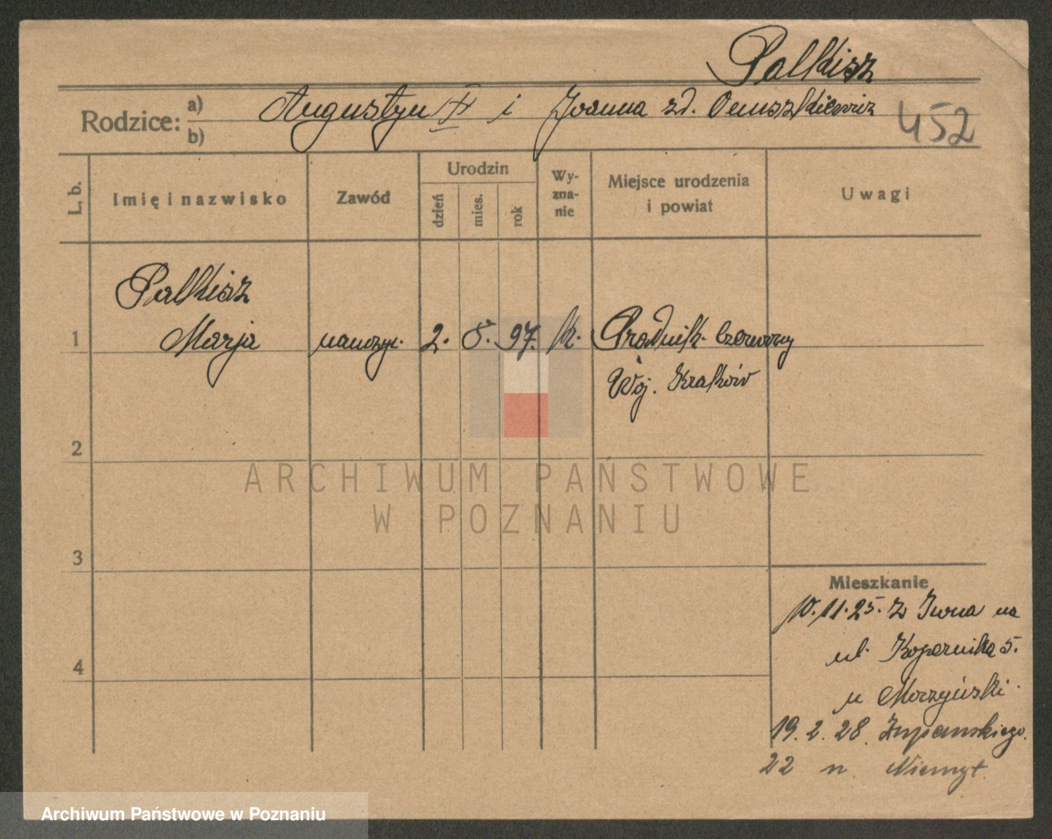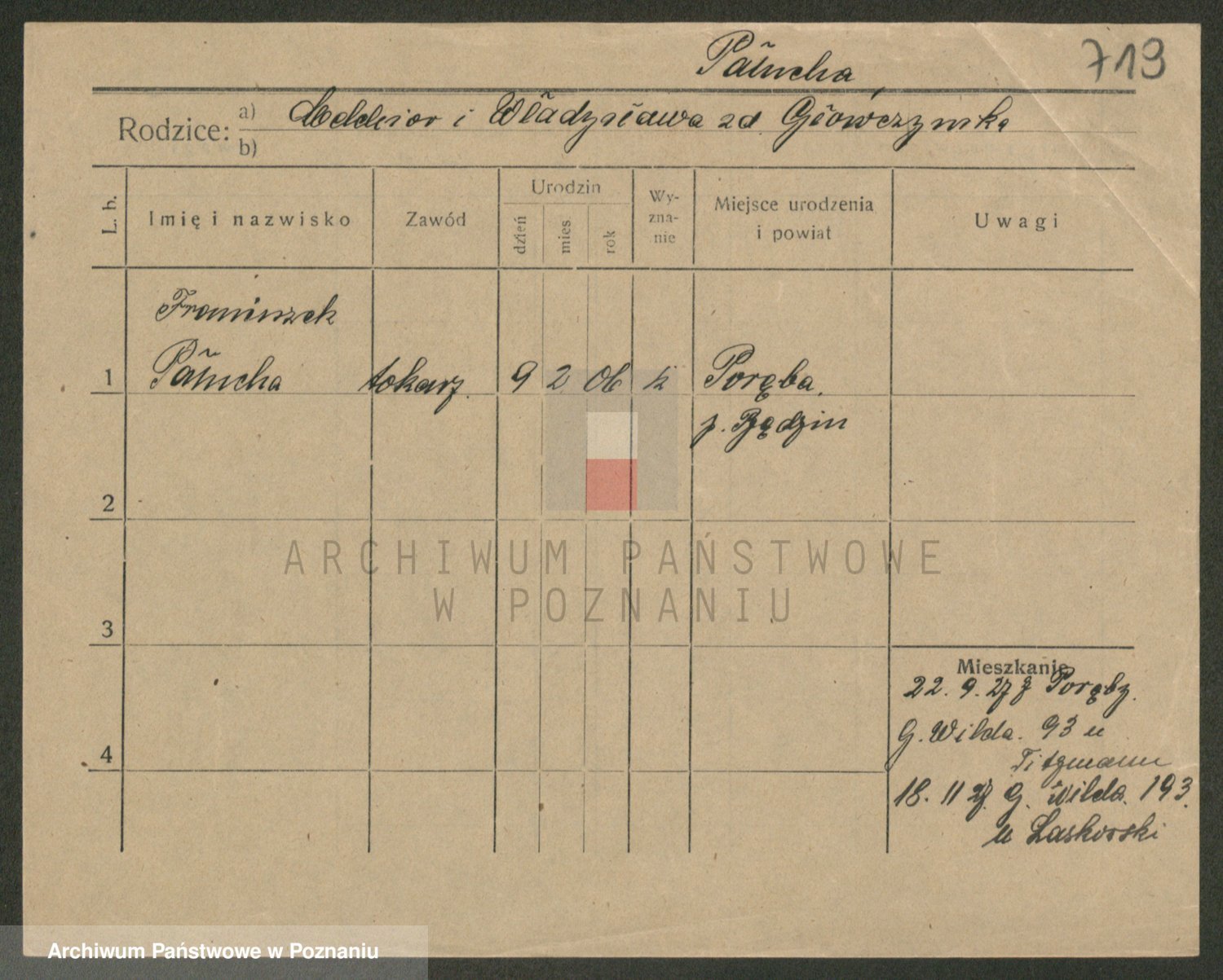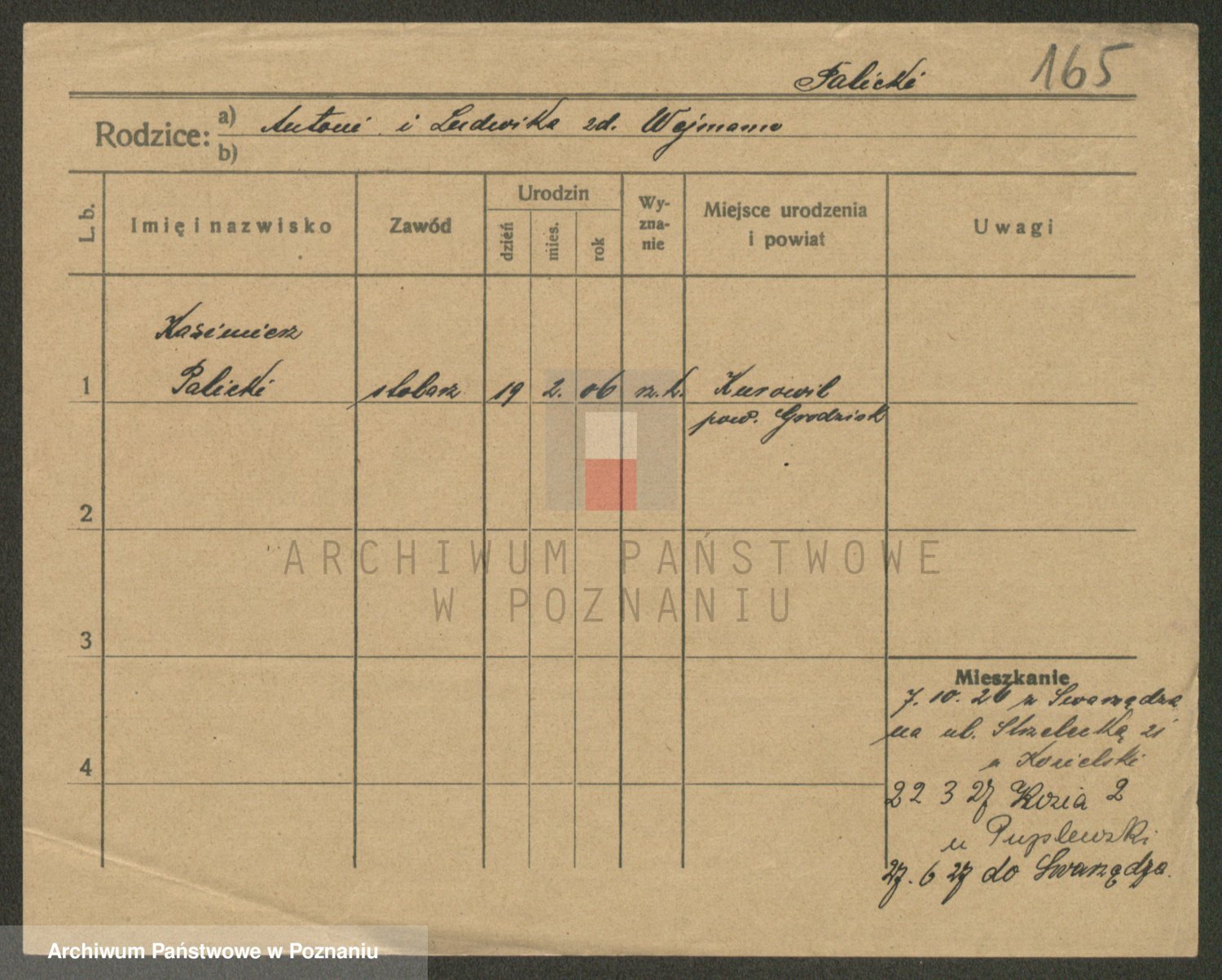 Podgląd karty osobowej dostępny jest po kliknięciu na nazwisko lub ikonkę karty. Można dokonywać powiększenia (ikony na górze) lub przechodzić między kolejnymi skanami (strzałki po bokach).