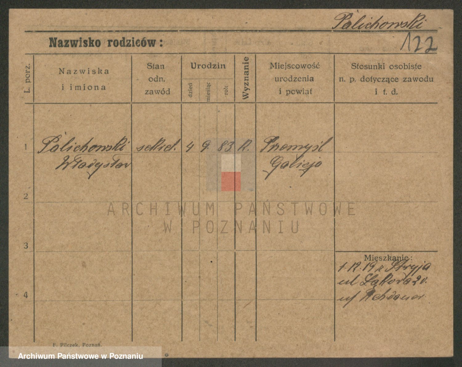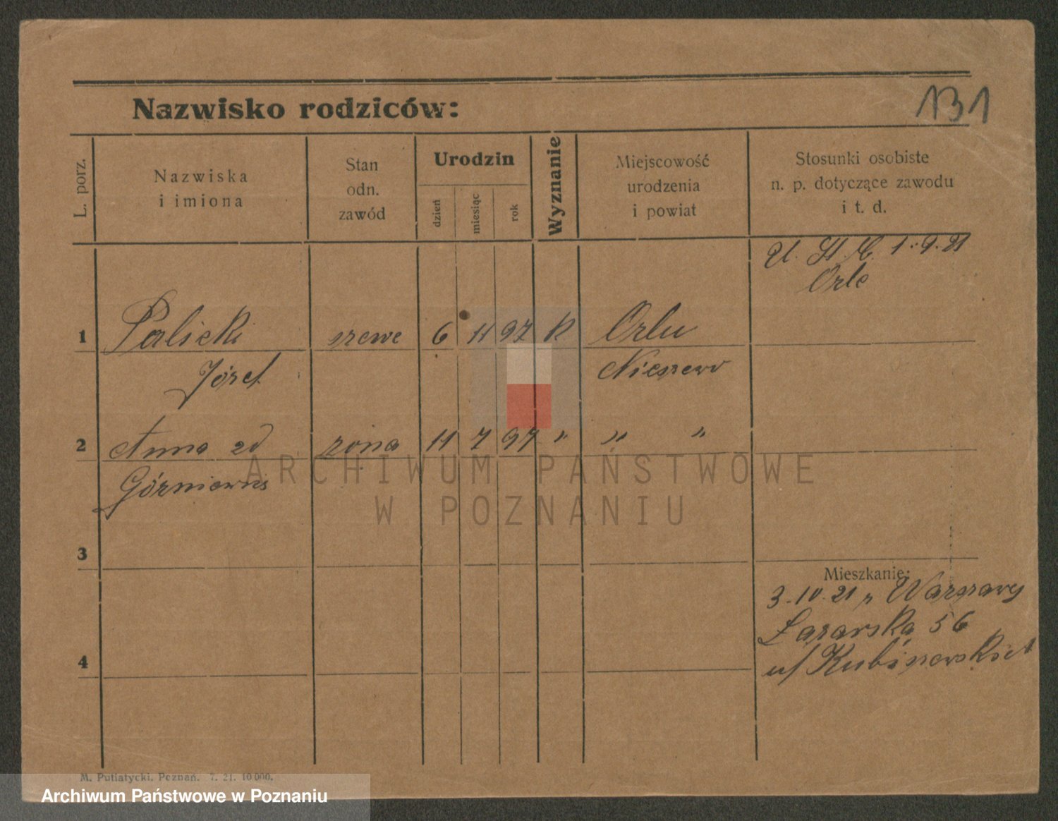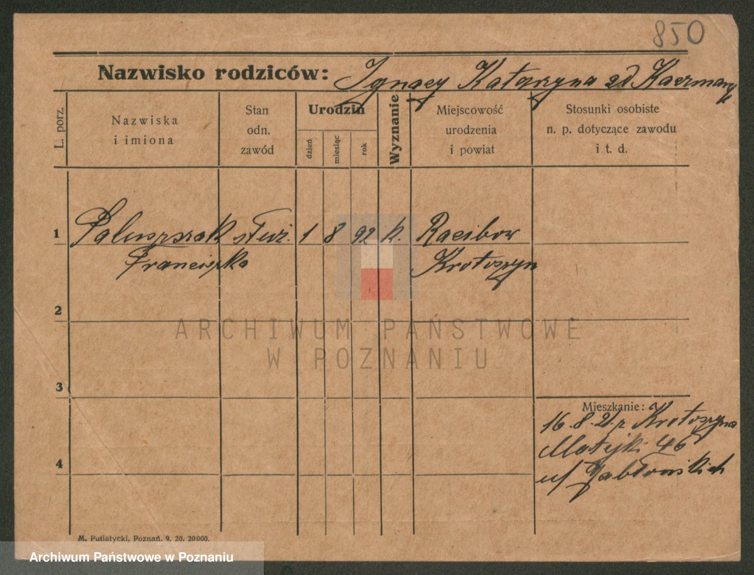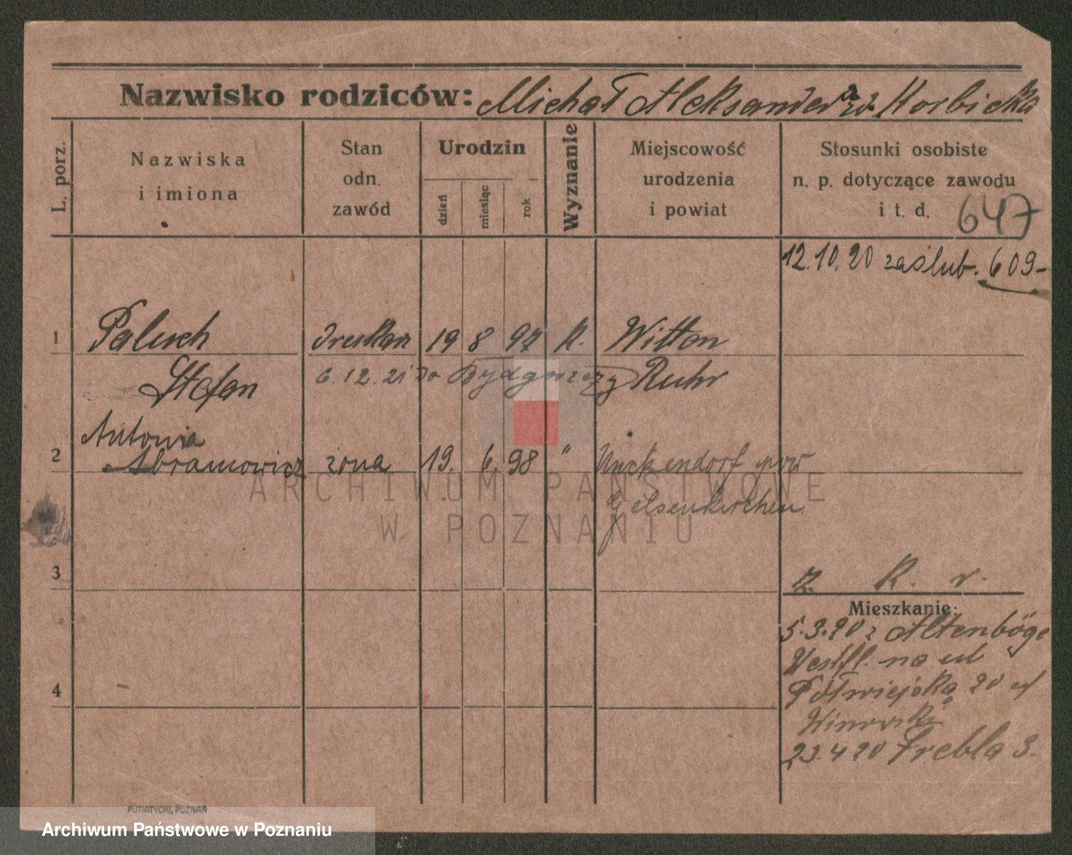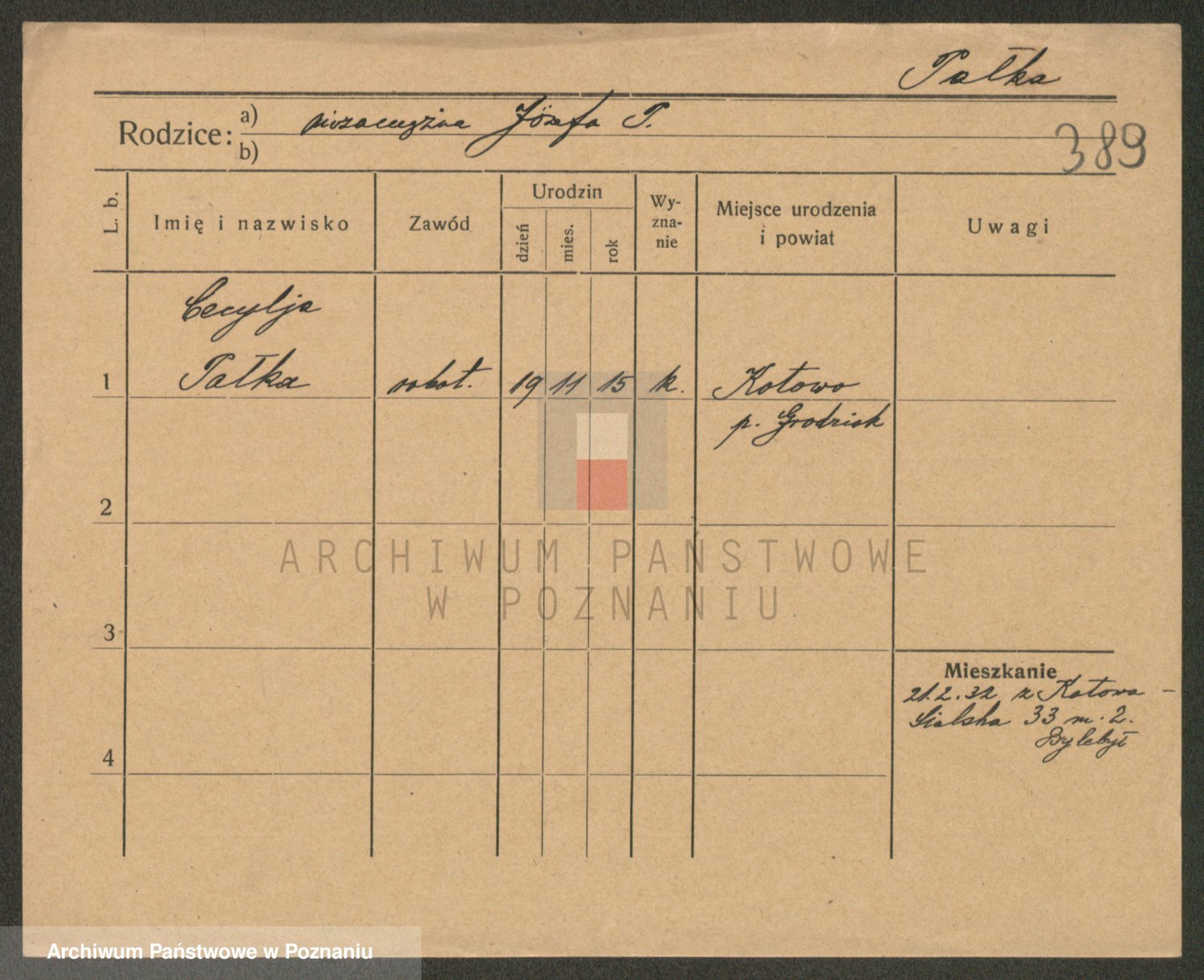 Podgląd karty osobowej dostępny jest po kliknięciu na nazwisko lub ikonkę karty. Można dokonywać powiększenia (ikony na górze) lub przechodzić między kolejnymi skanami (strzałki po bokach).