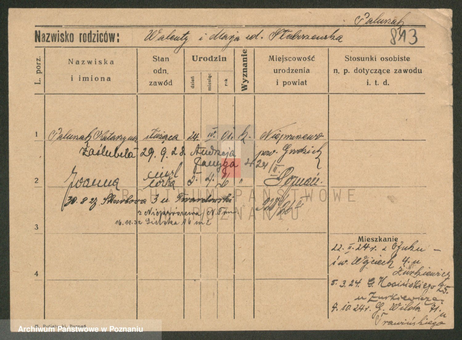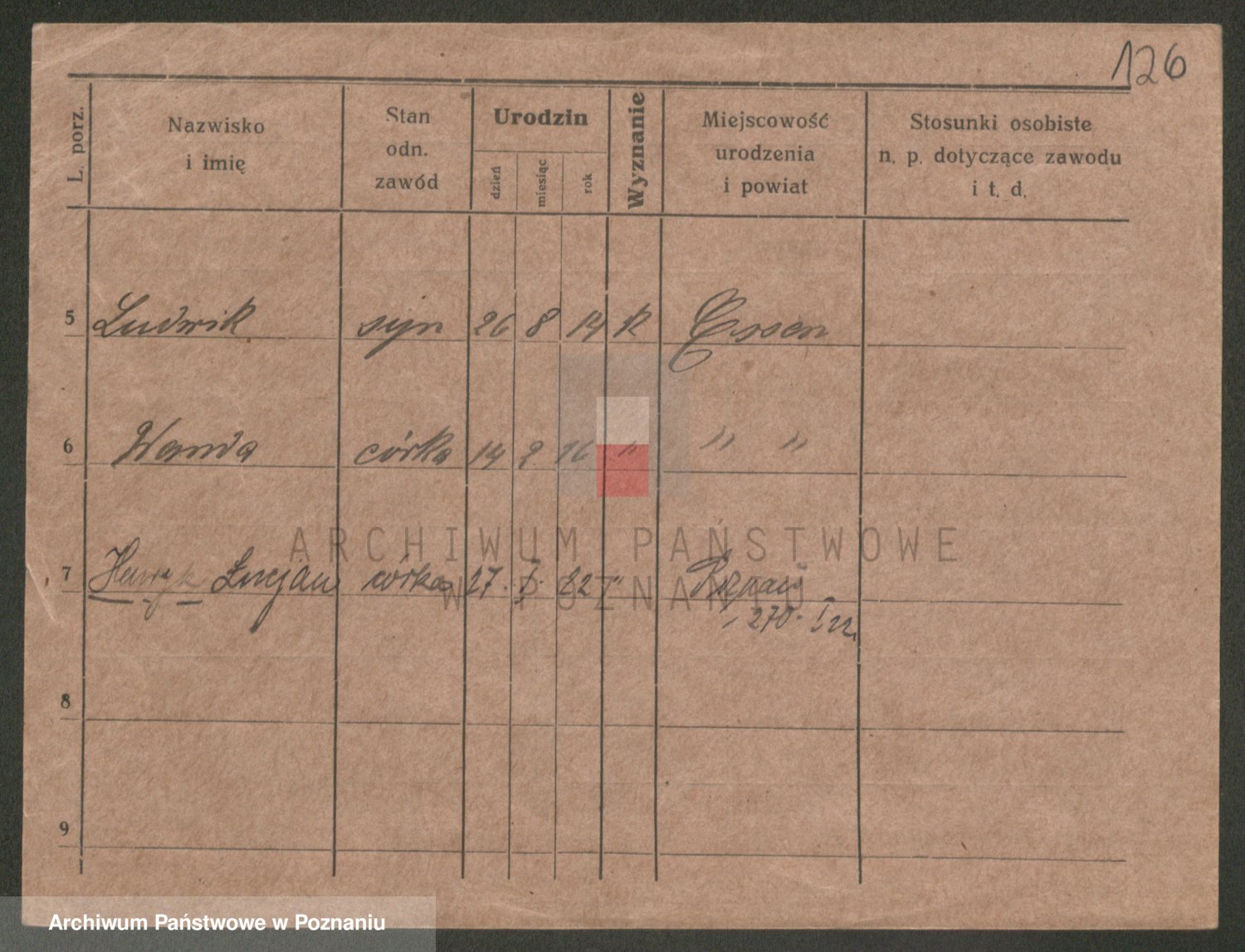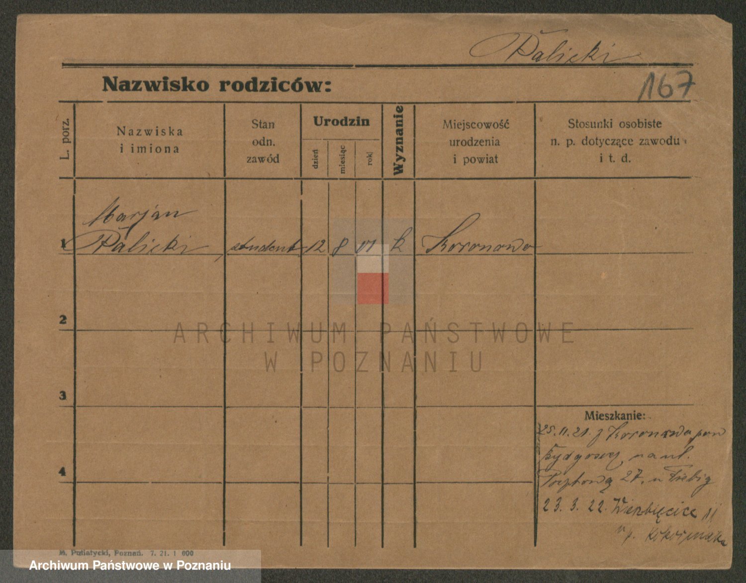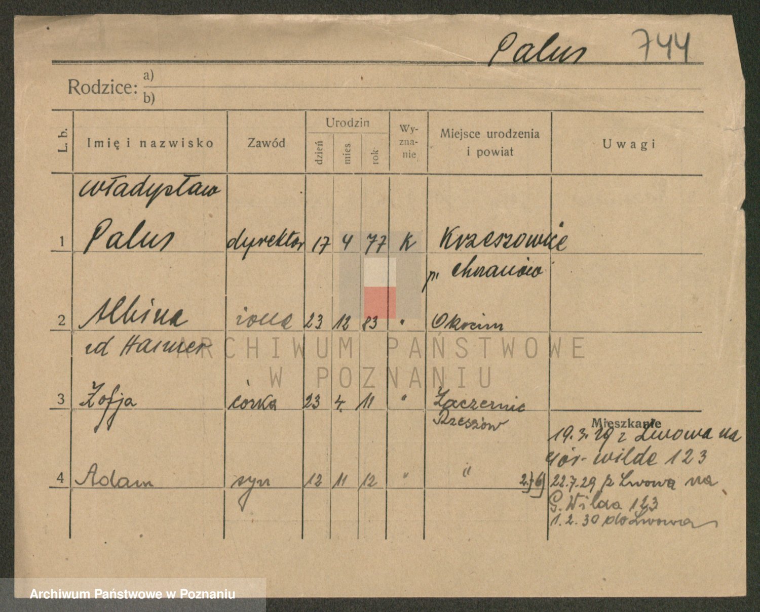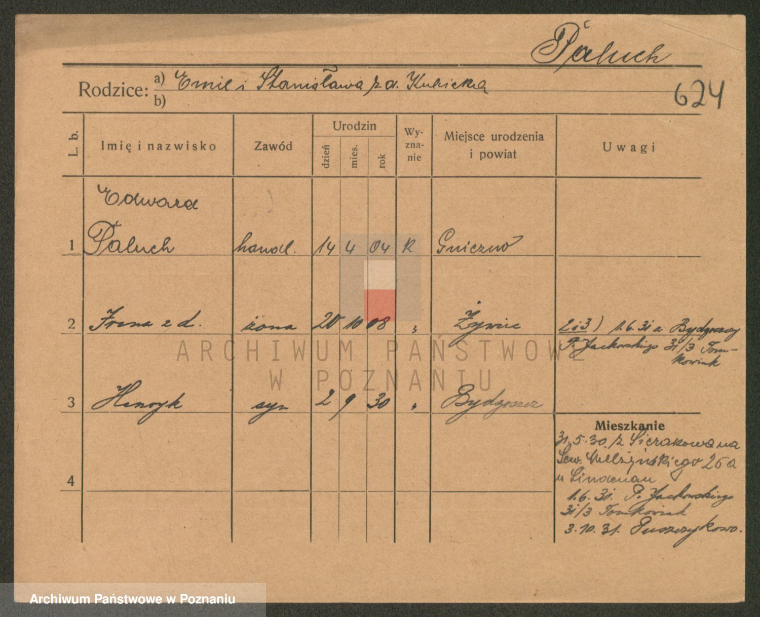 Podgląd karty osobowej dostępny jest po kliknięciu na nazwisko lub ikonkę karty. Można dokonywać powiększenia (ikony na górze) lub przechodzić między kolejnymi skanami (strzałki po bokach).