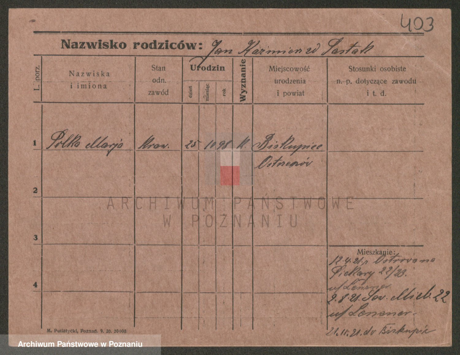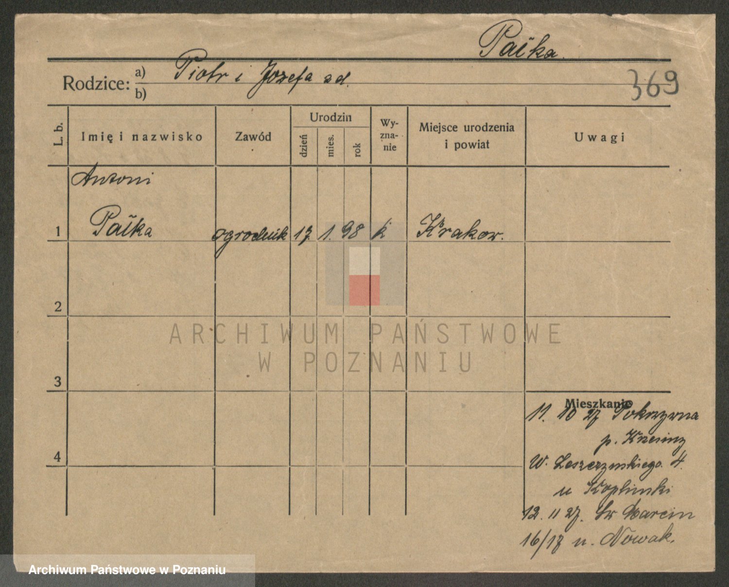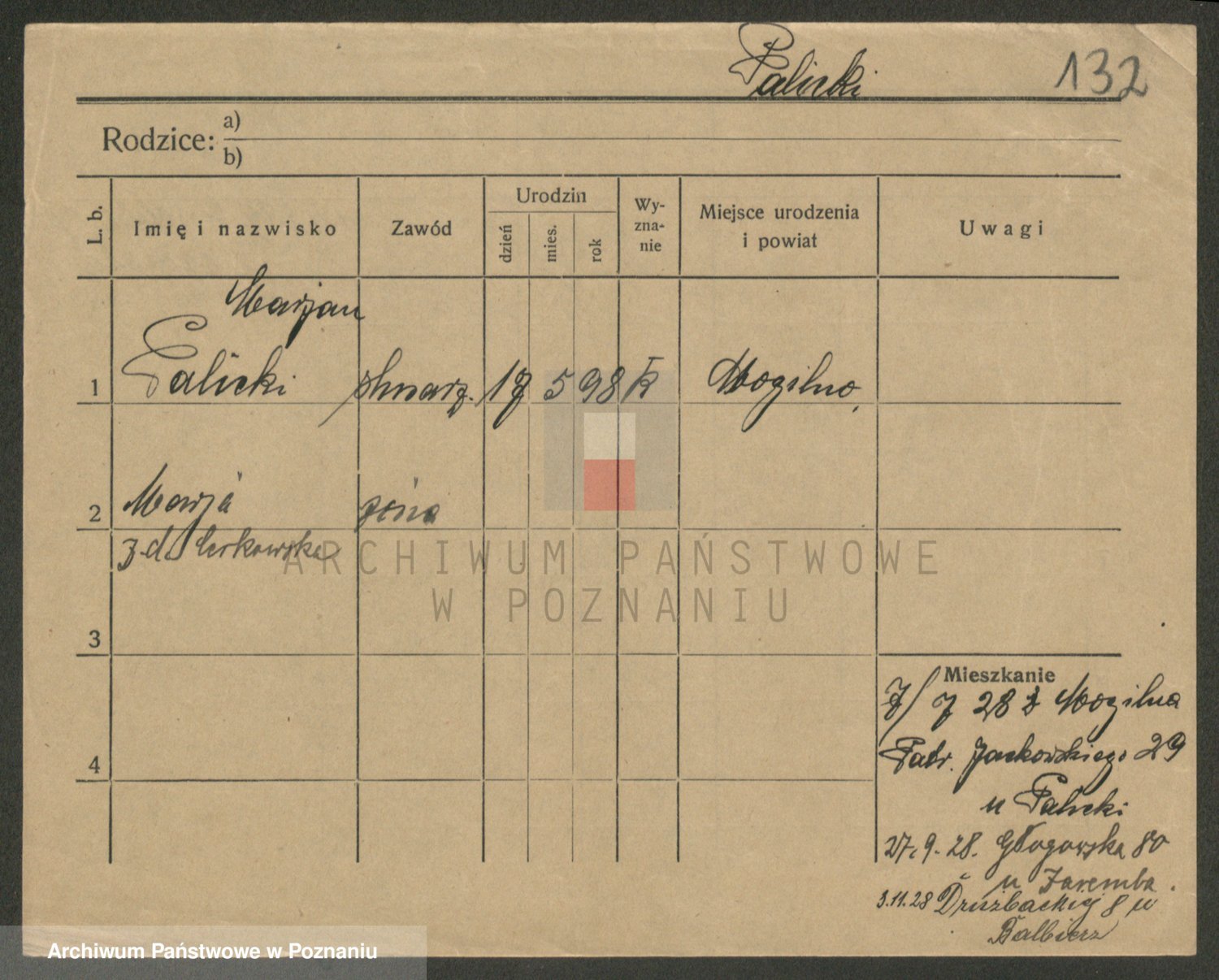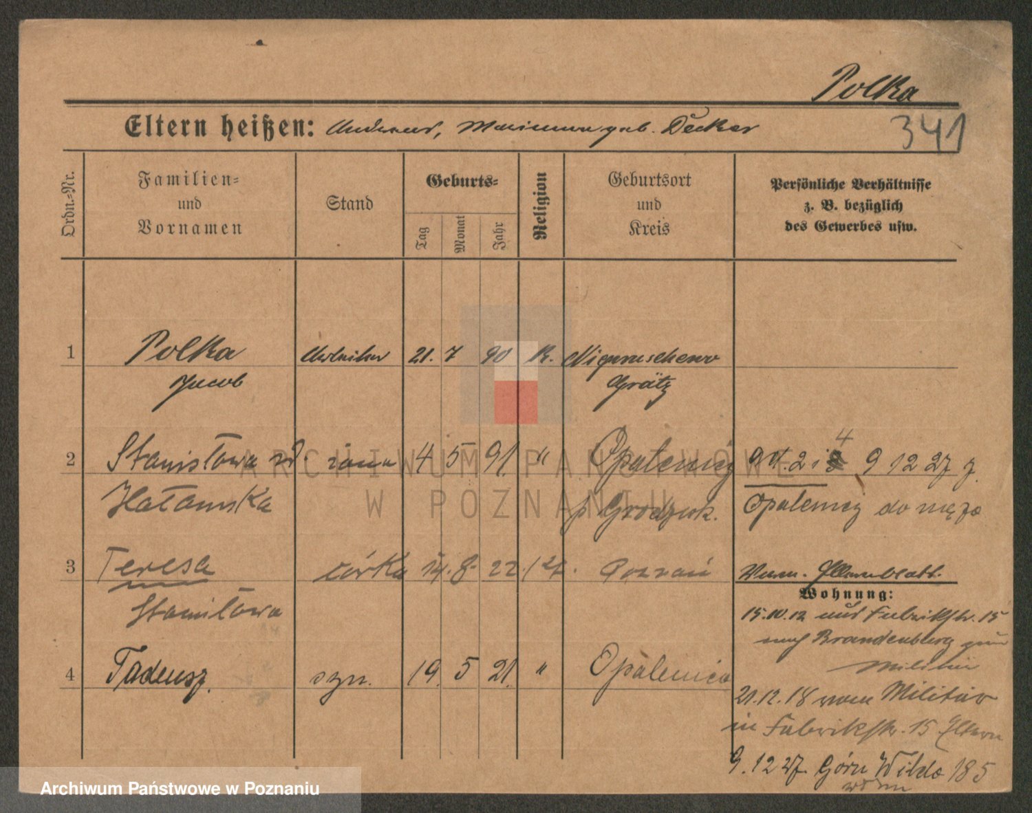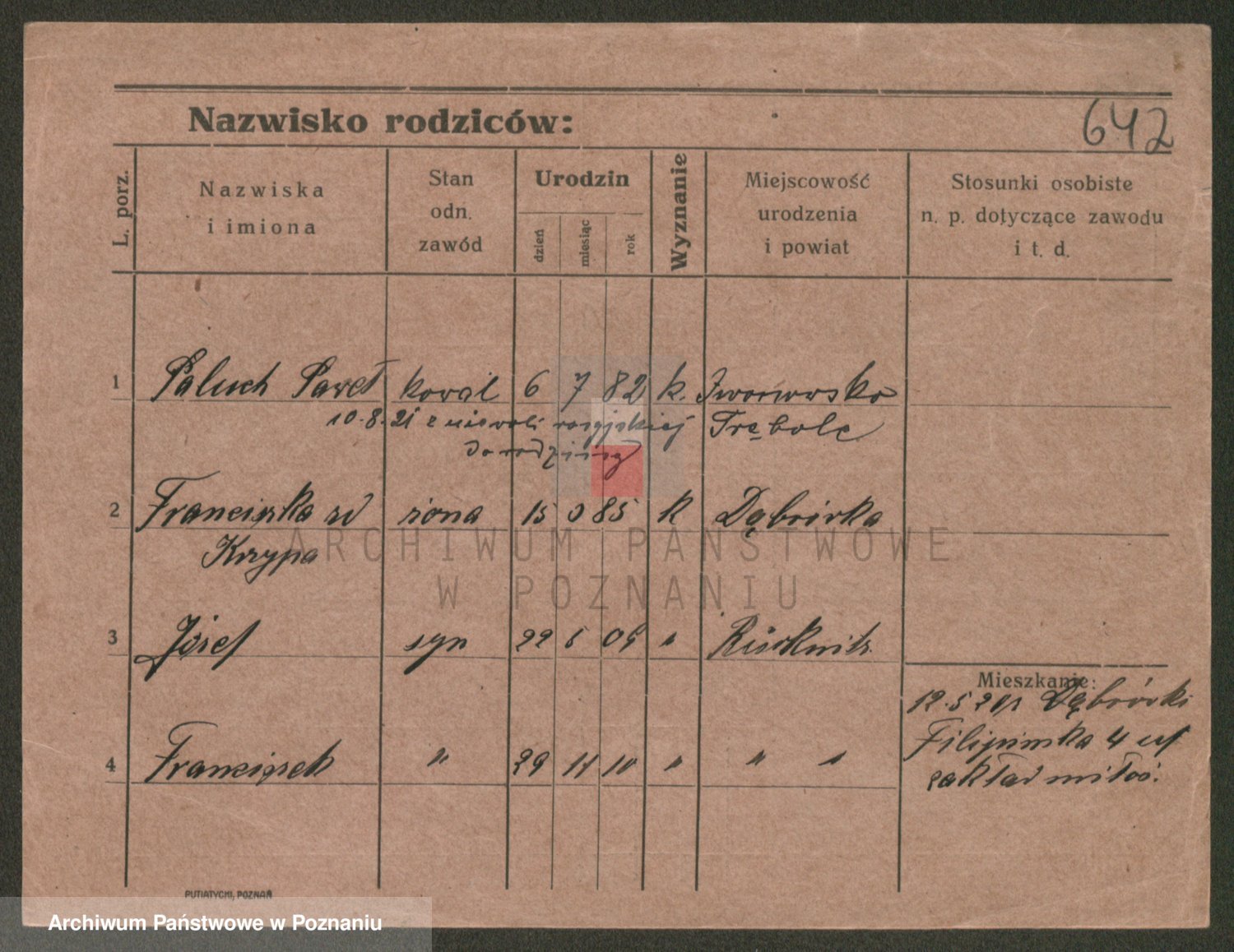 Podgląd karty osobowej dostępny jest po kliknięciu na nazwisko lub ikonkę karty. Można dokonywać powiększenia (ikony na górze) lub przechodzić między kolejnymi skanami (strzałki po bokach).