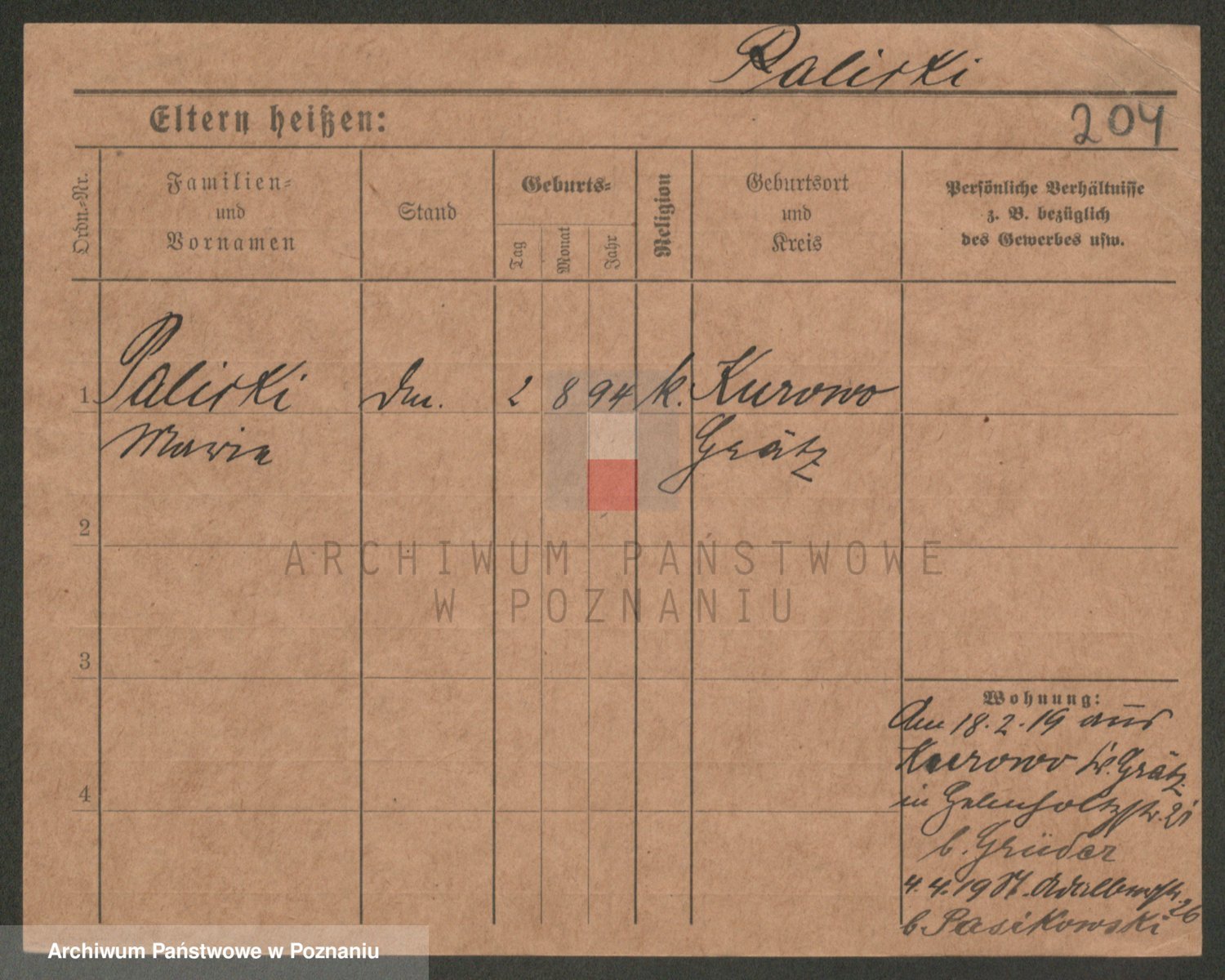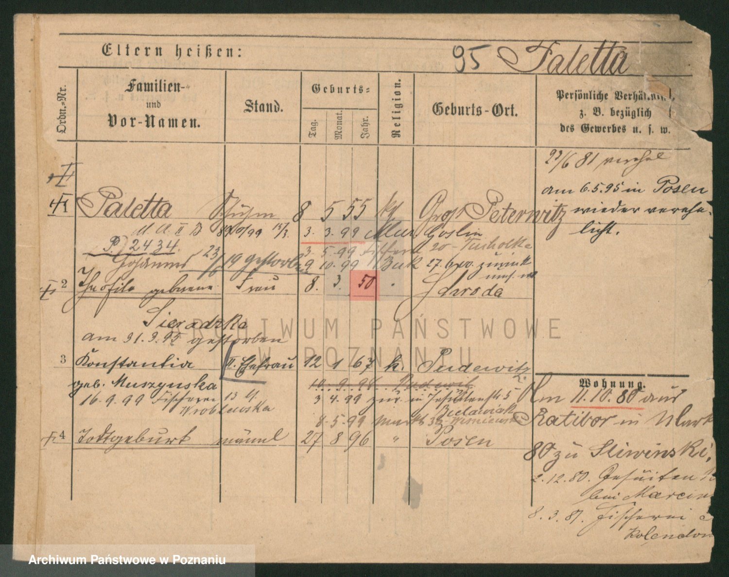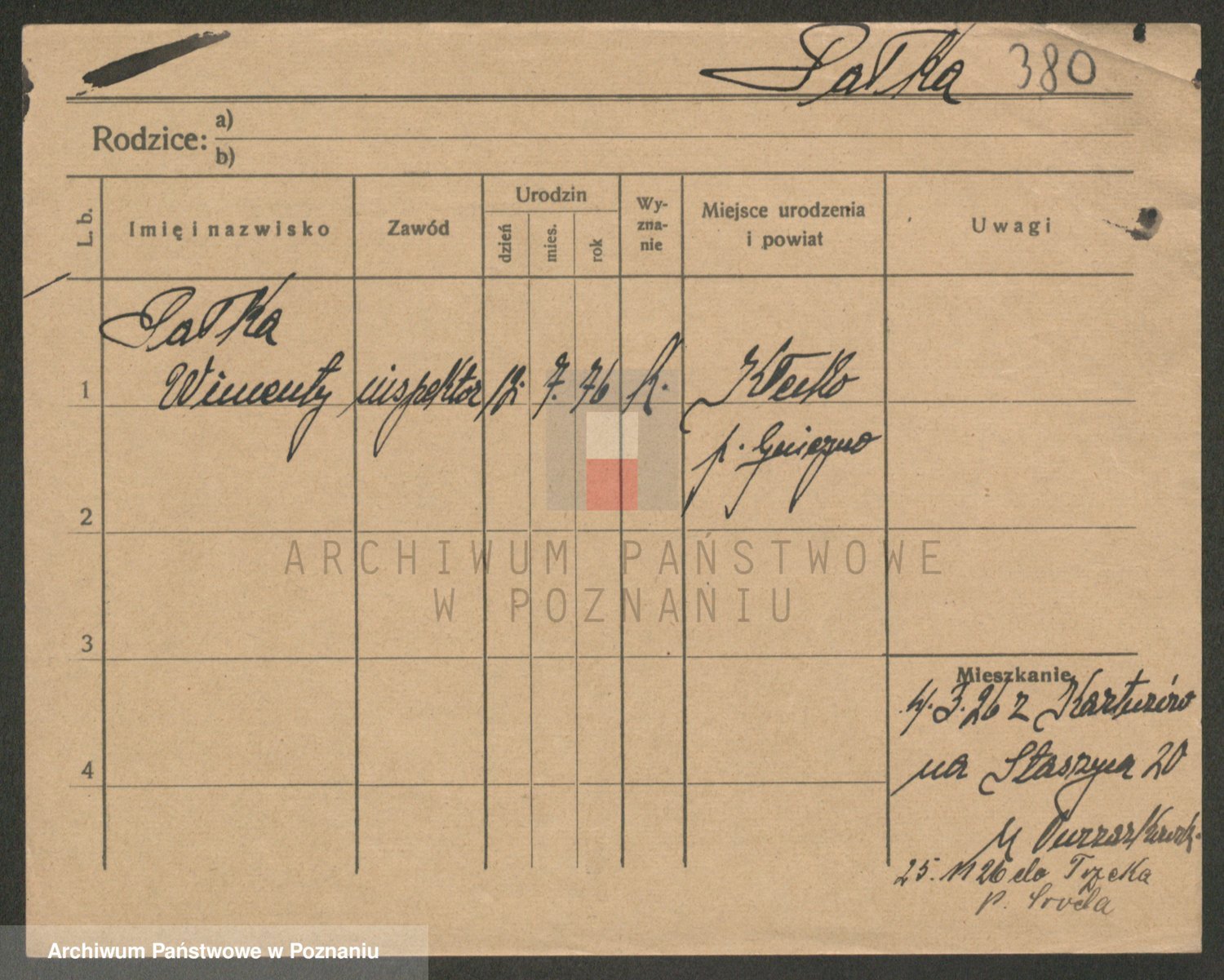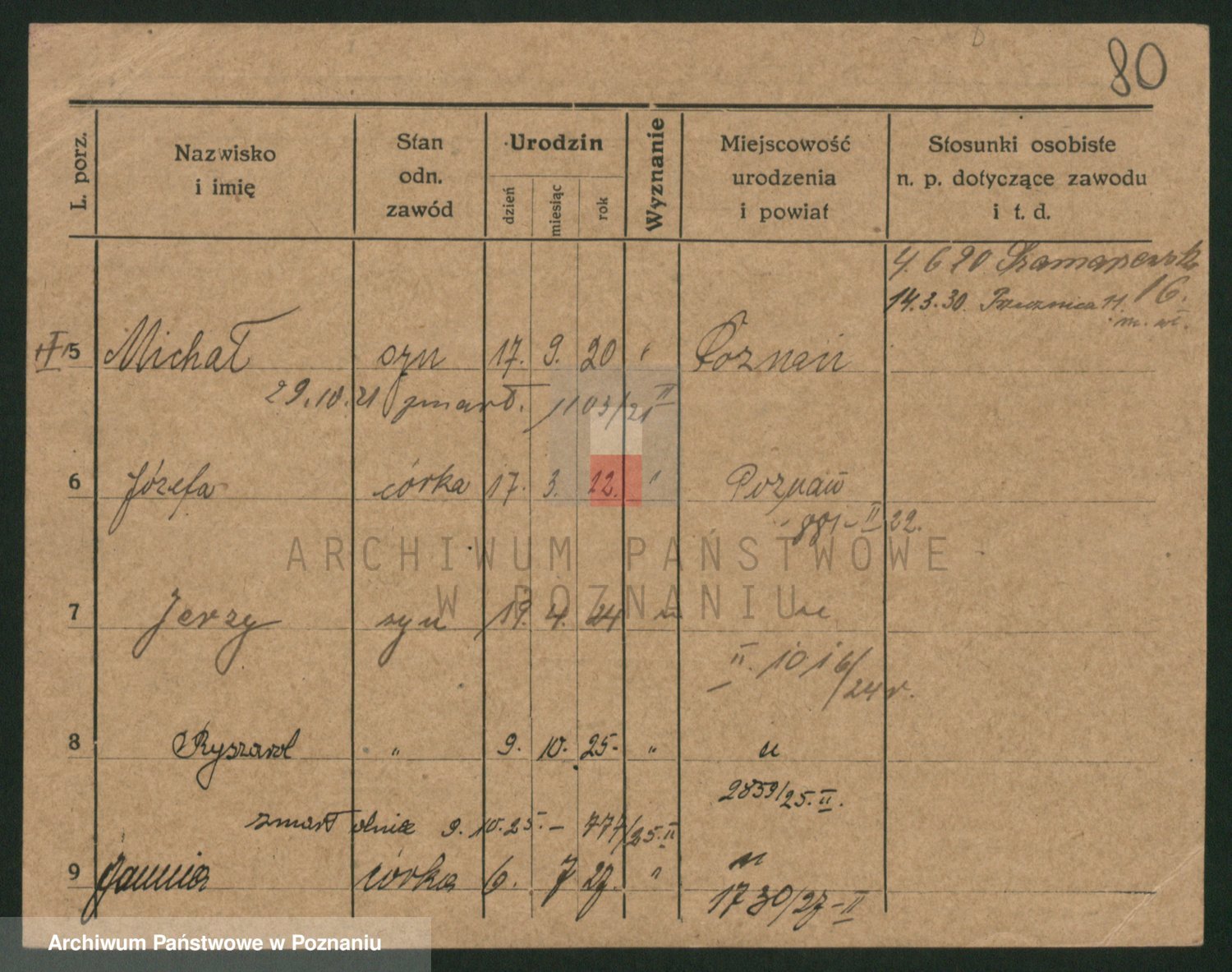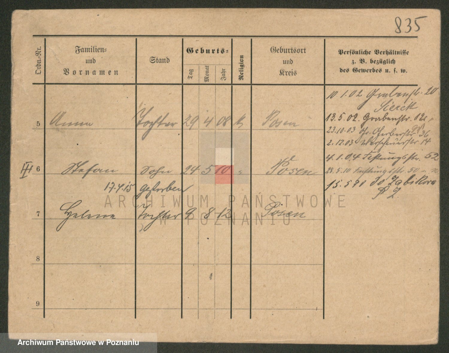 Podgląd karty osobowej dostępny jest po kliknięciu na nazwisko lub ikonkę karty. Można dokonywać powiększenia (ikony na górze) lub przechodzić między kolejnymi skanami (strzałki po bokach).