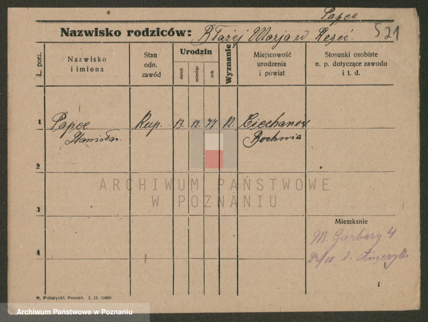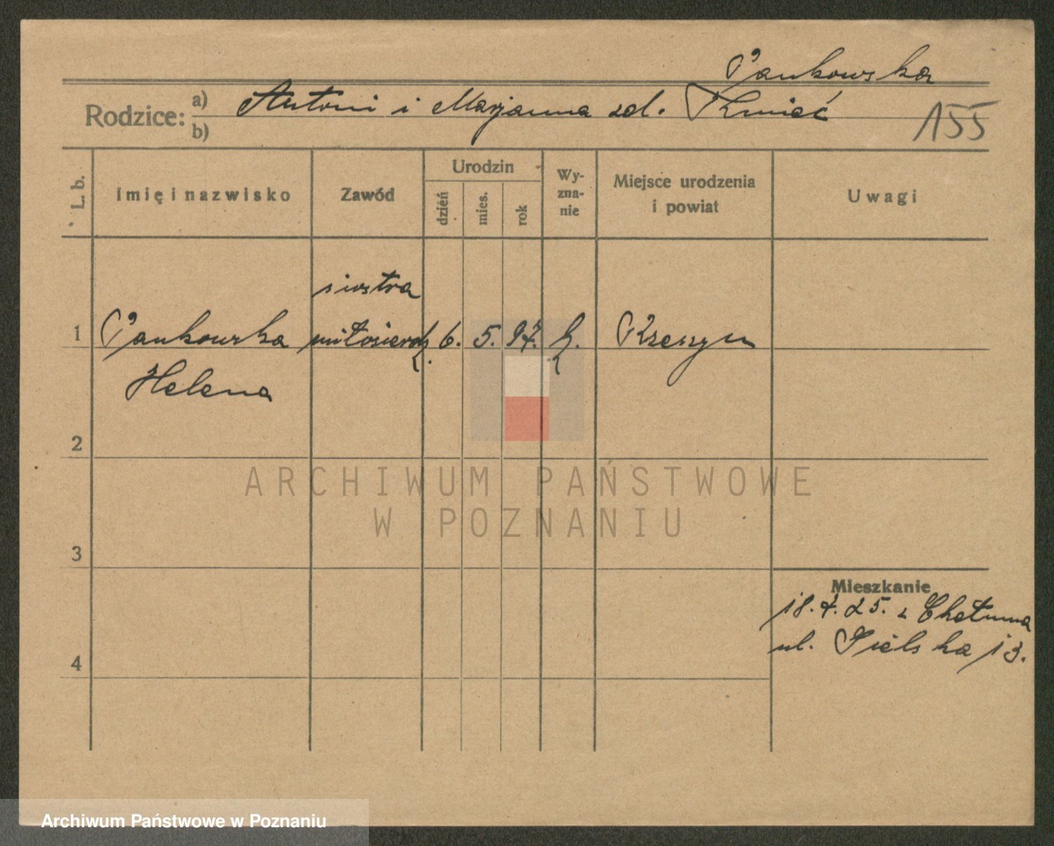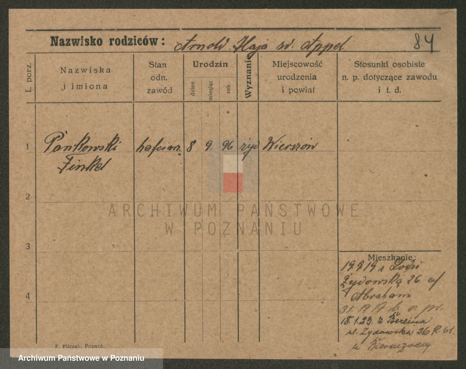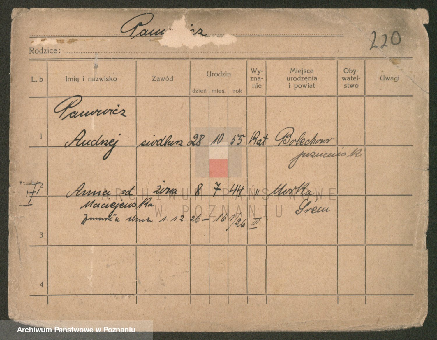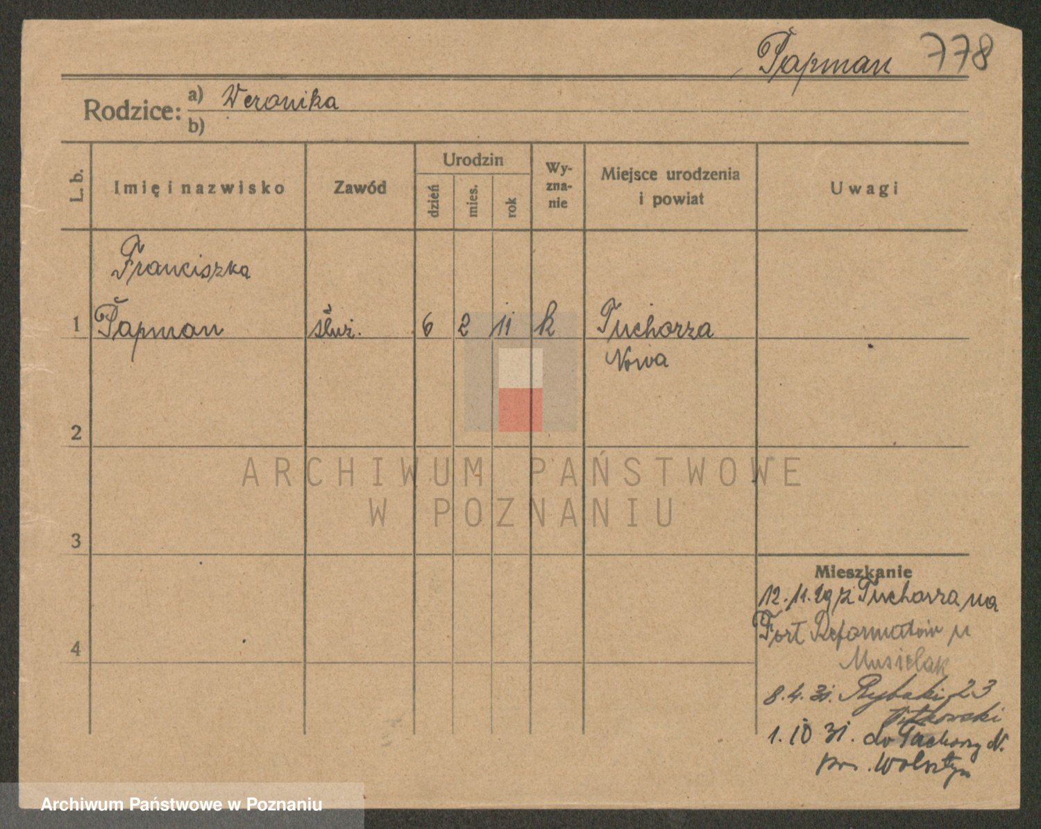 Podgląd karty osobowej dostępny jest po kliknięciu na nazwisko lub ikonkę karty. Można dokonywać powiększenia (ikony na górze) lub przechodzić między kolejnymi skanami (strzałki po bokach).