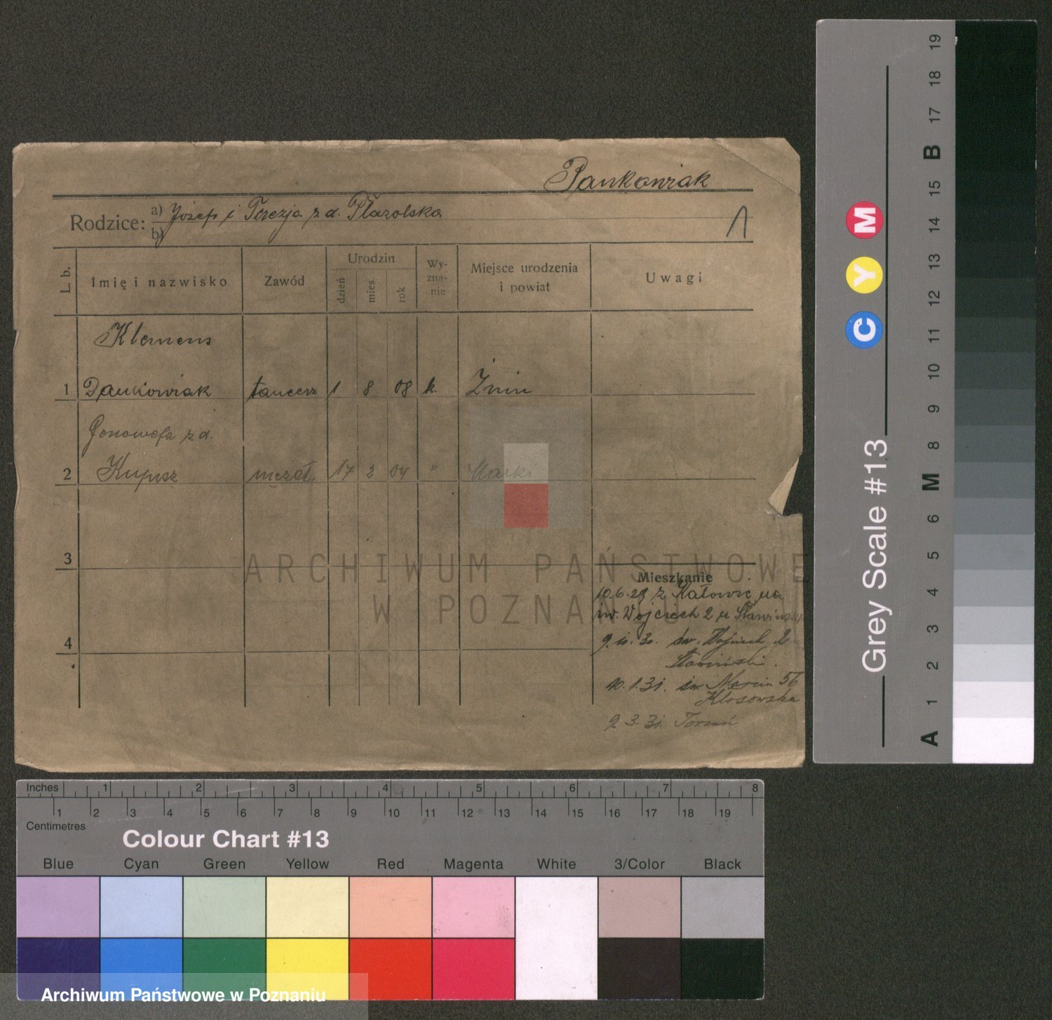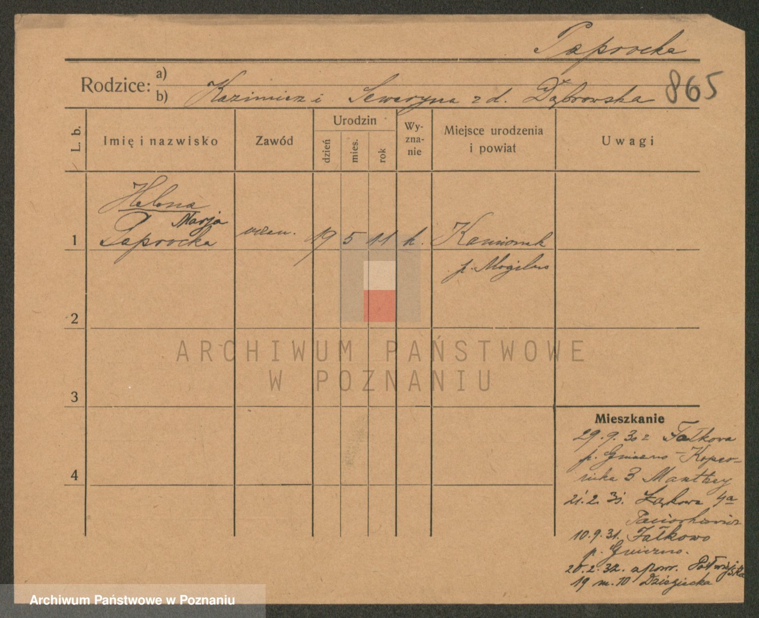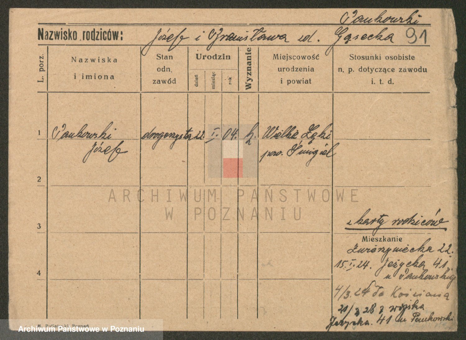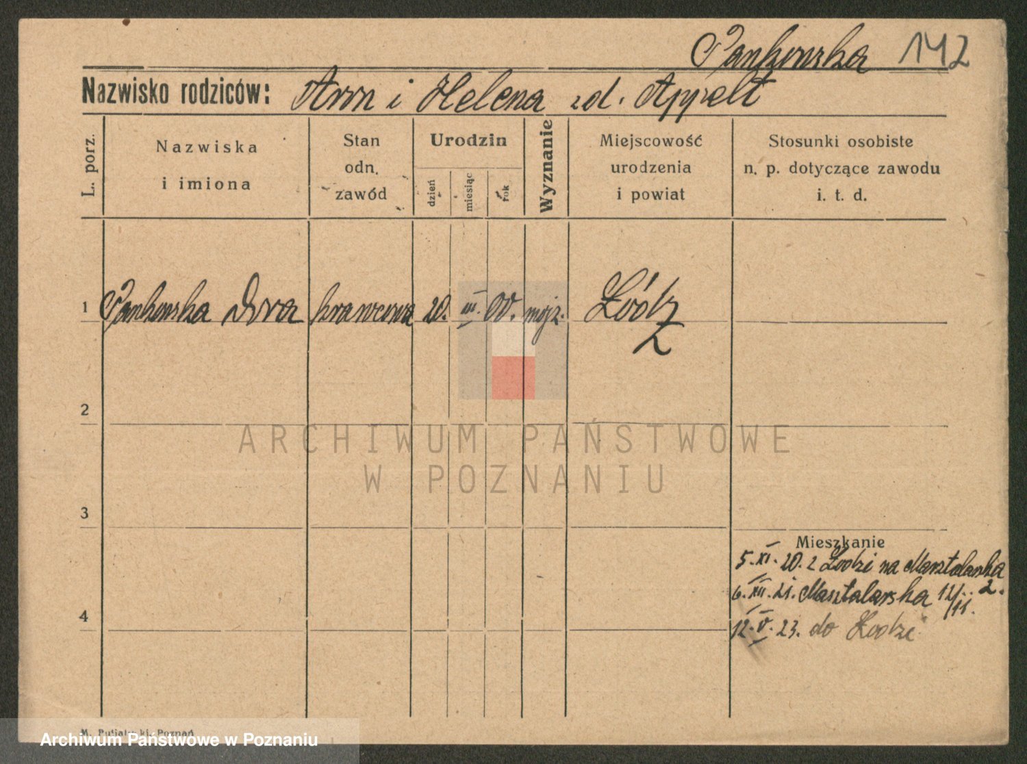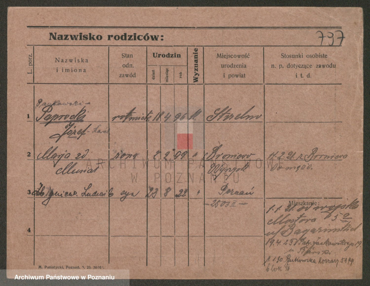 Podgląd karty osobowej dostępny jest po kliknięciu na nazwisko lub ikonkę karty. Można dokonywać powiększenia (ikony na górze) lub przechodzić między kolejnymi skanami (strzałki po bokach).