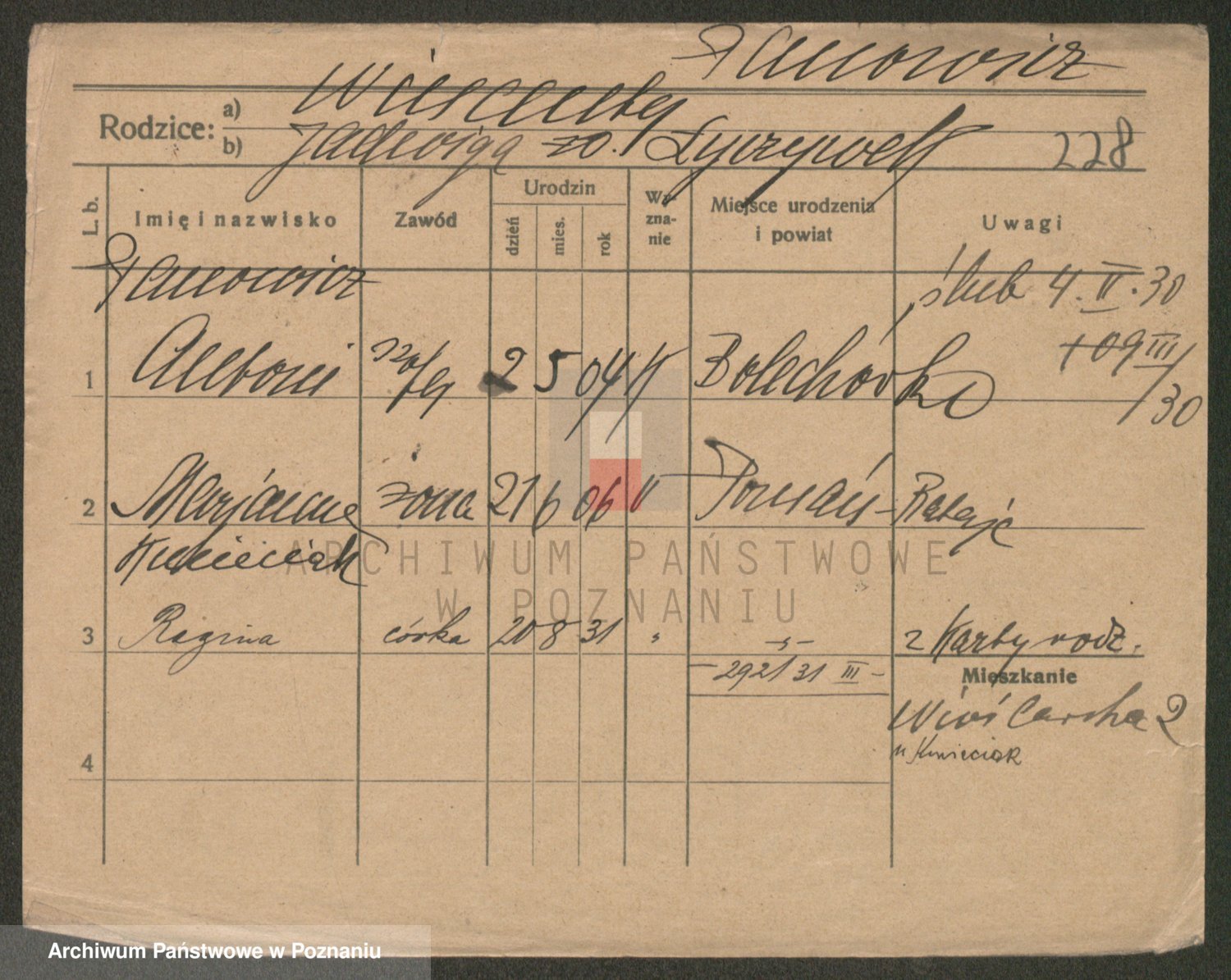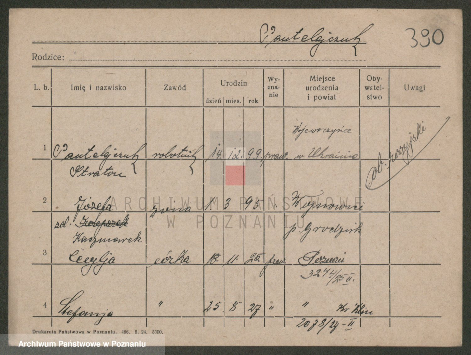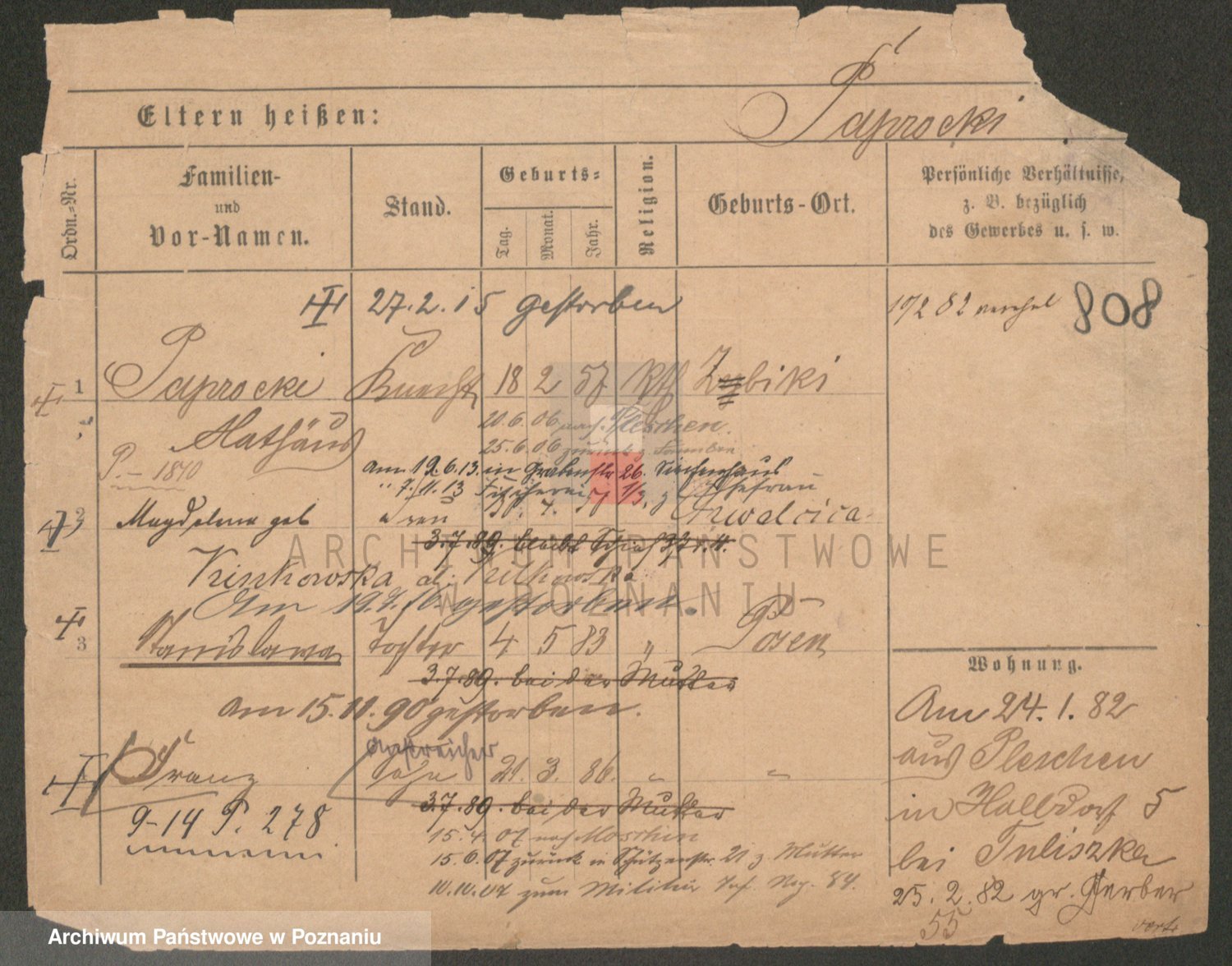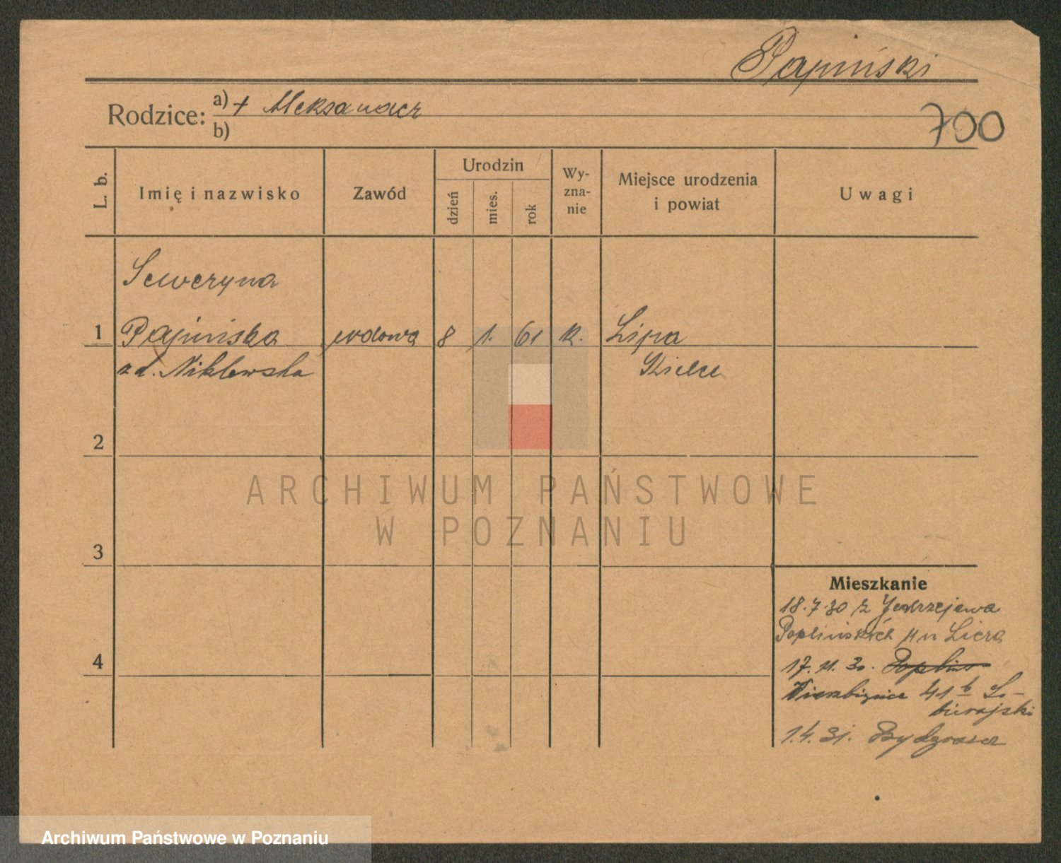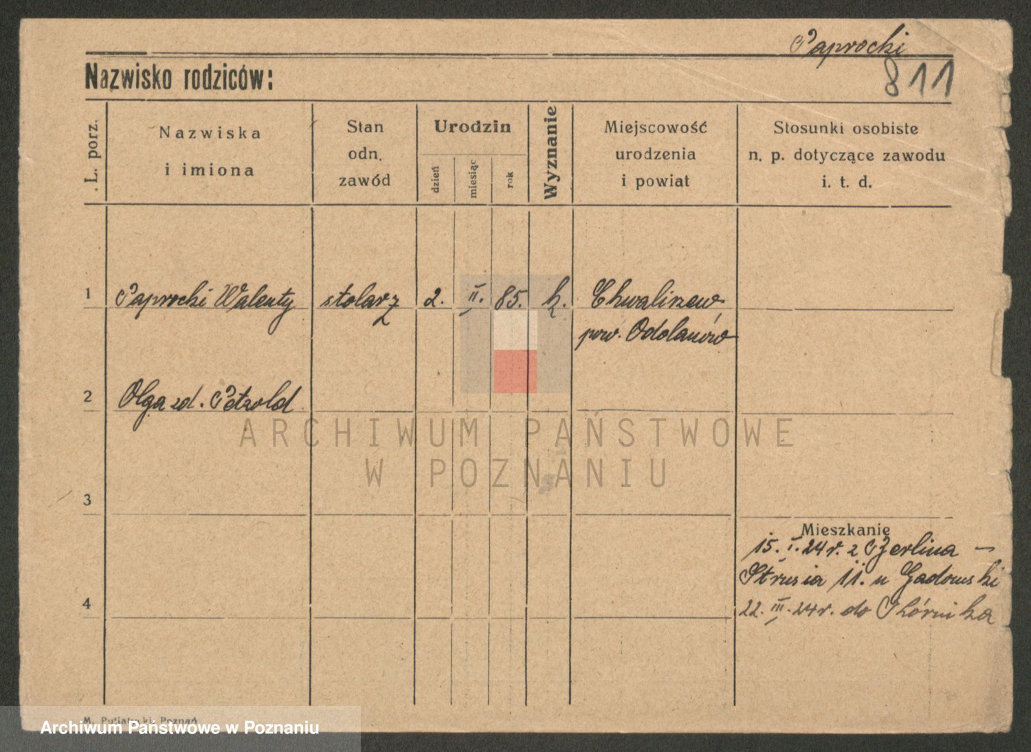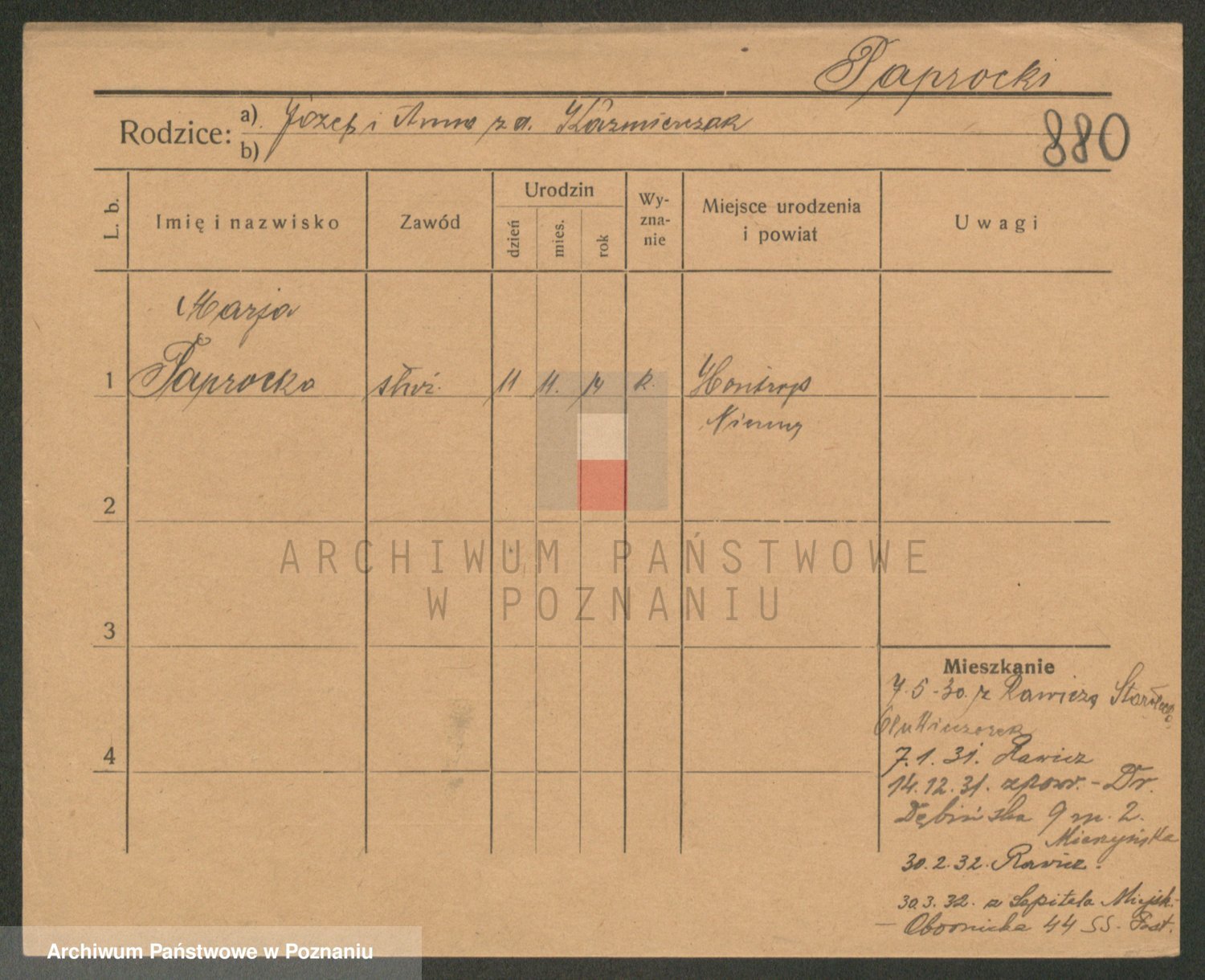 Podgląd karty osobowej dostępny jest po kliknięciu na nazwisko lub ikonkę karty. Można dokonywać powiększenia (ikony na górze) lub przechodzić między kolejnymi skanami (strzałki po bokach).