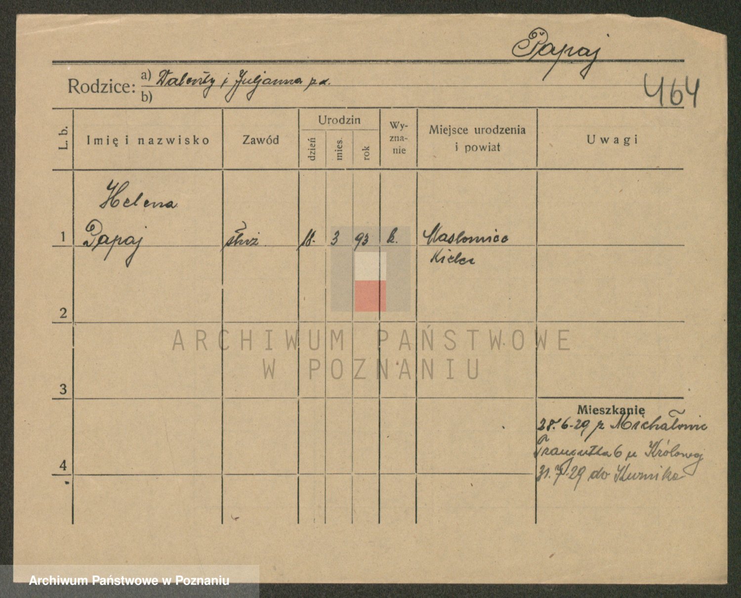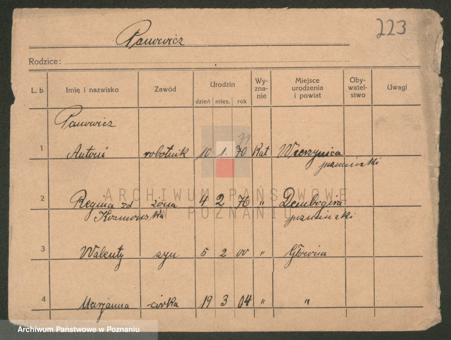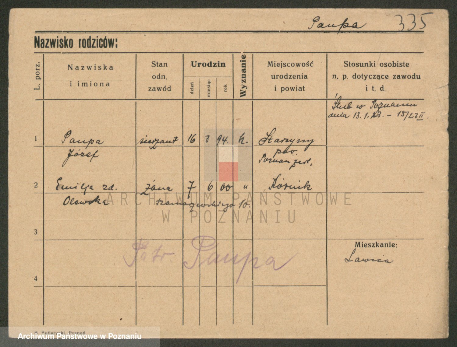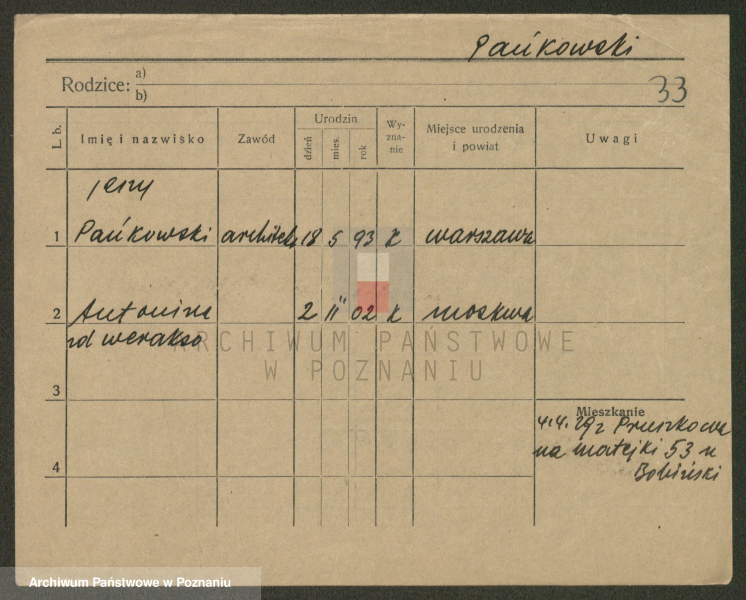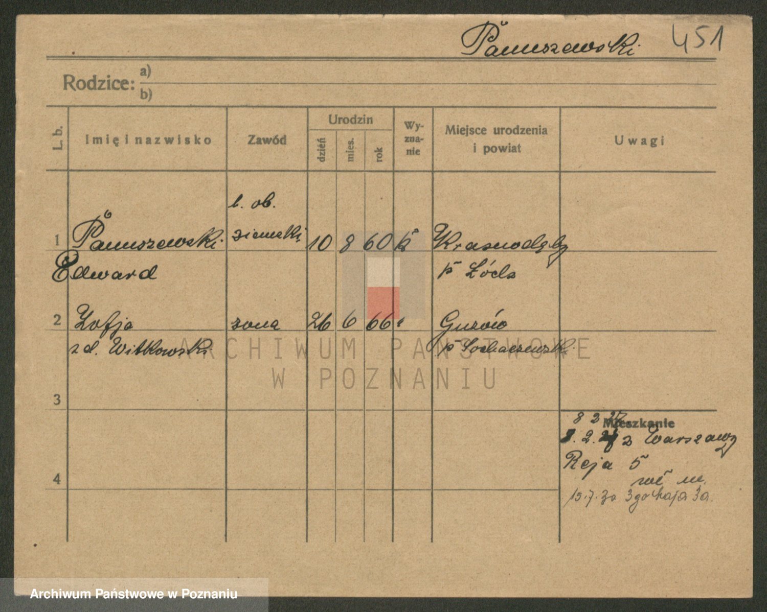 Podgląd karty osobowej dostępny jest po kliknięciu na nazwisko lub ikonkę karty. Można dokonywać powiększenia (ikony na górze) lub przechodzić między kolejnymi skanami (strzałki po bokach).