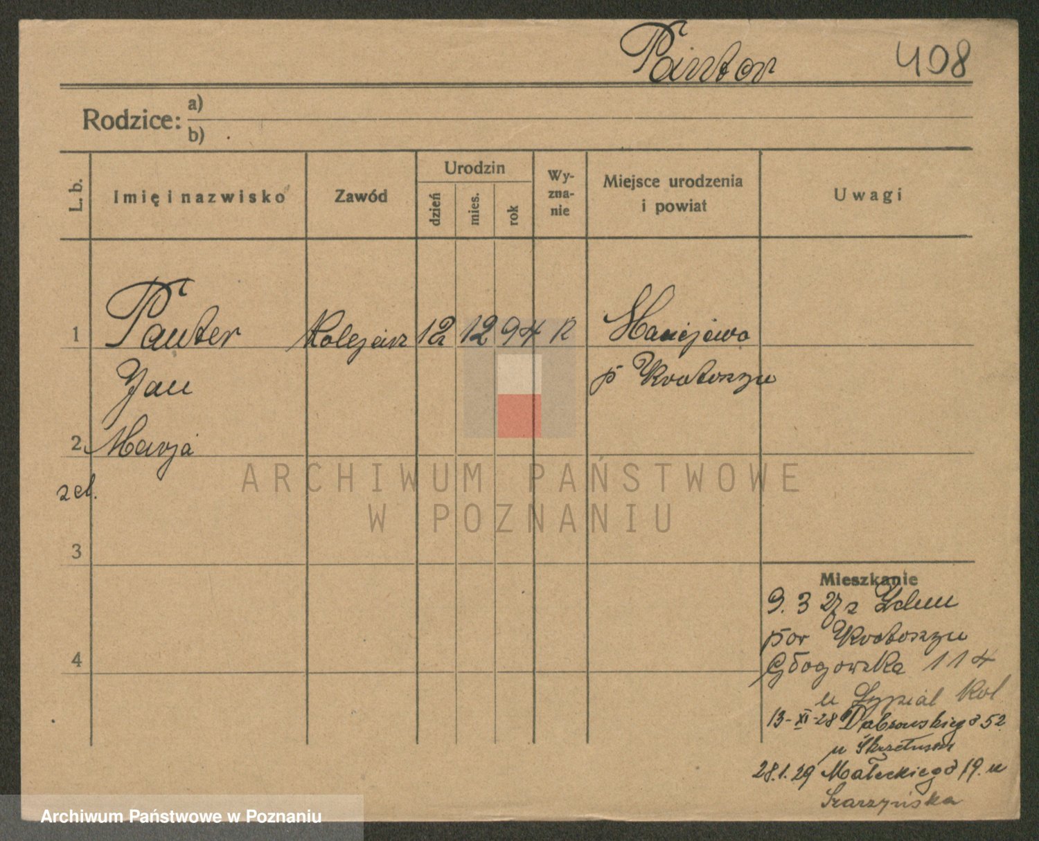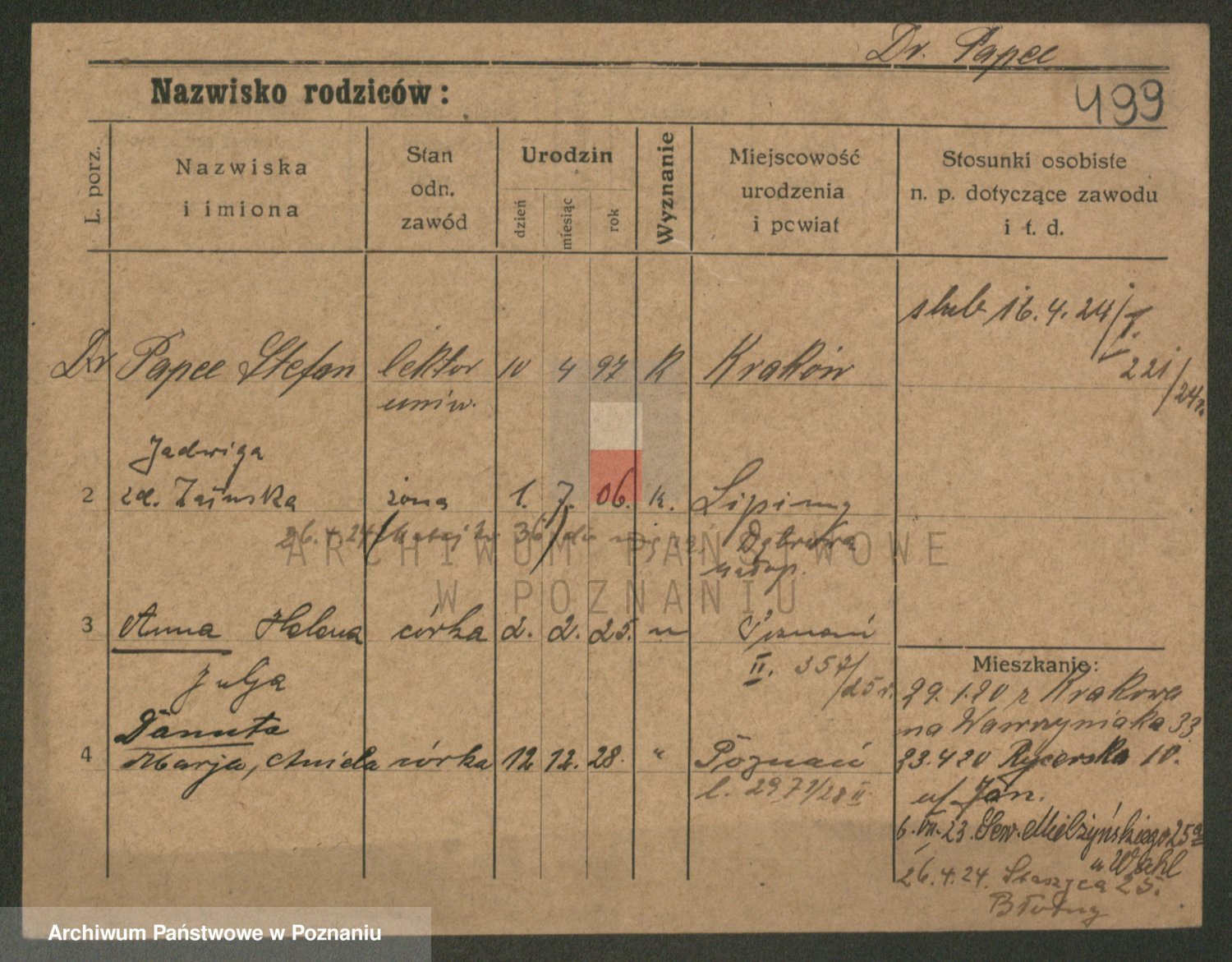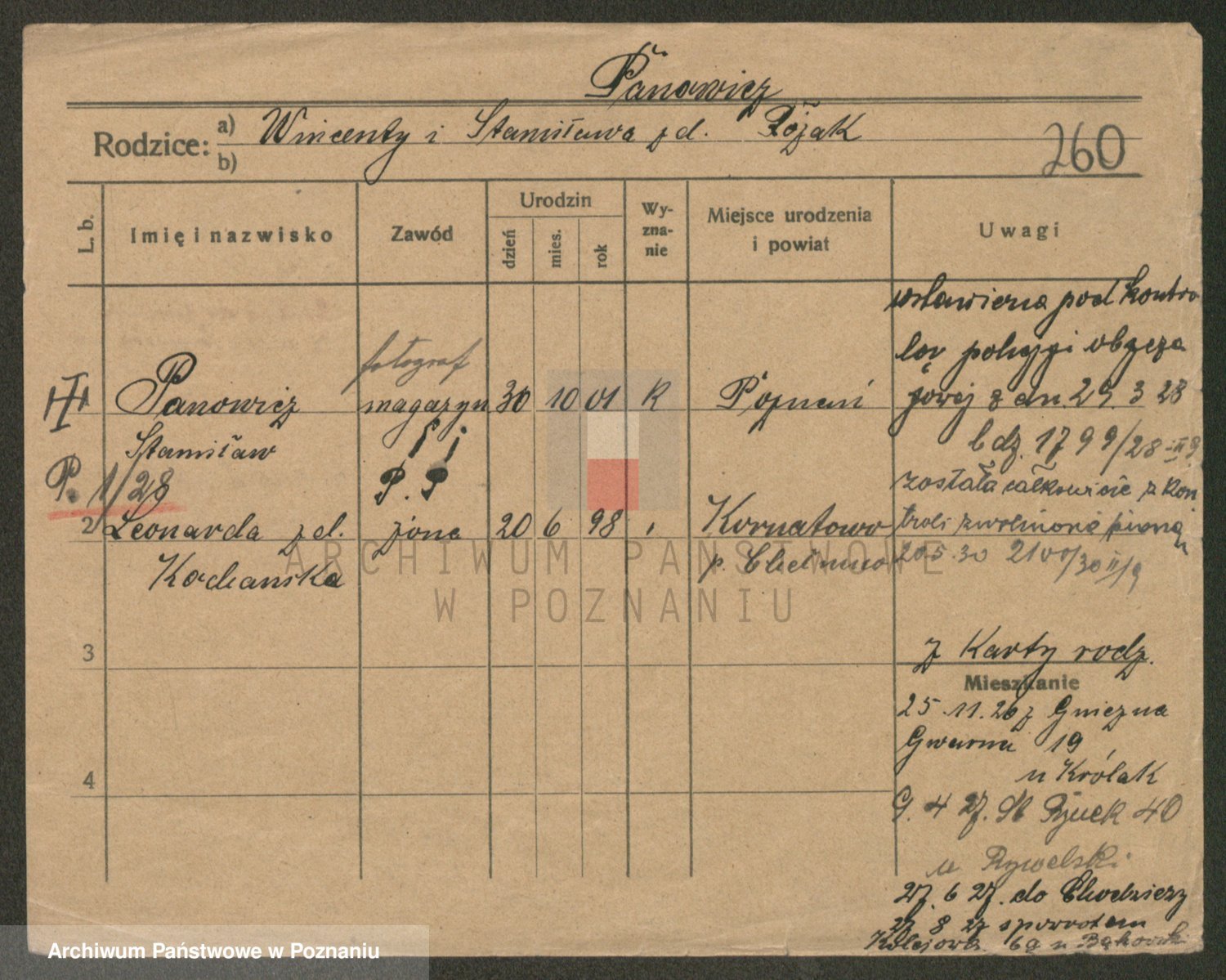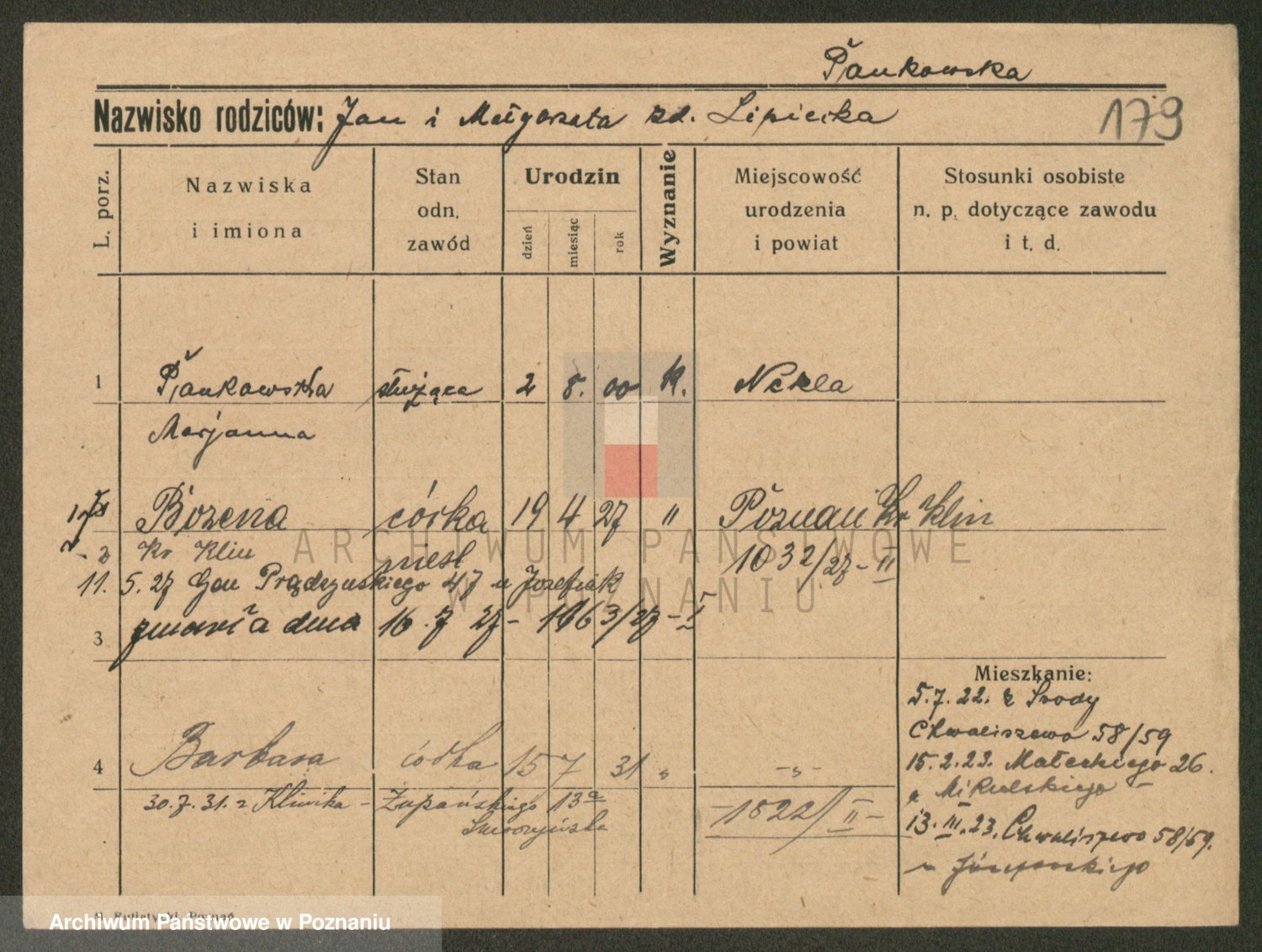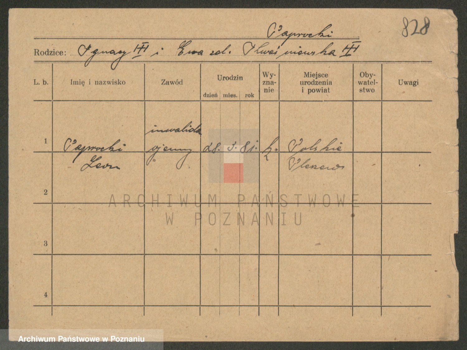 Podgląd karty osobowej dostępny jest po kliknięciu na nazwisko lub ikonkę karty. Można dokonywać powiększenia (ikony na górze) lub przechodzić między kolejnymi skanami (strzałki po bokach).