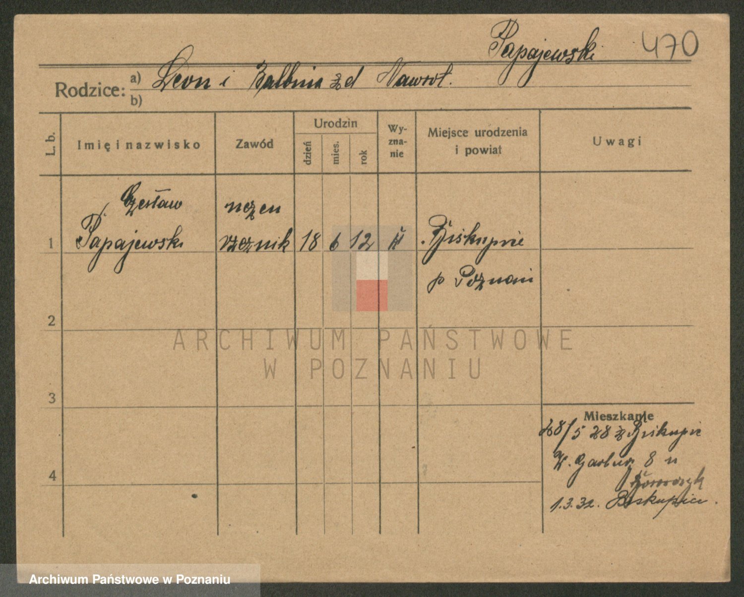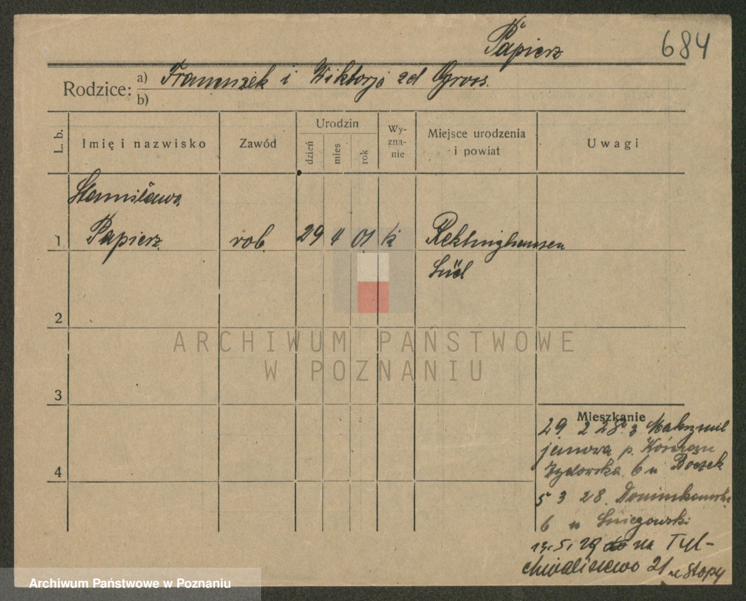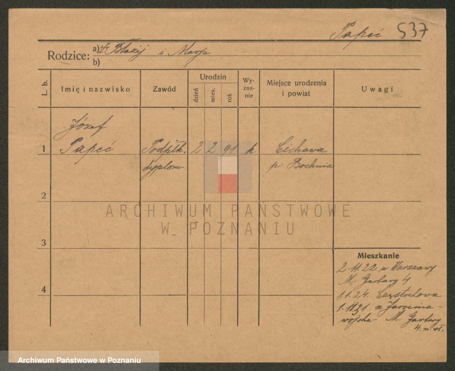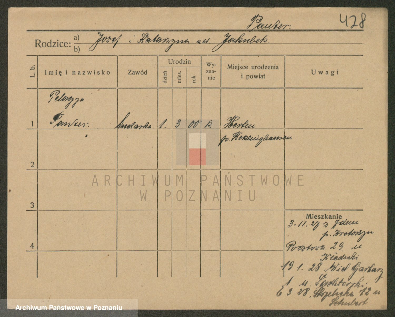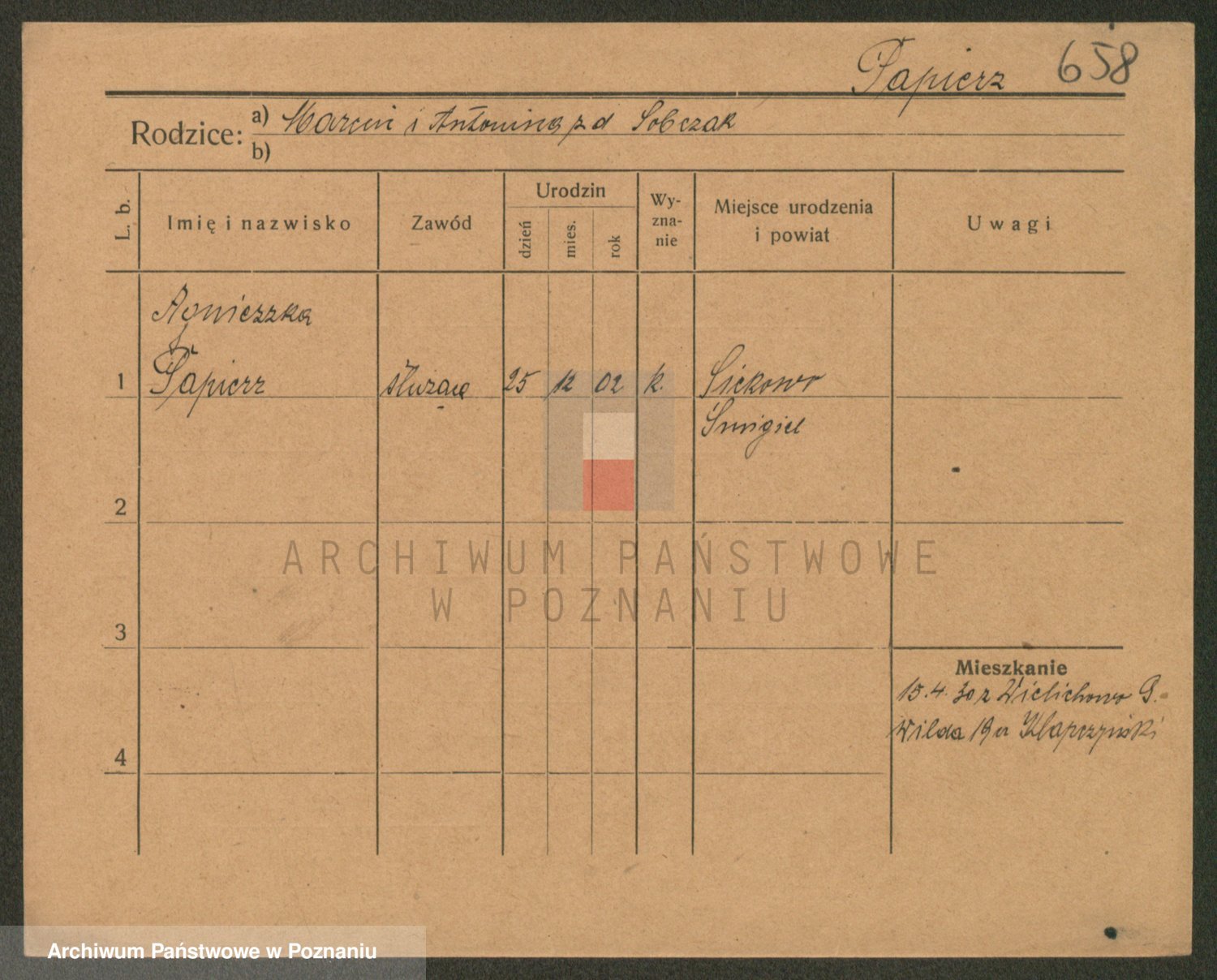 Podgląd karty osobowej dostępny jest po kliknięciu na nazwisko lub ikonkę karty. Można dokonywać powiększenia (ikony na górze) lub przechodzić między kolejnymi skanami (strzałki po bokach).