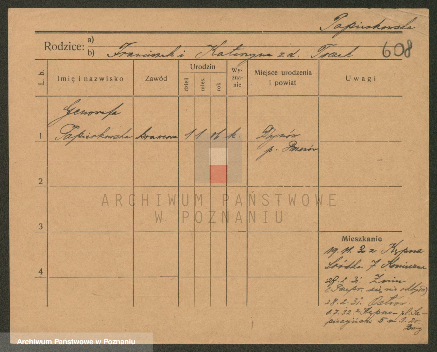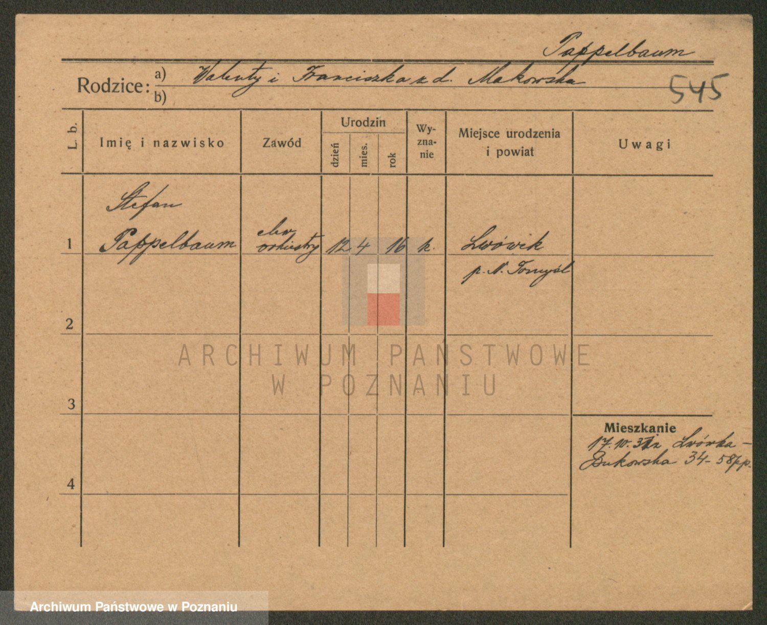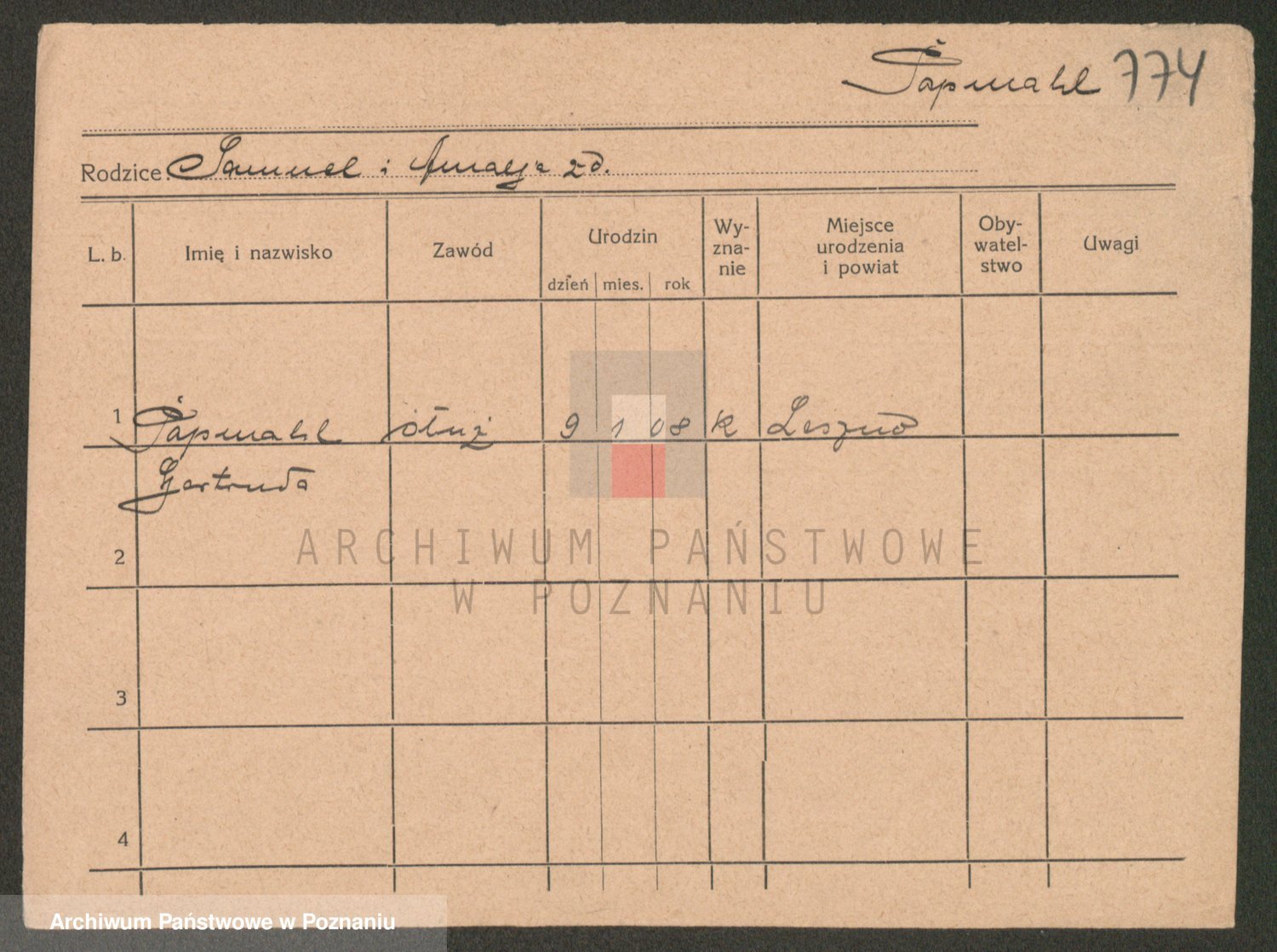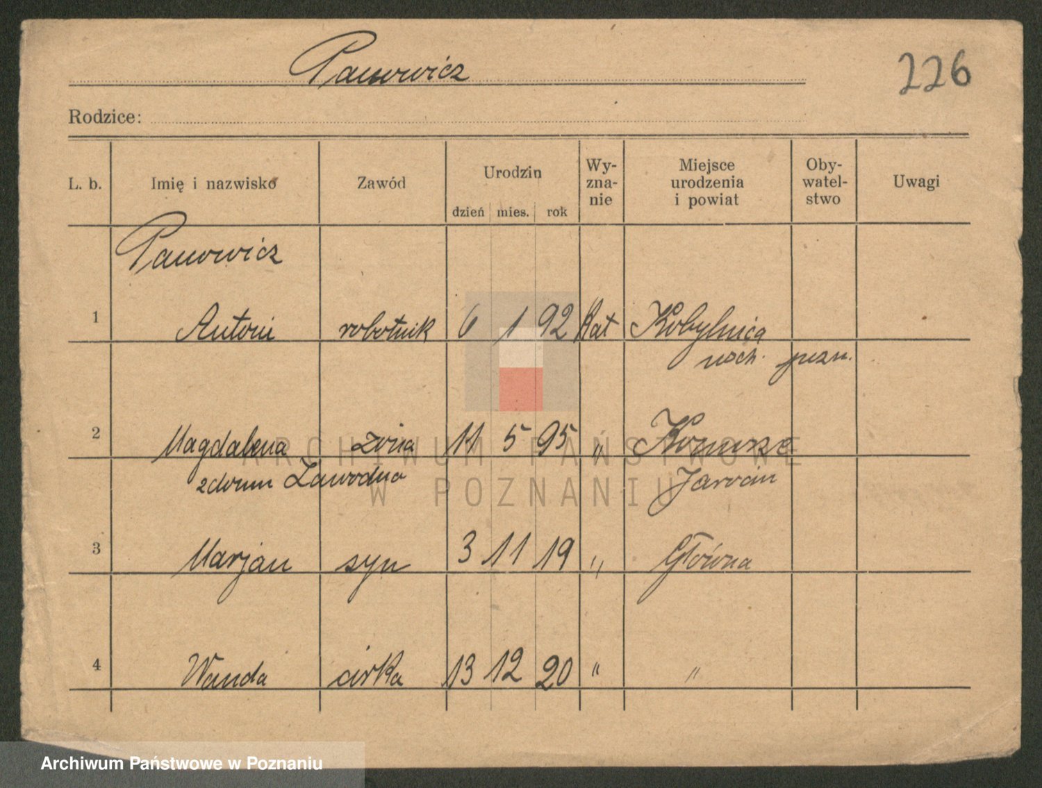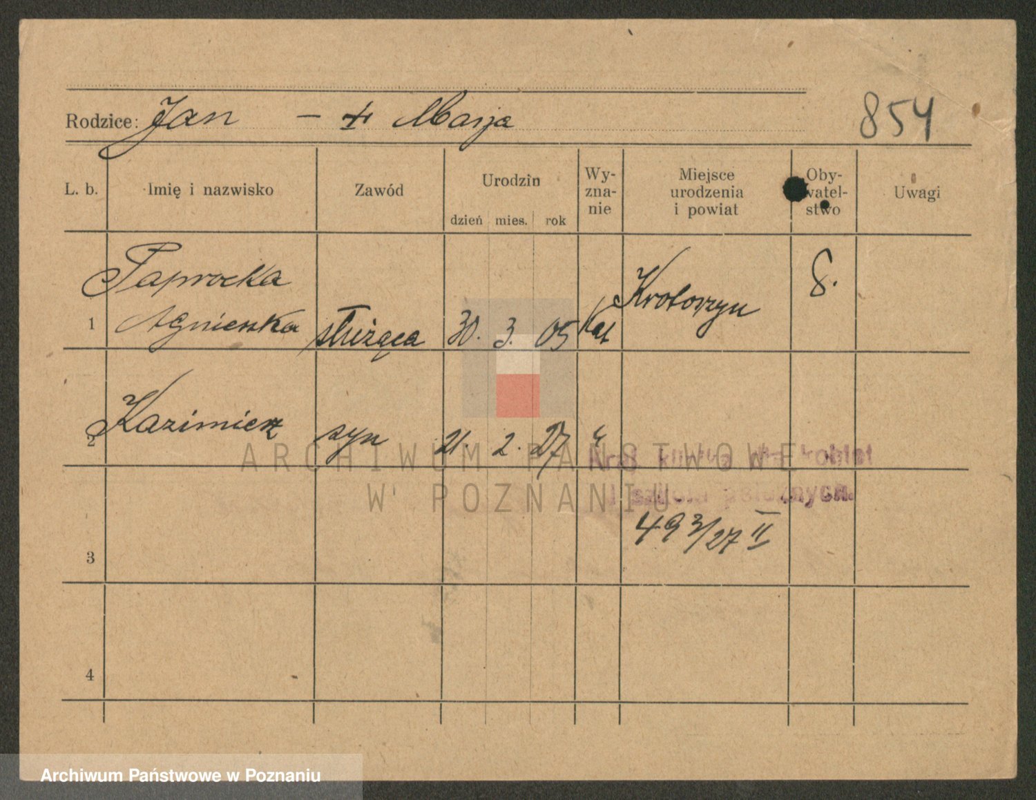 Podgląd karty osobowej dostępny jest po kliknięciu na nazwisko lub ikonkę karty. Można dokonywać powiększenia (ikony na górze) lub przechodzić między kolejnymi skanami (strzałki po bokach).