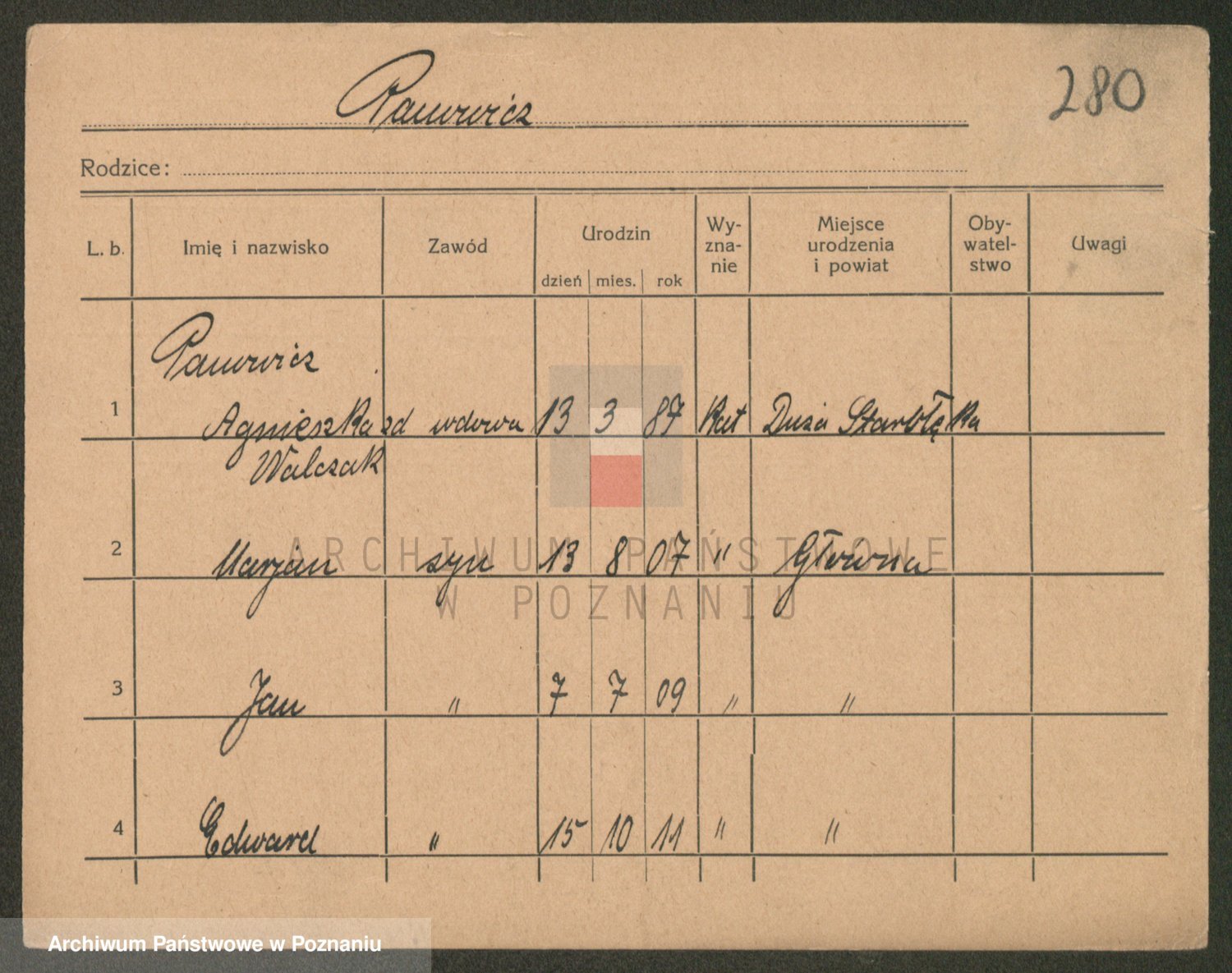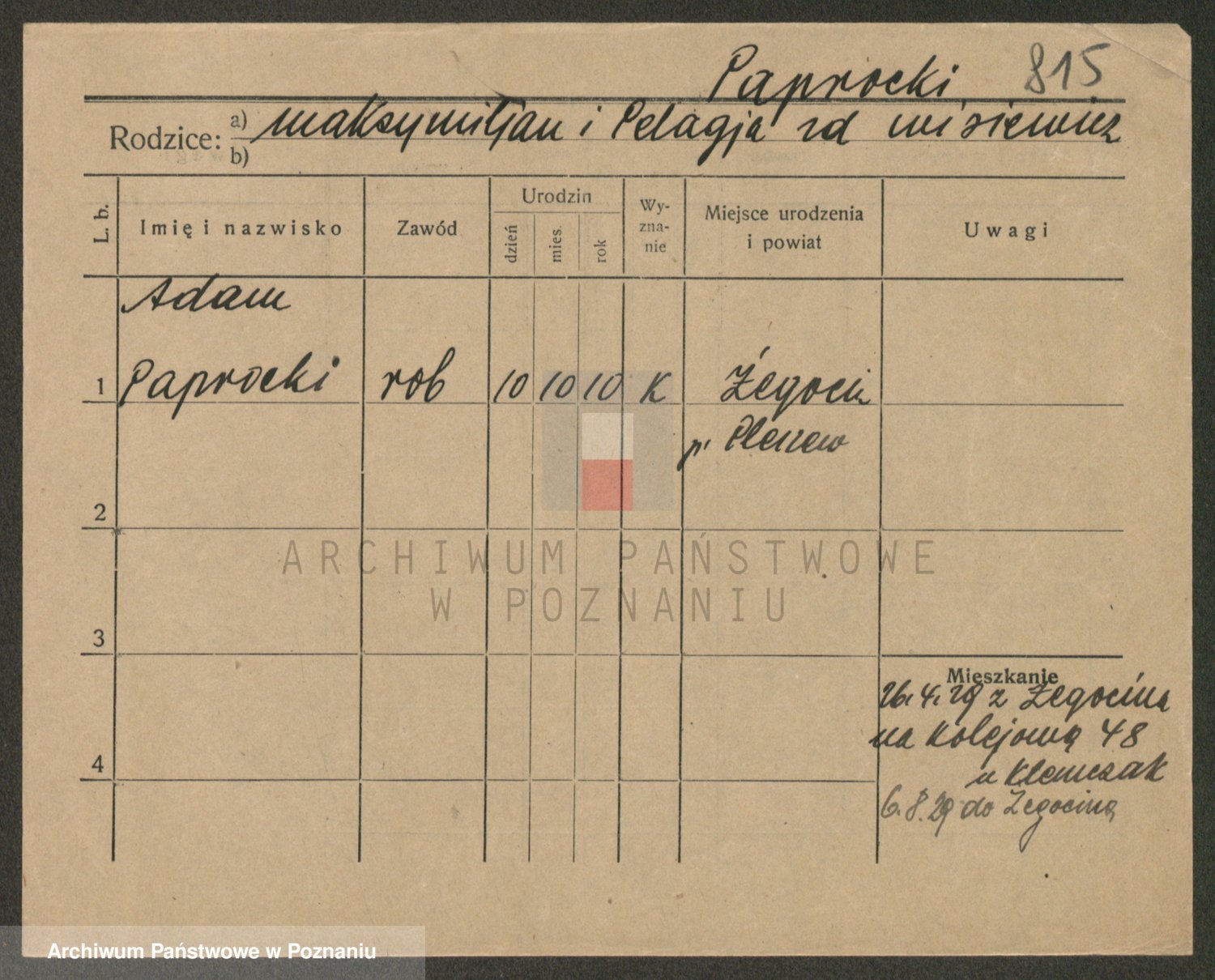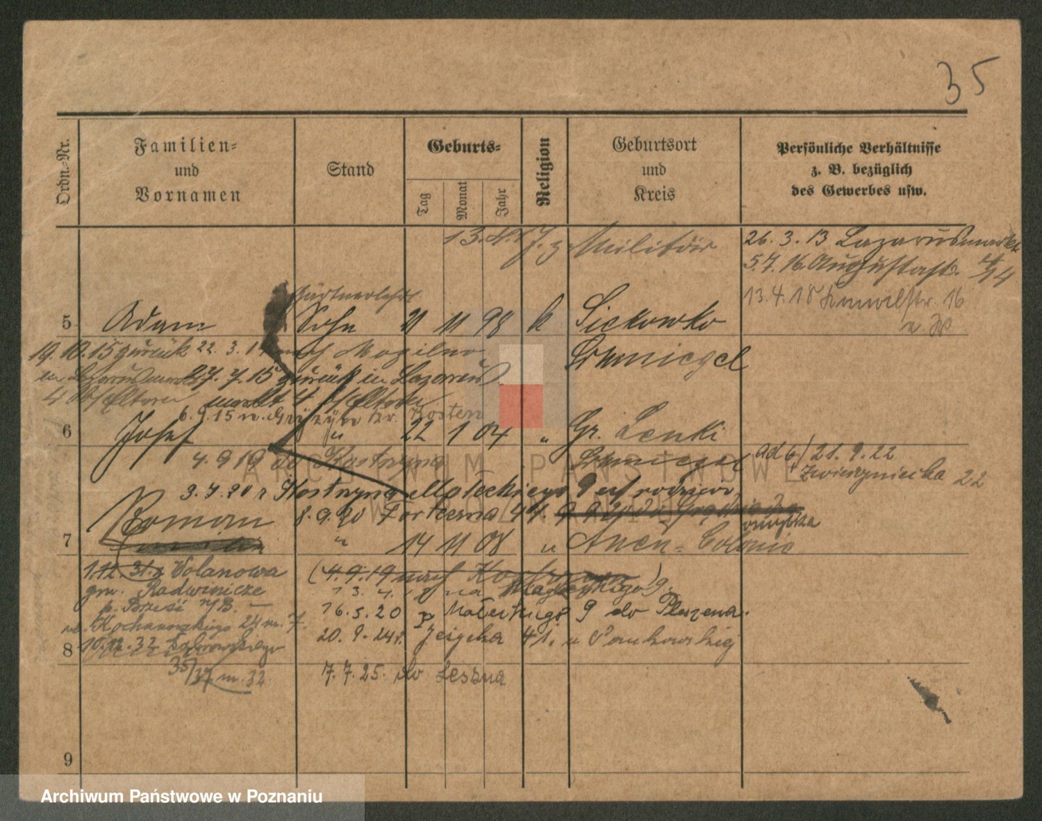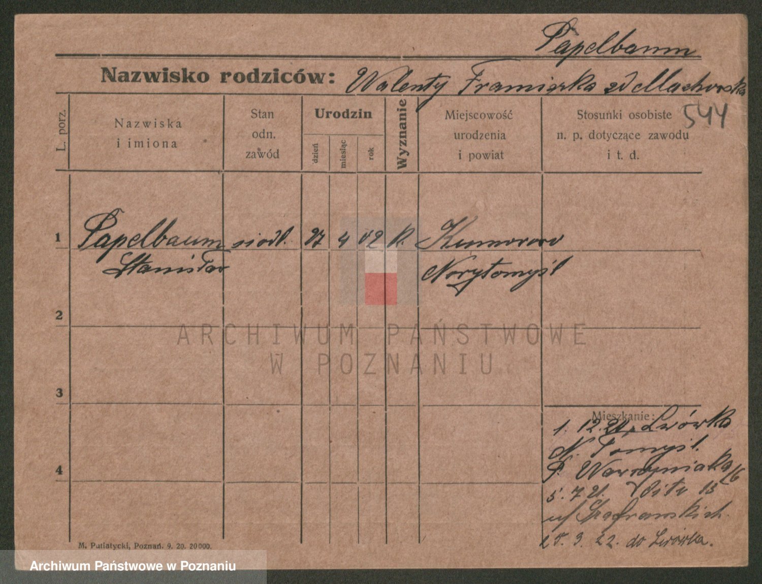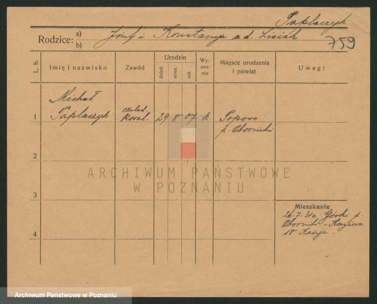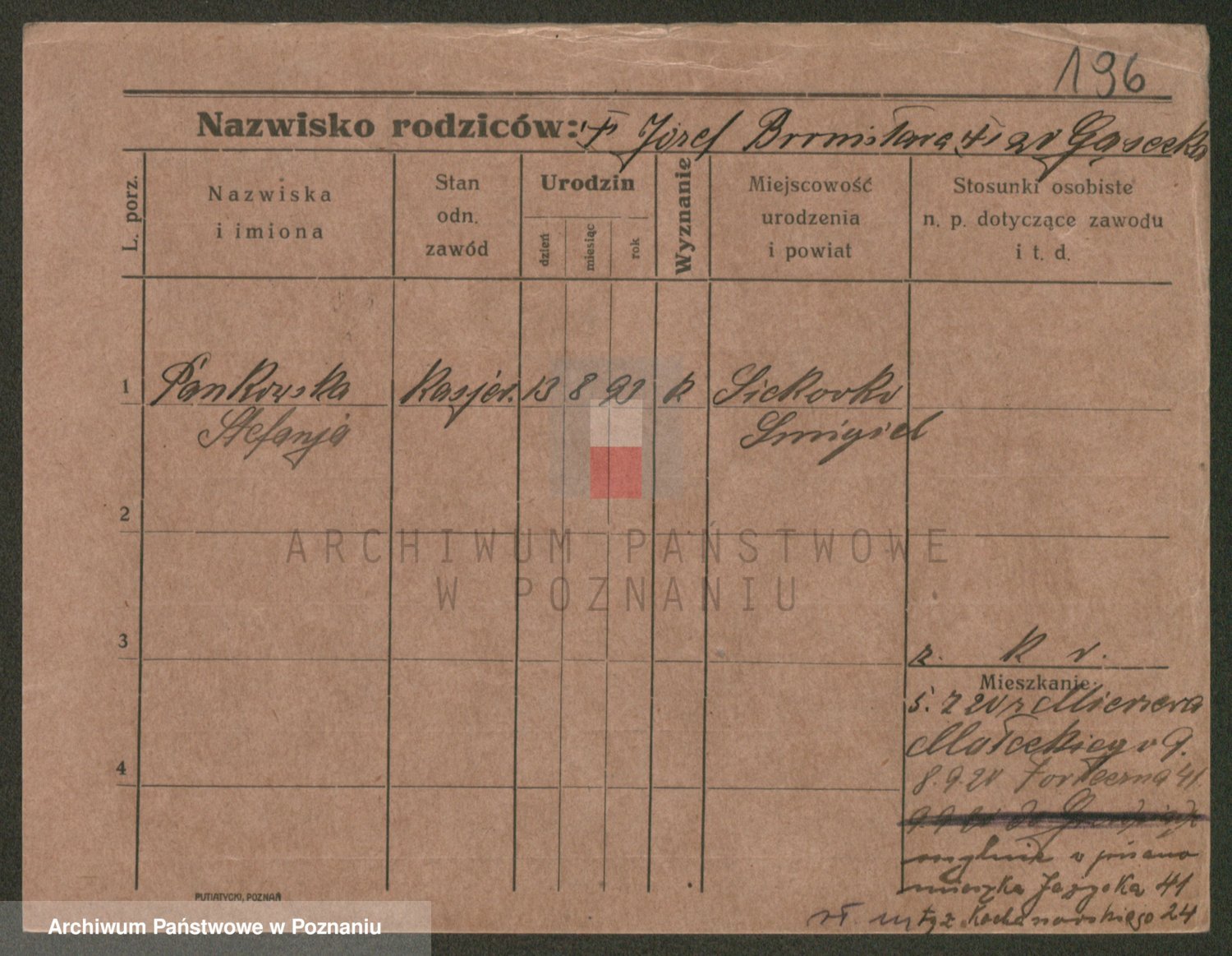 Podgląd karty osobowej dostępny jest po kliknięciu na nazwisko lub ikonkę karty. Można dokonywać powiększenia (ikony na górze) lub przechodzić między kolejnymi skanami (strzałki po bokach).