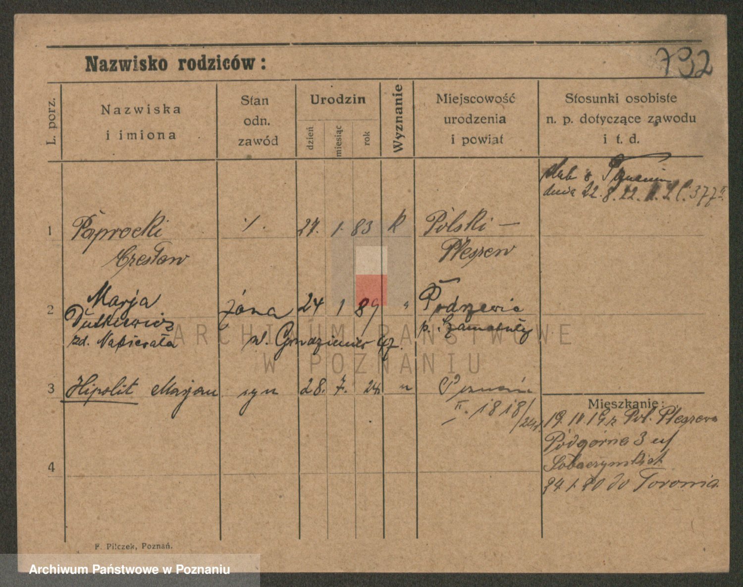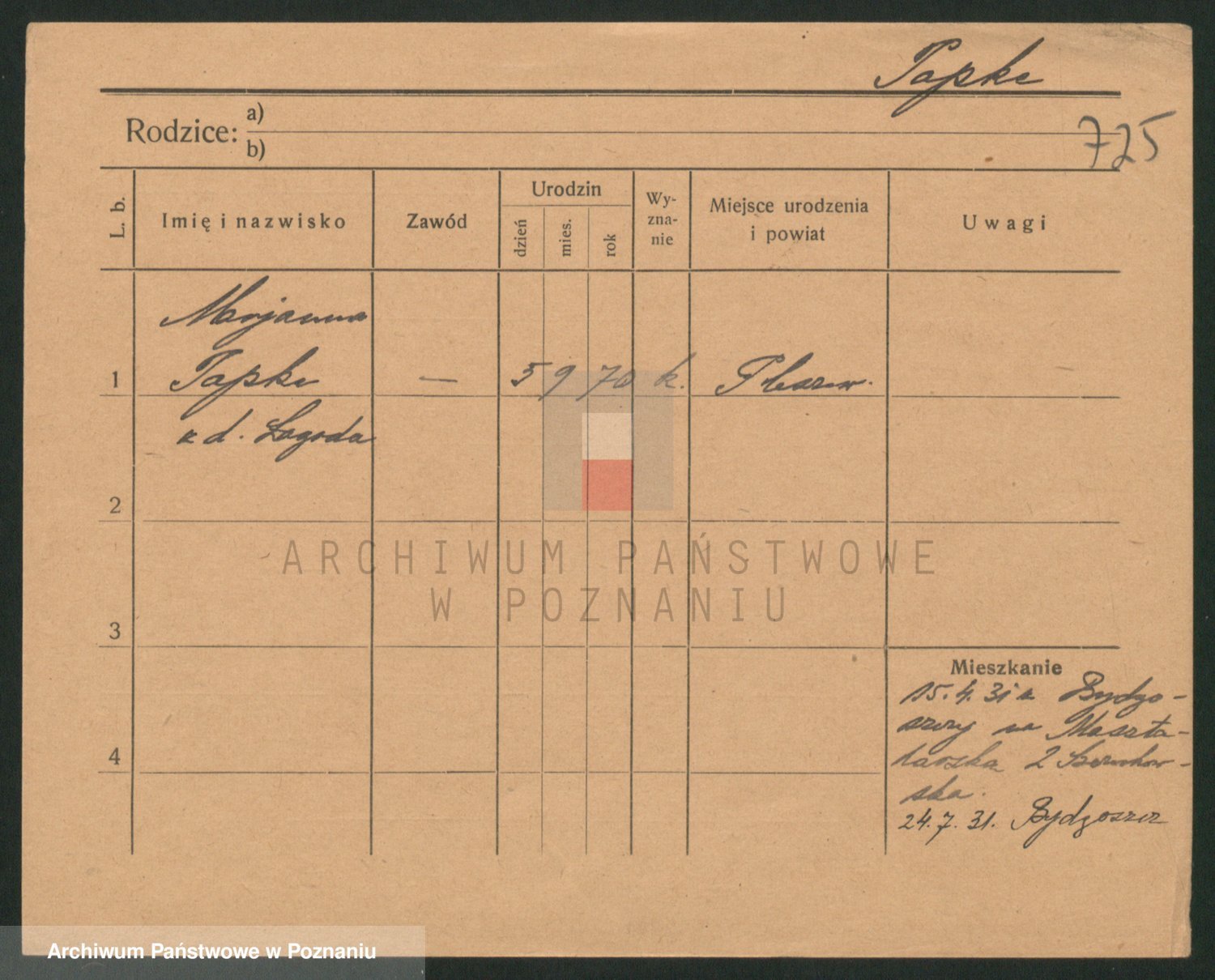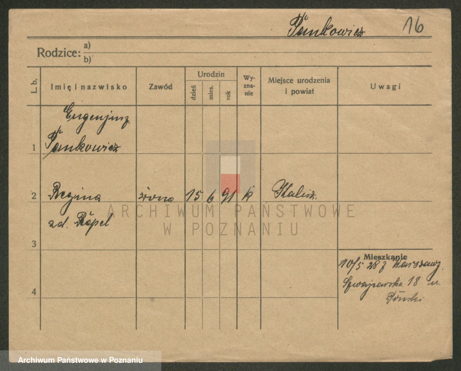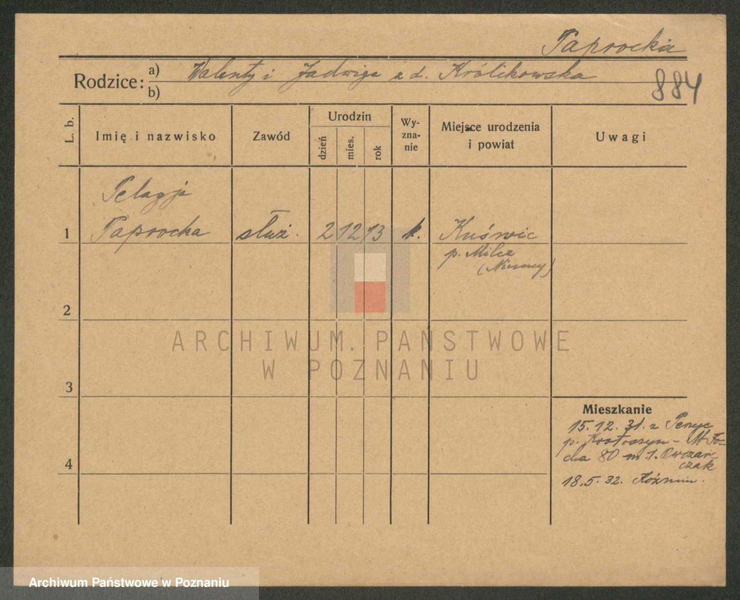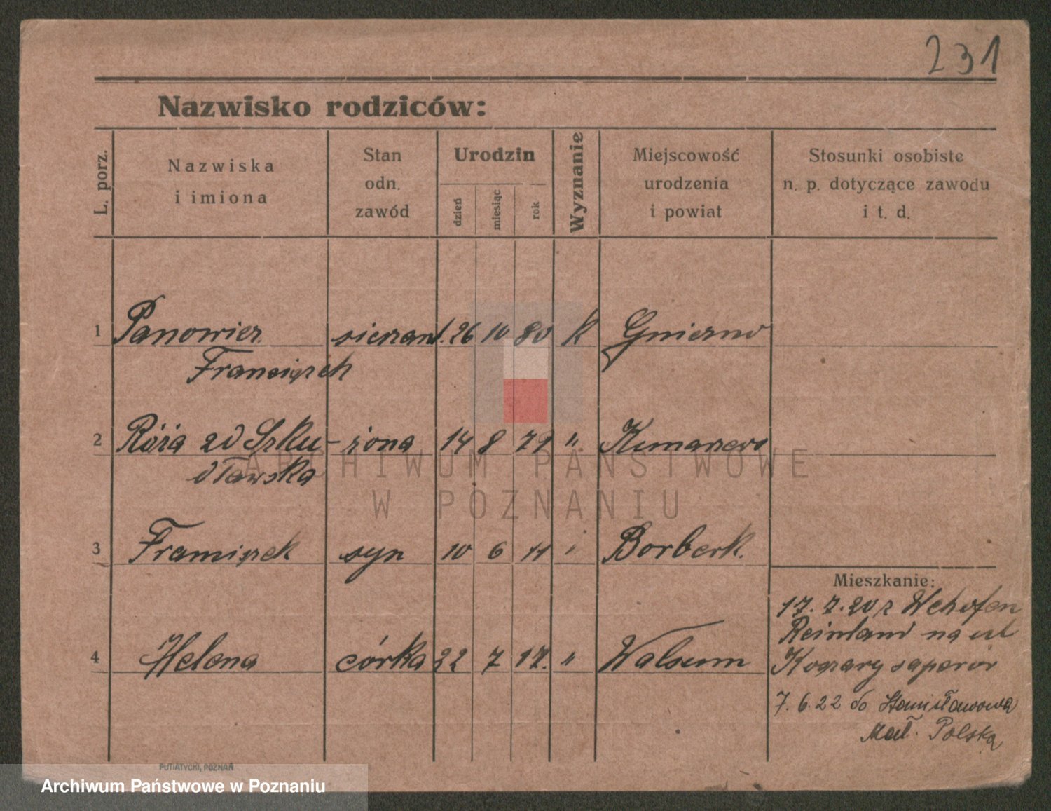 Podgląd karty osobowej dostępny jest po kliknięciu na nazwisko lub ikonkę karty. Można dokonywać powiększenia (ikony na górze) lub przechodzić między kolejnymi skanami (strzałki po bokach).