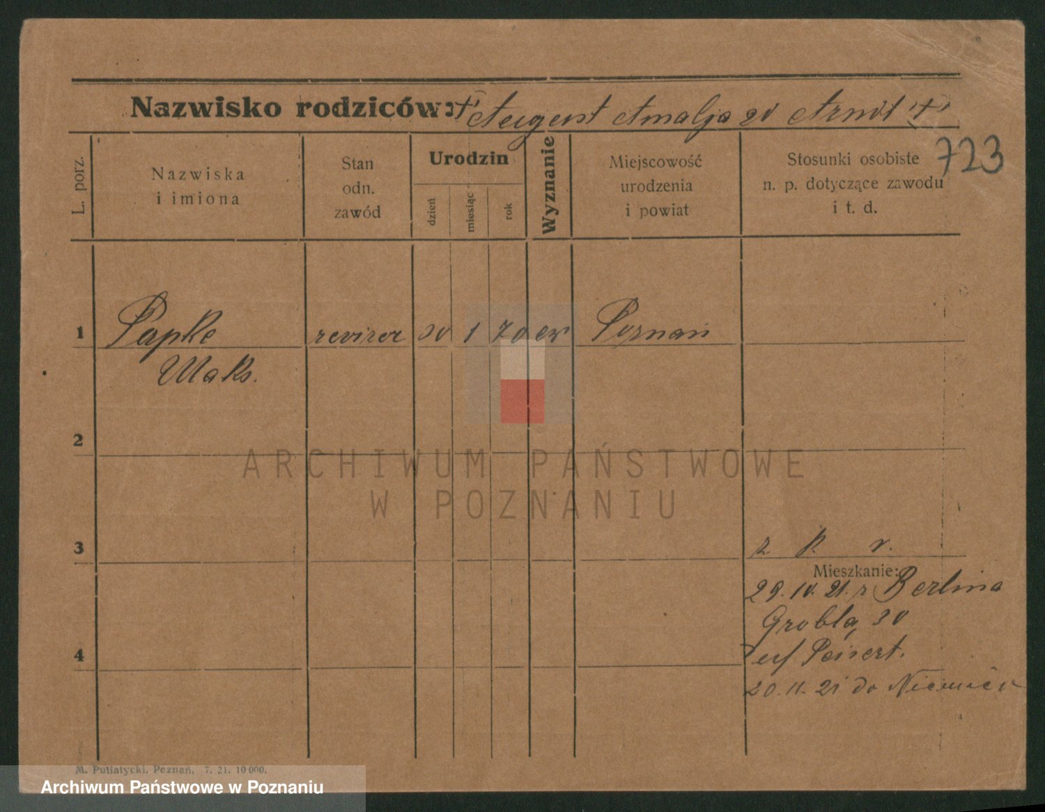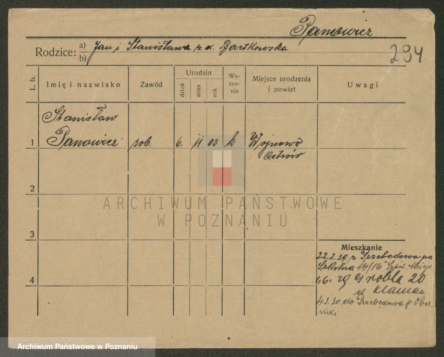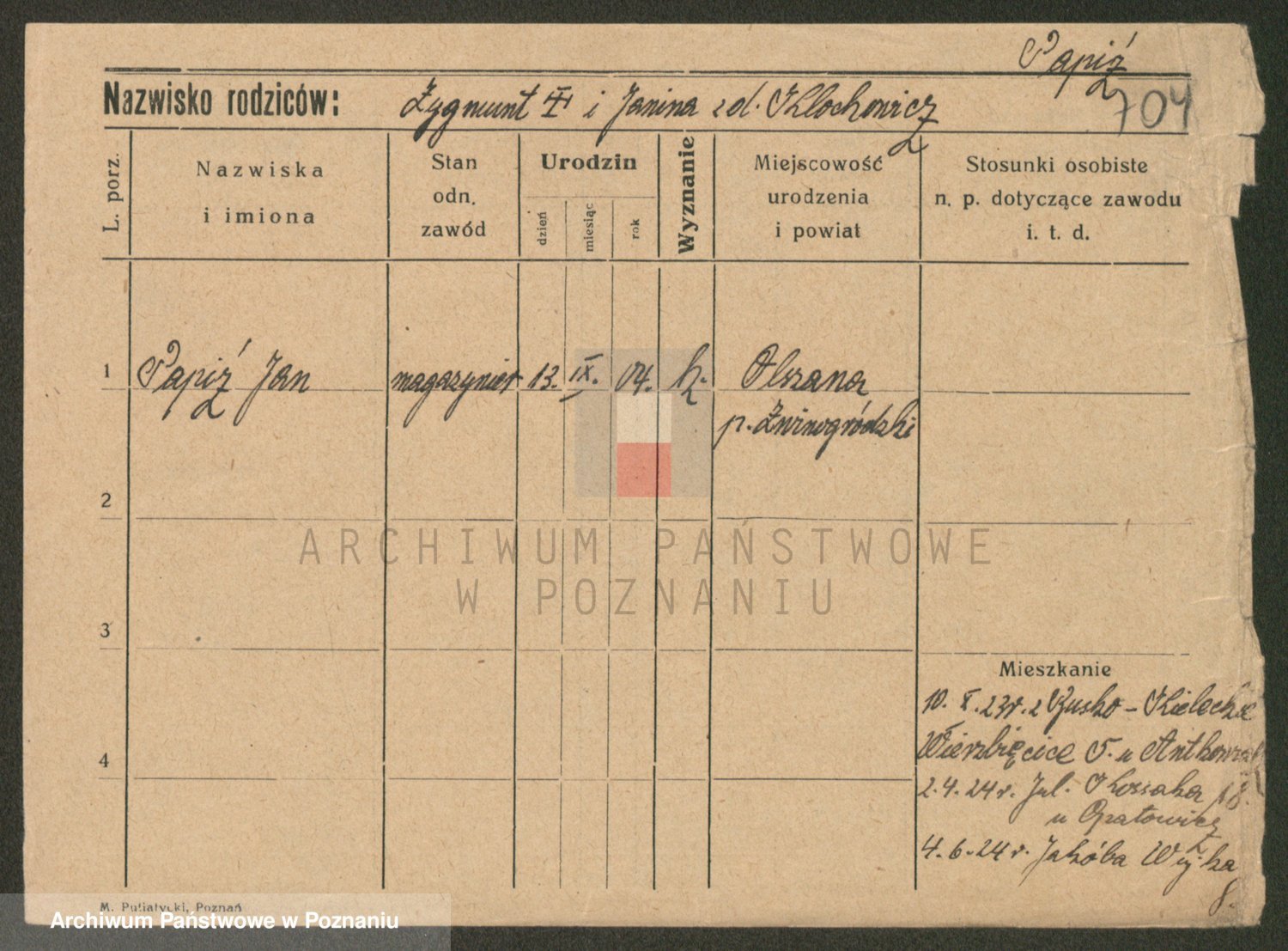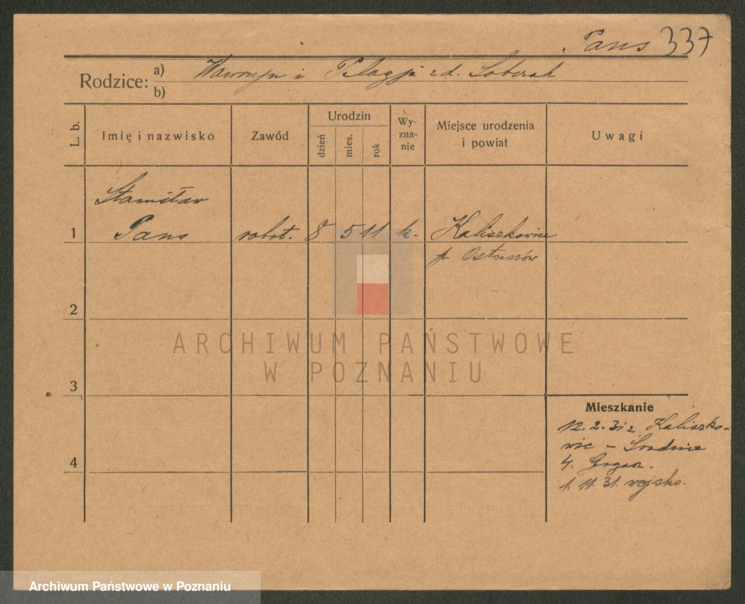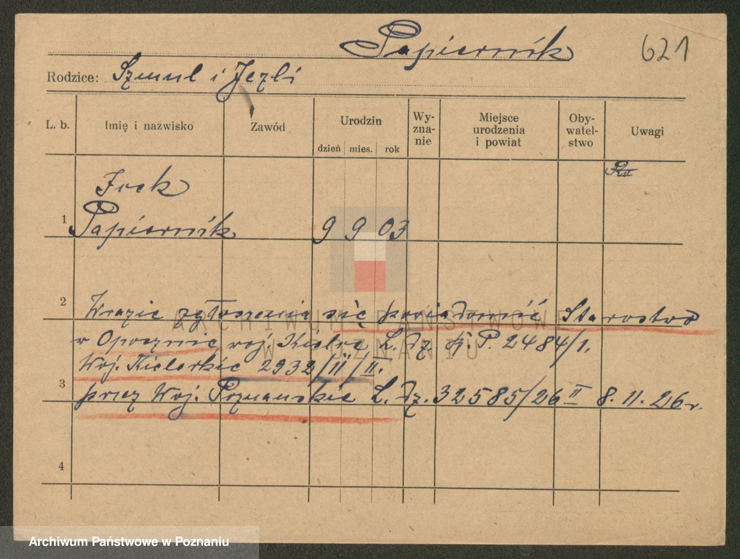 Podgląd karty osobowej dostępny jest po kliknięciu na nazwisko lub ikonkę karty. Można dokonywać powiększenia (ikony na górze) lub przechodzić między kolejnymi skanami (strzałki po bokach).