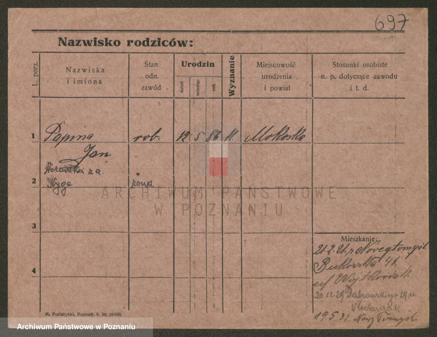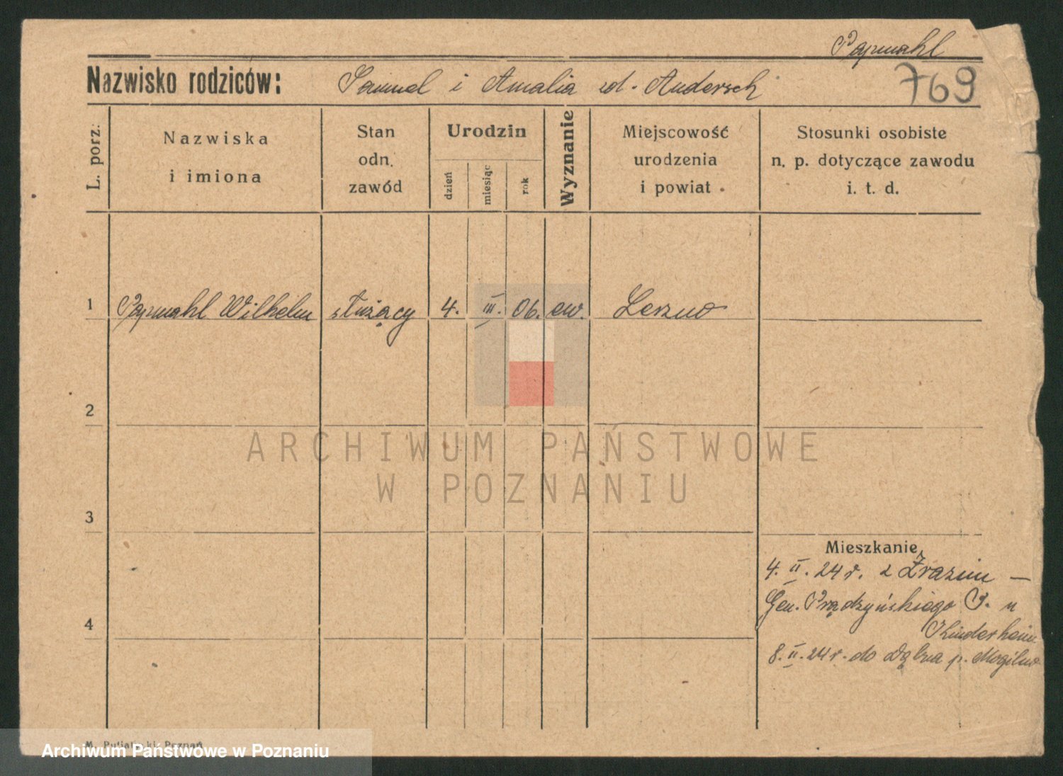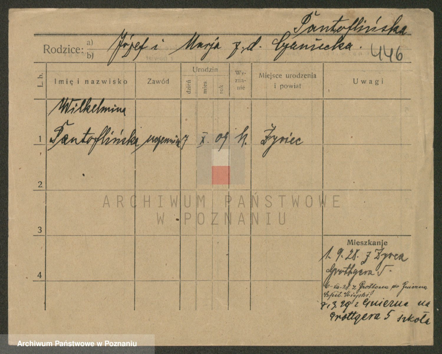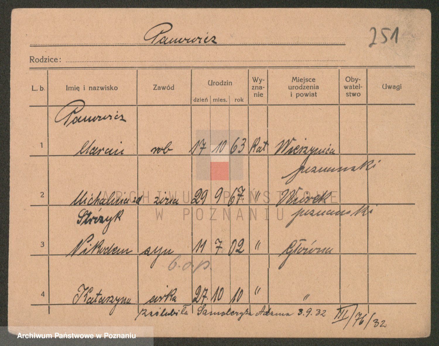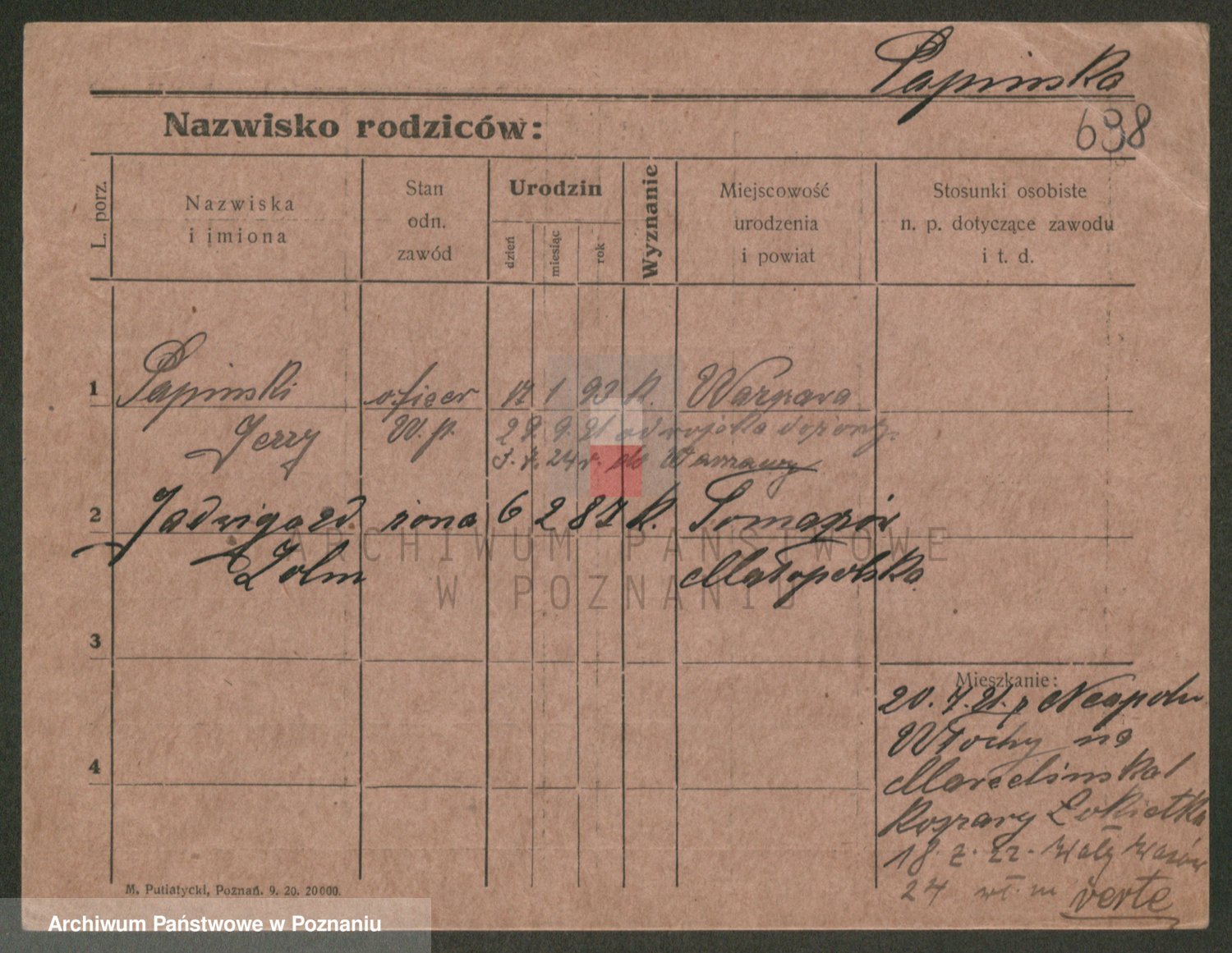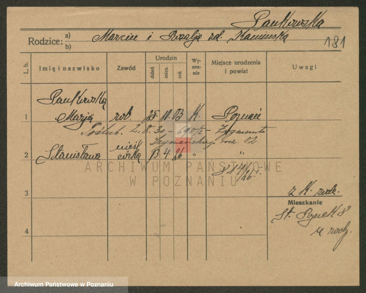 Podgląd karty osobowej dostępny jest po kliknięciu na nazwisko lub ikonkę karty. Można dokonywać powiększenia (ikony na górze) lub przechodzić między kolejnymi skanami (strzałki po bokach).