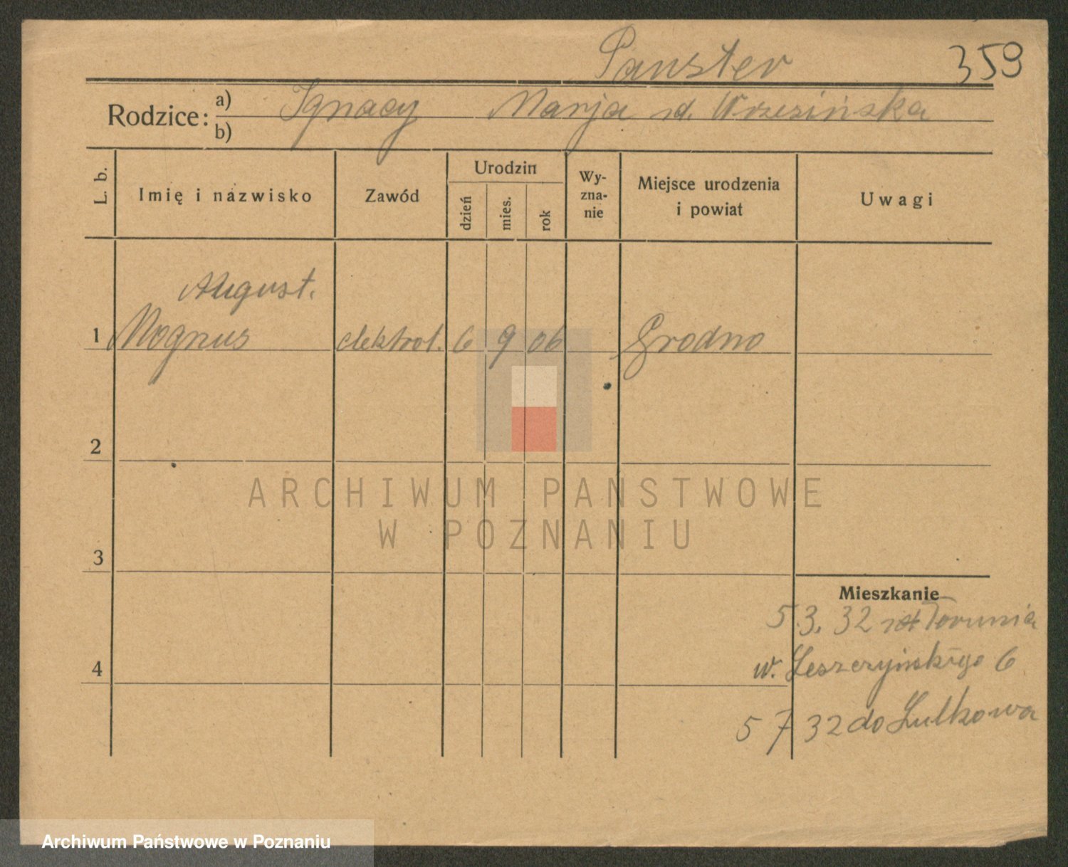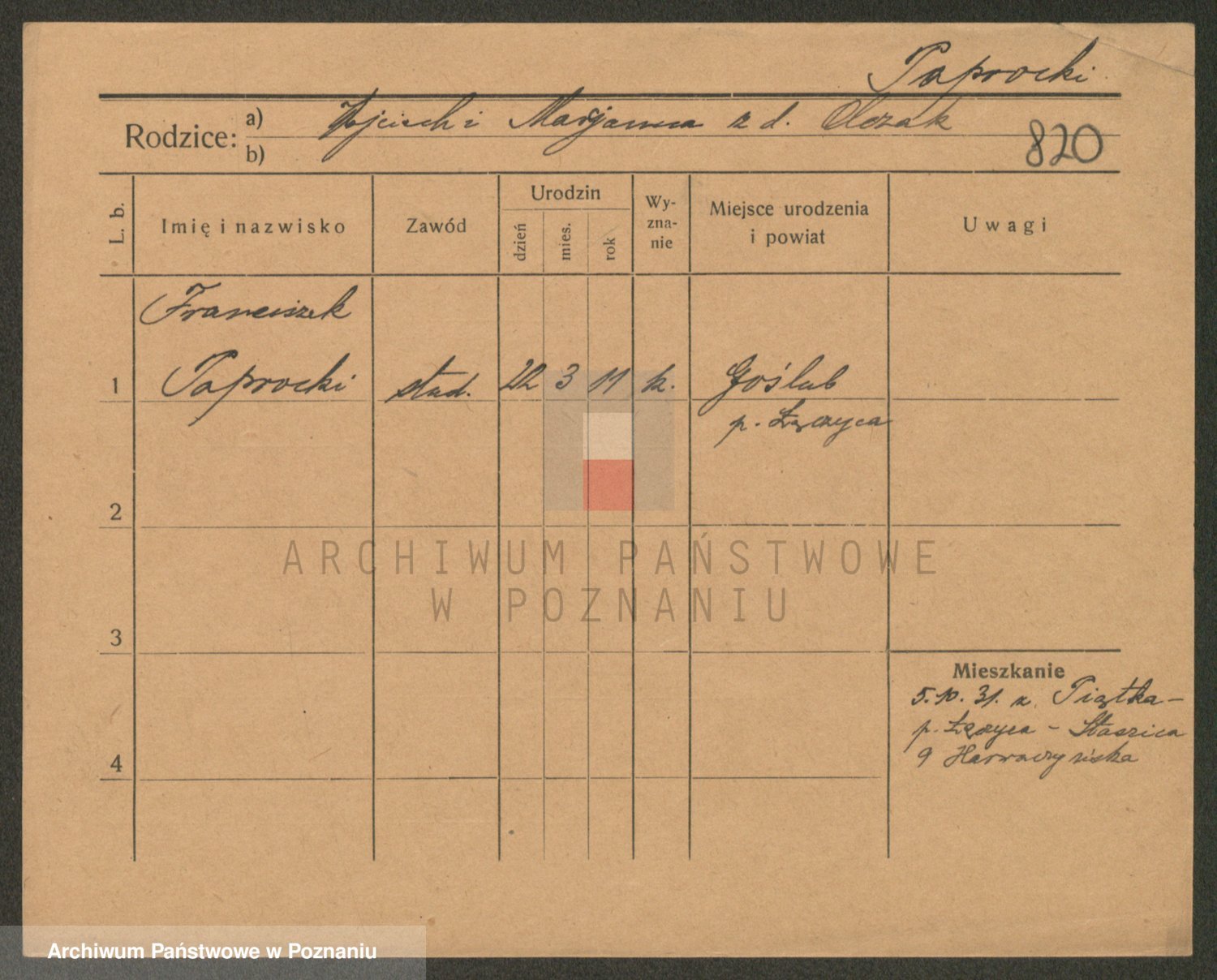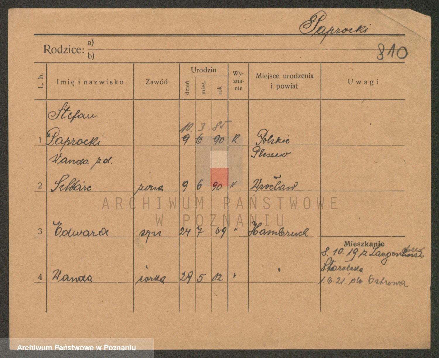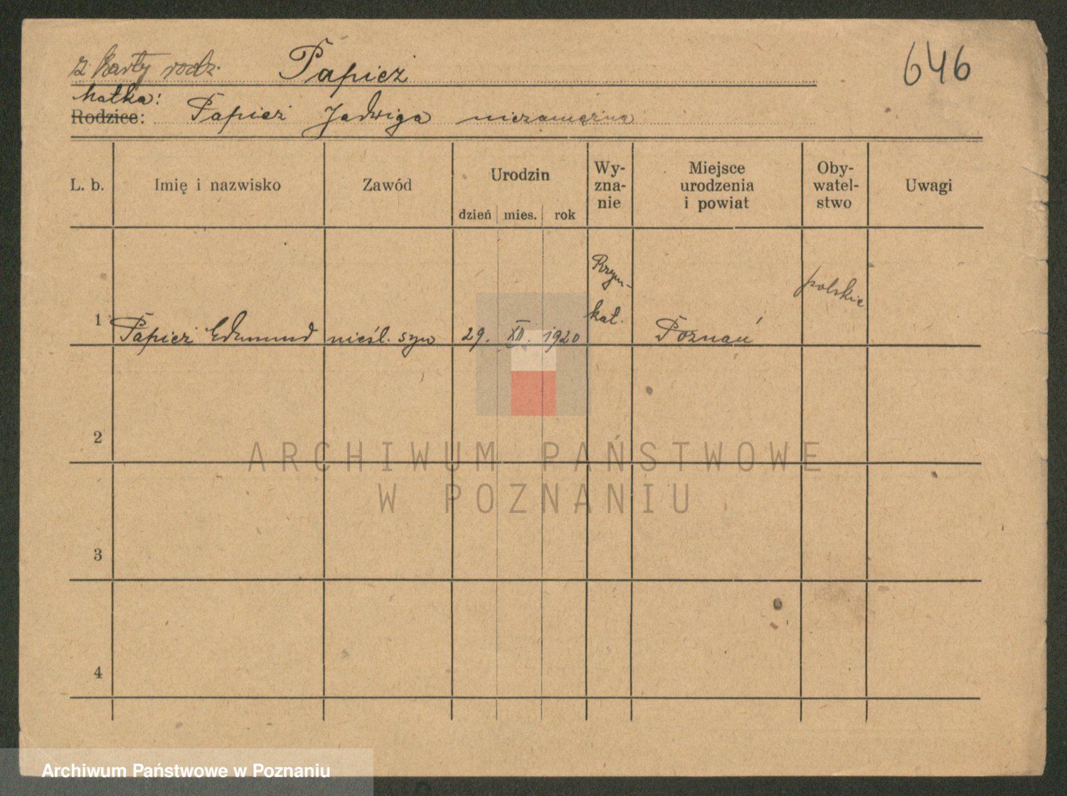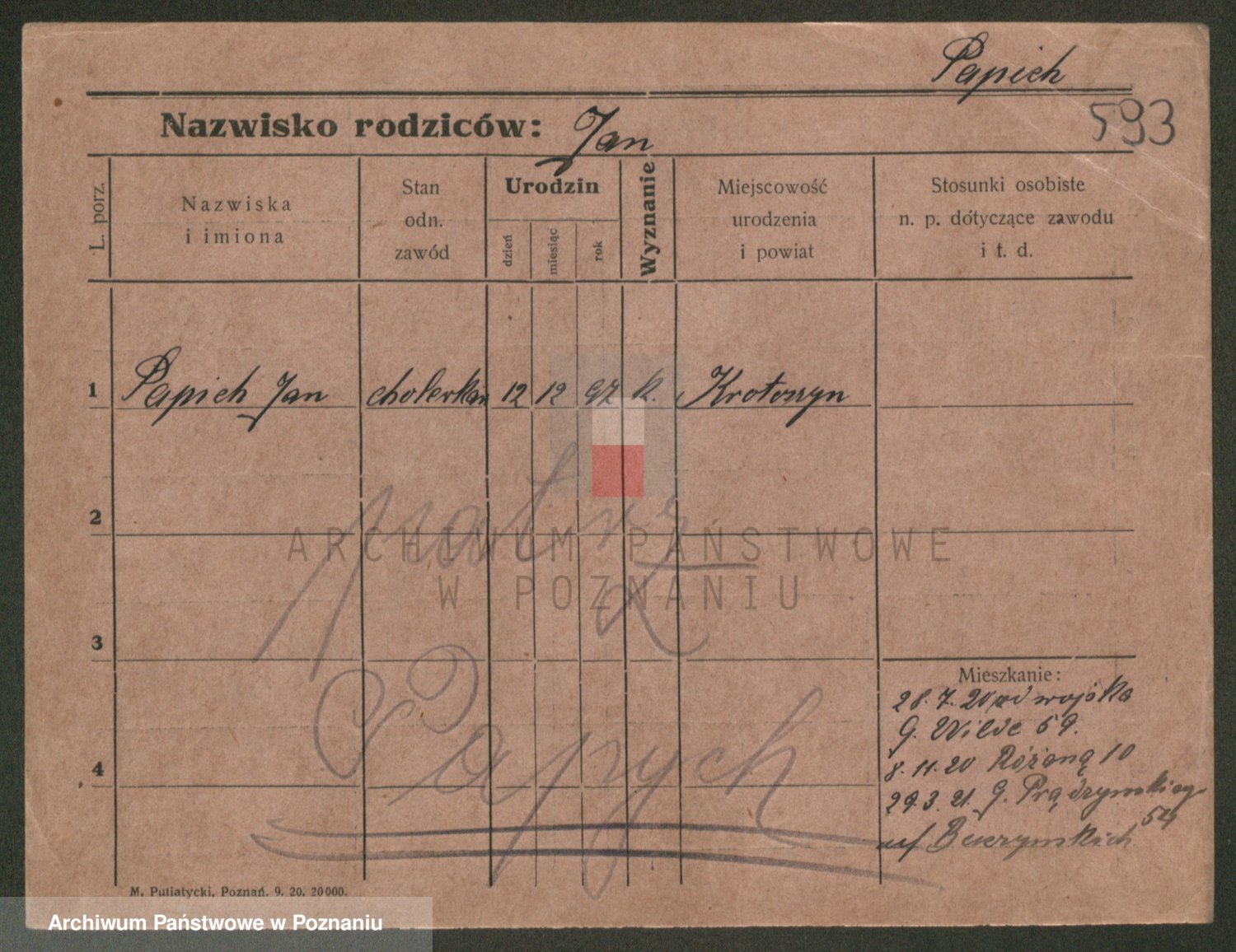 Podgląd karty osobowej dostępny jest po kliknięciu na nazwisko lub ikonkę karty. Można dokonywać powiększenia (ikony na górze) lub przechodzić między kolejnymi skanami (strzałki po bokach).