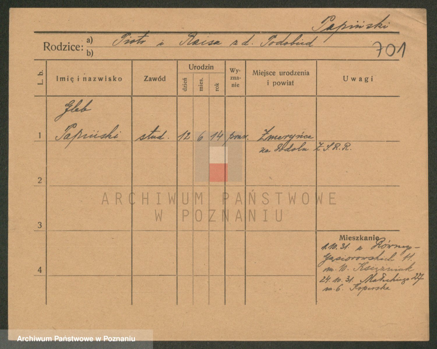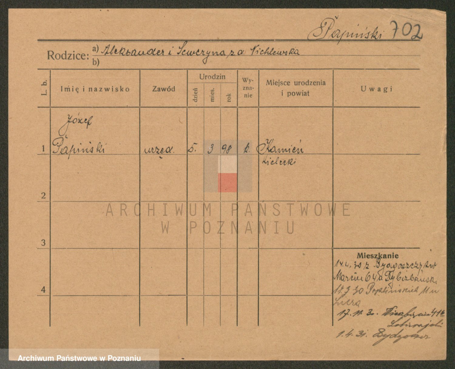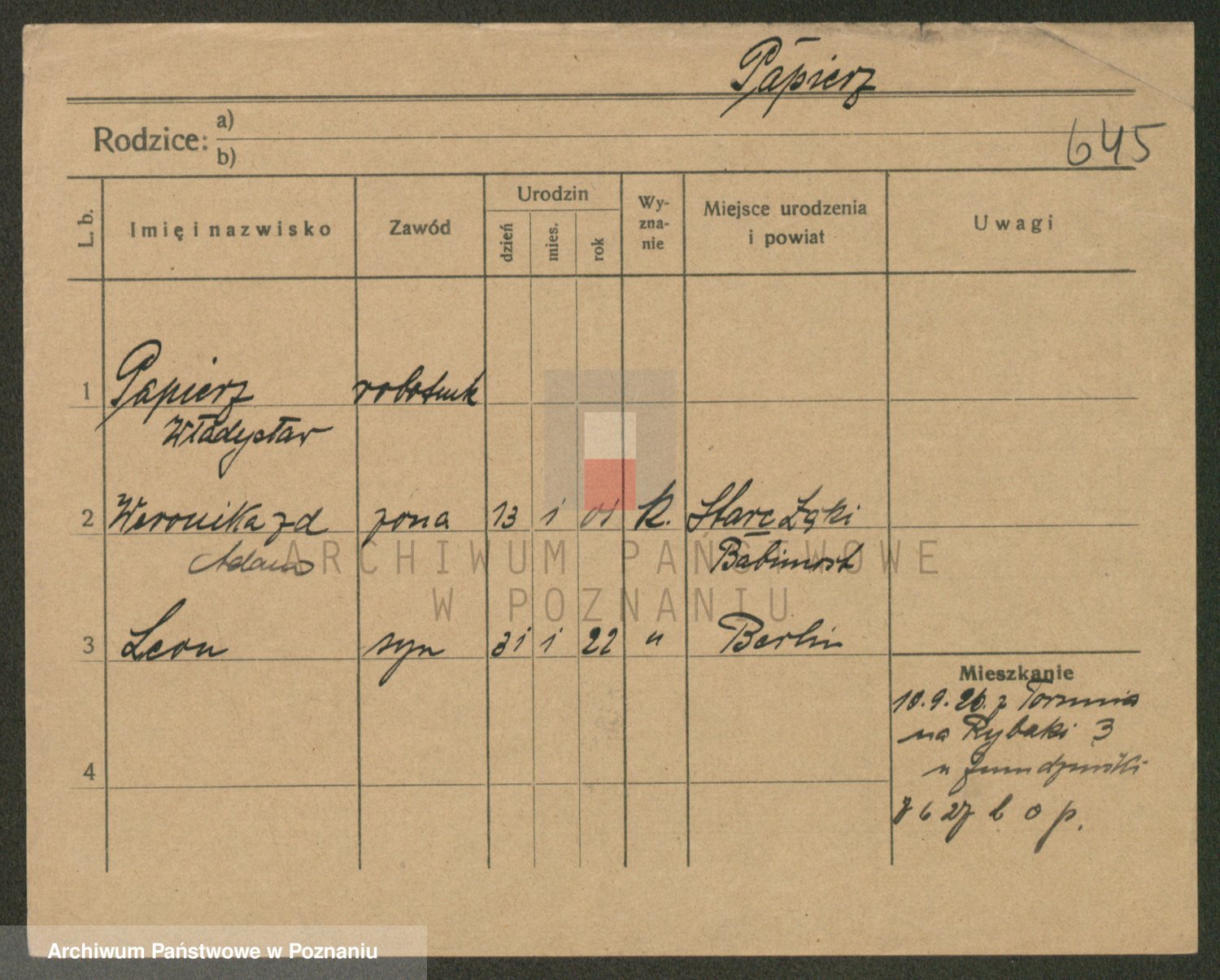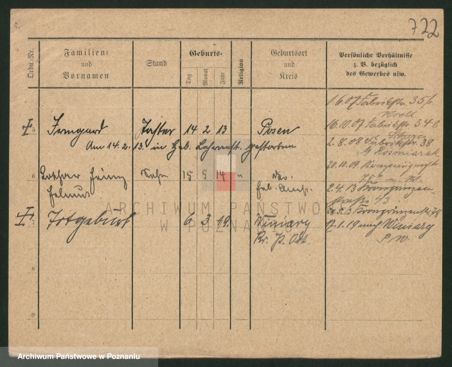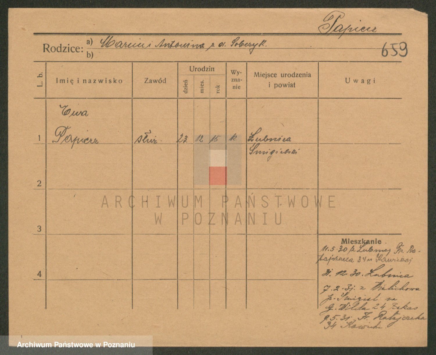 Podgląd karty osobowej dostępny jest po kliknięciu na nazwisko lub ikonkę karty. Można dokonywać powiększenia (ikony na górze) lub przechodzić między kolejnymi skanami (strzałki po bokach).