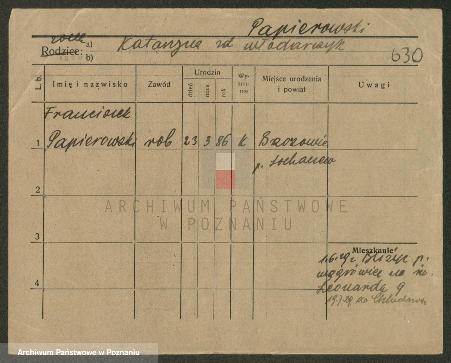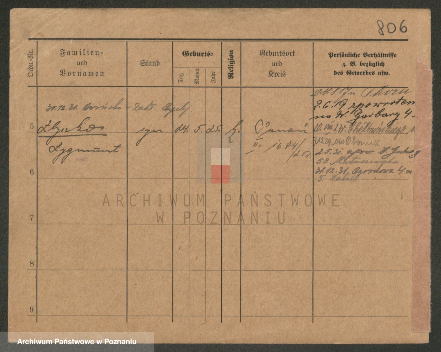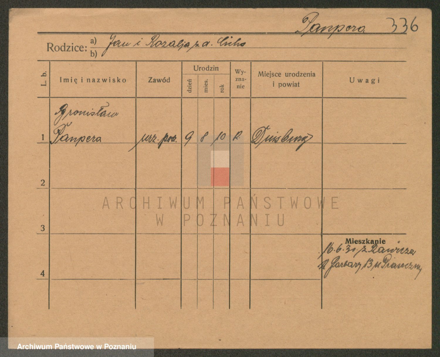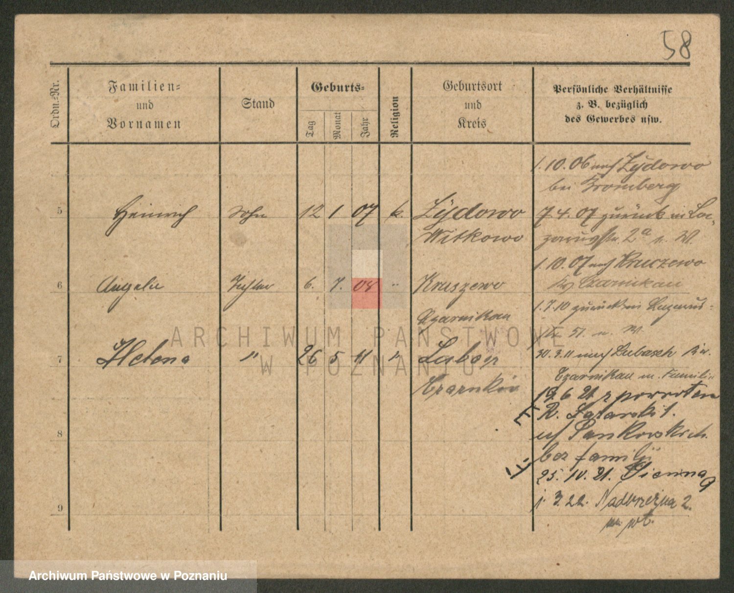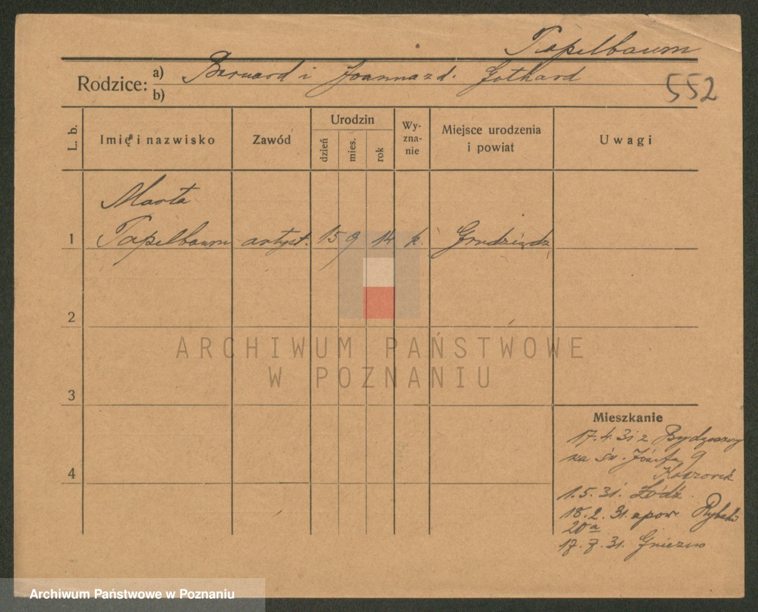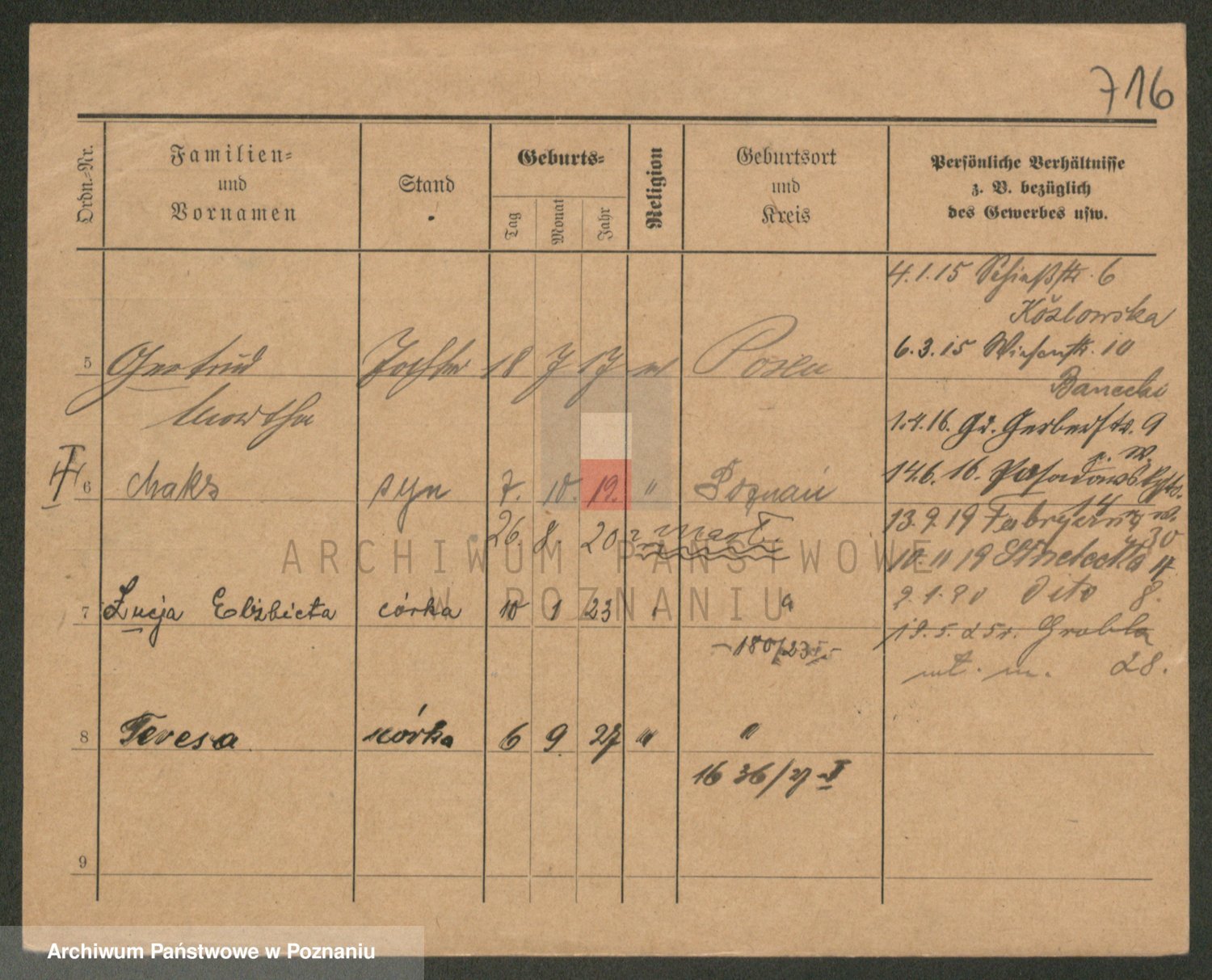 Podgląd karty osobowej dostępny jest po kliknięciu na nazwisko lub ikonkę karty. Można dokonywać powiększenia (ikony na górze) lub przechodzić między kolejnymi skanami (strzałki po bokach).