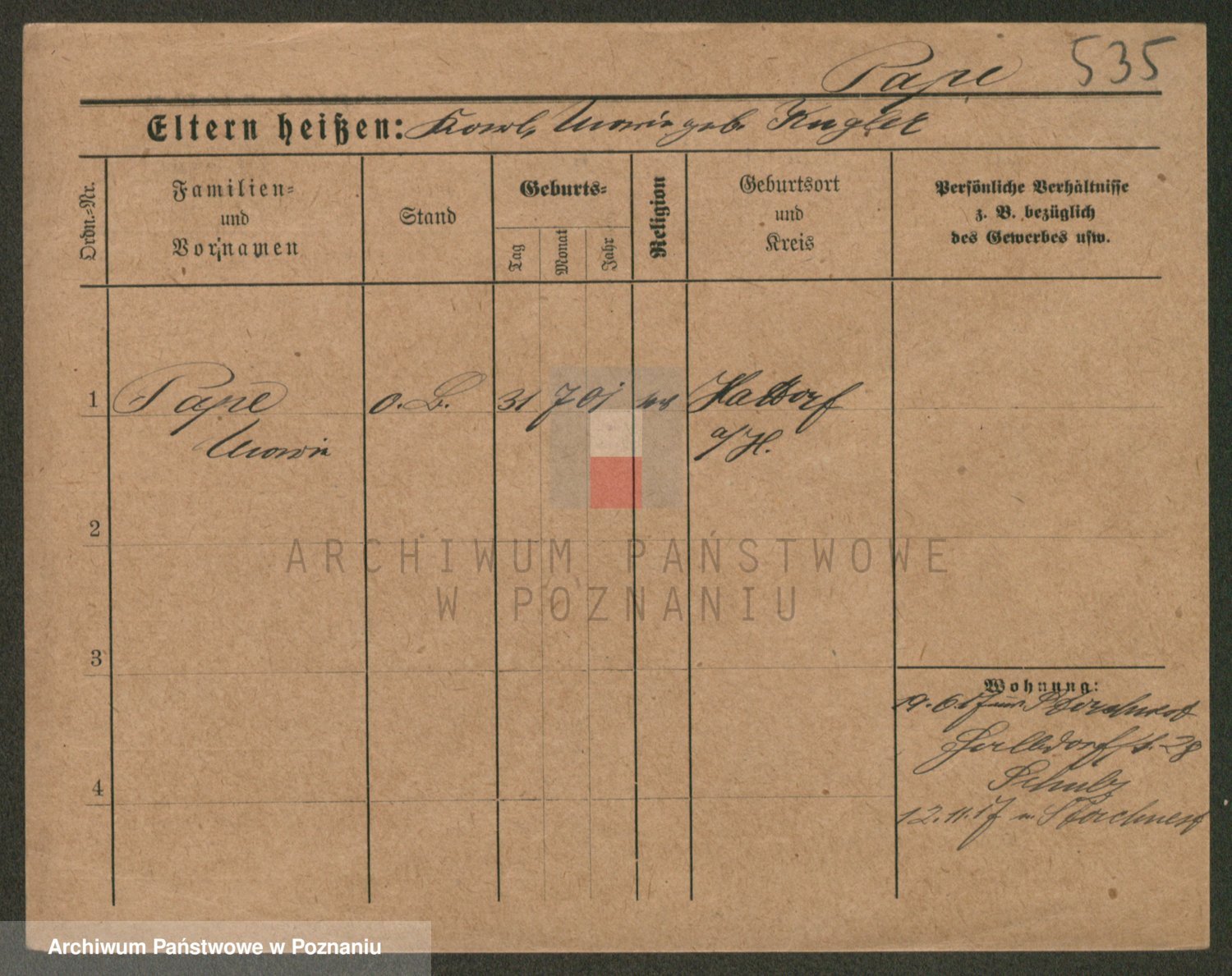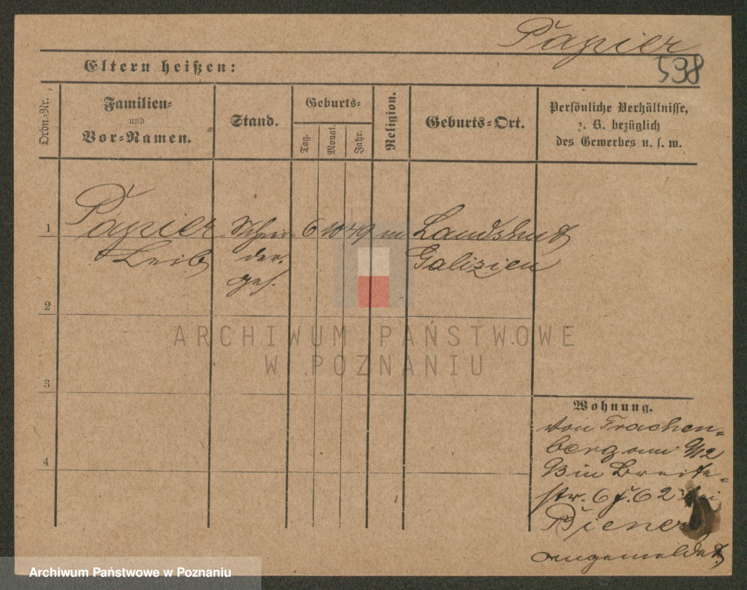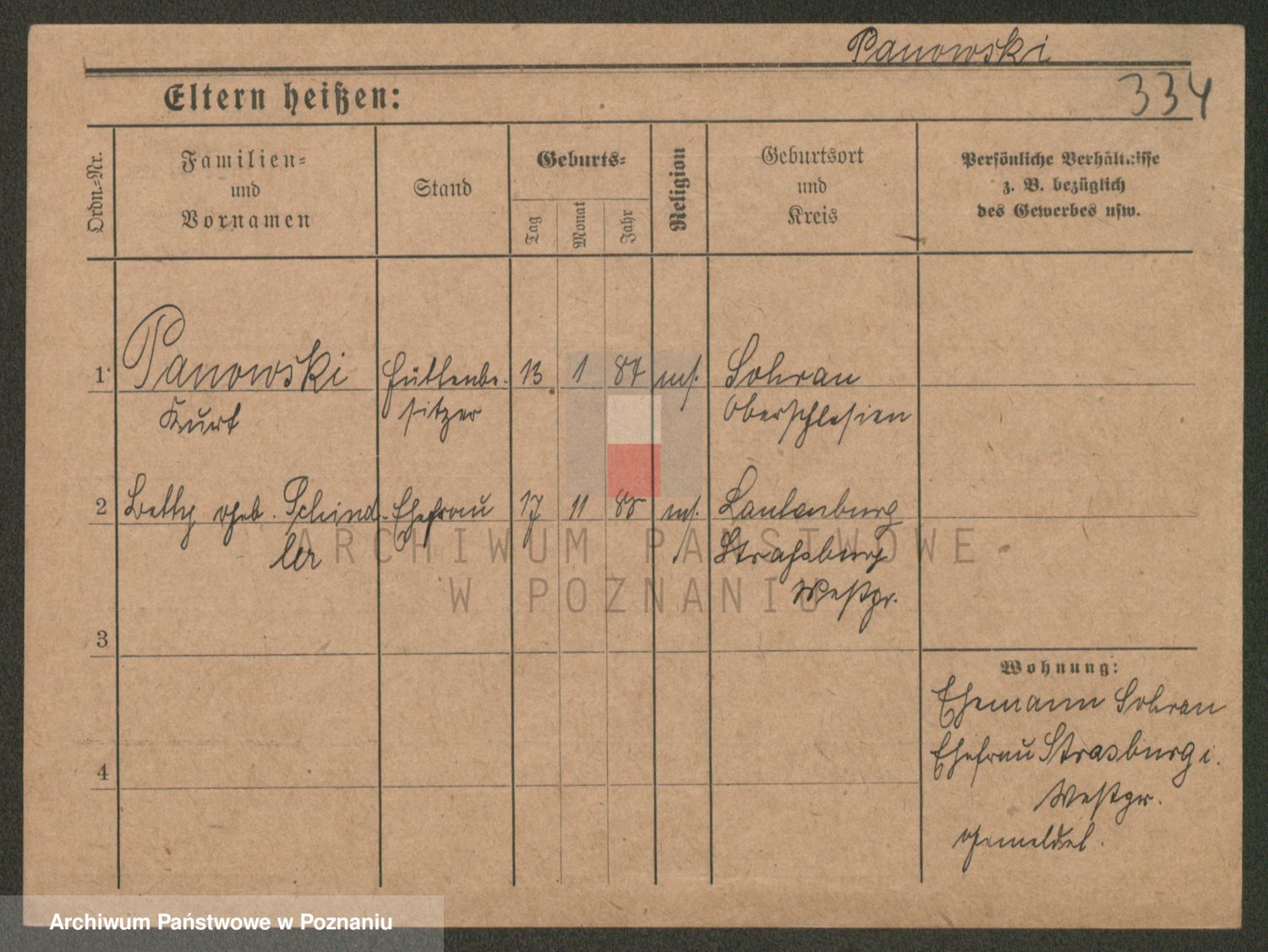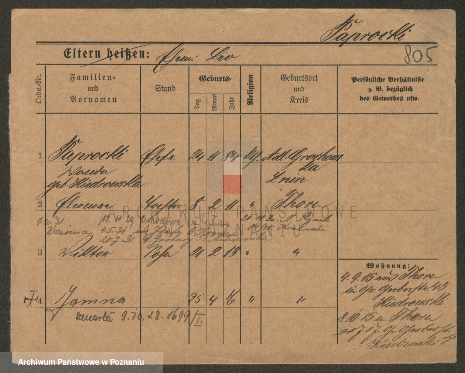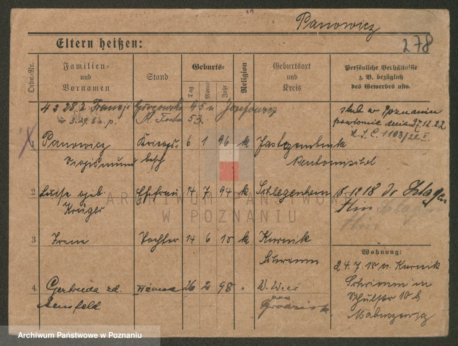 Podgląd karty osobowej dostępny jest po kliknięciu na nazwisko lub ikonkę karty. Można dokonywać powiększenia (ikony na górze) lub przechodzić między kolejnymi skanami (strzałki po bokach).