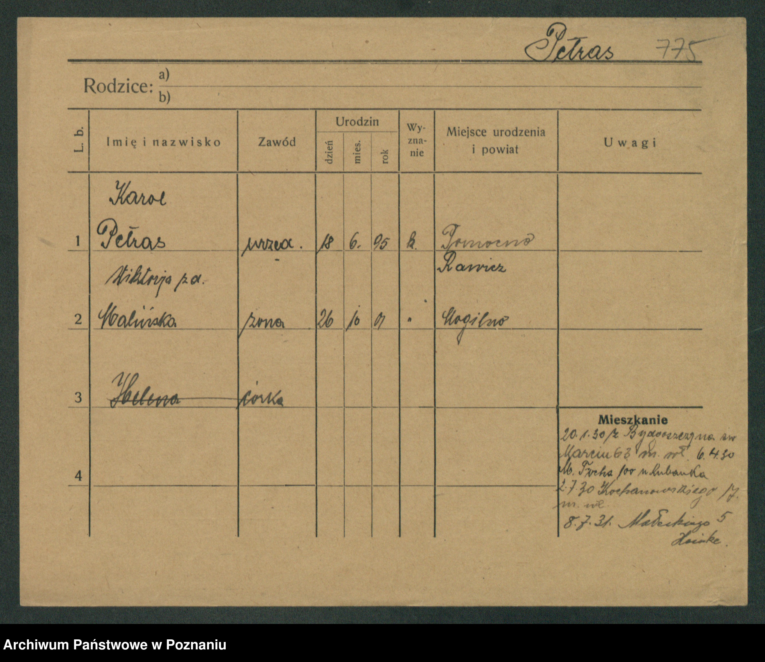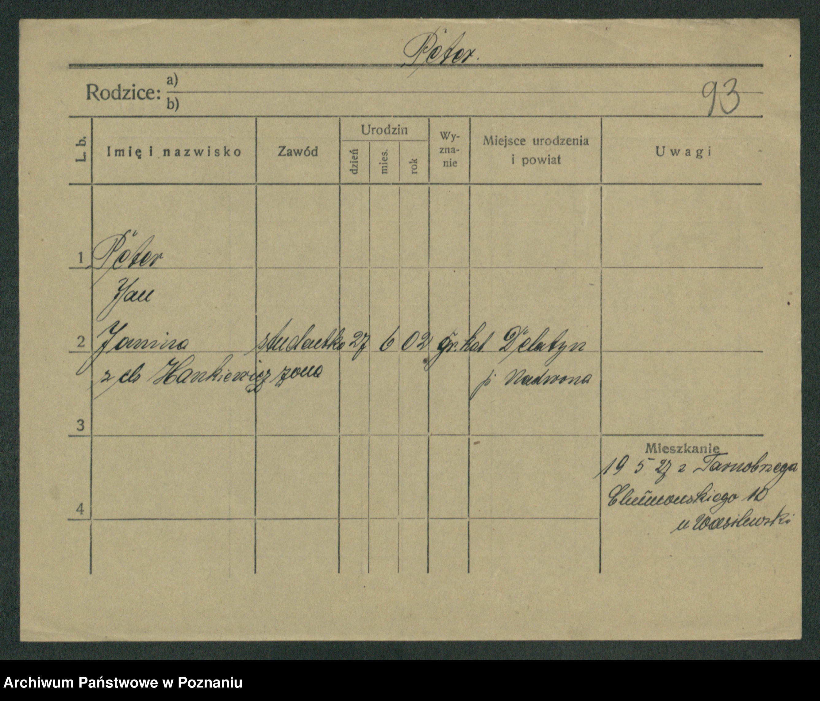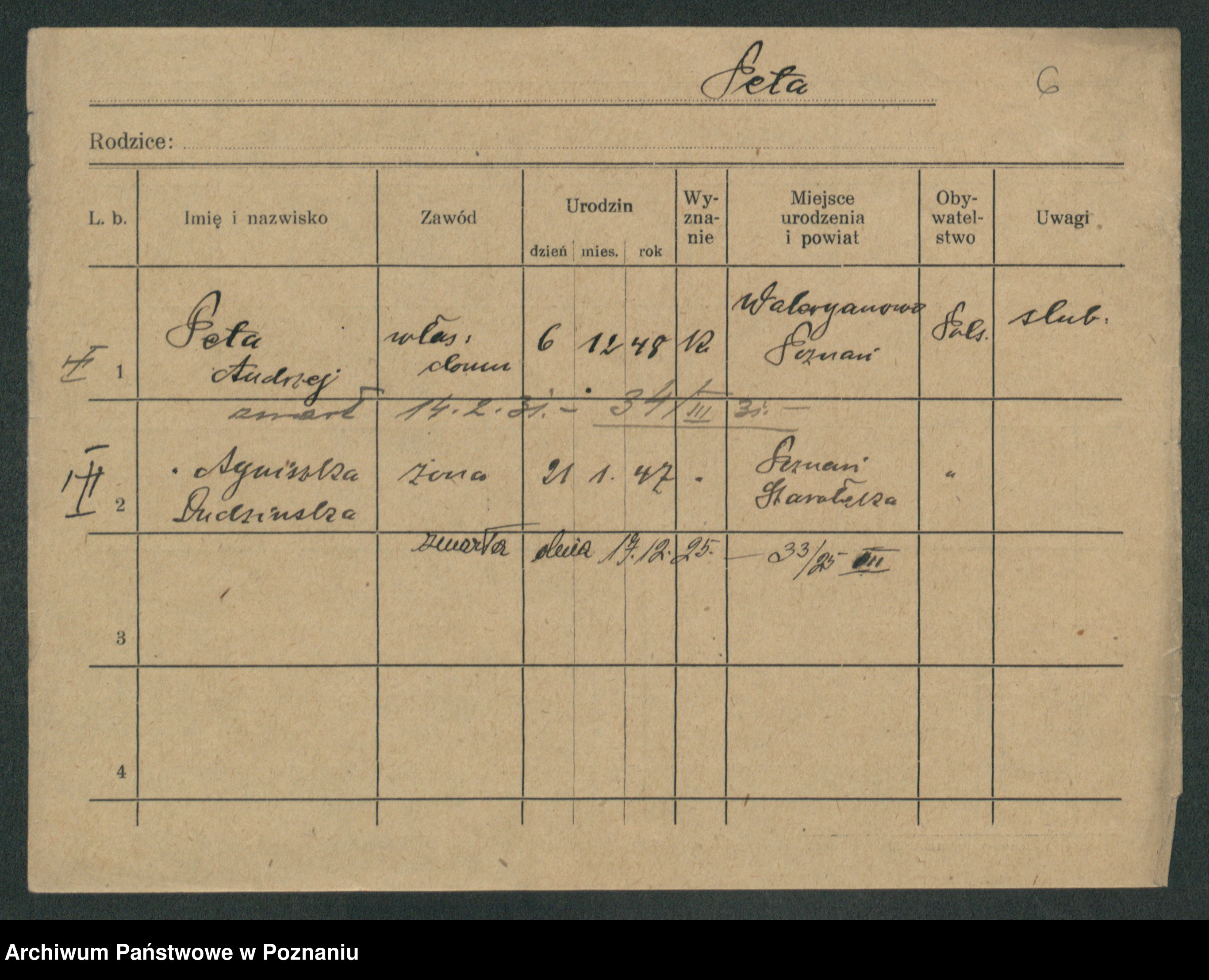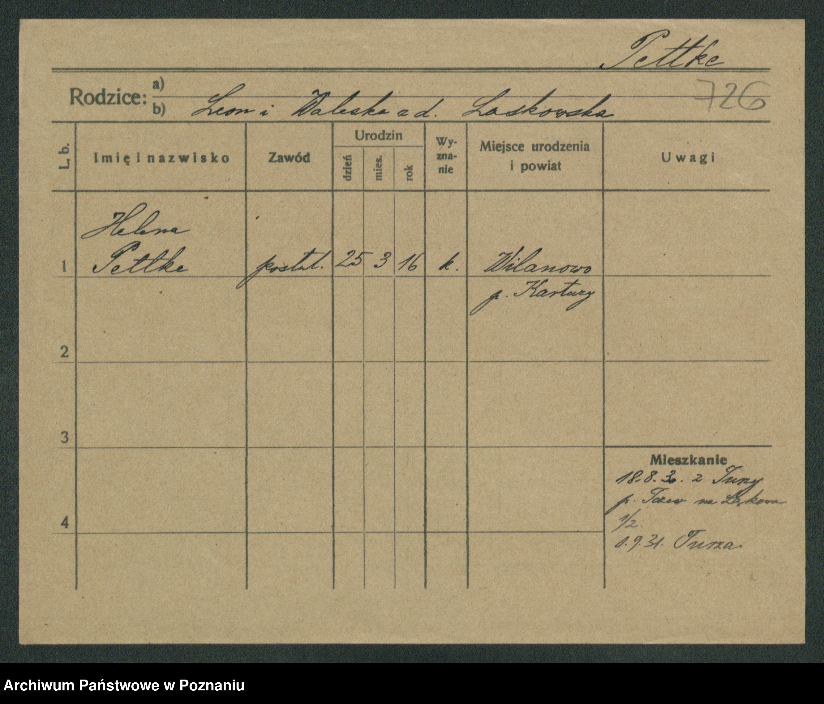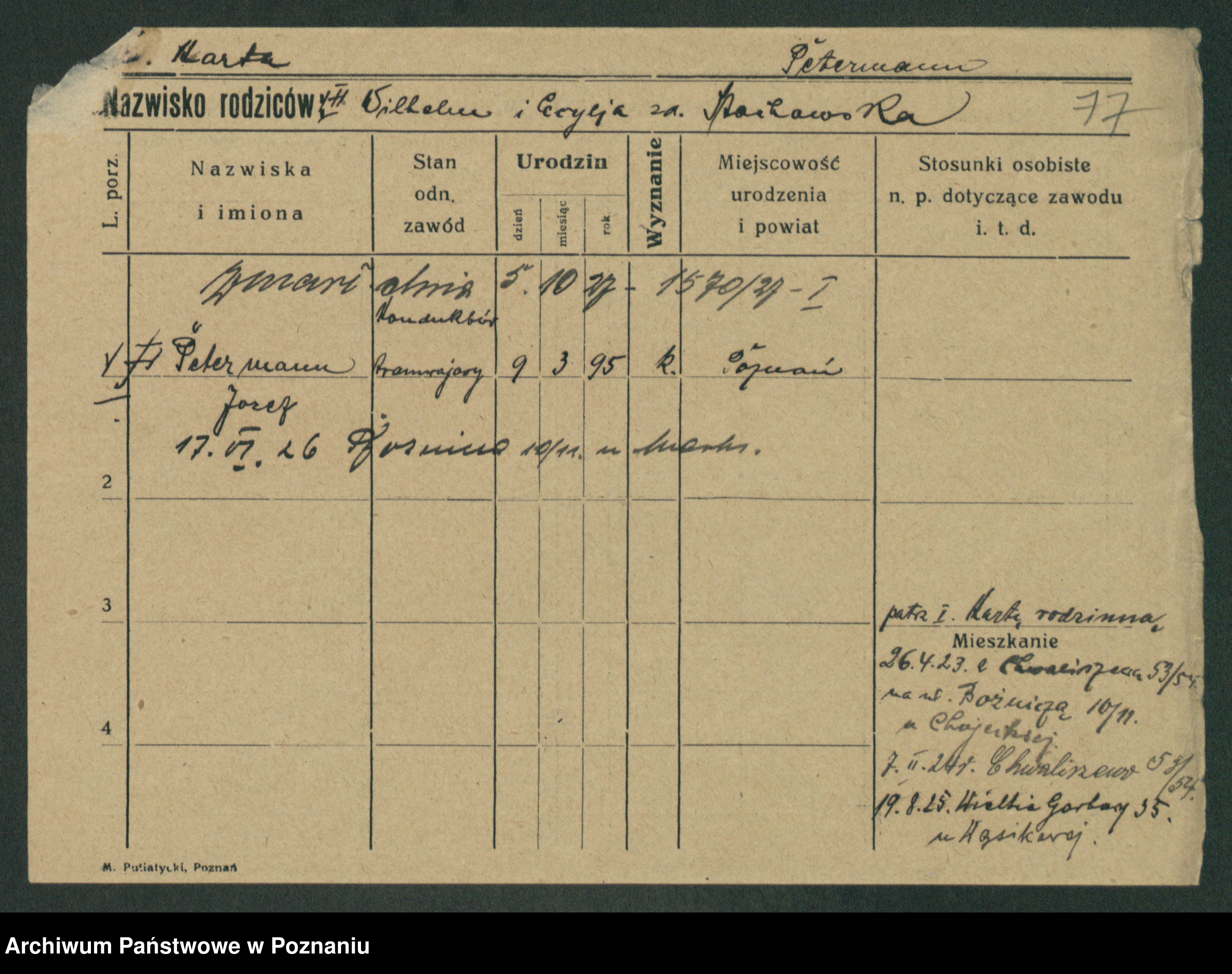 Podgląd karty osobowej dostępny jest po kliknięciu na nazwisko lub ikonkę karty. Można dokonywać powiększenia (ikony na górze) lub przechodzić między kolejnymi skanami (strzałki po bokach).