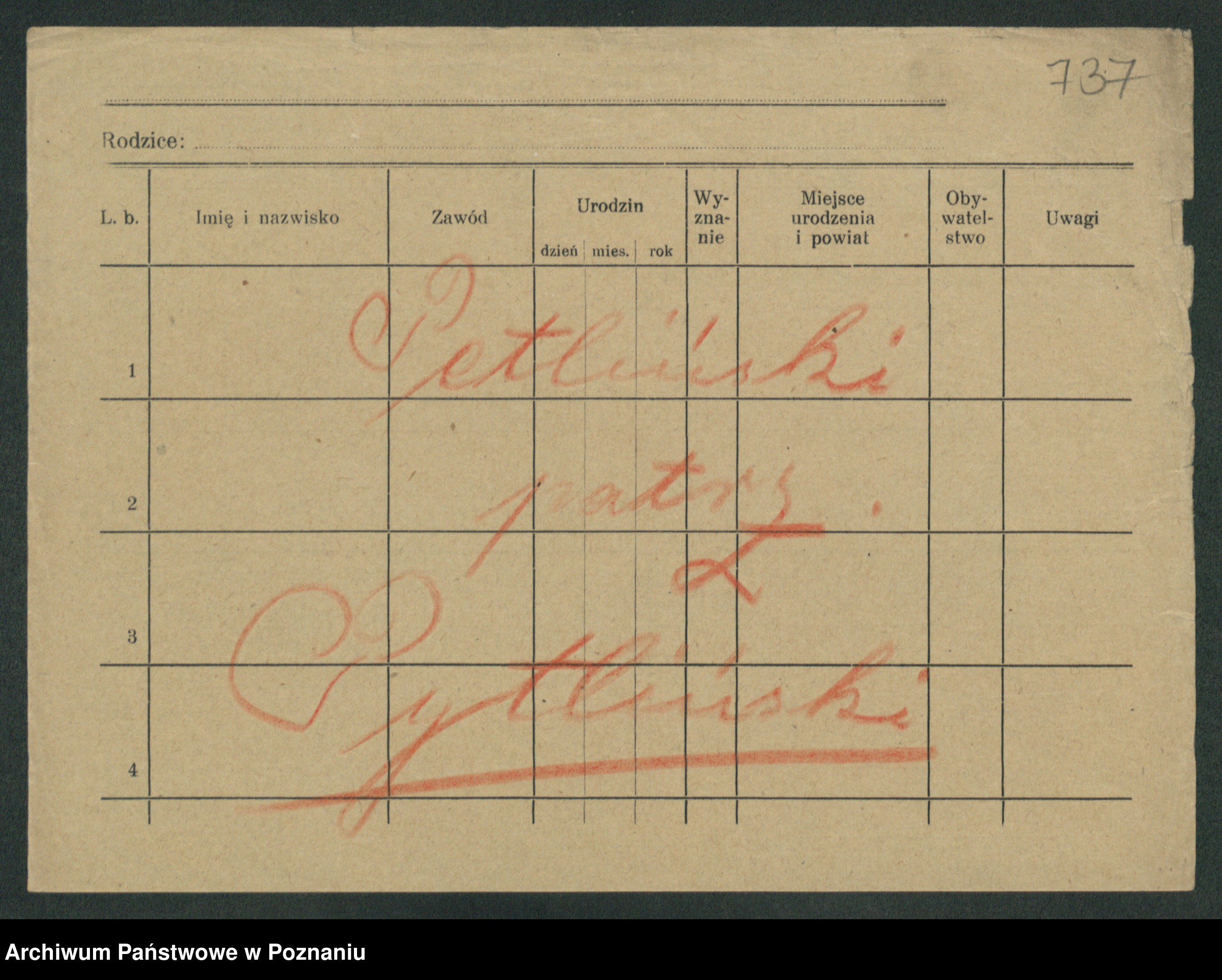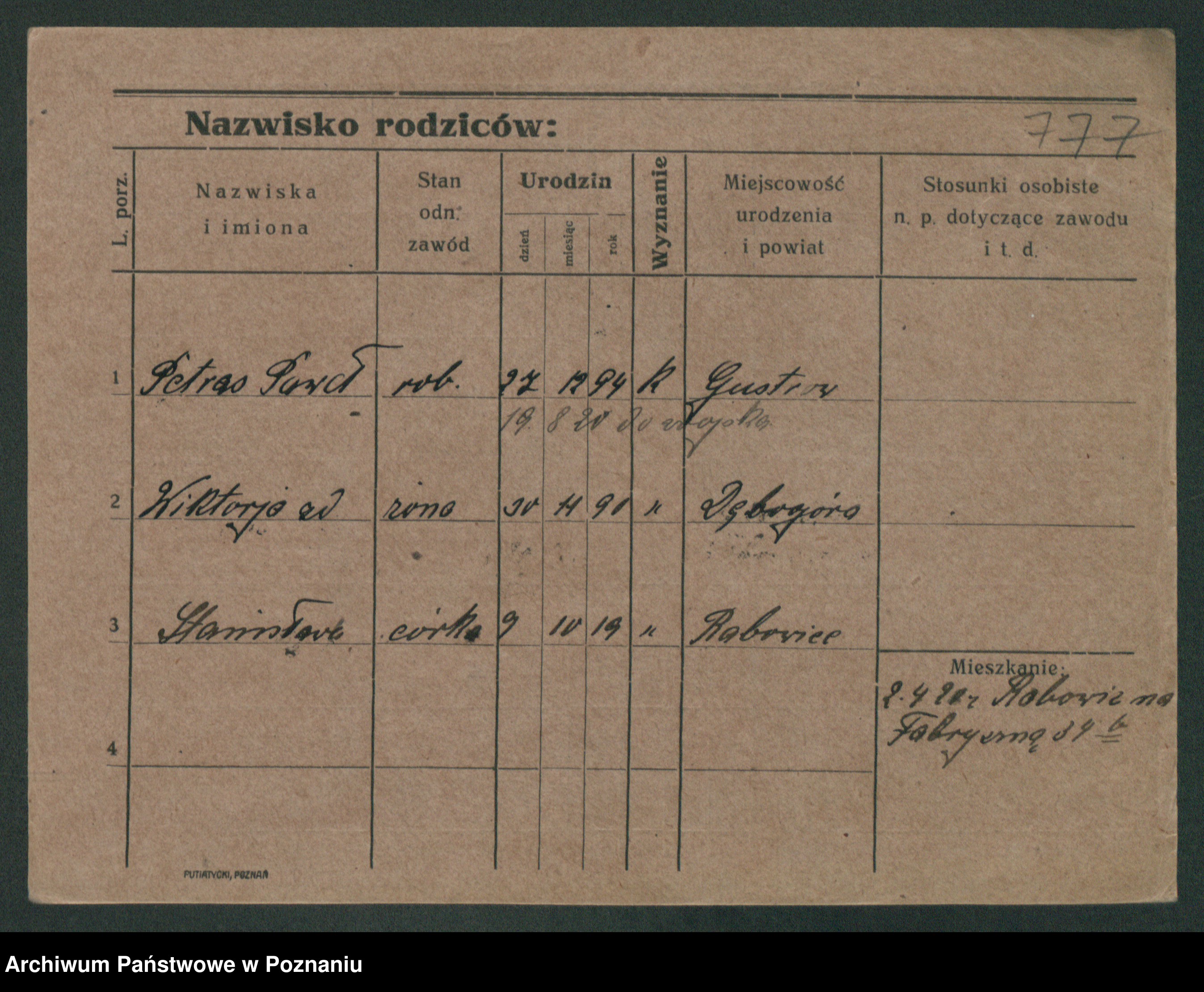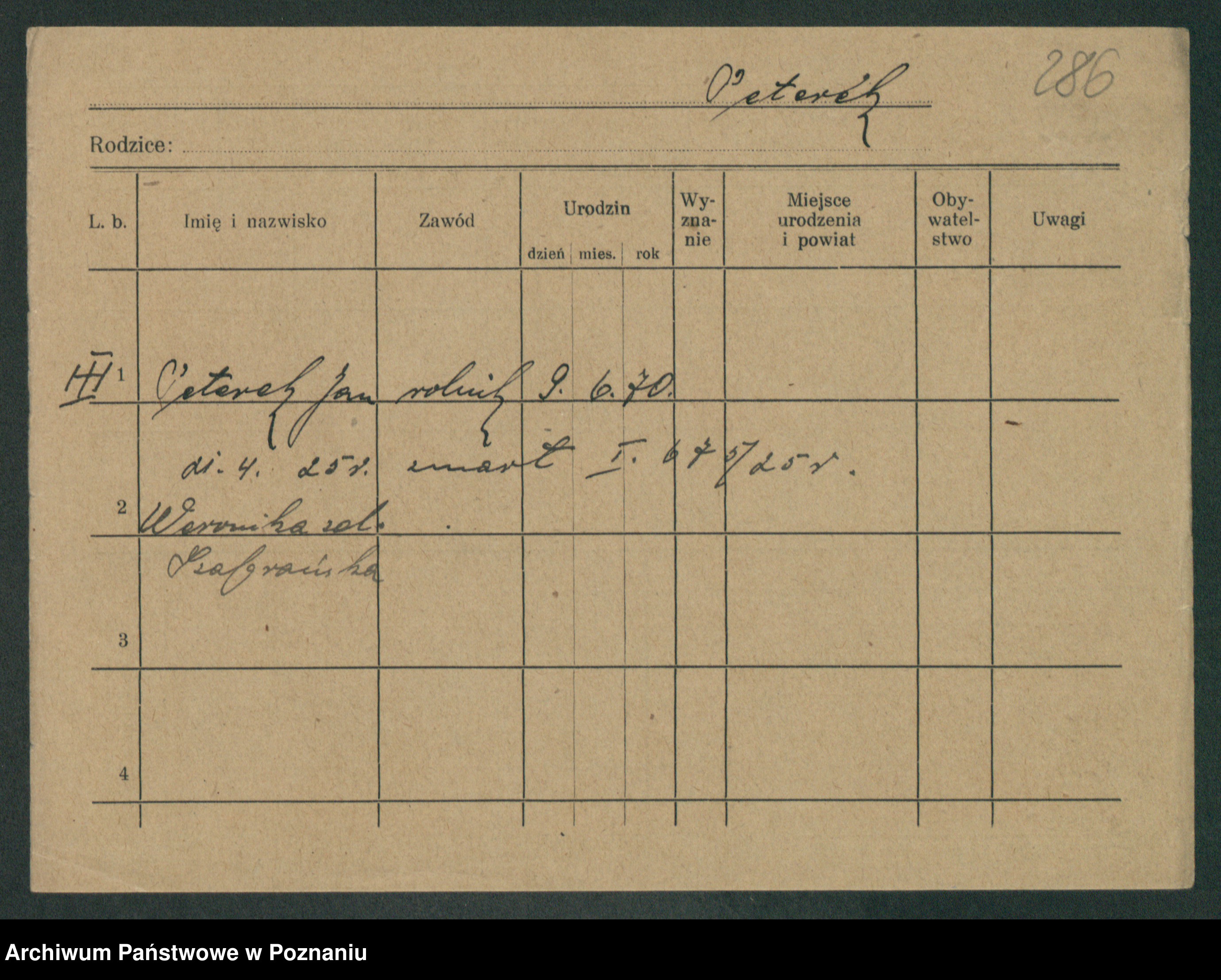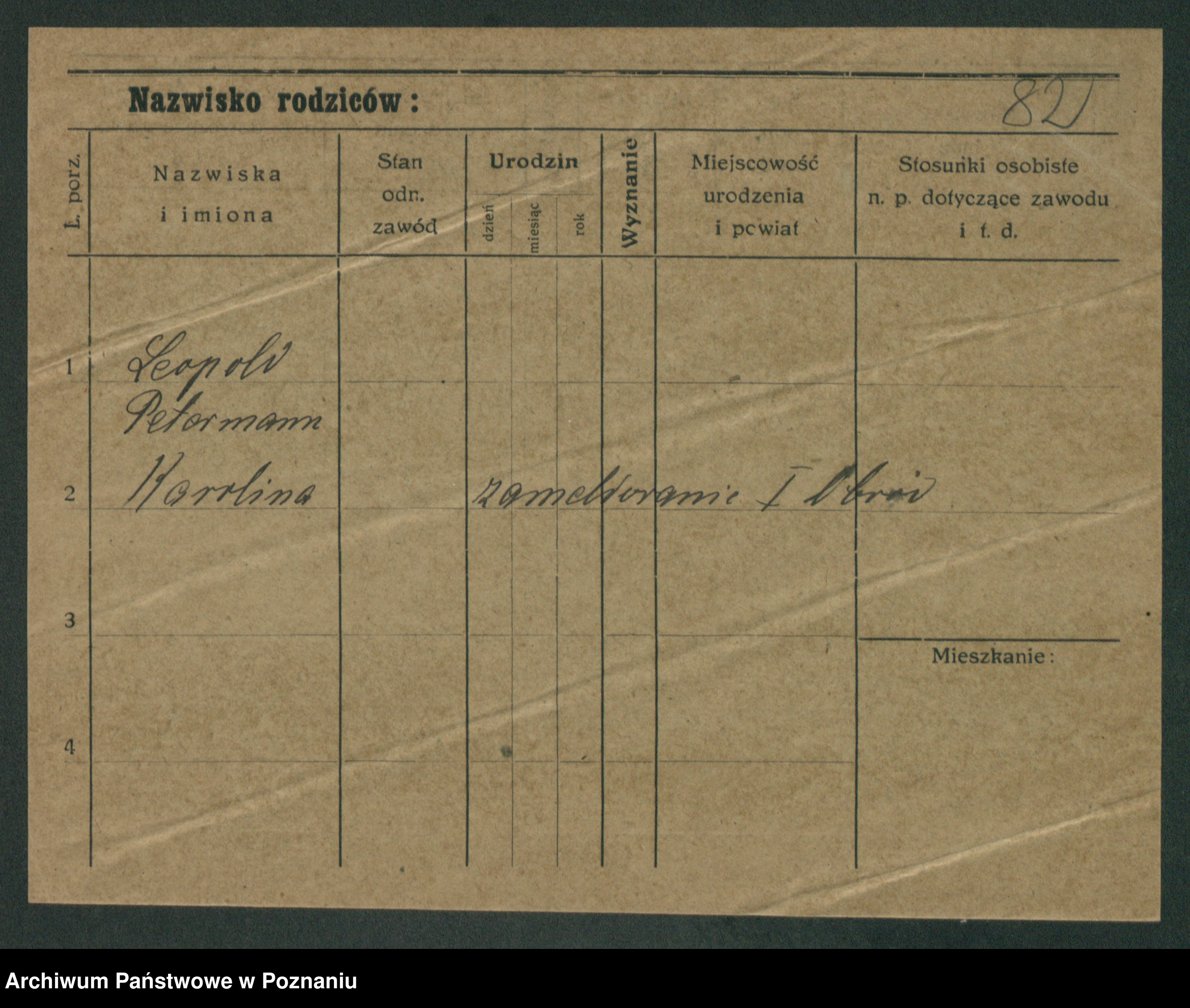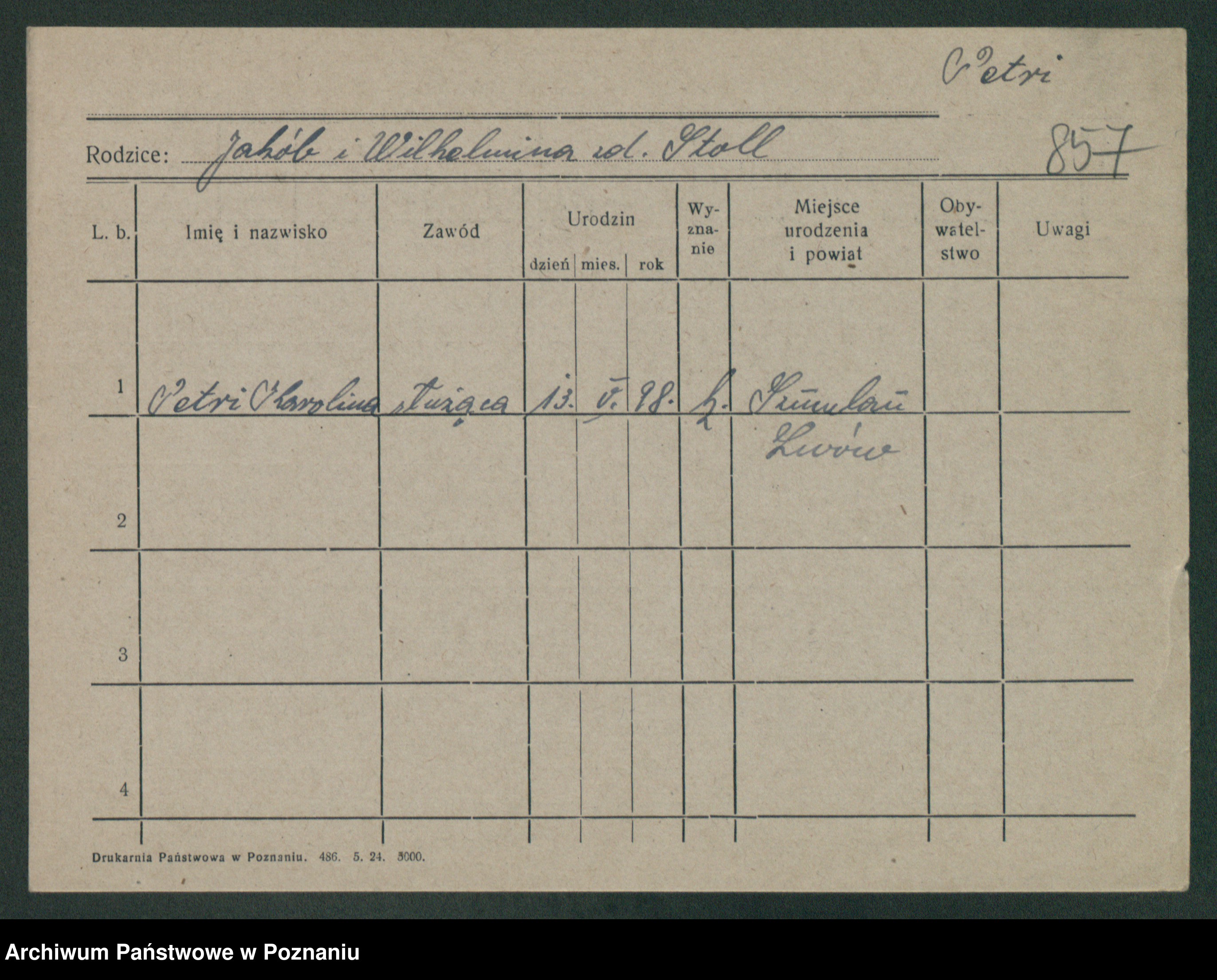 Podgląd karty osobowej dostępny jest po kliknięciu na nazwisko lub ikonkę karty. Można dokonywać powiększenia (ikony na górze) lub przechodzić między kolejnymi skanami (strzałki po bokach).