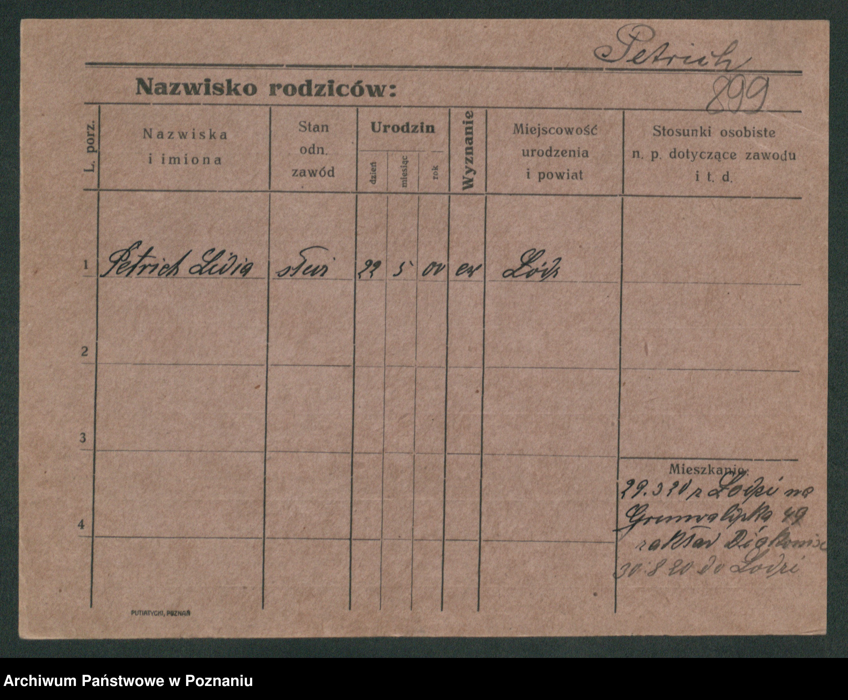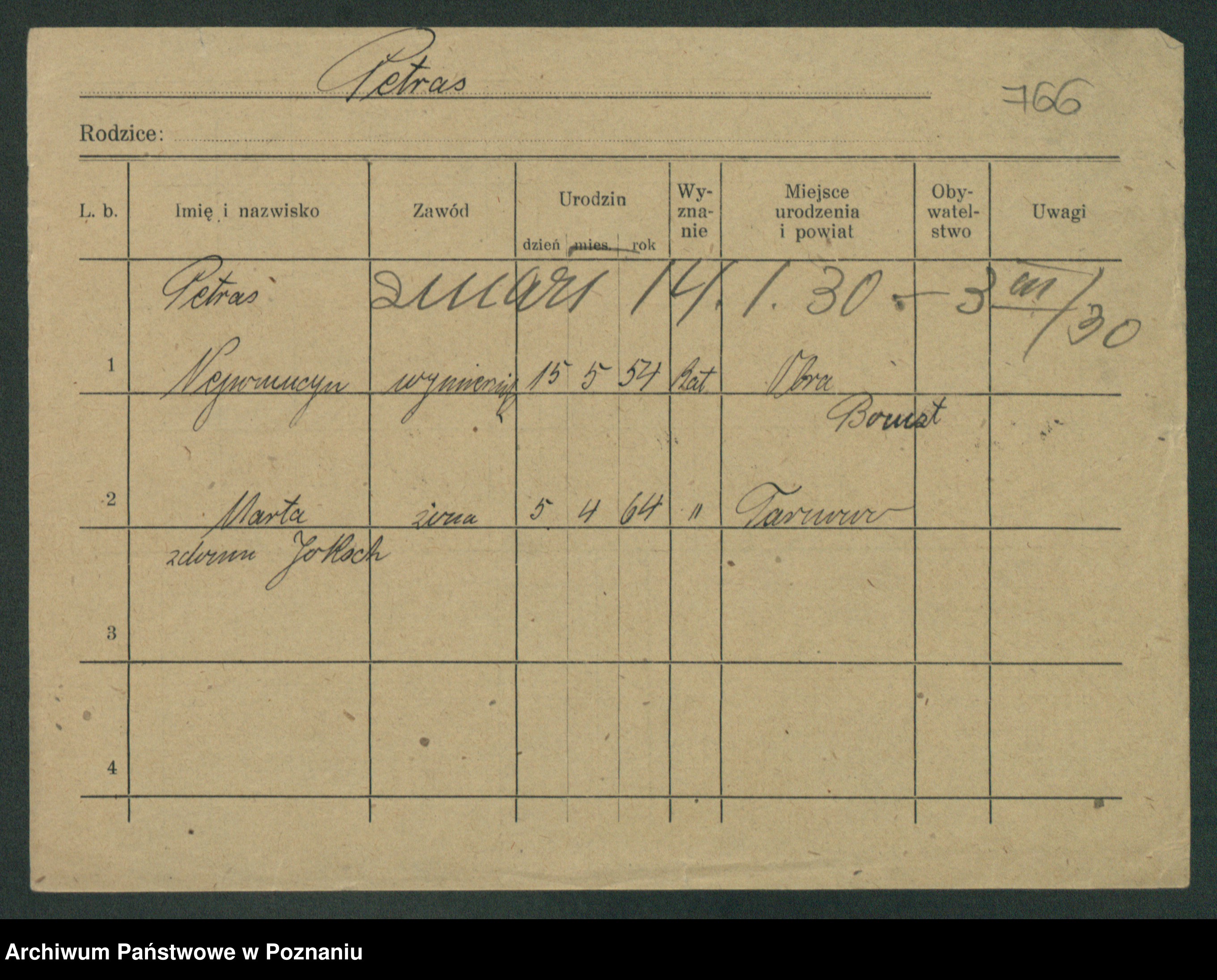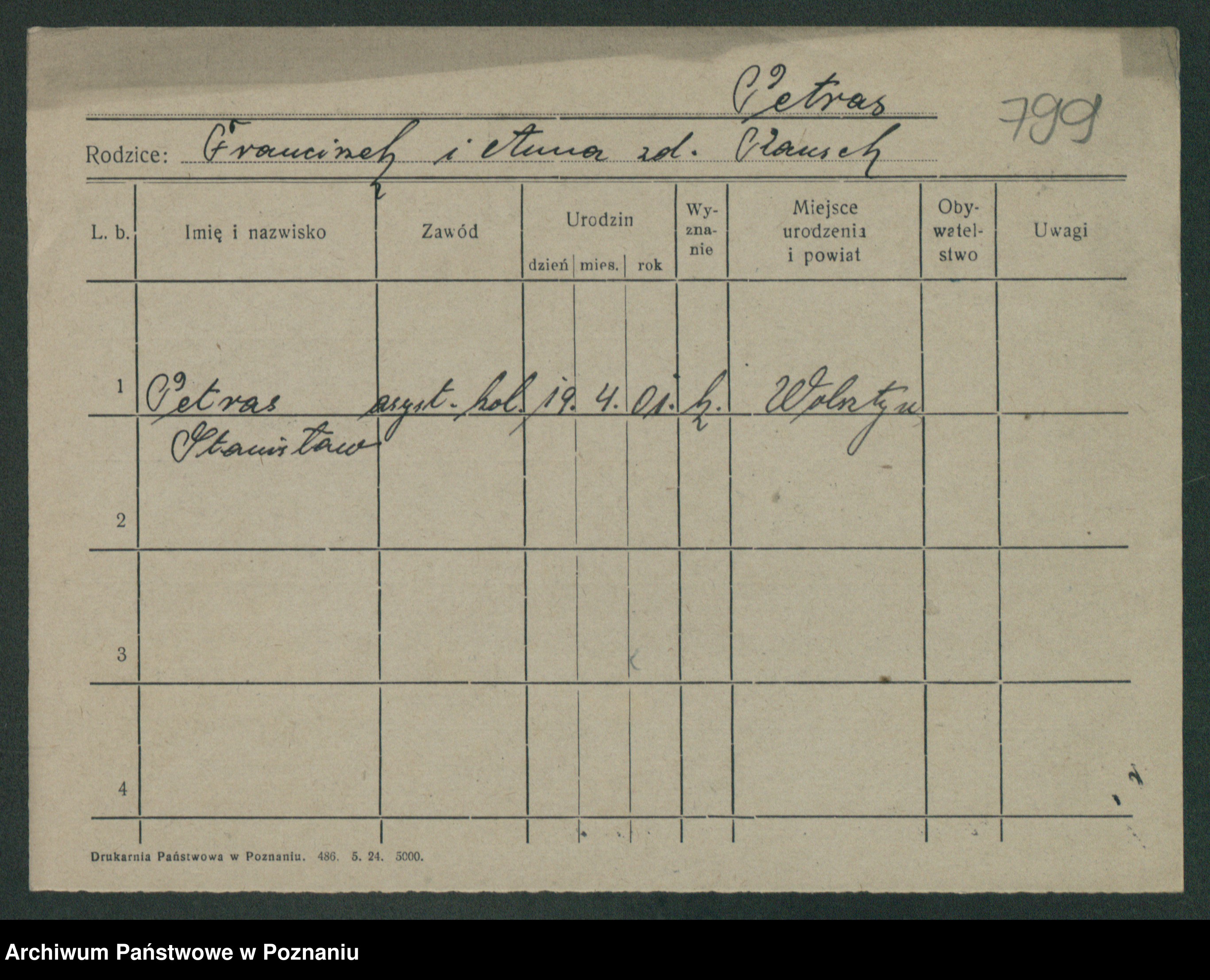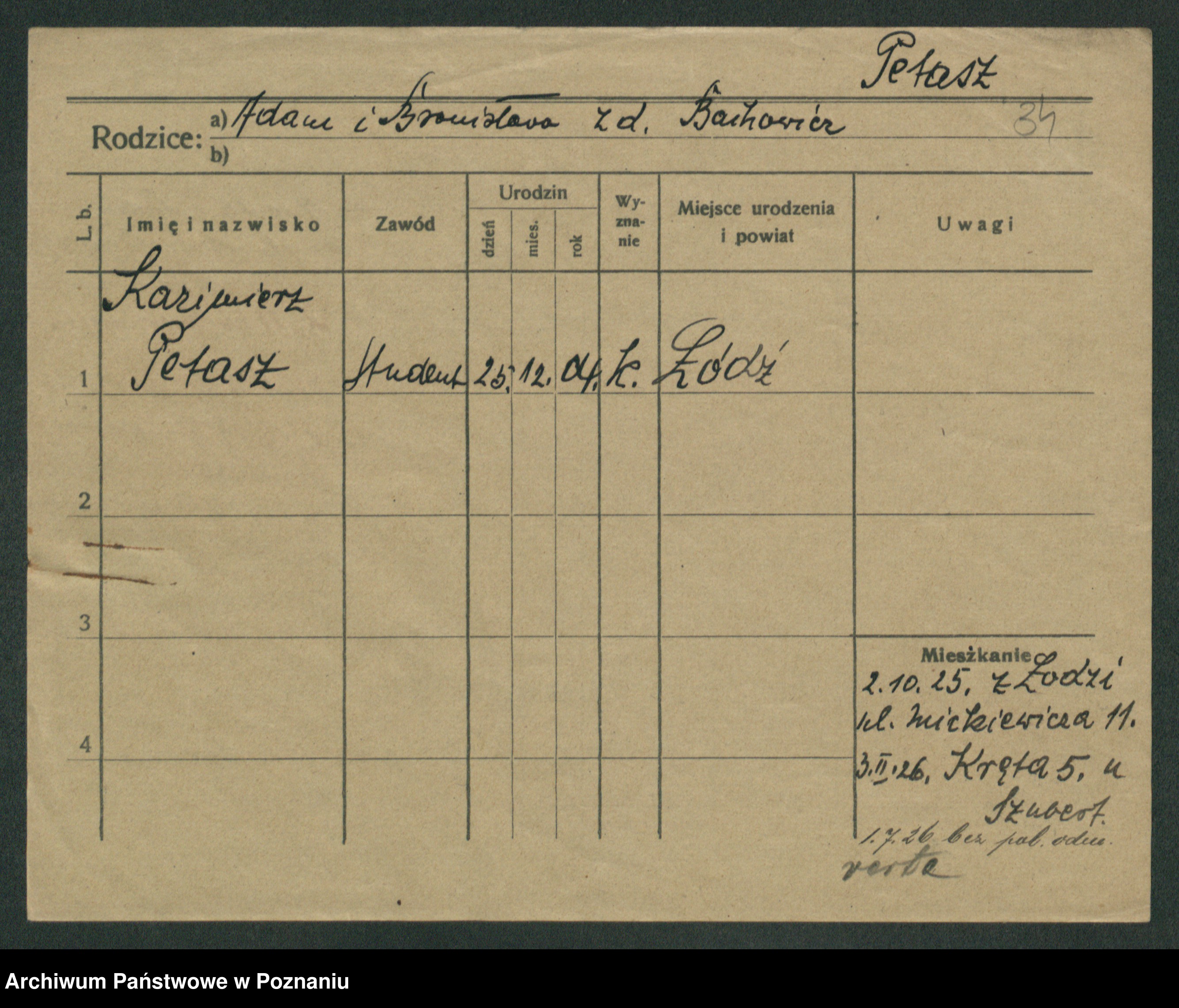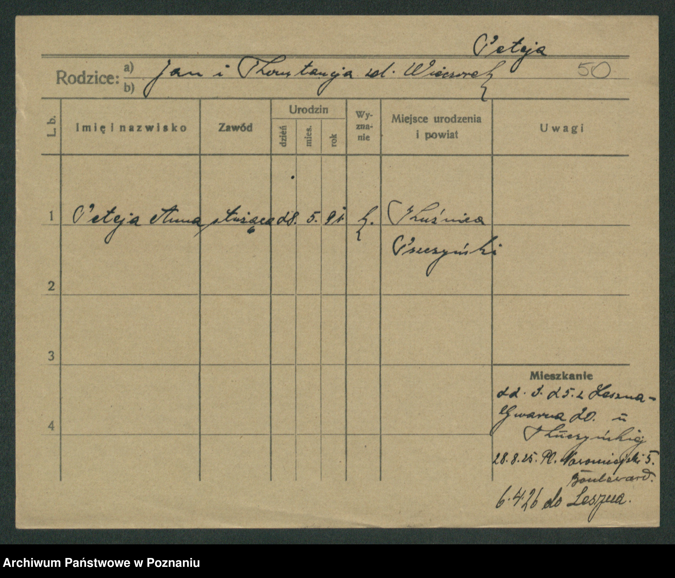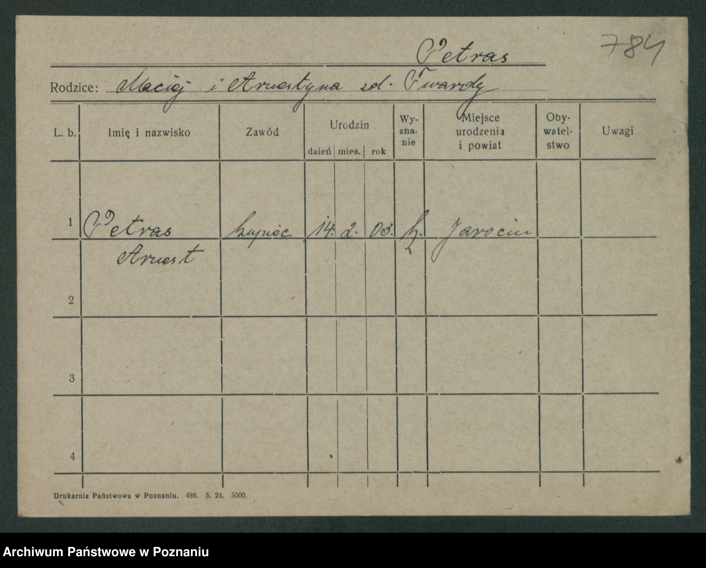 Podgląd karty osobowej dostępny jest po kliknięciu na nazwisko lub ikonkę karty. Można dokonywać powiększenia (ikony na górze) lub przechodzić między kolejnymi skanami (strzałki po bokach).