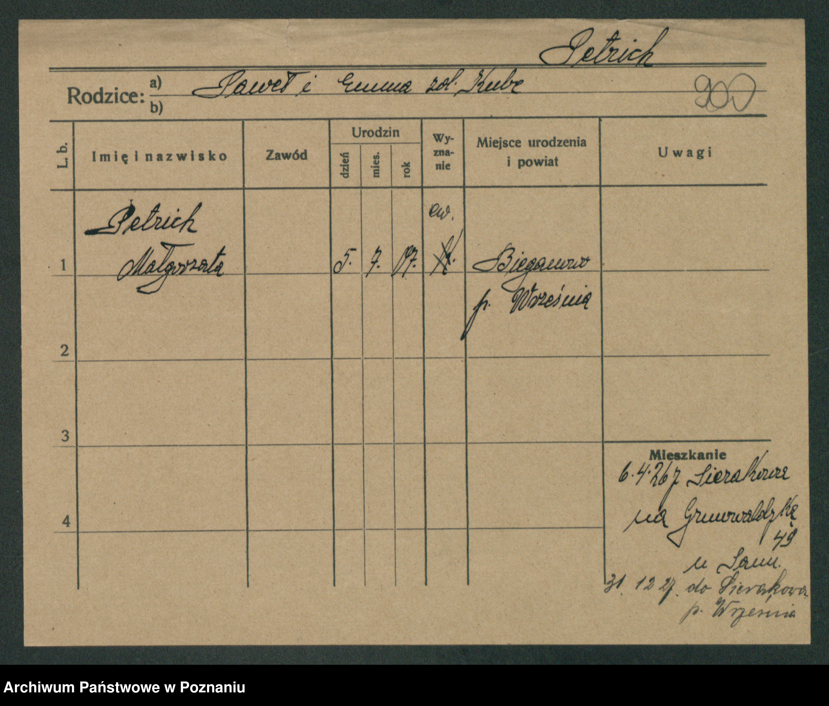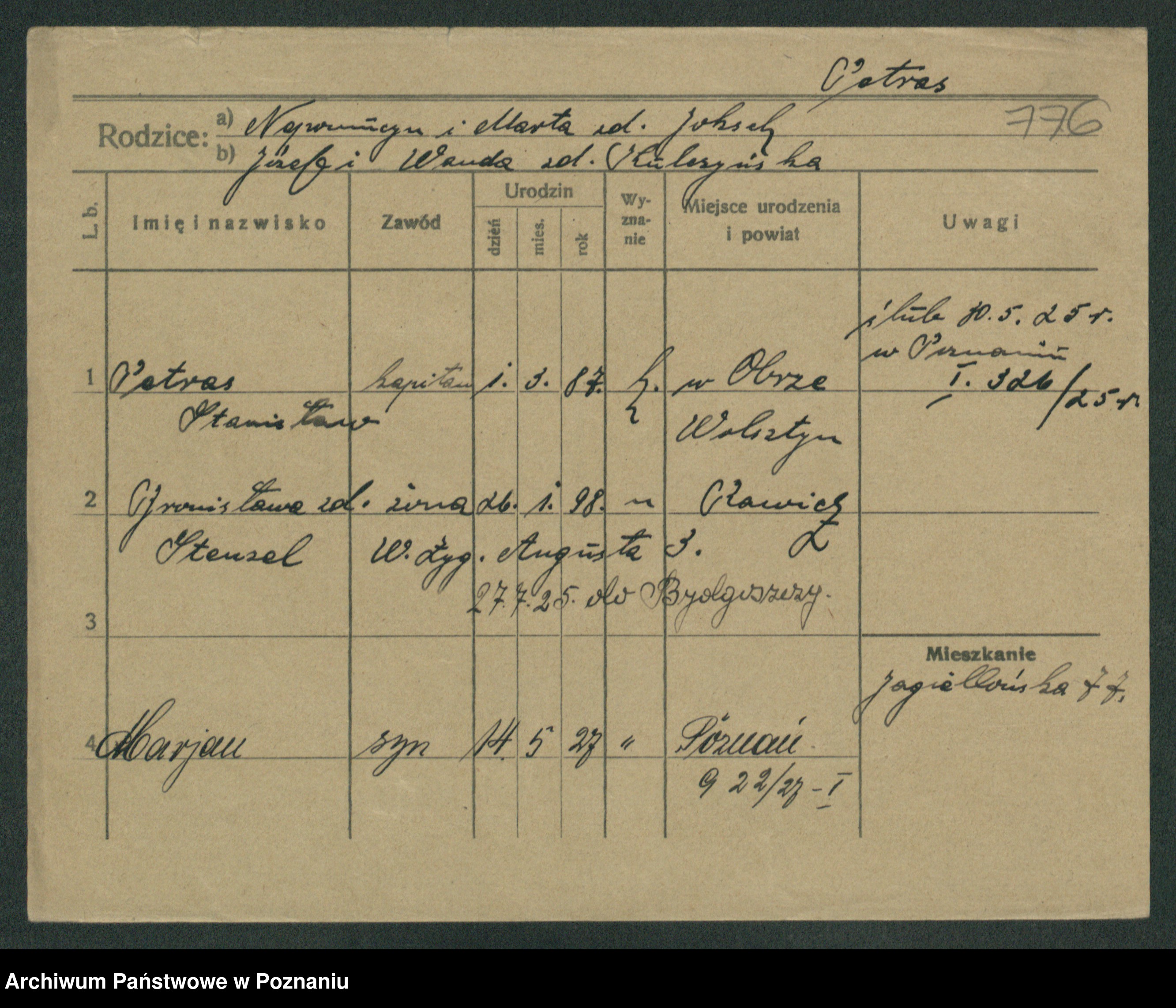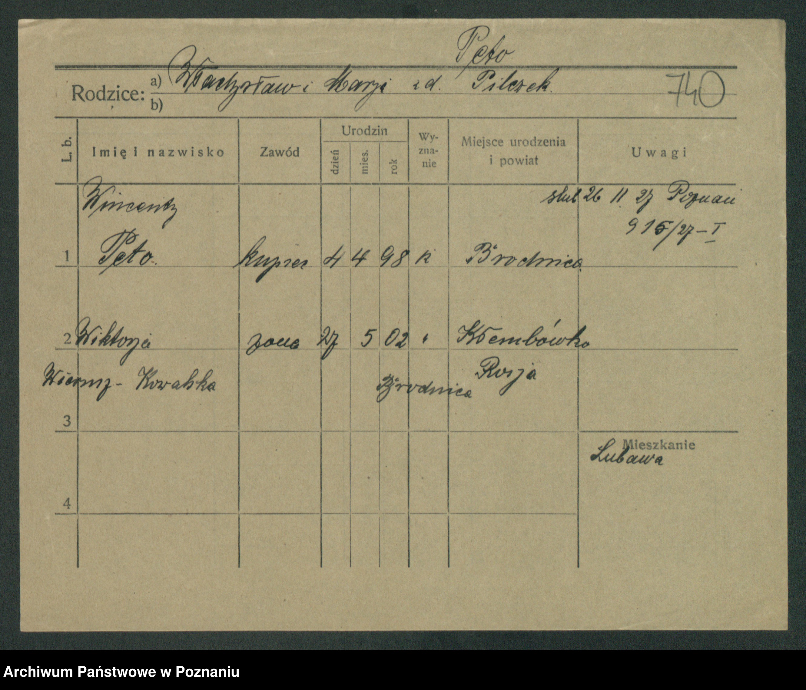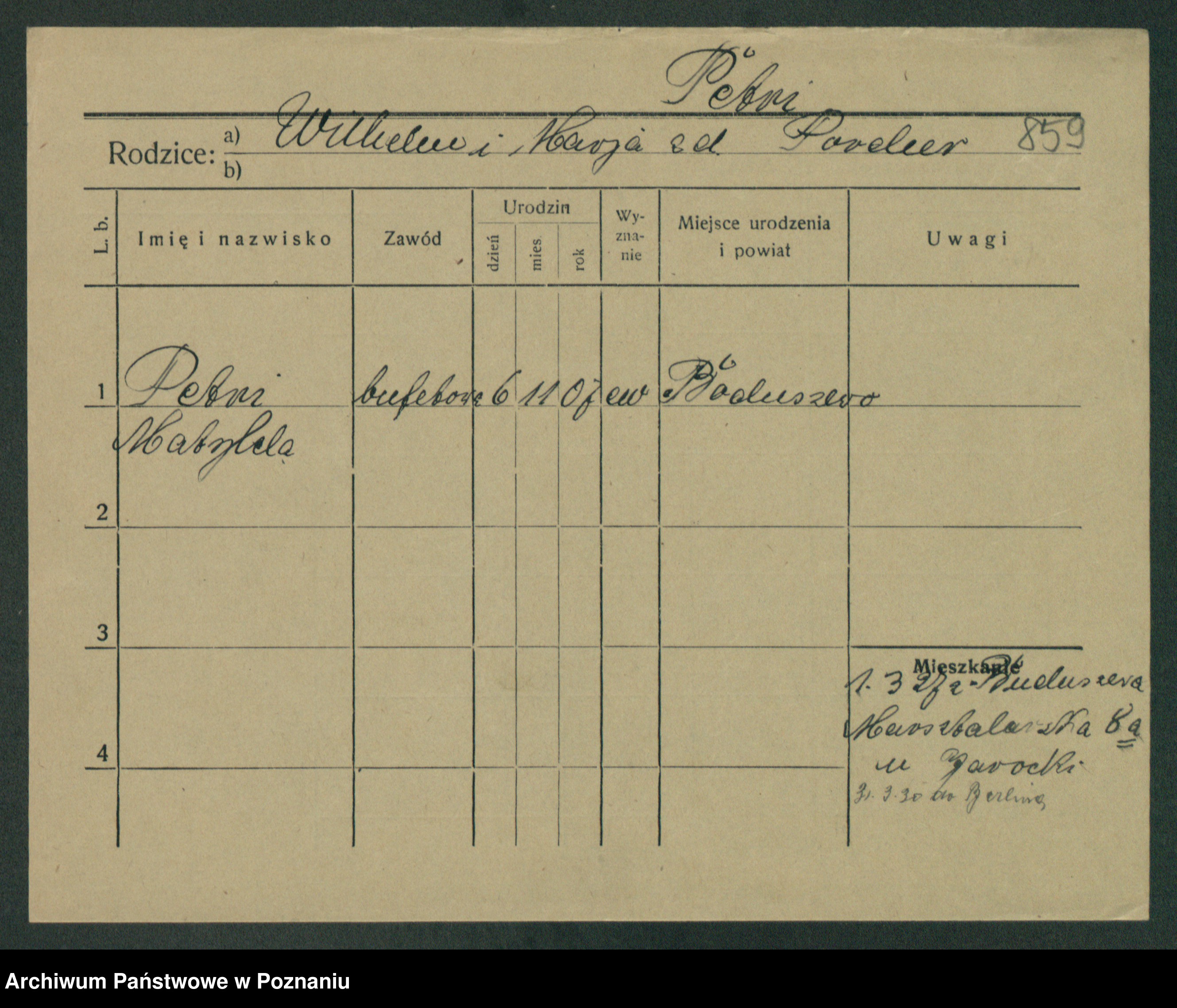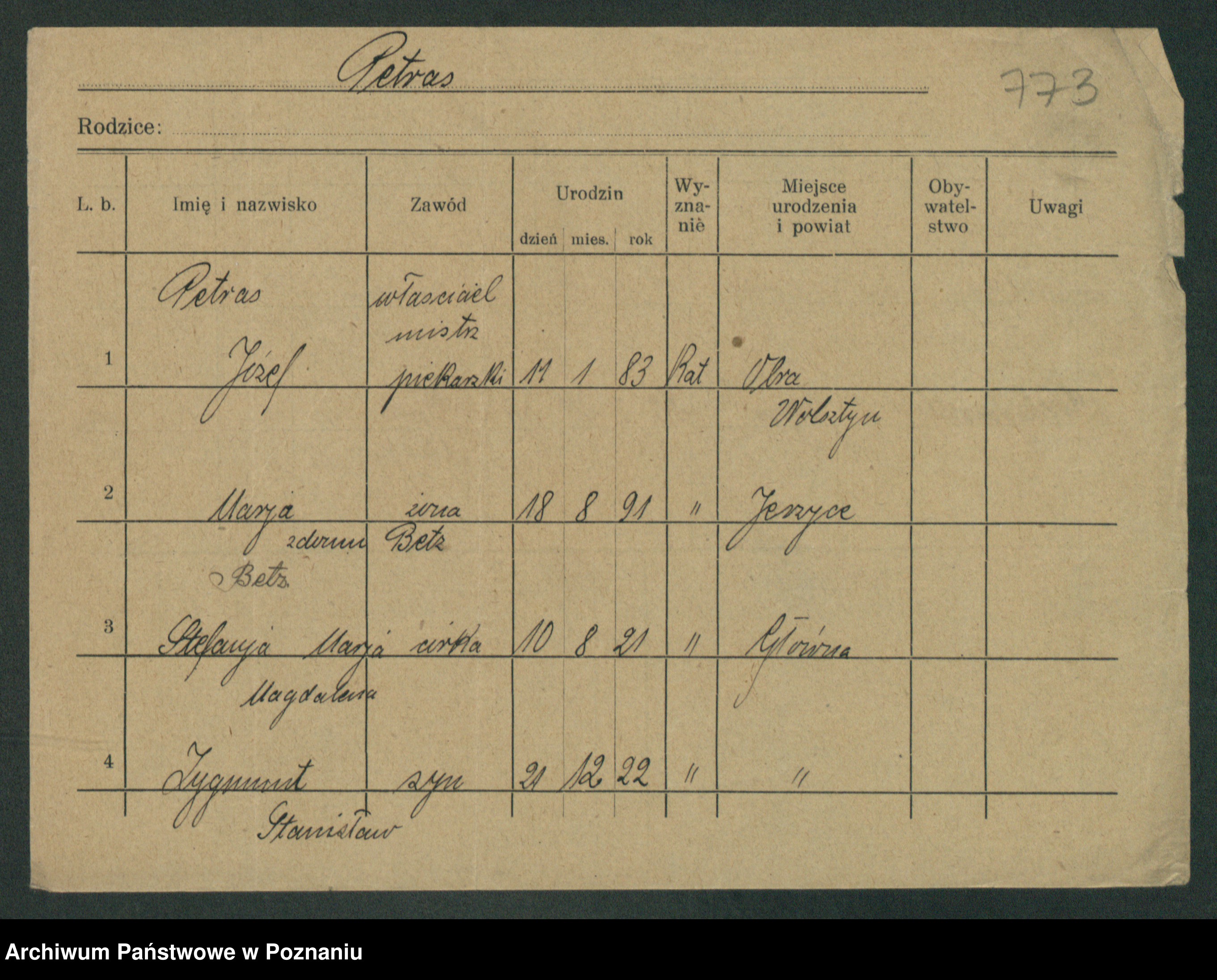 Podgląd karty osobowej dostępny jest po kliknięciu na nazwisko lub ikonkę karty. Można dokonywać powiększenia (ikony na górze) lub przechodzić między kolejnymi skanami (strzałki po bokach).