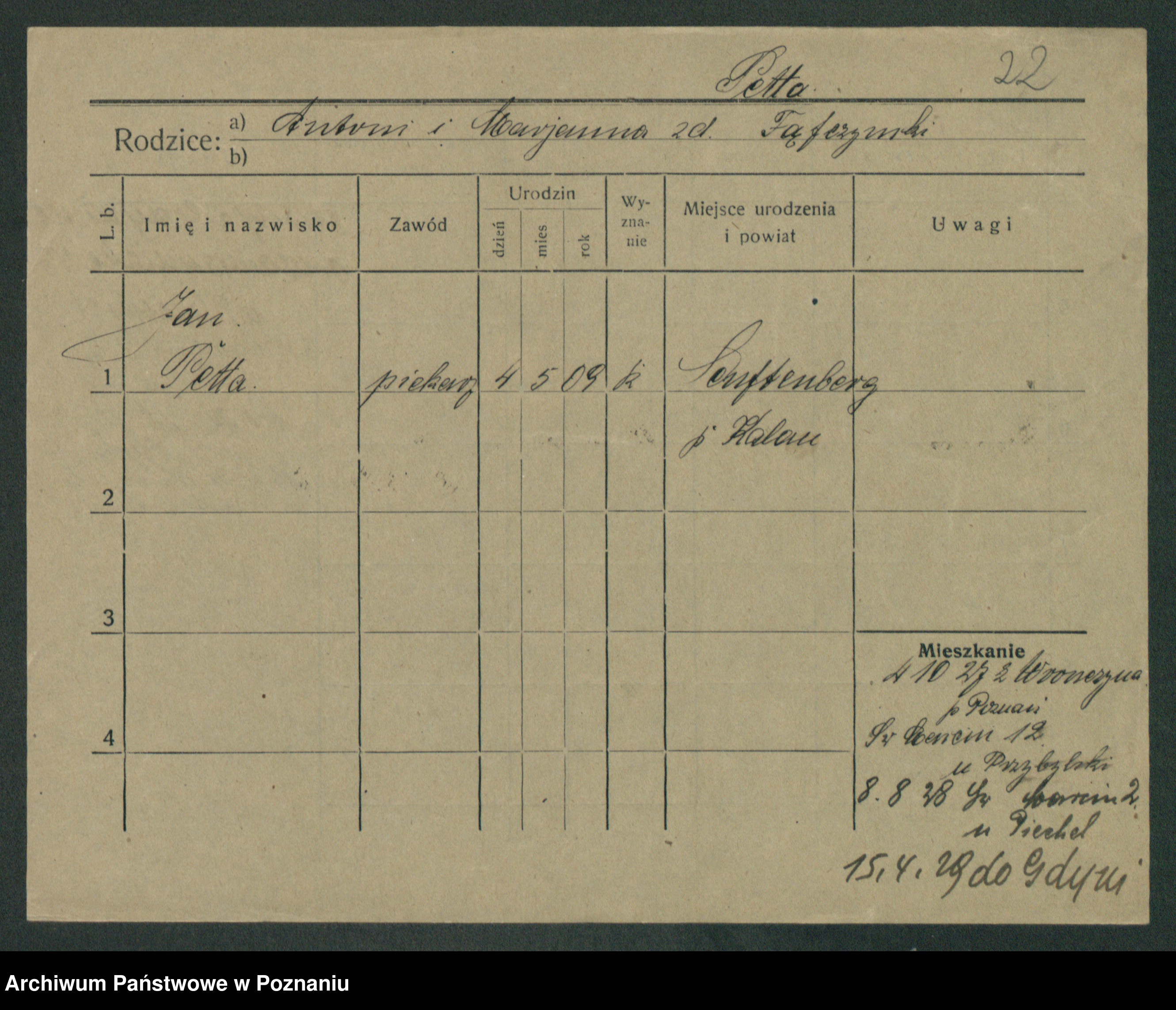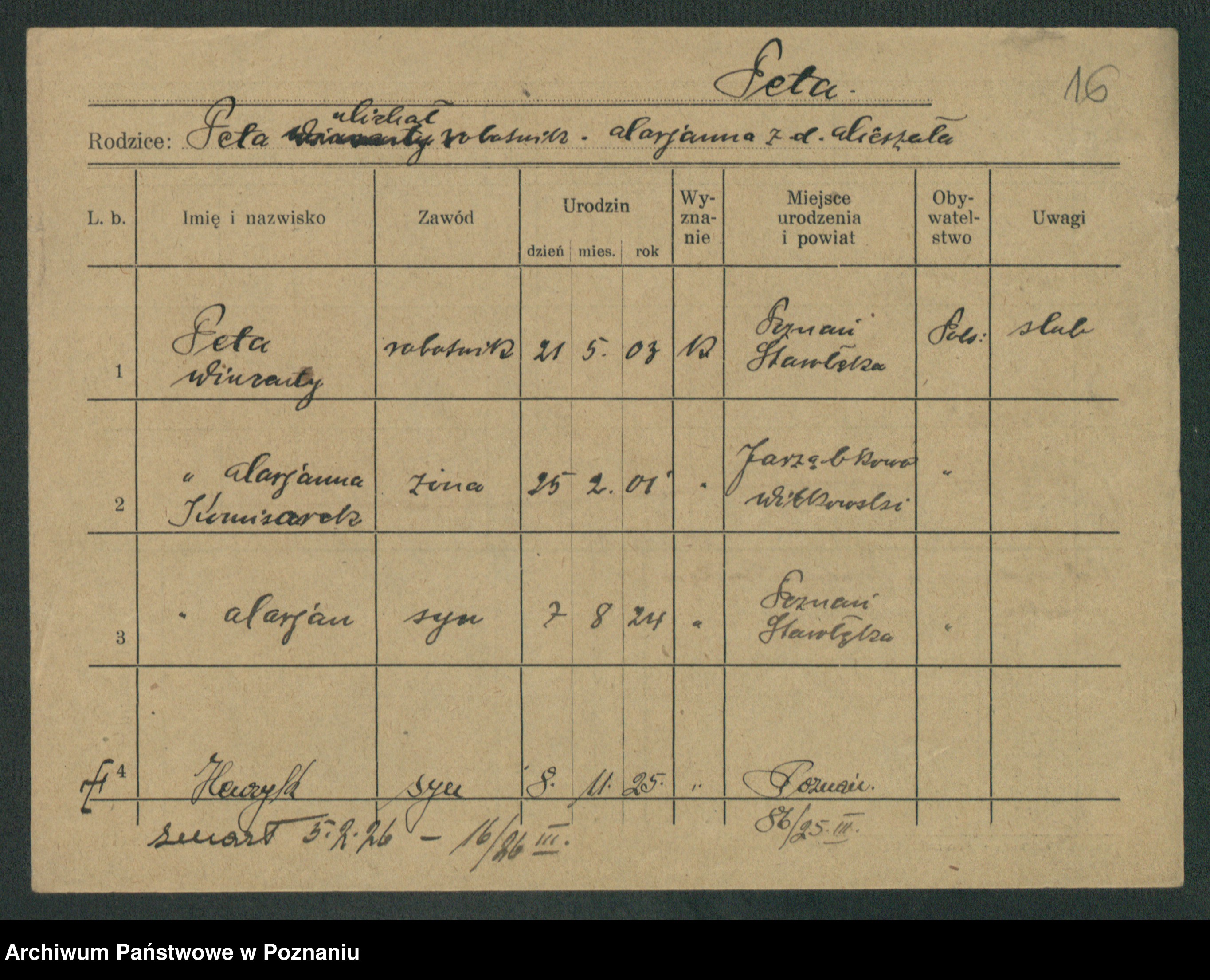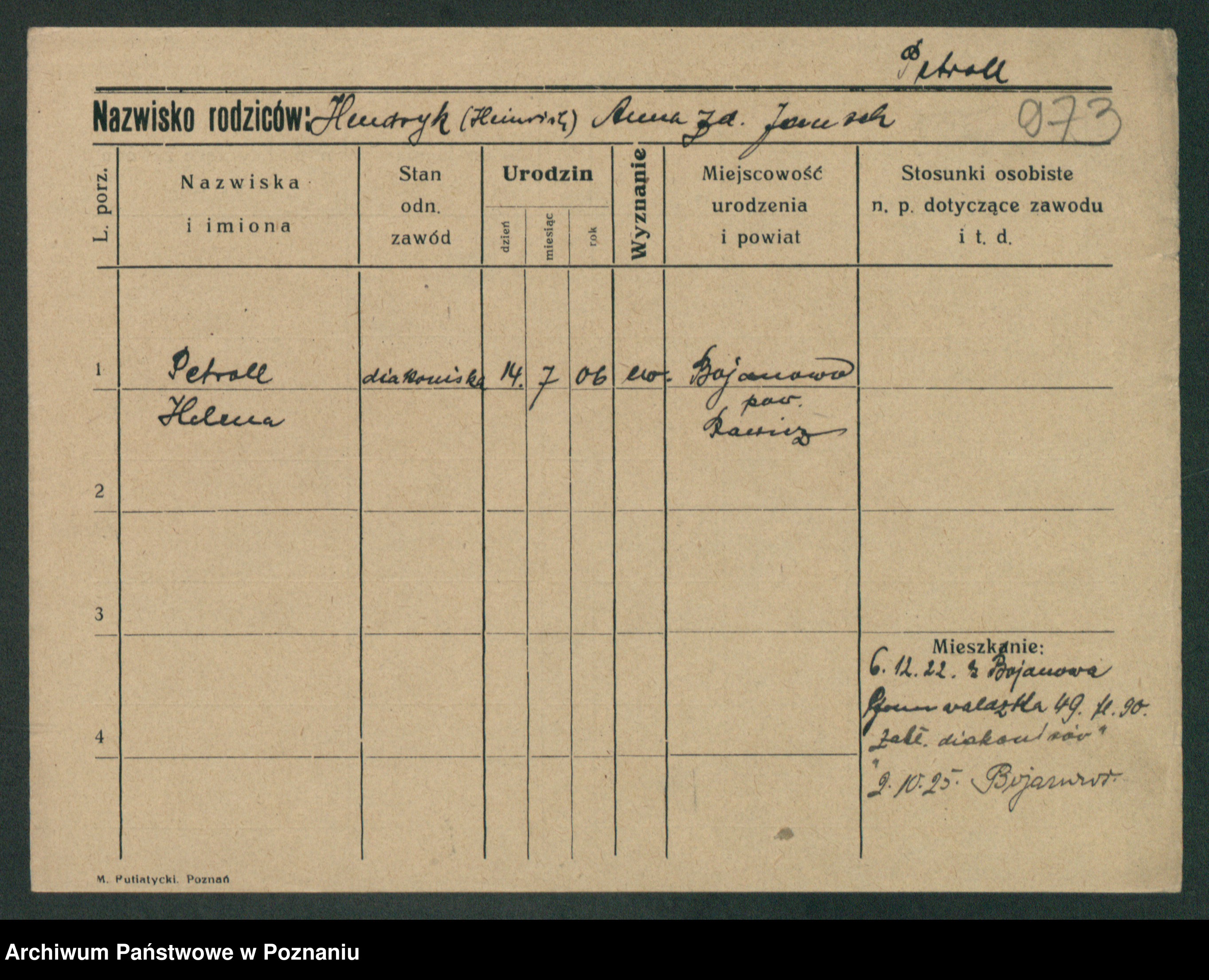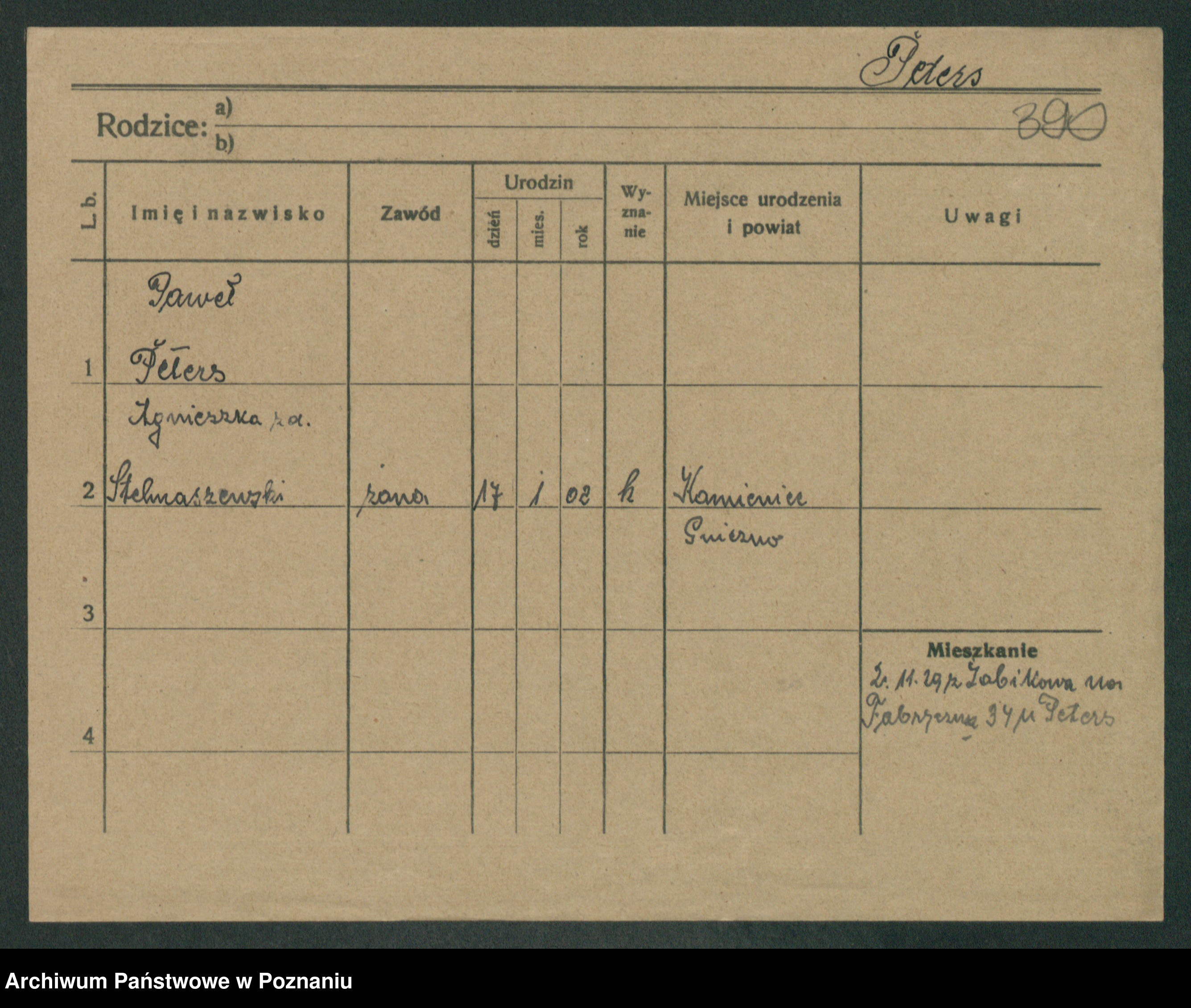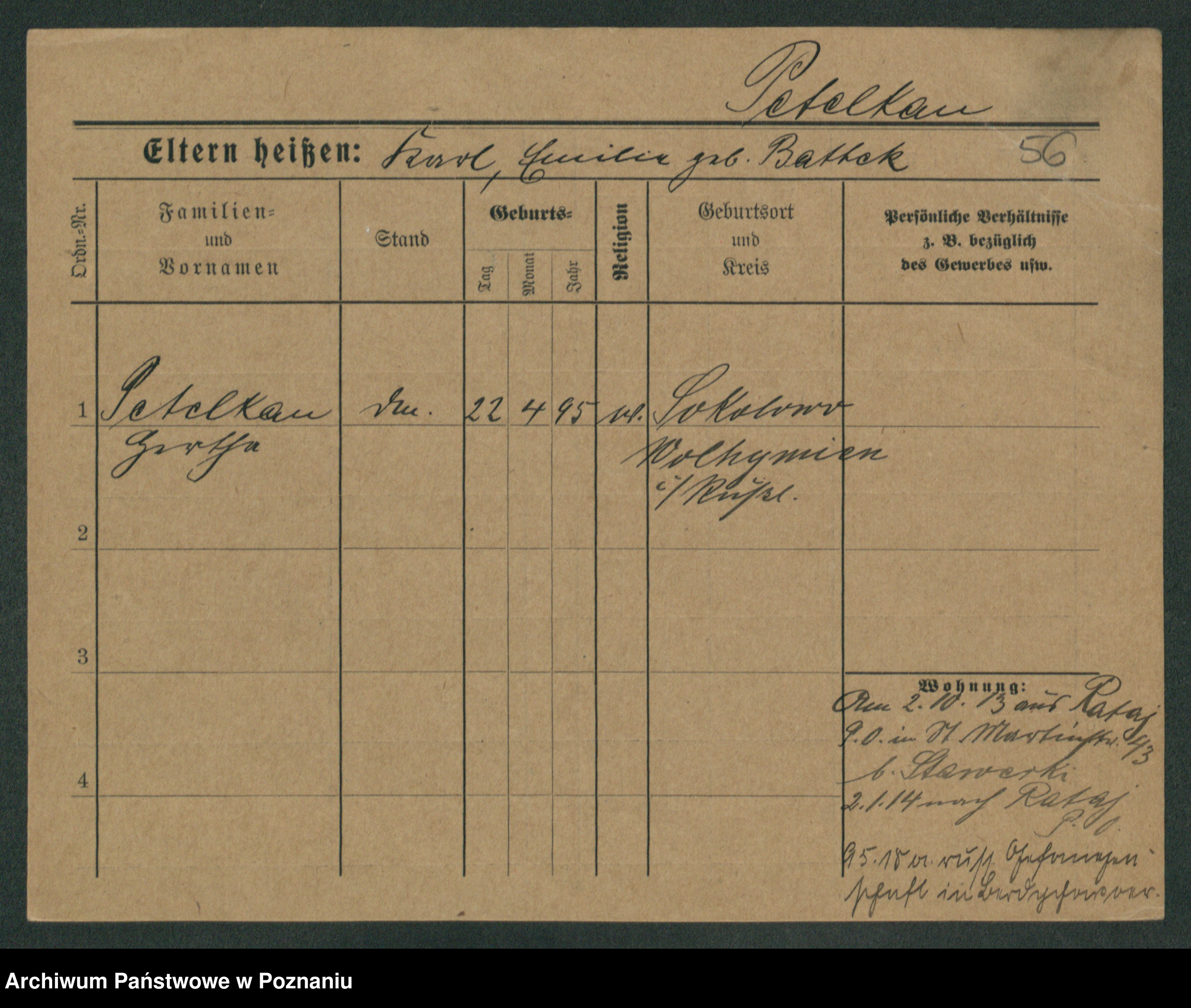 Podgląd karty osobowej dostępny jest po kliknięciu na nazwisko lub ikonkę karty. Można dokonywać powiększenia (ikony na górze) lub przechodzić między kolejnymi skanami (strzałki po bokach).
