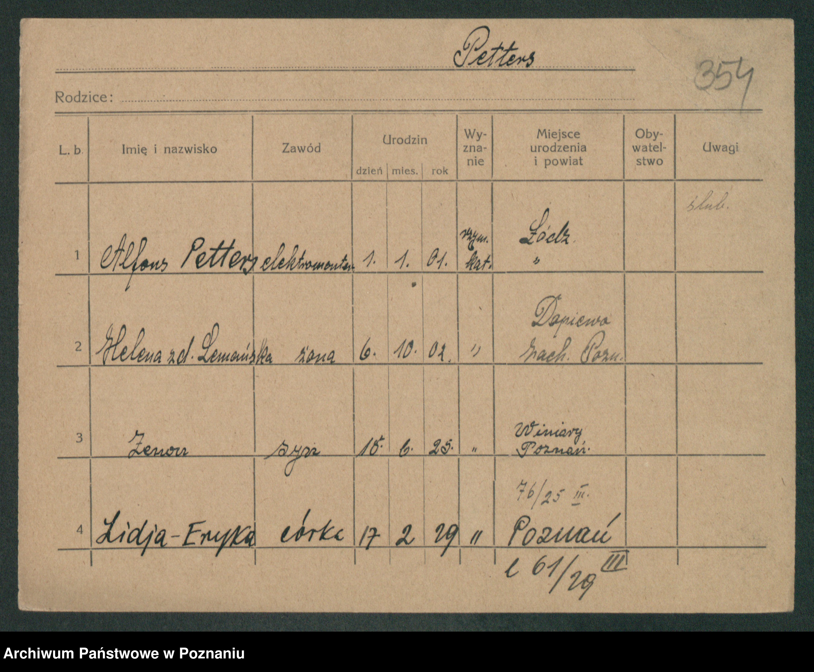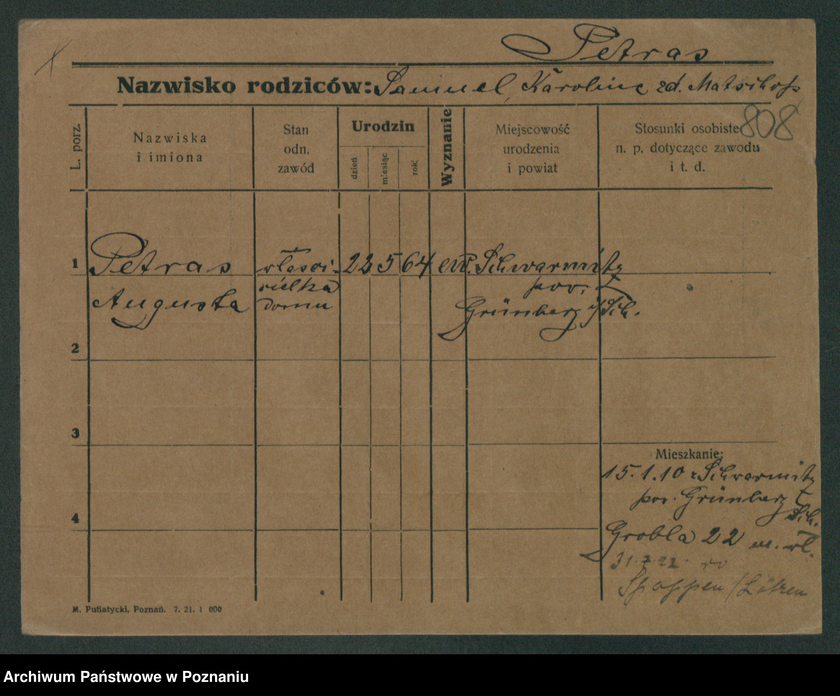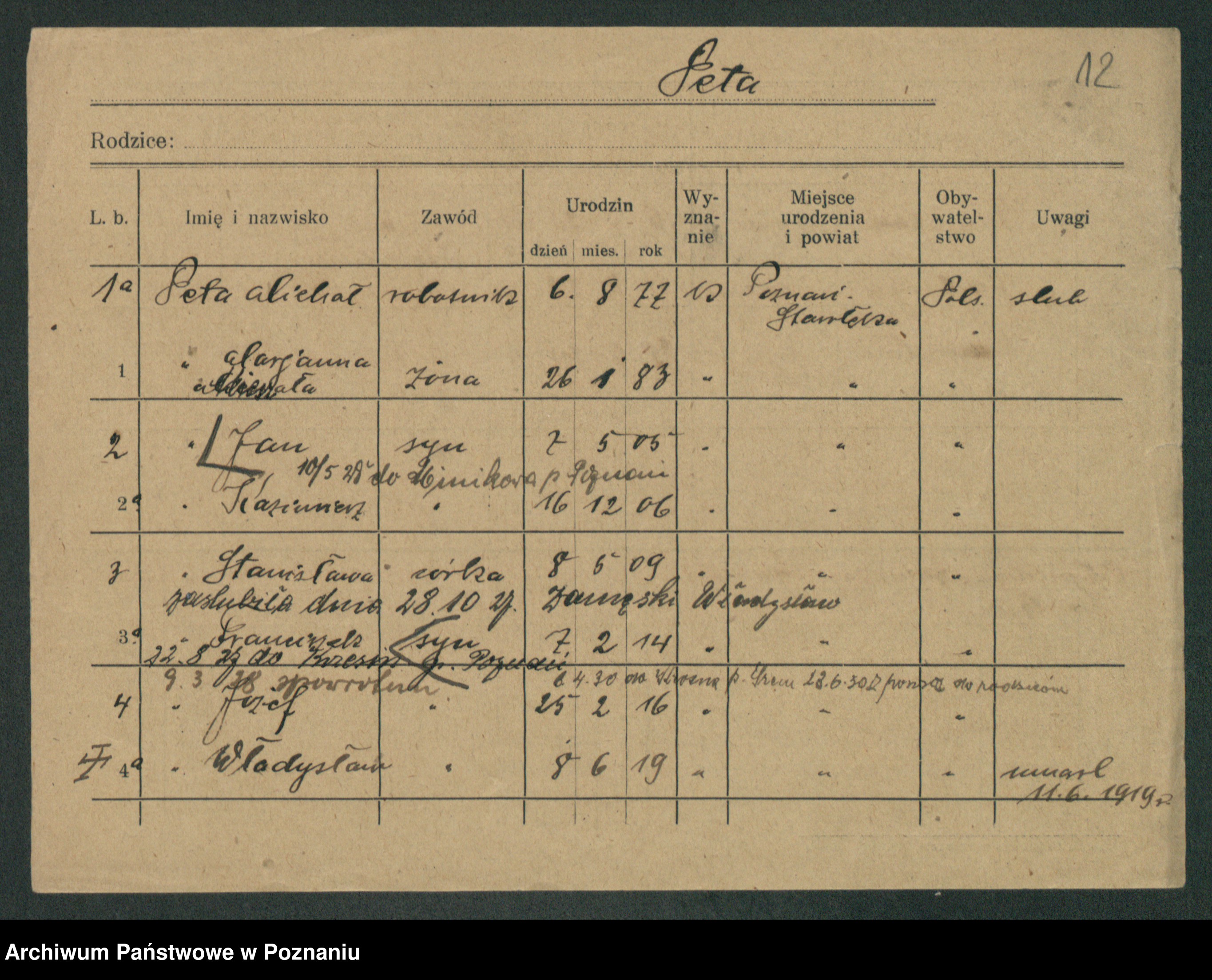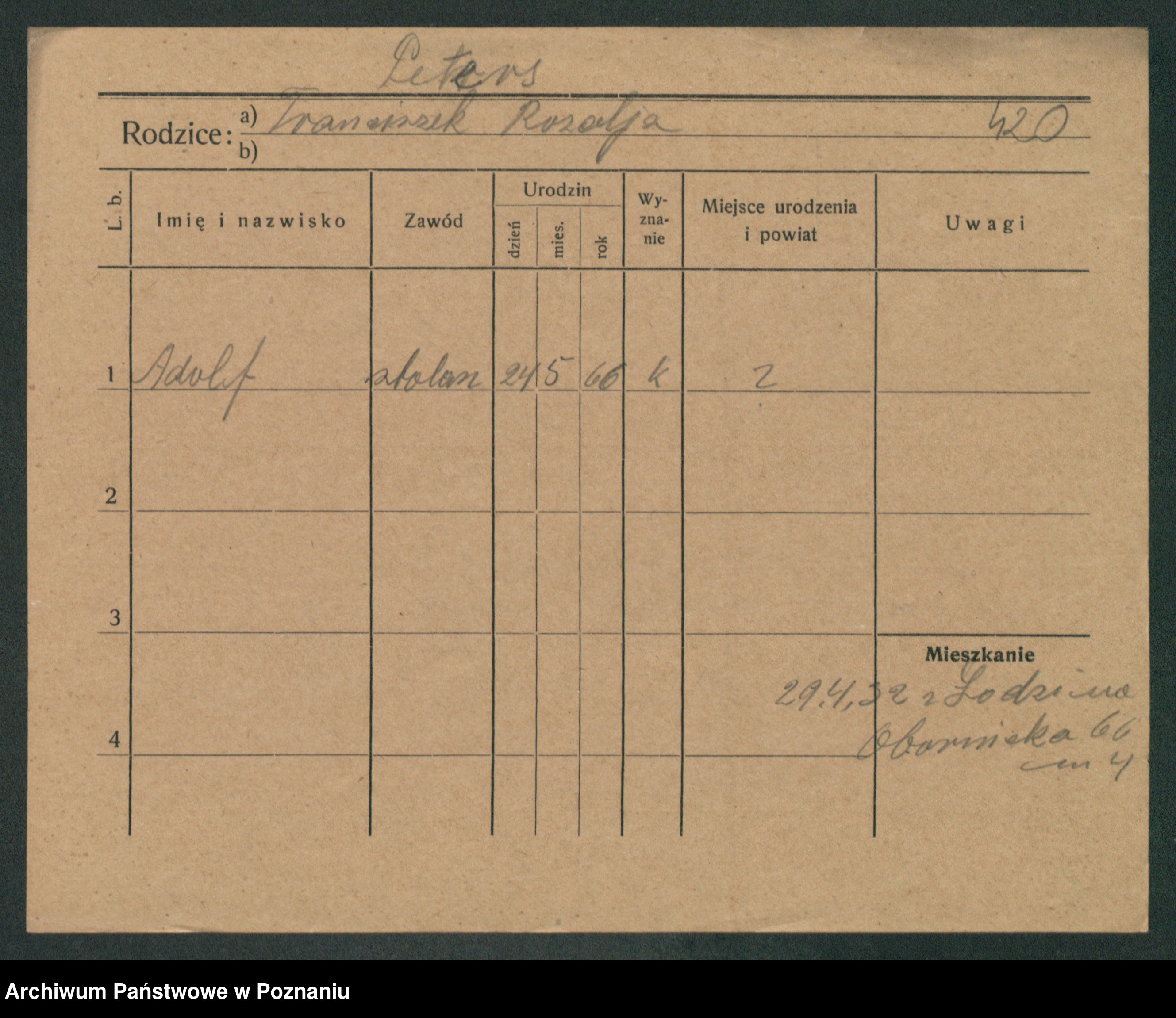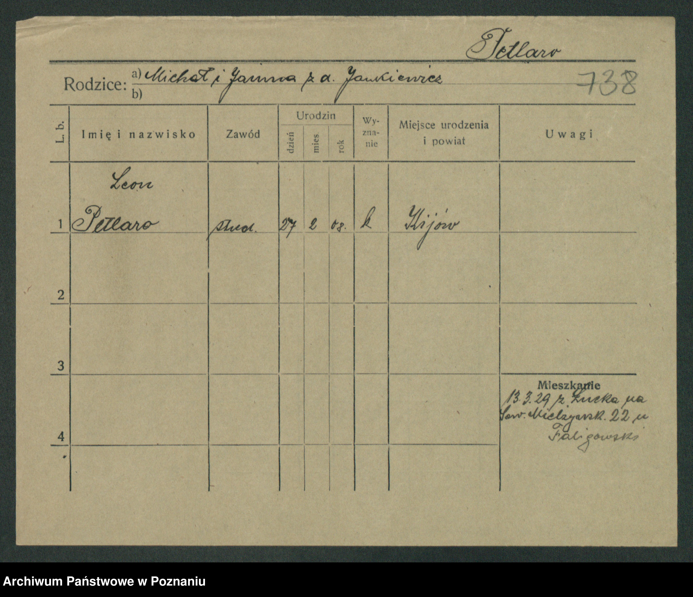 Podgląd karty osobowej dostępny jest po kliknięciu na nazwisko lub ikonkę karty. Można dokonywać powiększenia (ikony na górze) lub przechodzić między kolejnymi skanami (strzałki po bokach).