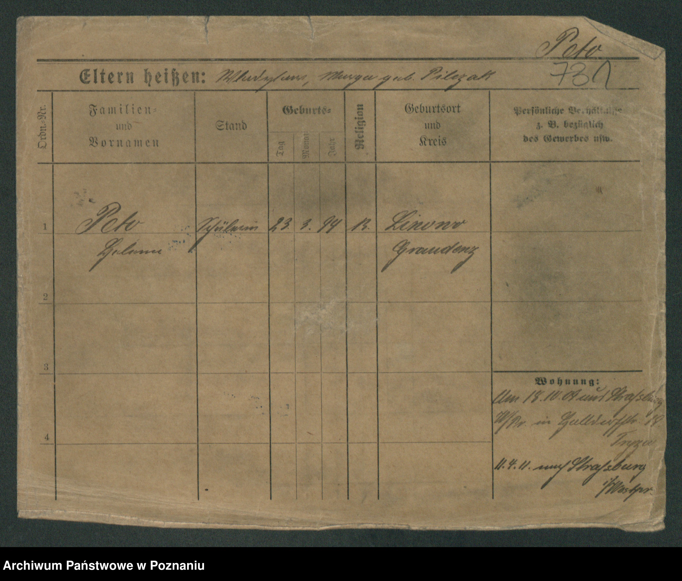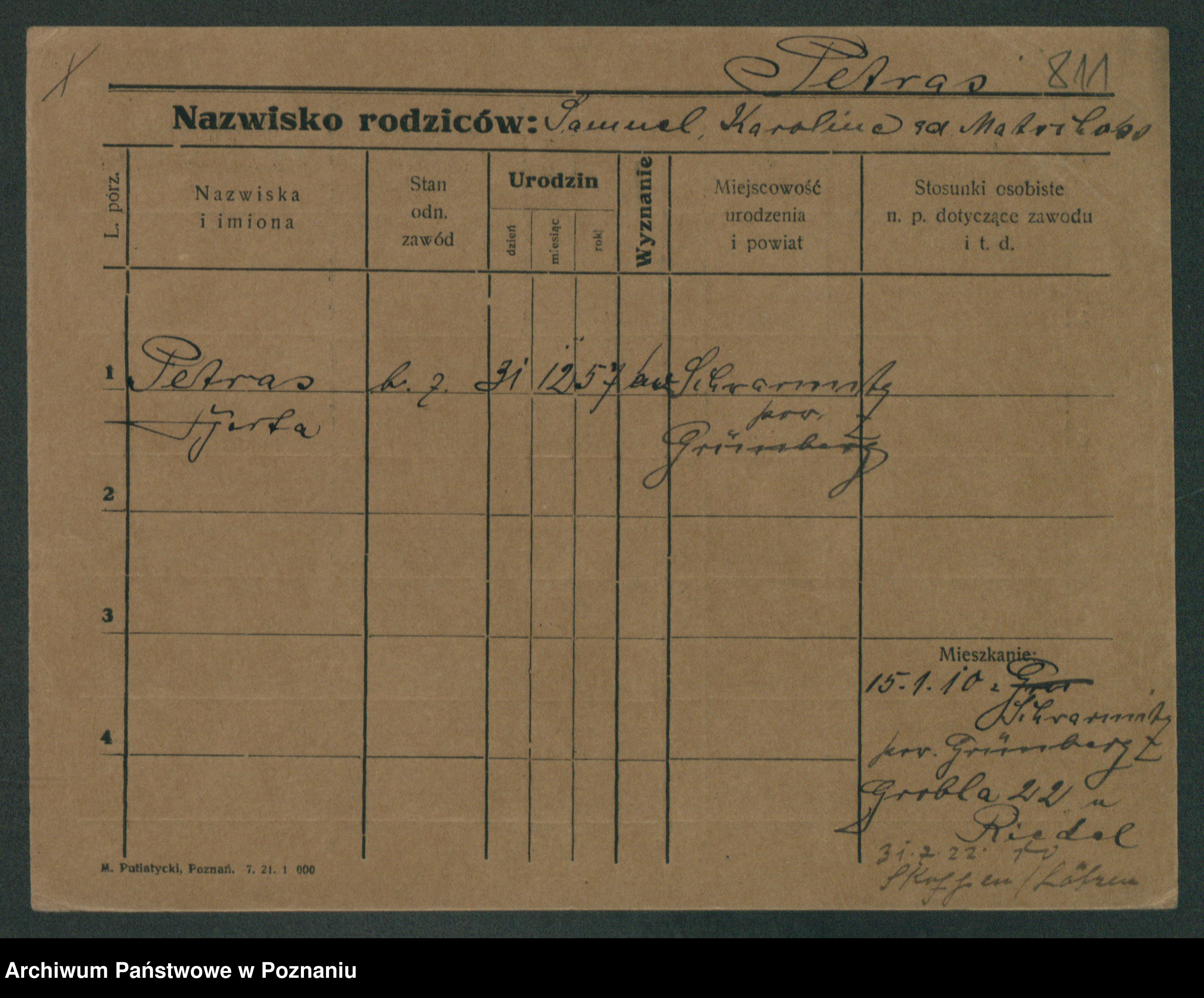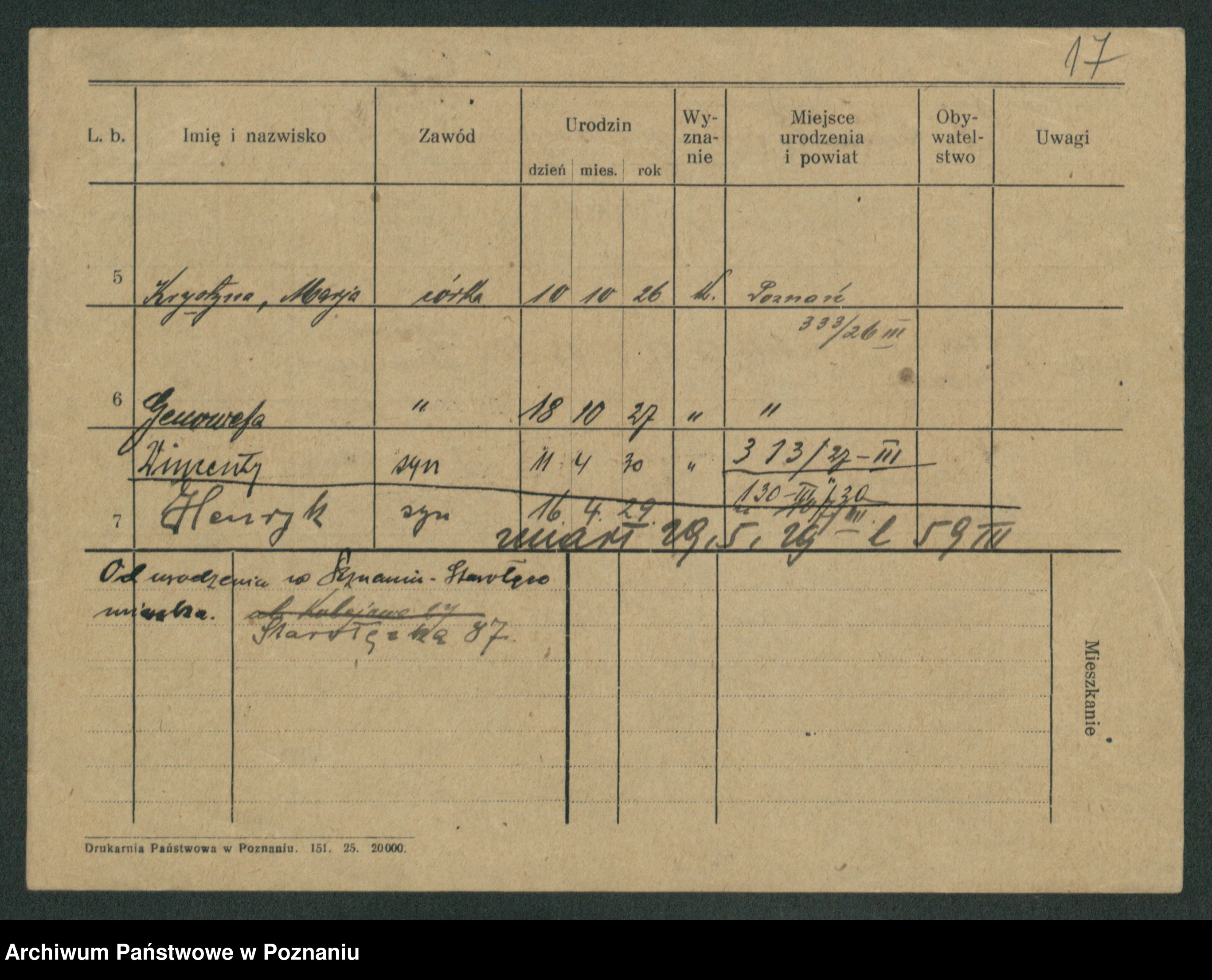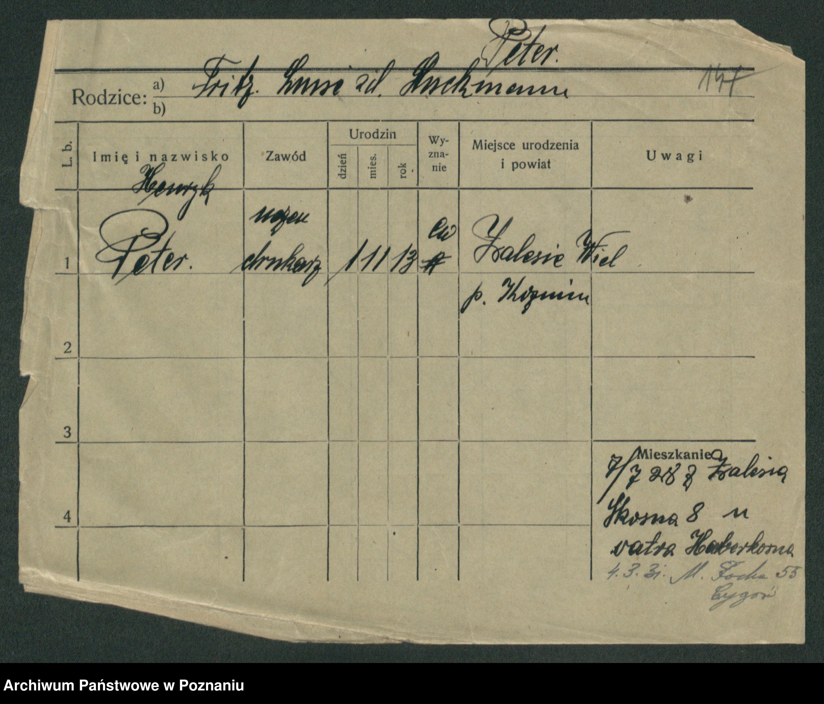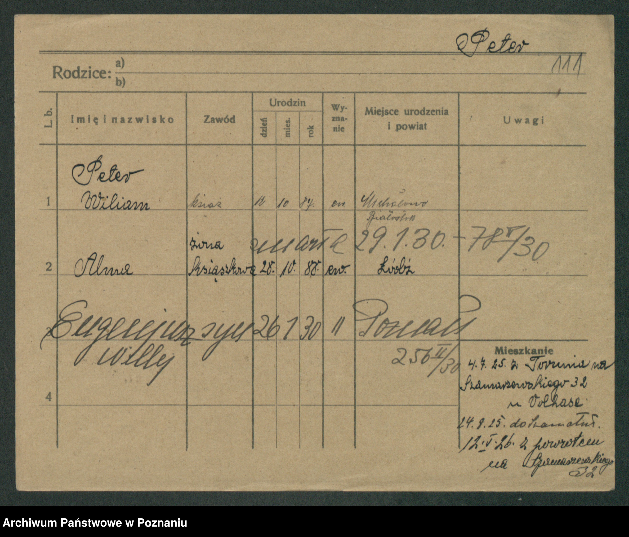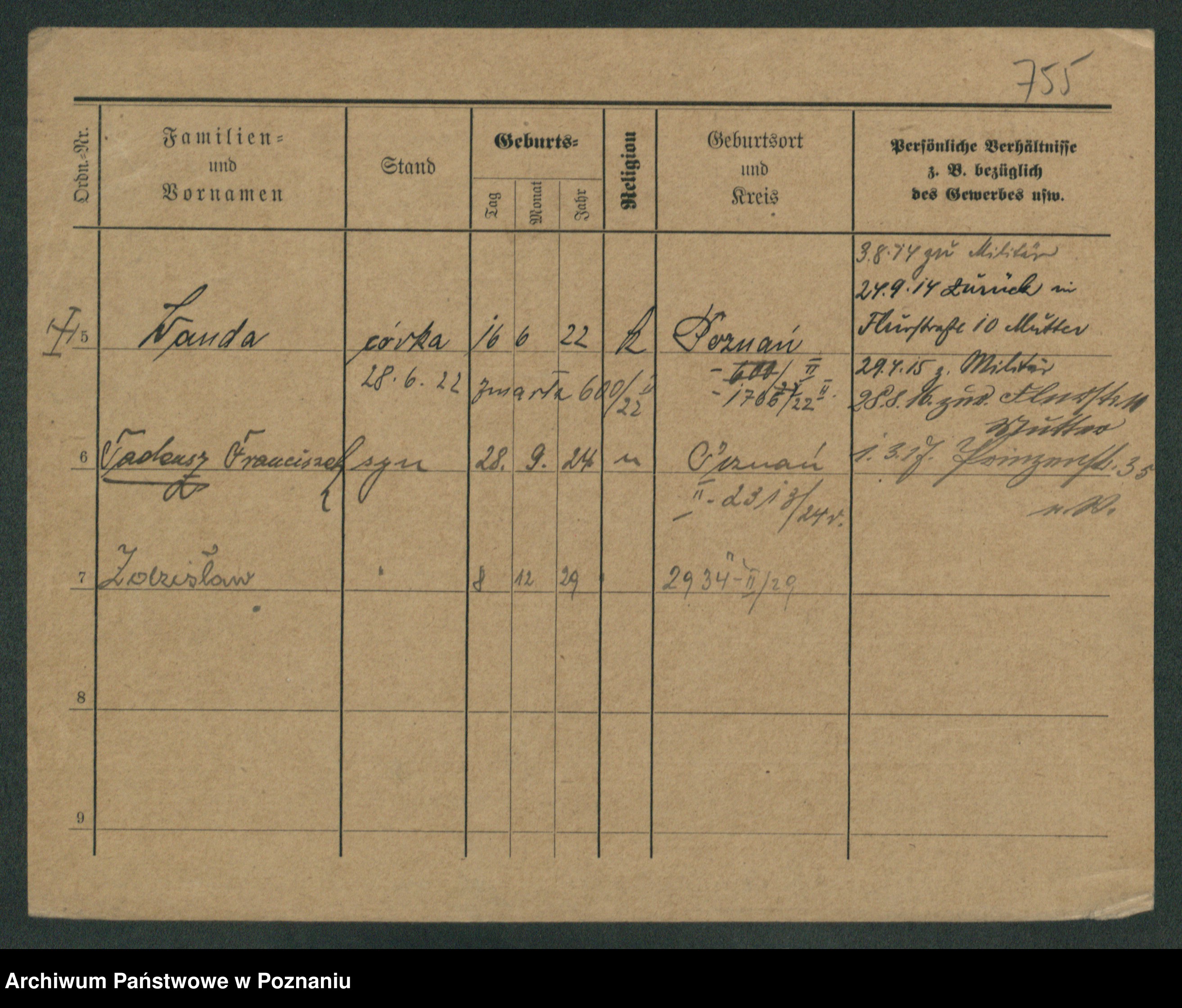 Podgląd karty osobowej dostępny jest po kliknięciu na nazwisko lub ikonkę karty. Można dokonywać powiększenia (ikony na górze) lub przechodzić między kolejnymi skanami (strzałki po bokach).
