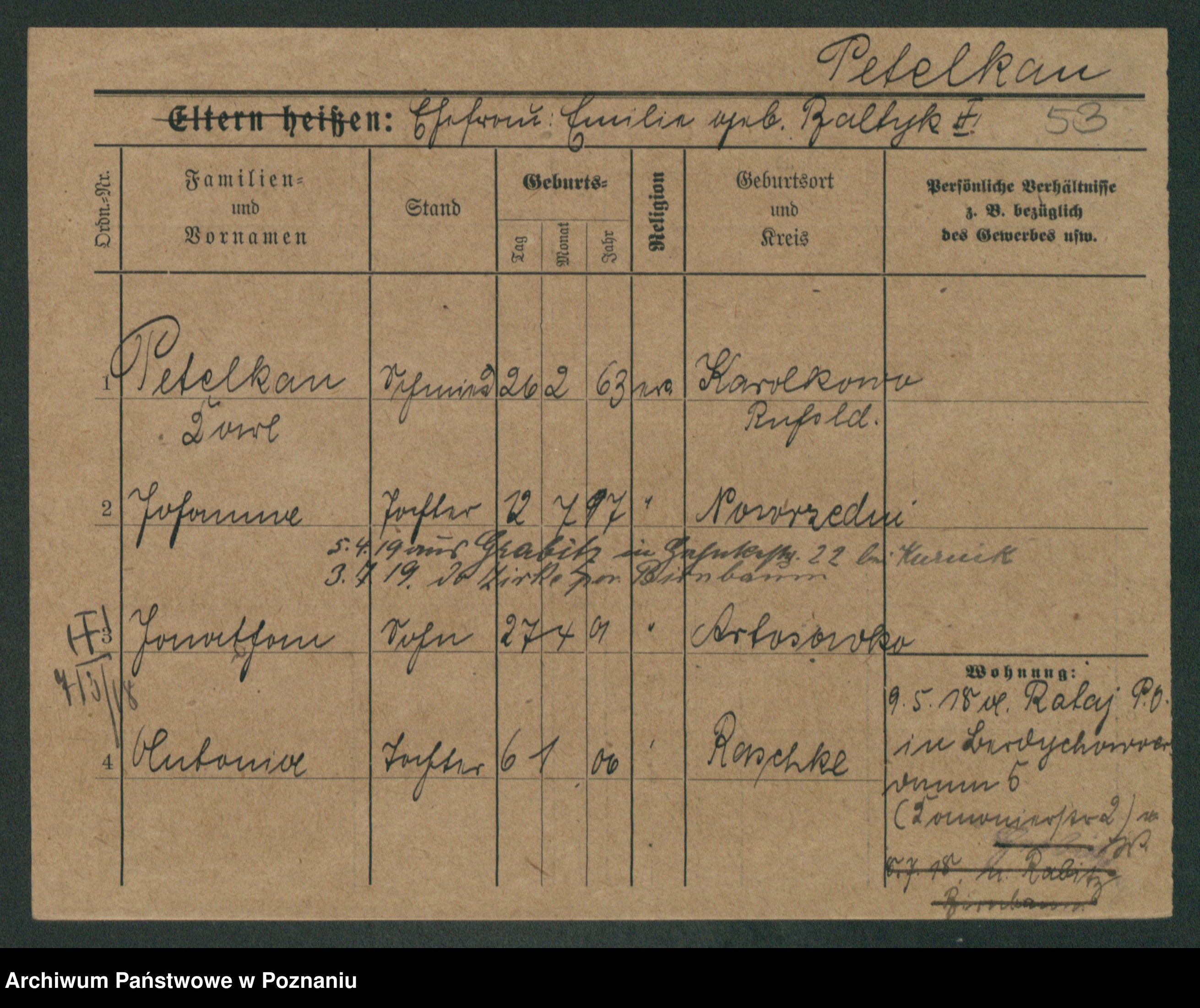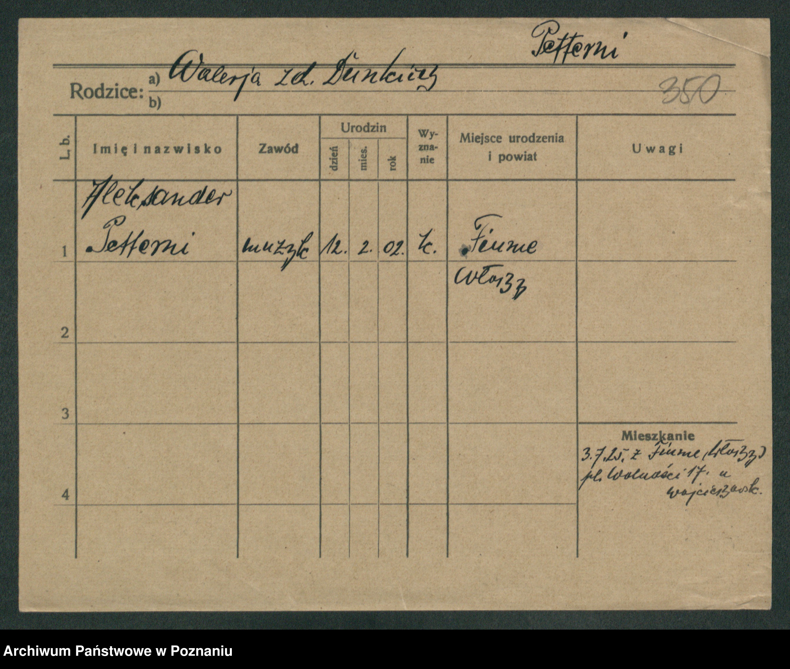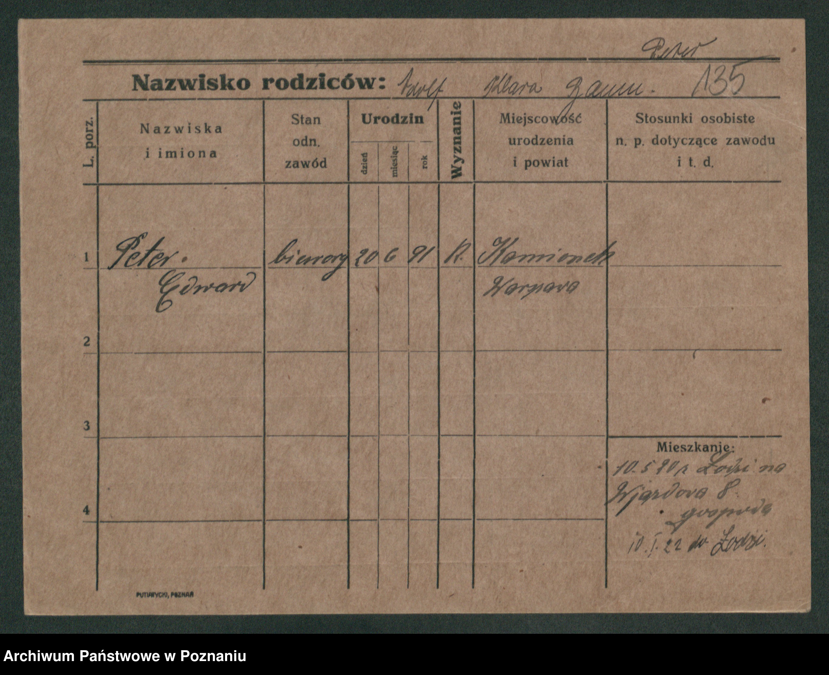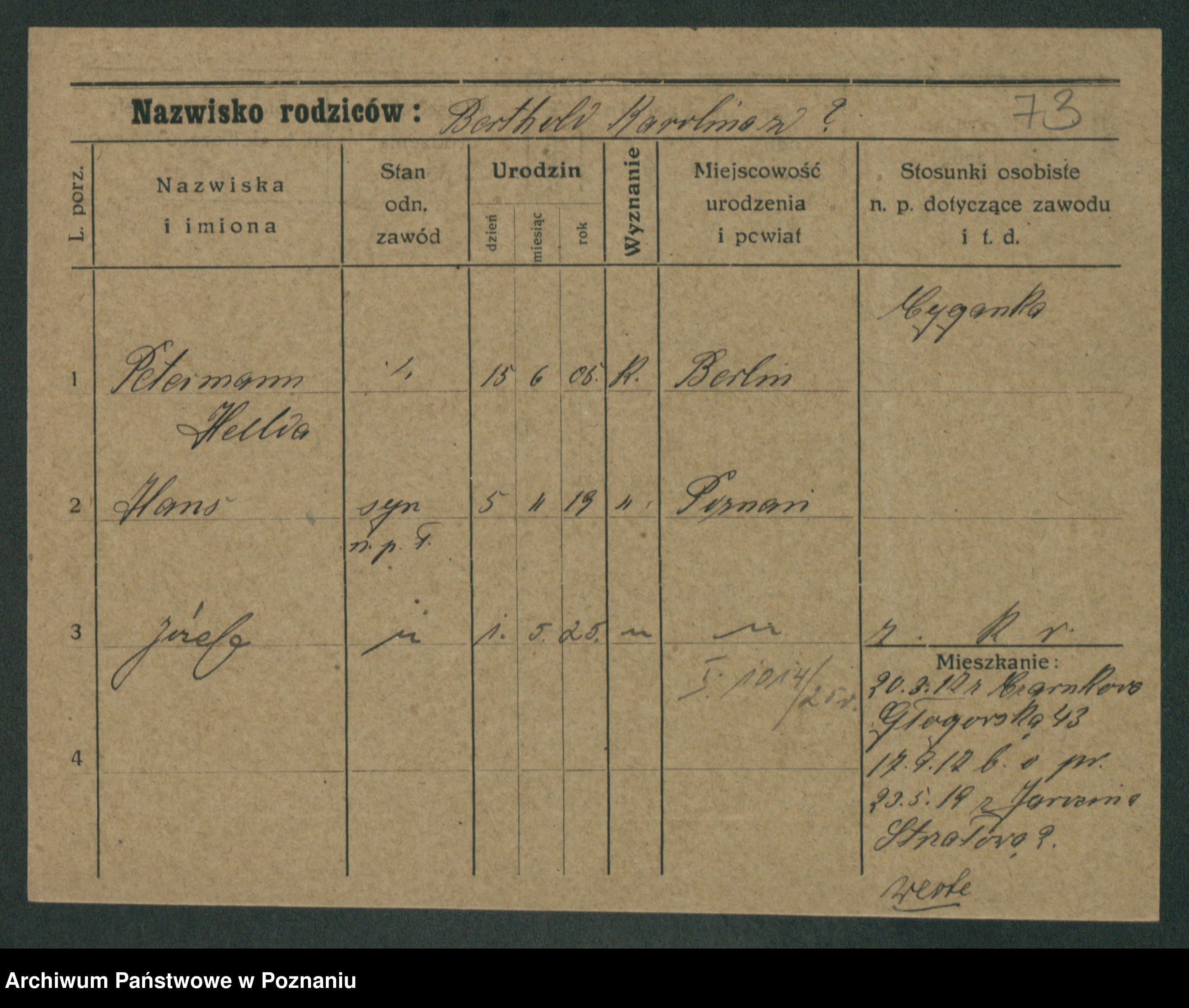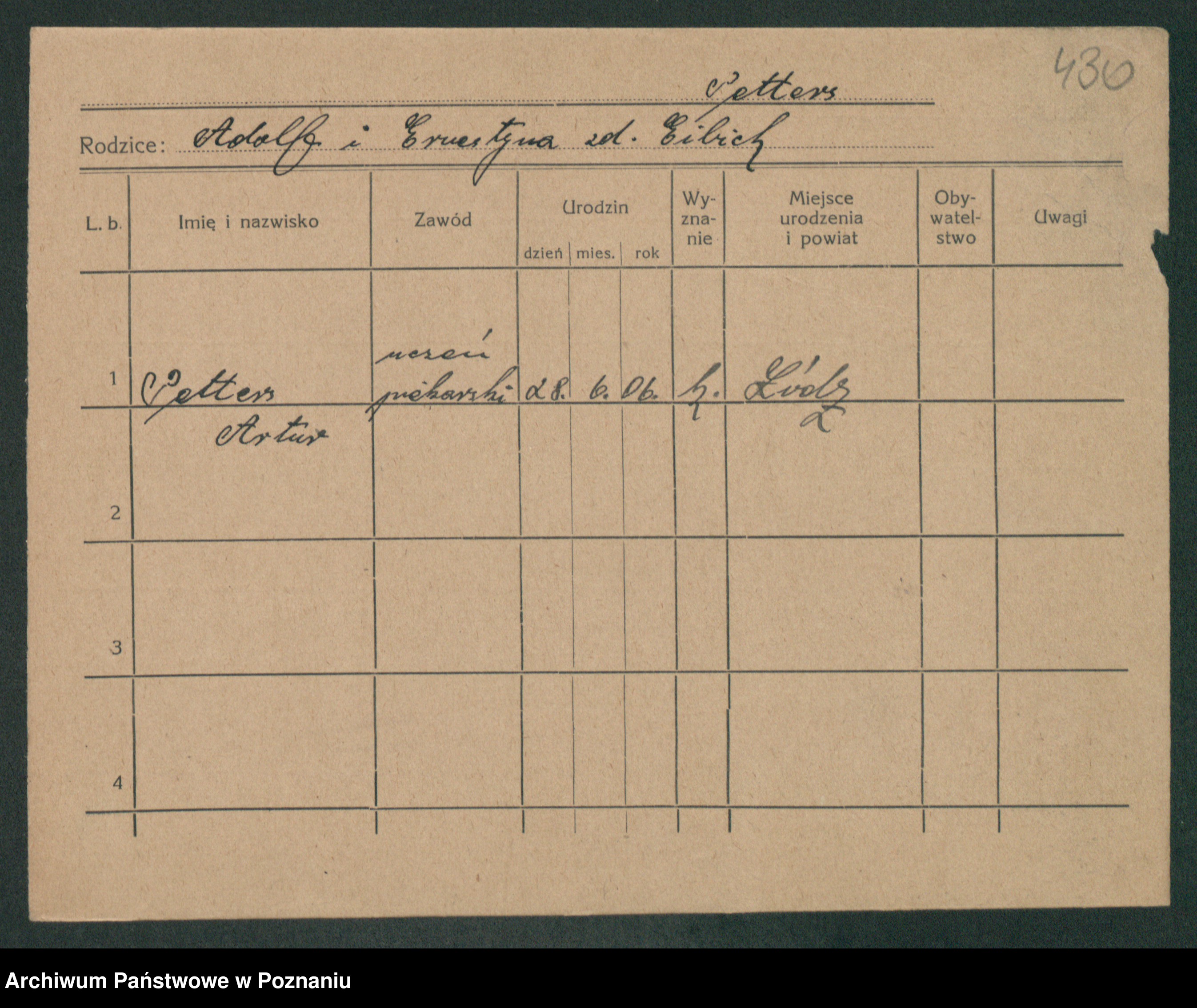 Podgląd karty osobowej dostępny jest po kliknięciu na nazwisko lub ikonkę karty. Można dokonywać powiększenia (ikony na górze) lub przechodzić między kolejnymi skanami (strzałki po bokach).