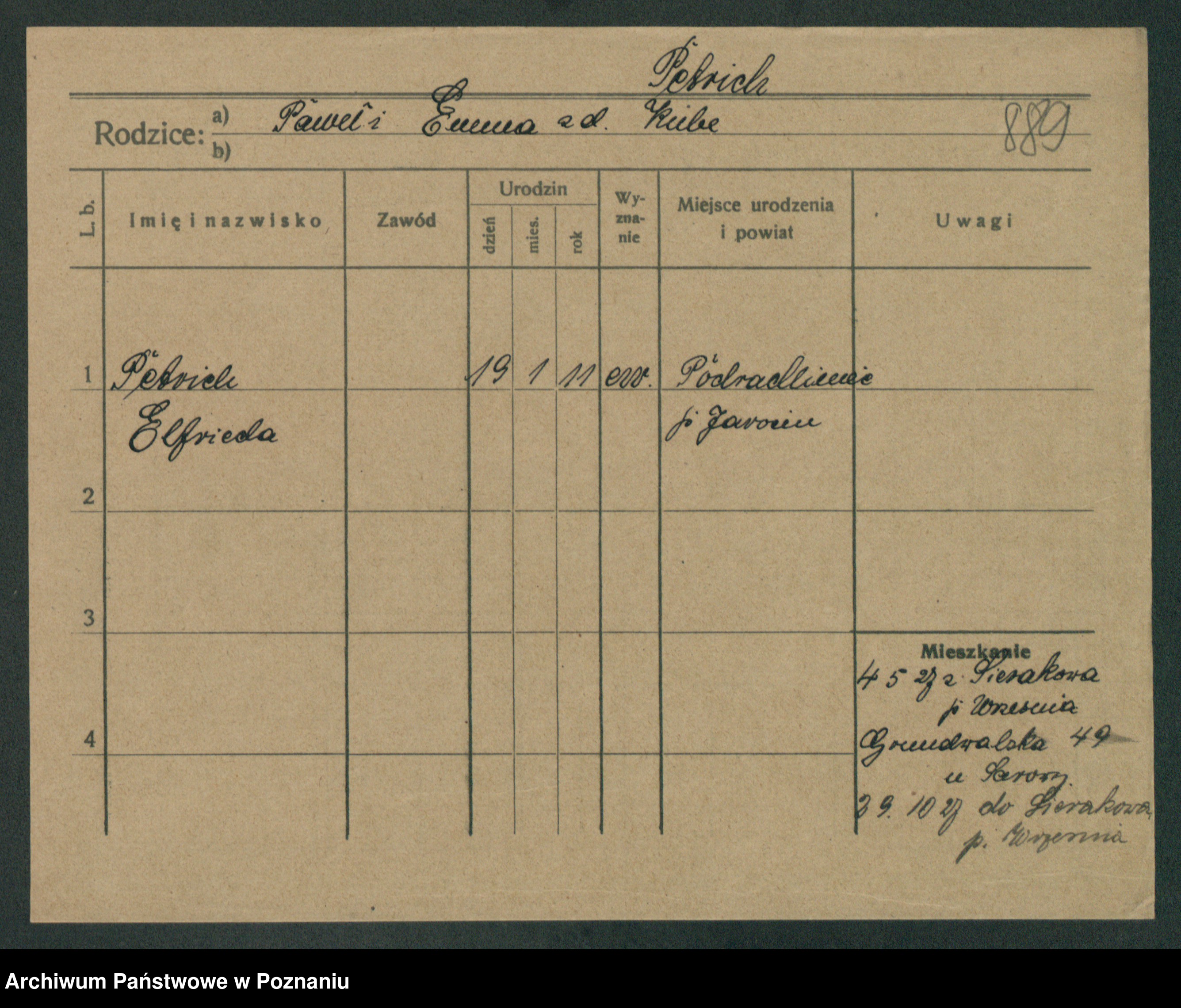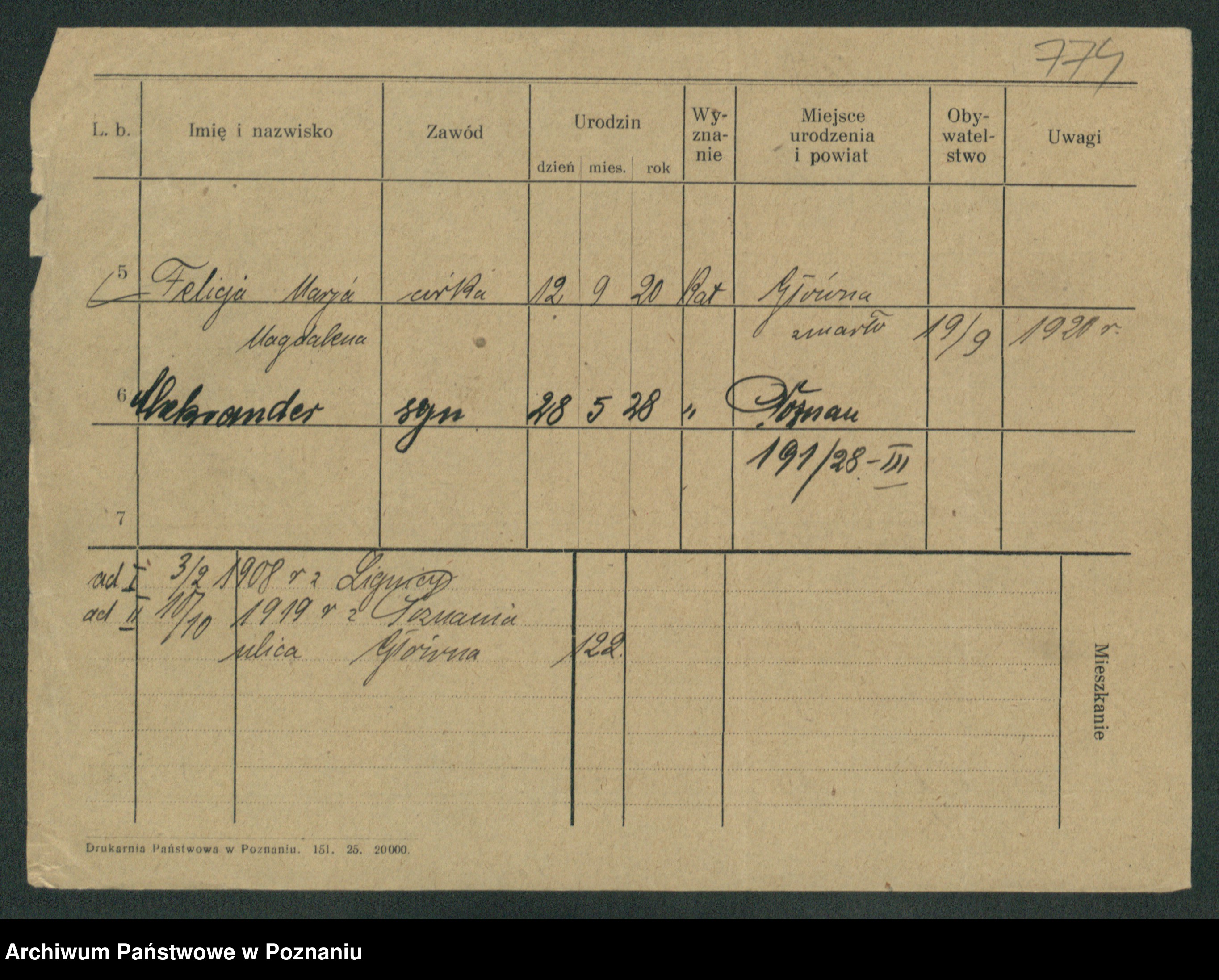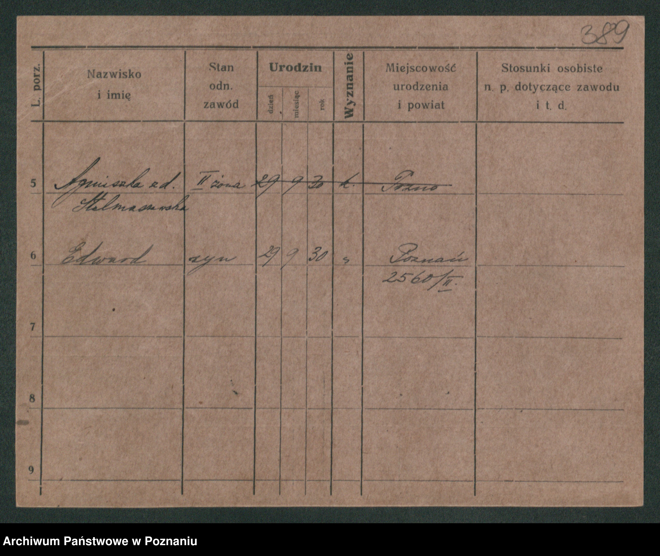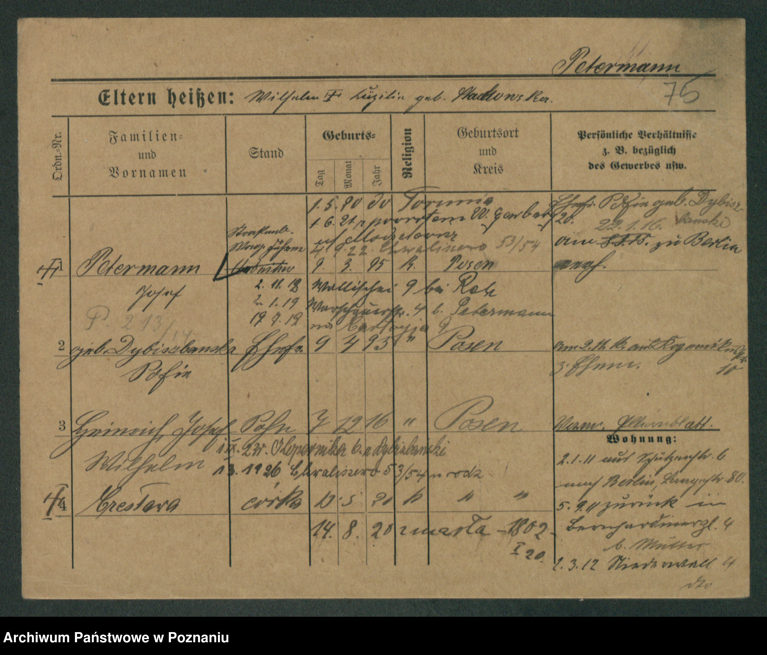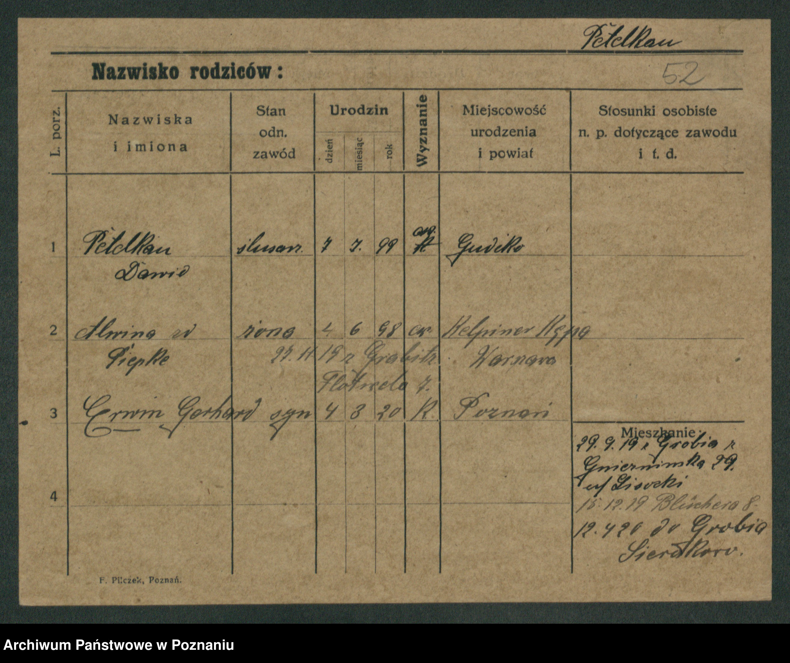 Podgląd karty osobowej dostępny jest po kliknięciu na nazwisko lub ikonkę karty. Można dokonywać powiększenia (ikony na górze) lub przechodzić między kolejnymi skanami (strzałki po bokach).